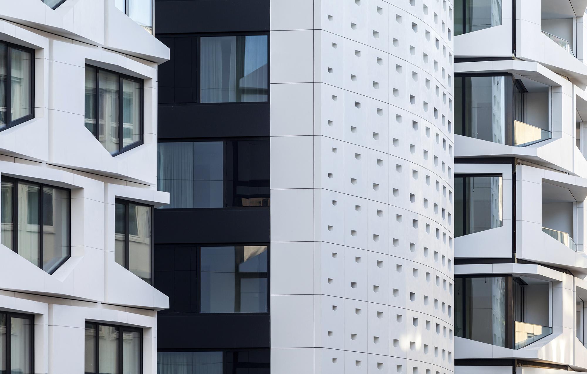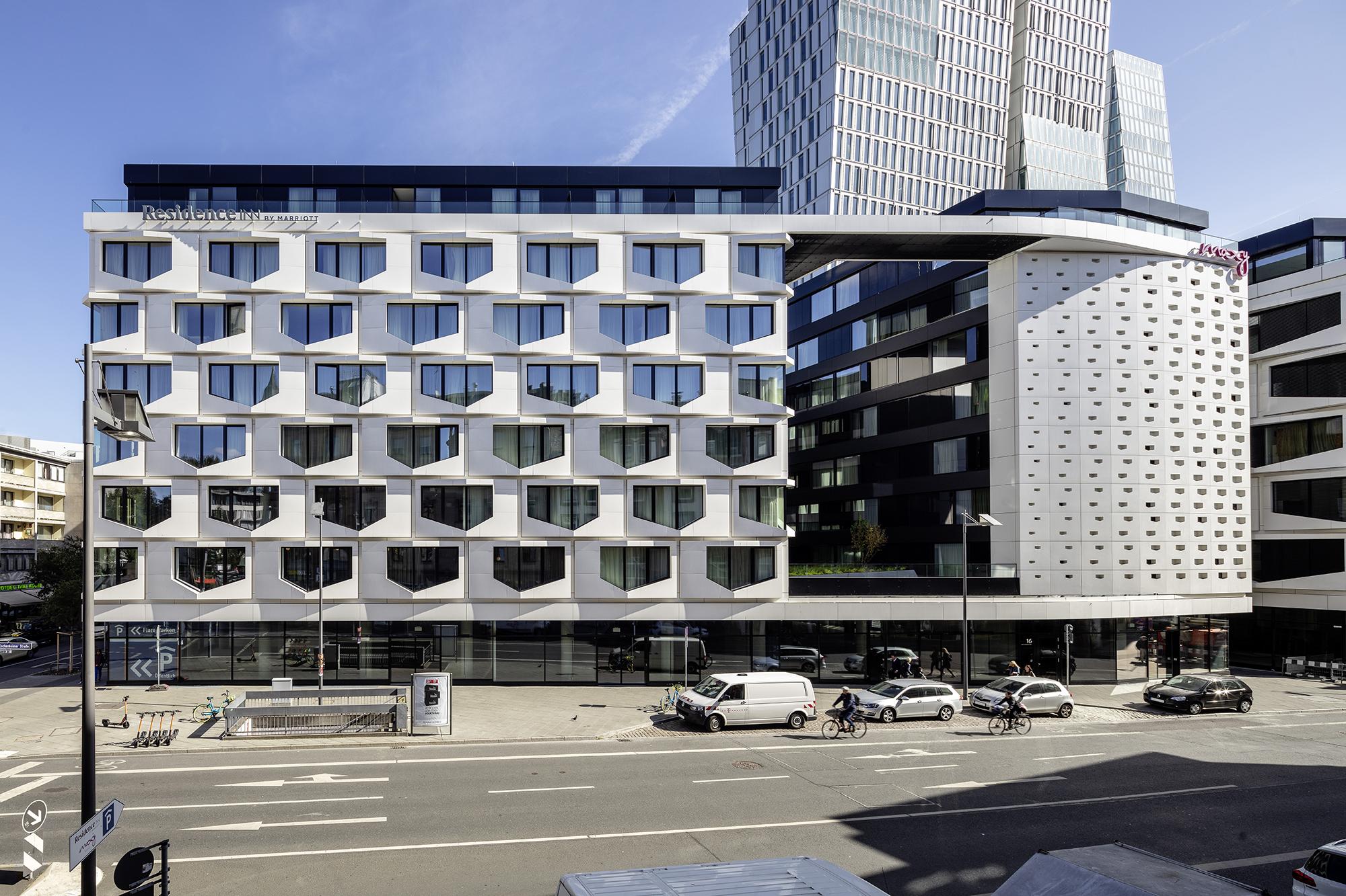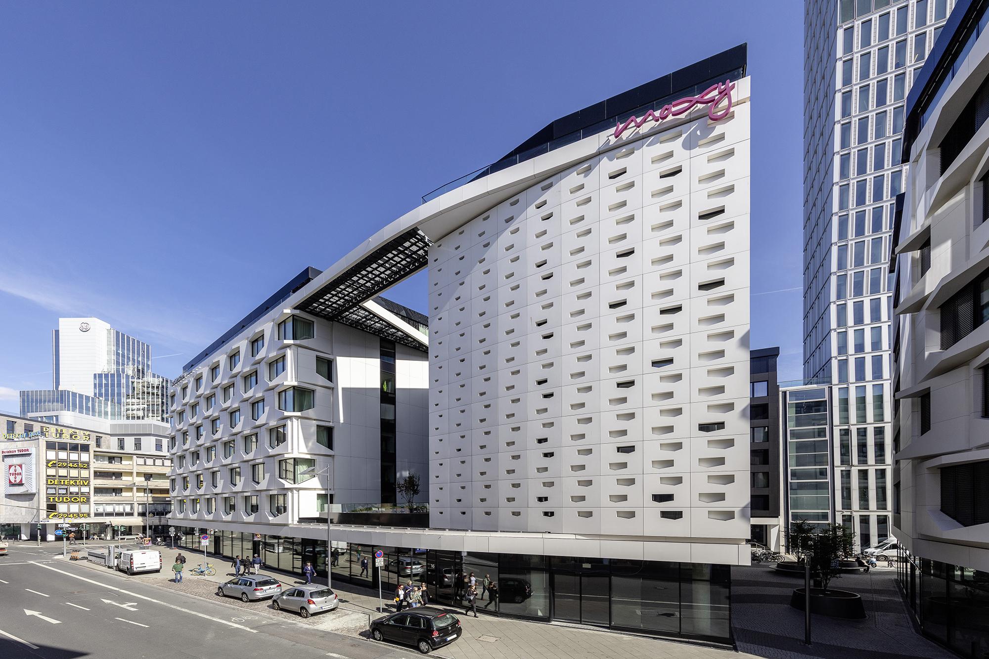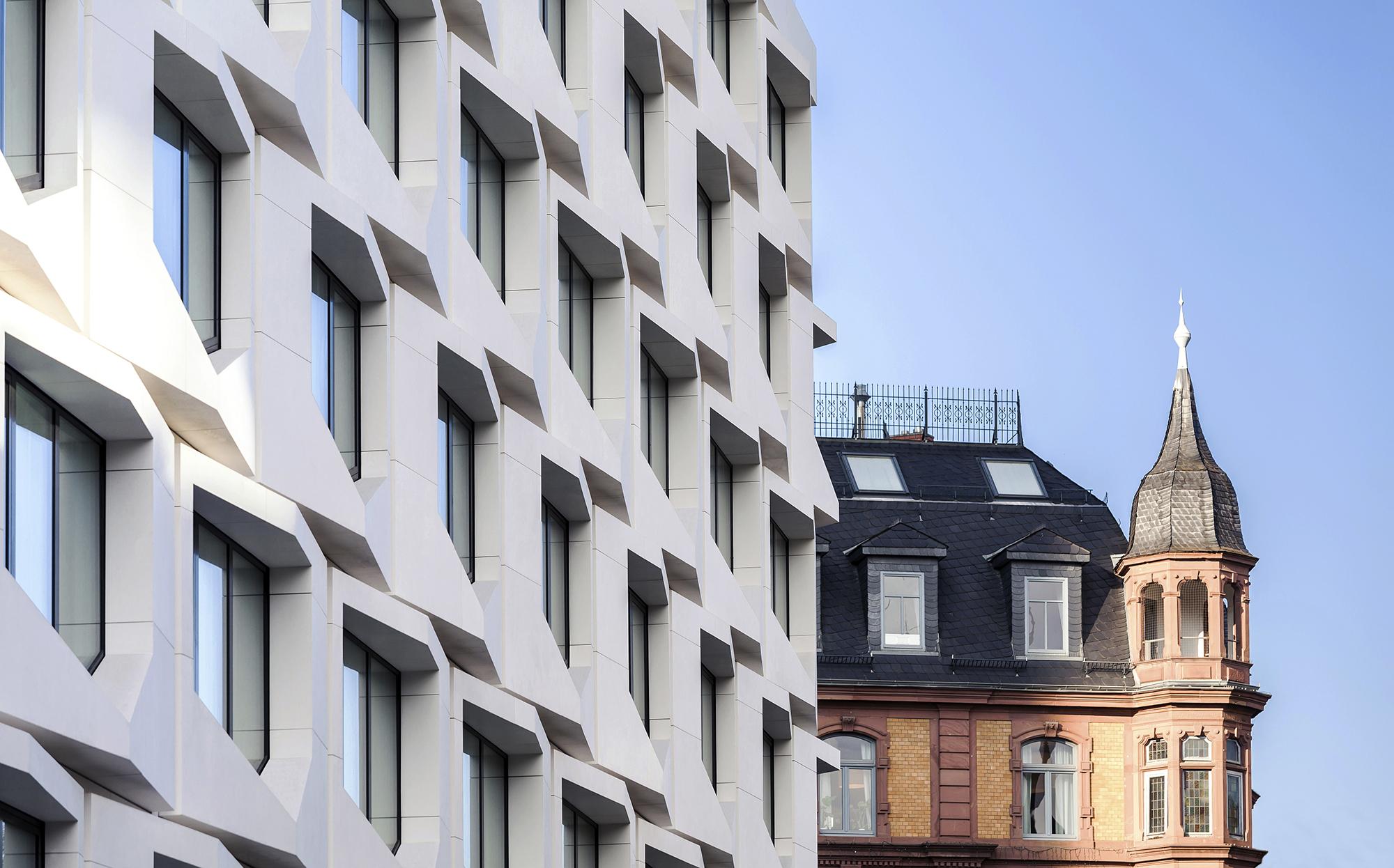 Hotel, residential and commercial buildingFrankfurt am Main, GermanyThe complex urban repair performed on an exclusive location in the heart of Frankfurt shifts its surroundings to a new dimension. Not least due to a subtly attuned canon of impressively profiled three-dimensional façades and the unusual density and interlinkage of new urban functions. Not only gastronomic options, retail businesses and around 60 apartments can be found here: above and beyond them there are residential offers for short- and long-term visitors to the newly value-enhanced banking metropolis. The ensemble consists of two structures, FLARE Living and FLARE Business atop a mutual three-storey underground car park. In an urbanistic sense, the project uses a block perimeter development in the direction of Eschenheim Tower, a former city gate, to include a key traffic axis. The residential building is stationed as a “solitaire” towards the PalaisQuartier complex, thereby creating new pedestrian thoroughfares to the MyZeil shopping mall. At the same time, the well co-ordinated building composition caused a new urban quarter with an address of its own to arise. Though the draft draws on existing stylistic elements, it interprets them anew. One characteristic factor are the three-dimensional façade structures made of large-scale ceramic elements. Their dynamic geometry results from the interplay of varying protrusions and recesses with sharp edges and slanted areas, as well as an interstitial alignment that, depending on the outdoor viewing angle, has surprising effects. This composition gives the surfaces a special depth which, when seen from indoors, creates the desired high quality to linger. The constructively demanding façade was realised by Hadi Teherani Architects in co-operation with the Central Technical Division of Ed. Züblin AG and the firm Lithodecor. Extensive prefabrication proved to be a substantial factor in the resulting success. Each segment is produced from eight individual pieces that were suspended, aligned and affixed at the factory. Assembly at the construction site occurred “straight from the truck”. This type of prefab production decisively increased the quality of the workmanship. FLARE OF FRANKFURT has been certified “DGNB Gold” by DGNB, the German Sustainable Building Council. The heating supply takes place via district heating from the city and waste heat recovery.