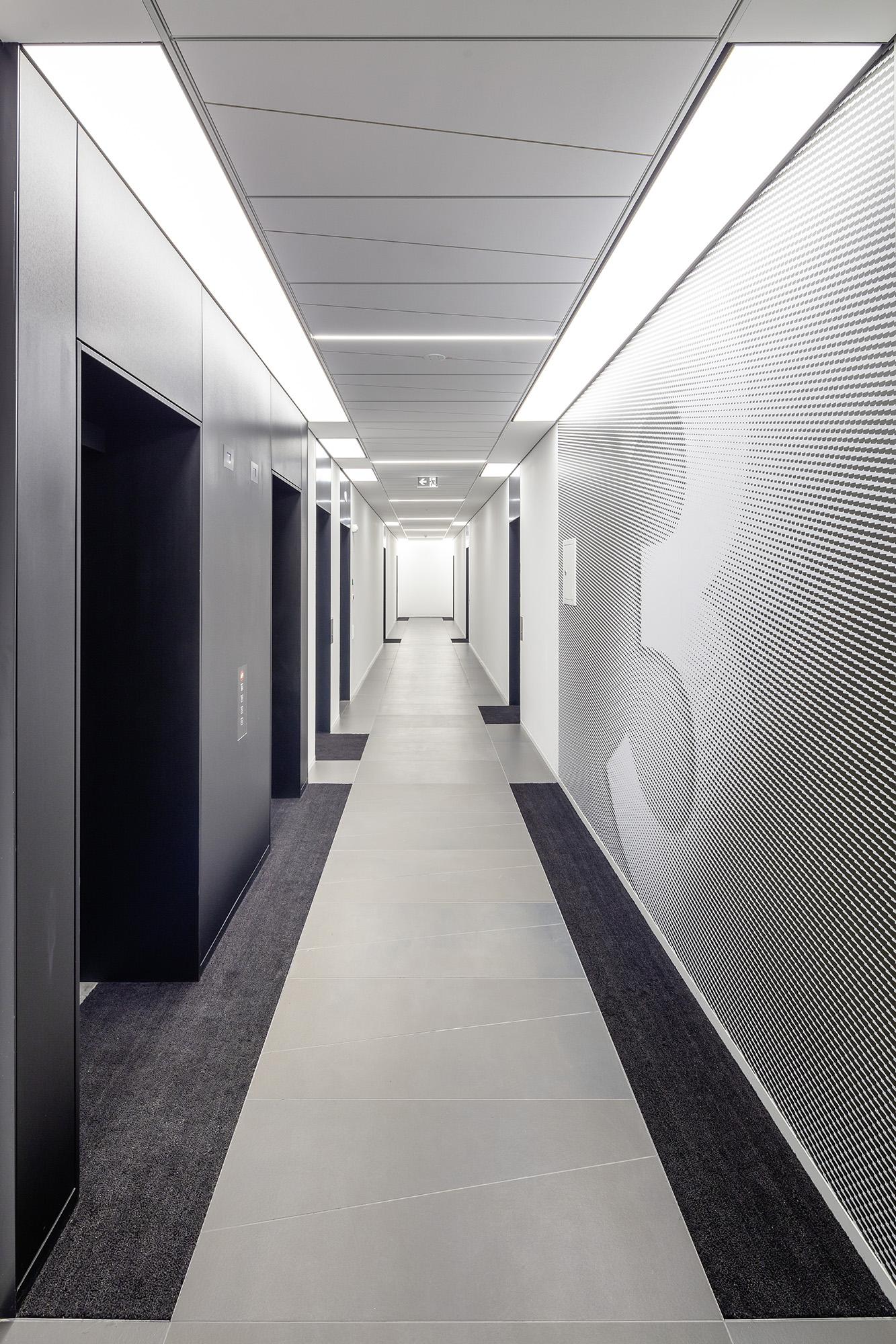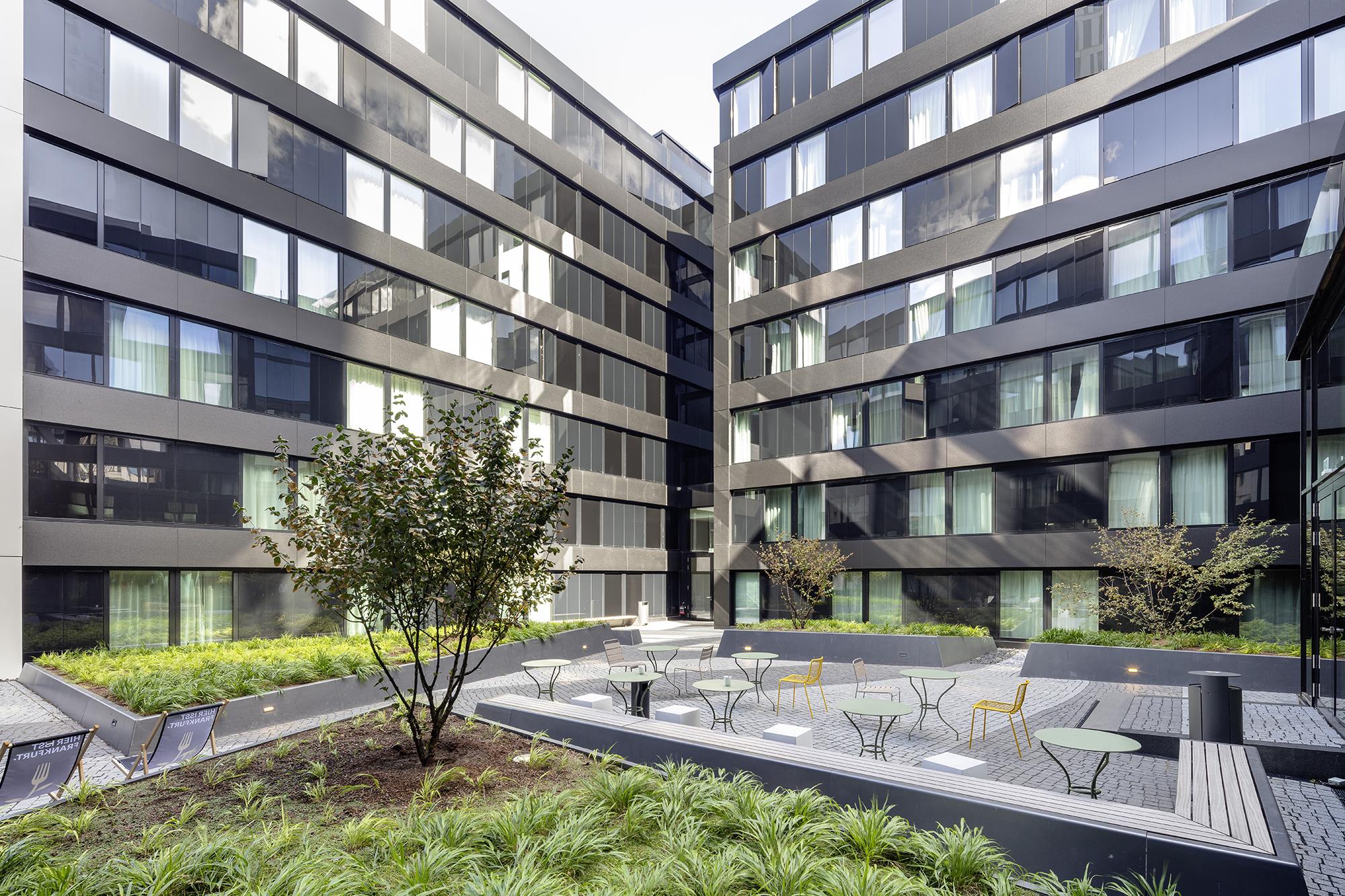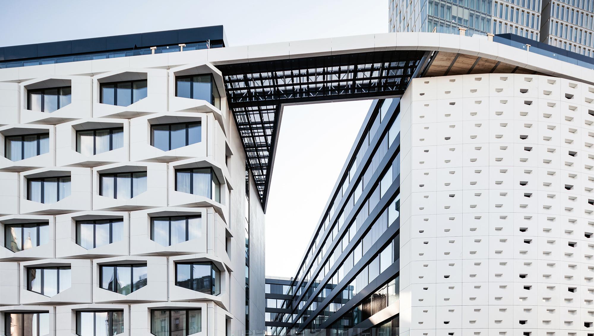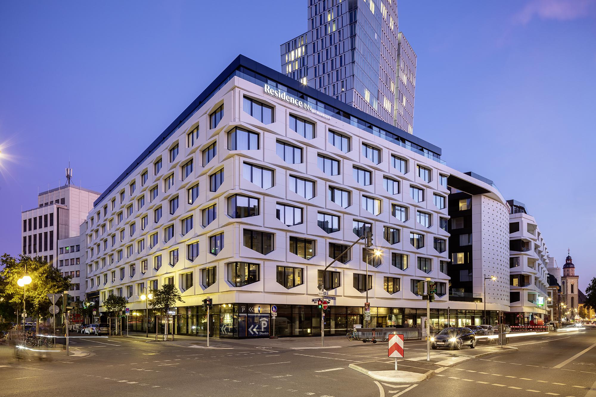 Hotel, residential and commercial buildingFrankfurt am Main, GermanyThe complex urban repair performed on an exclusive location in the heart of Frankfurt shifts its surroundings to a new dimension. Not least due to a subtly attuned canon of impressively profiled three-dimensional façades and the unusual density and interlinkage of new urban functions. Not only gastronomic options, retail businesses and around 60 apartments can be found here: above and beyond them there are residential offers for short- and long-term visitors to the newly value-enhanced banking metropolis. The ensemble consists of two structures, FLARE Living and FLARE Business atop a mutual three-storey underground car park. In an urbanistic sense, the project uses a block perimeter development in the direction of Eschenheim Tower, a former city gate, to include a key traffic axis. The residential building is stationed as a “solitaire” towards the PalaisQuartier complex, thereby creating new pedestrian thoroughfares to the MyZeil shopping mall. At the same time, the well co-ordinated building composition caused a new urban quarter with an address of its own to arise. Though the draft draws on existing stylistic elements, it interprets them anew. One characteristic factor are the three-dimensional façade structures made of large-scale ceramic elements. Their dynamic geometry results from the interplay of varying protrusions and recesses with sharp edges and slanted areas, as well as an interstitial alignment that, depending on the outdoor viewing angle, has surprising effects. This composition gives the surfaces a special depth which, when seen from indoors, creates the desired high quality to linger. The constructively demanding façade was realised by Hadi Teherani Architects in co-operation with the Central Technical Division of Ed. Züblin AG and the firm Lithodecor. Extensive prefabrication proved to be a substantial factor in the resulting success. Each segment is produced from eight individual pieces that were suspended, aligned and affixed at the factory. Assembly at the construction site occurred “straight from the truck”. This type of prefab production decisively increased the quality of the workmanship. FLARE OF FRANKFURT has been certified “DGNB Gold” by DGNB, the German Sustainable Building Council. The heating supply takes place via district heating from the city and waste heat recovery.