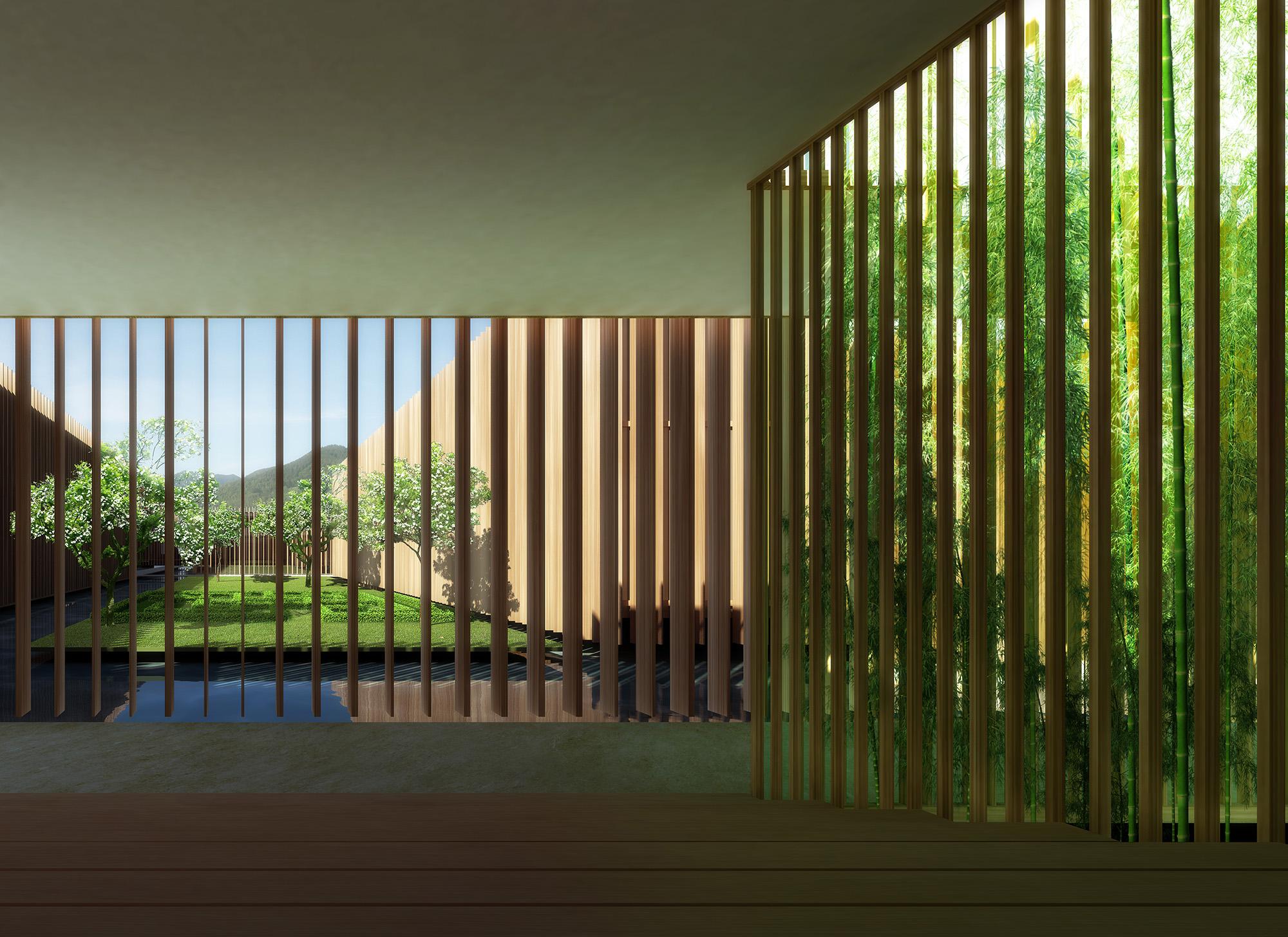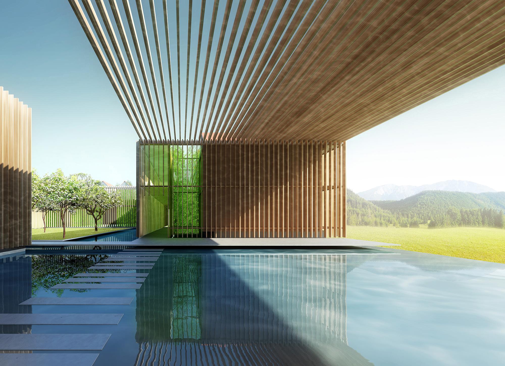 A separate bathhouse complements the ensemble and creates spatial continuity across the site – acting as an architectural point of tranquillity with views of the surrounding nature.