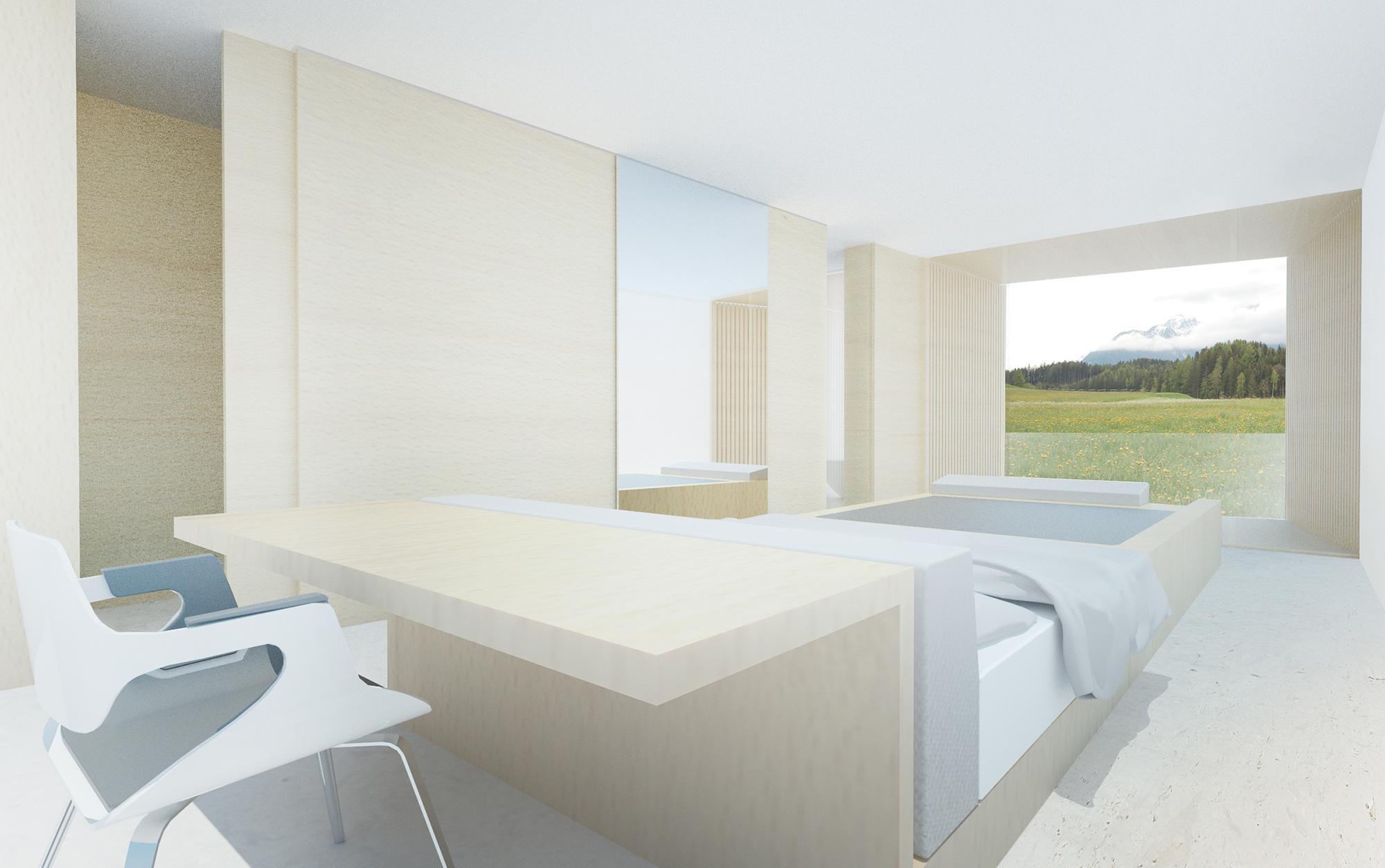 The design includes around 80 rooms, expansive spa and therapy areas, and a dedicated medical department. A central ambition was to harmonise architecture, nature, and the philosophy of health – through calm, clear spatial sequences, generous openings towards the landscape, and a material language reduced to the essential.