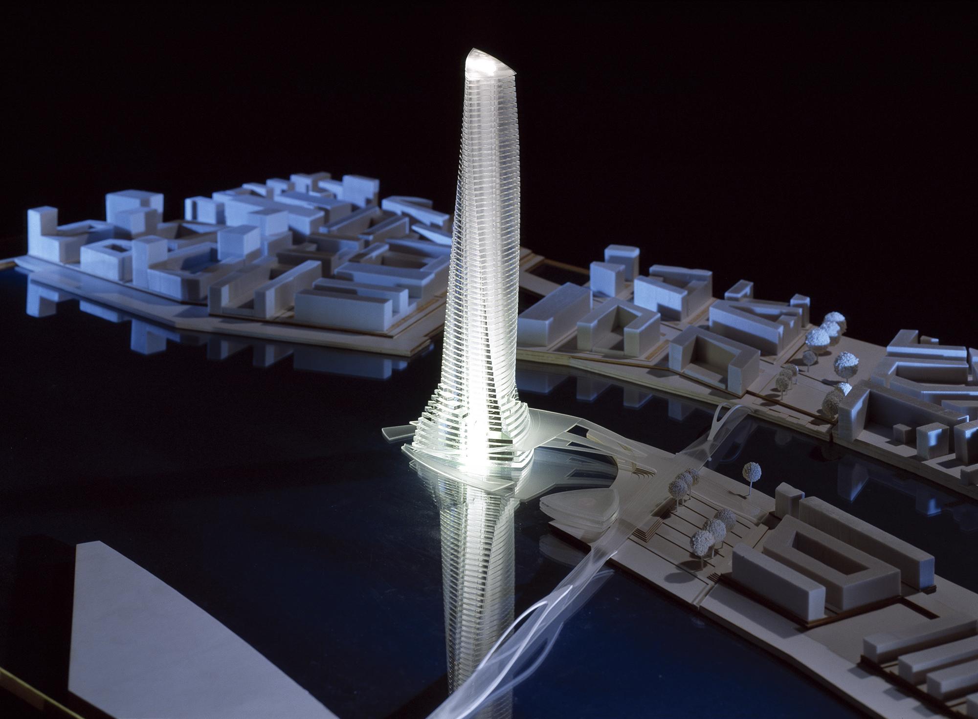 ConceptHamburg, Germany2002, the Senate has grand aspirations fort the international metropolises as Barcelona, Toronto, and Sydney. In fact, this claim is hardly far-fetched: In Europe, only central London is economically stronger than Hamburg. Among the great visions to unite the city are: the expansion oft he Hafen-City and the business side by an area of 100 hectares of land and 50 hectares of water; and the gradual integration oft he entire region with branched-off waterways in the south oft the city. The waterside, rising from a swamp to an urban skyline, is the greatest emotional amplifier of a specific Hamburg feeling, an ecstasy of space that is captured time and again on film, but whose visionary character is still missing in architectural form as a companion tot he Köhlbrand Bridge. The „Flying Dutchman,“ the fastest train in the world, linked Hamburg with the capital as early as 1932. Designed in the shape of a drop of water, the project complements the streamlined shape oft he famous express train locomotive. With the 288-meter-high lighthouse-unique in its dimensions in all of Europe, and complete with planning claim which, in contrast tot he dictated creative wasteland of Berlin, has long since been realized in numerous spectacular elements oft he city. The skyscrapers, necessary for an ecological city density even after „9/11,“ make the charm and the risk oft he city more visible than any other form of construction. Their zooming between the larger perspective (toward the North Sea) and minute detail, between world standards and individual responsibility, is essential.