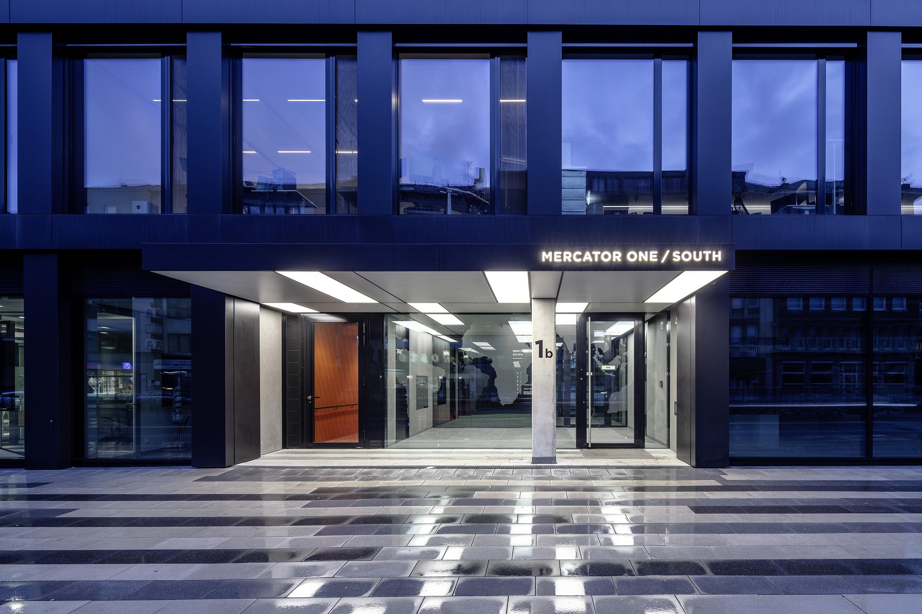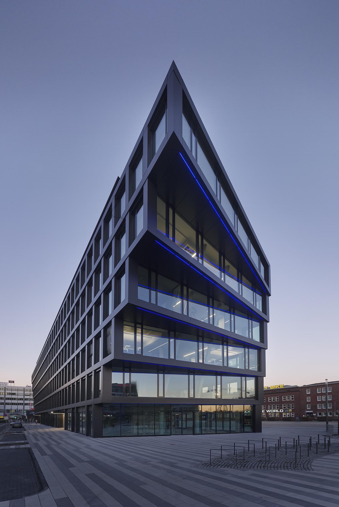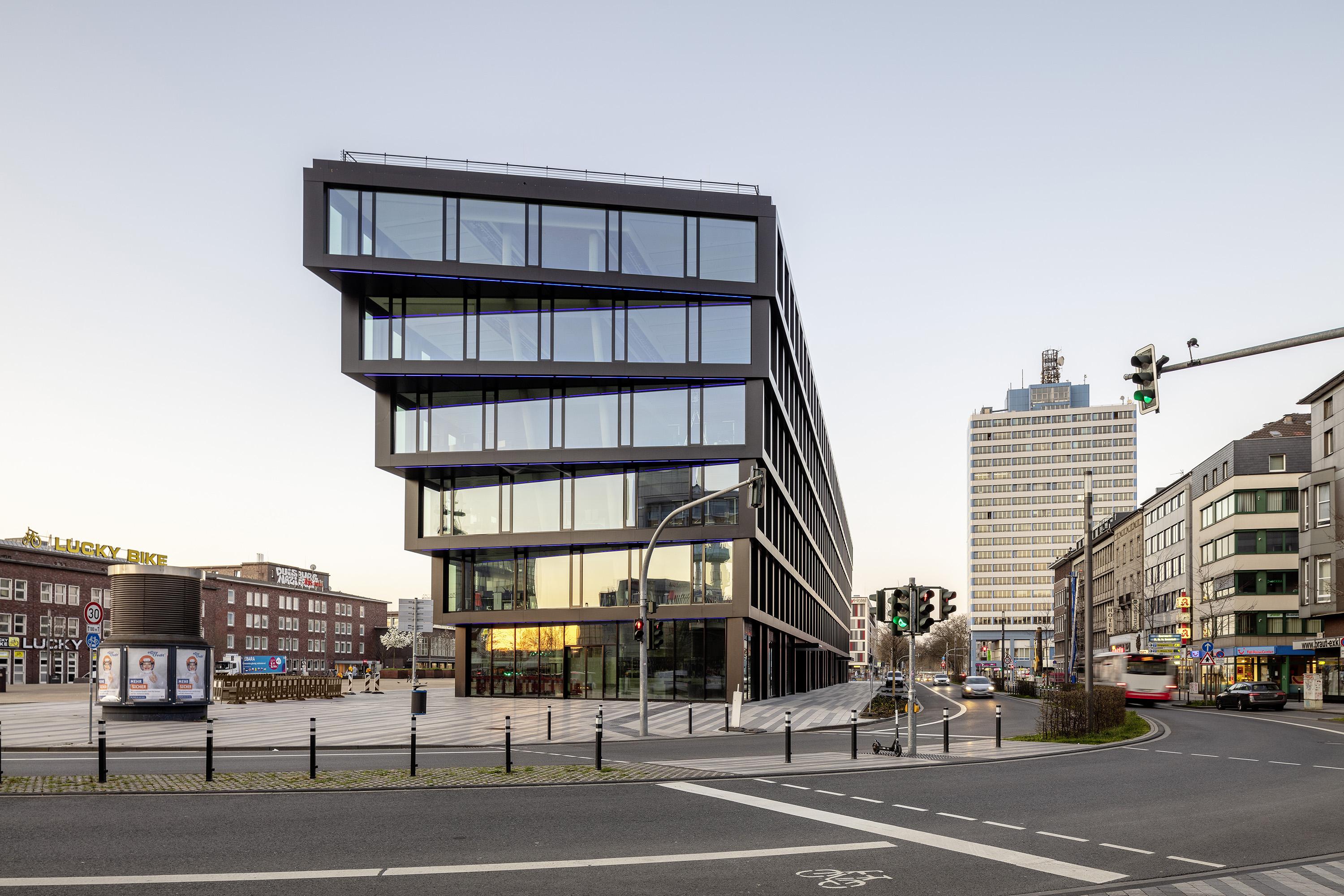 Office and business complexDuisburg, GermanyA ‘trailblazing’ building and a representational entryway to the city are arising with the new construction of Mercator One in Duisburg, Germany. The distinctive retreating fan-shaped façade that pivots at the short ends guides the streams of travellers and commuters from the flanking central railway station together with pedestrian flows from the inner city. At the same time, its out-of-the-ordinary silhouette that spawns new and surprising sightlines again and again turns the roughly 100-metre-long, 17-metre-wide and 26-metre-high structure into a landmark for the surrounding urban quarter. As a result of the anthracite-coloured façade cladding, the building presents a reserved character despite its striking appearance. The spacious glazed surfaces add towards lending it transparency and a sense of lightness. The clearly cut, placid partitioning of the façade using a rectangular grid is left undisturbed by shifting the stairwells into the building’s core.