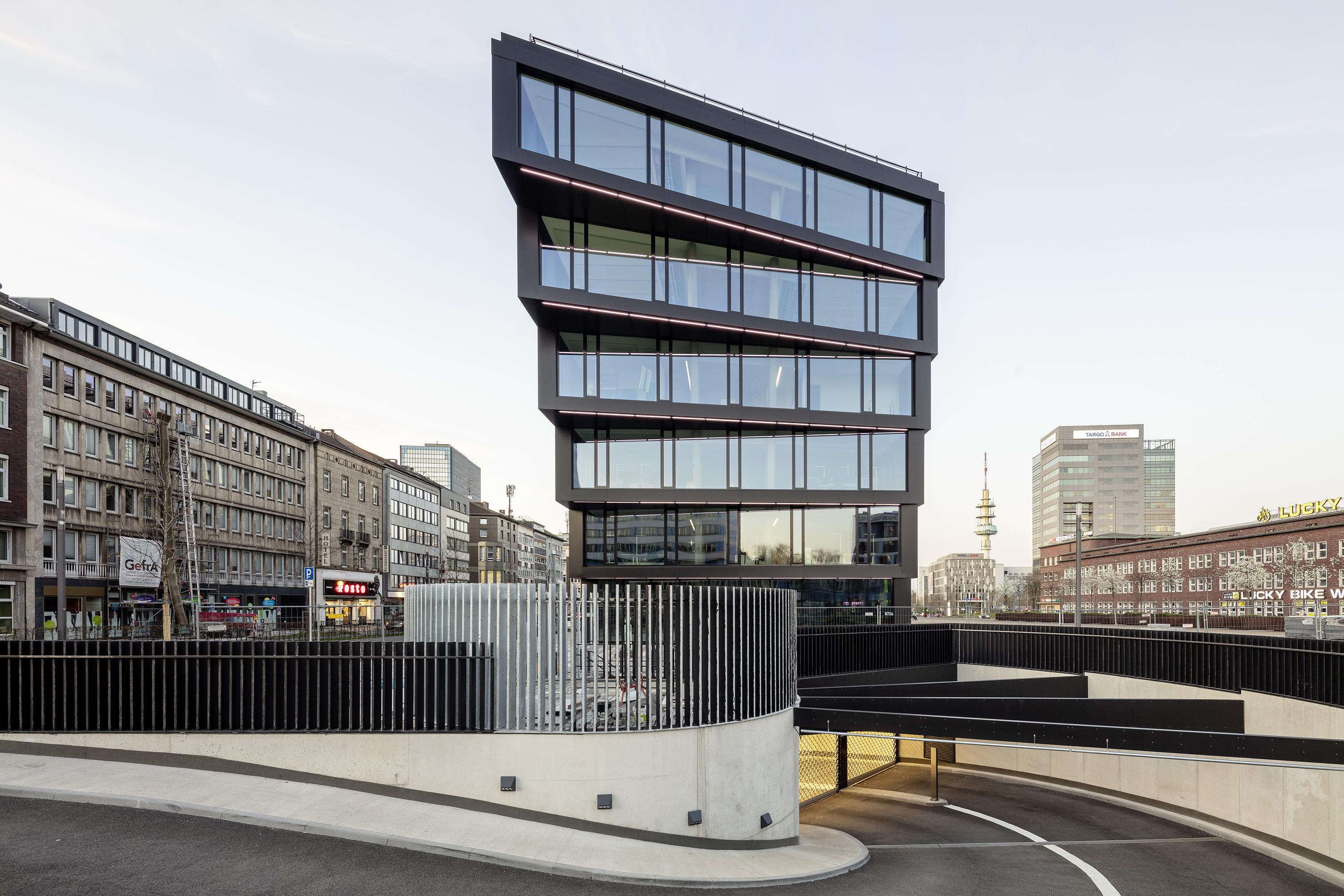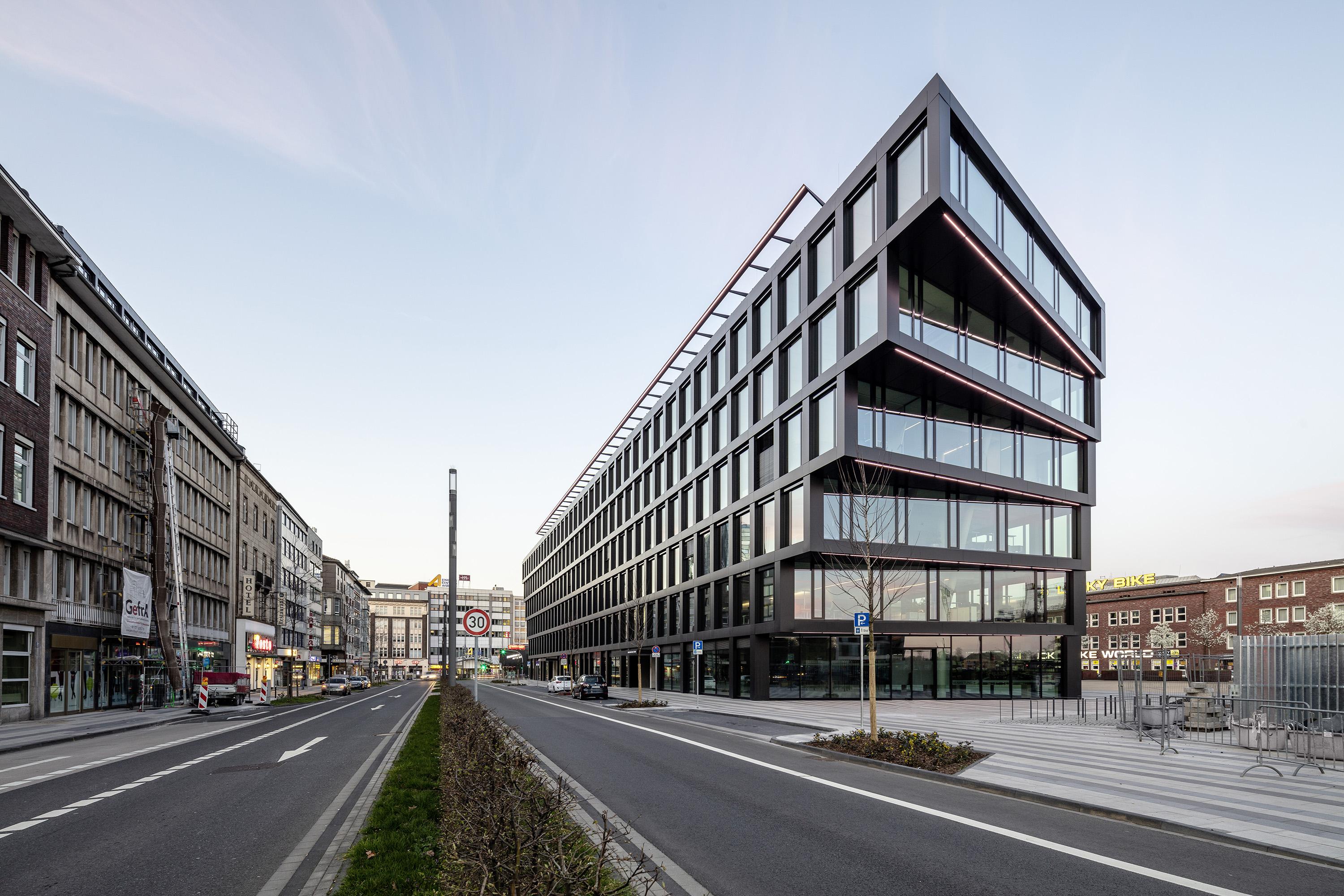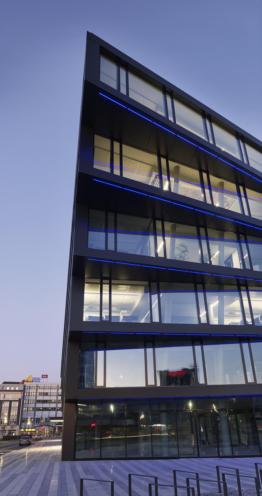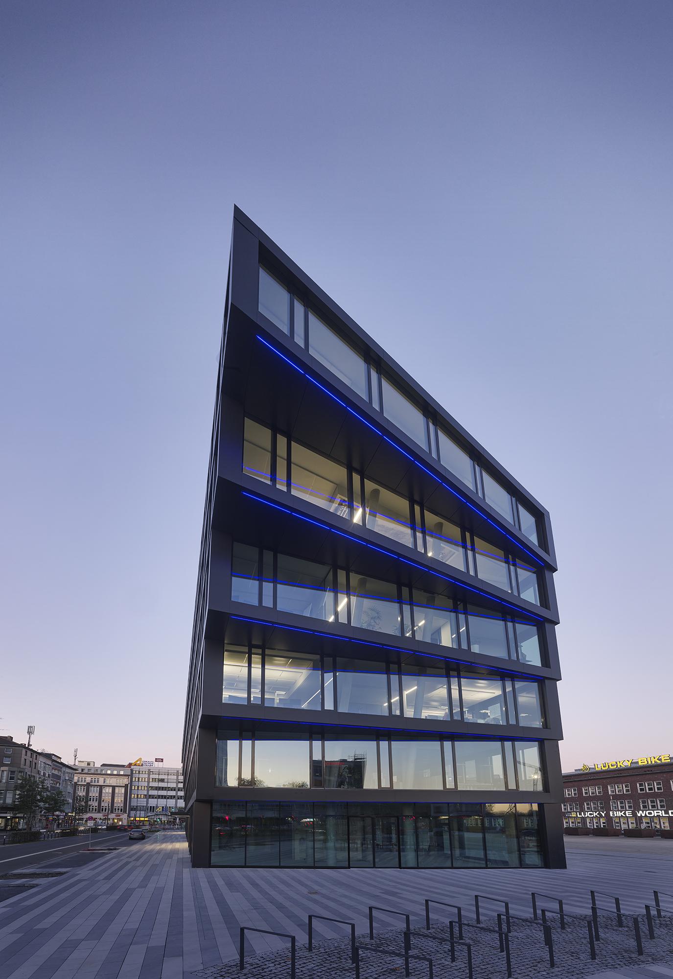 The entire façade is made of up to 90% recycled aluminium (Hydro CIRCAL from Wicona) and in this respect is to be understood as a pioneering flagship project on the German market. Triple-insulated solar control glass was installed for reasons dealing with thermal and noise insulation, and naturally as a sunscreen. State-of-the-art ceiling systems with integrated lighting provide the structure with heating, air conditioning, fresh air and improved acoustics at a heat recovery rate of over 80%. Envisaged for the underground car park are 50 bicycle stands along with 22 charging stations for electric cars, including an option to expand them. The roof area reserved for engineering is being greened on an extensive scale, the rooftop terrace on the 6th floor receives large areas displaying intensive landscaping in order to counter the urban ‘island heat effect’ with more greenery. The outer façade lighting (white lines of light) accentuates the fanning at the building’s short ends and changes colour to specifically match the city’s events. (e.g. red for the Chistmas market, blue & white for an MSV football match, etc.) The design of the publicly accessible interiors such as the entrance lobbies, lift hallways and stairwells is aligned to the ‘rough and tough’ credo appropriate to the Ruhr region, albeit without refraining from elegance while using pure, straightforward materials such as concrete, steel, glass, stone, wood and paint.