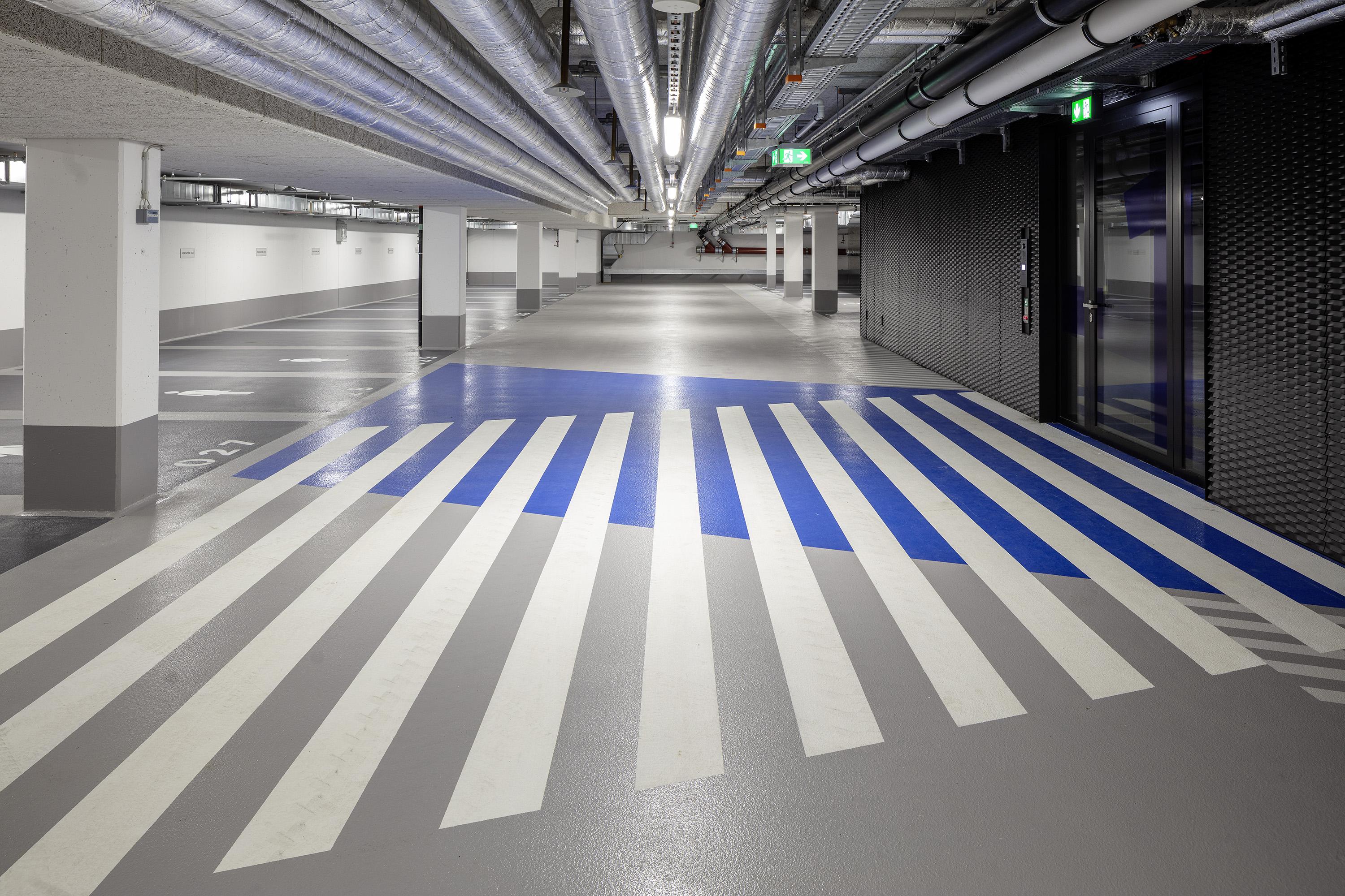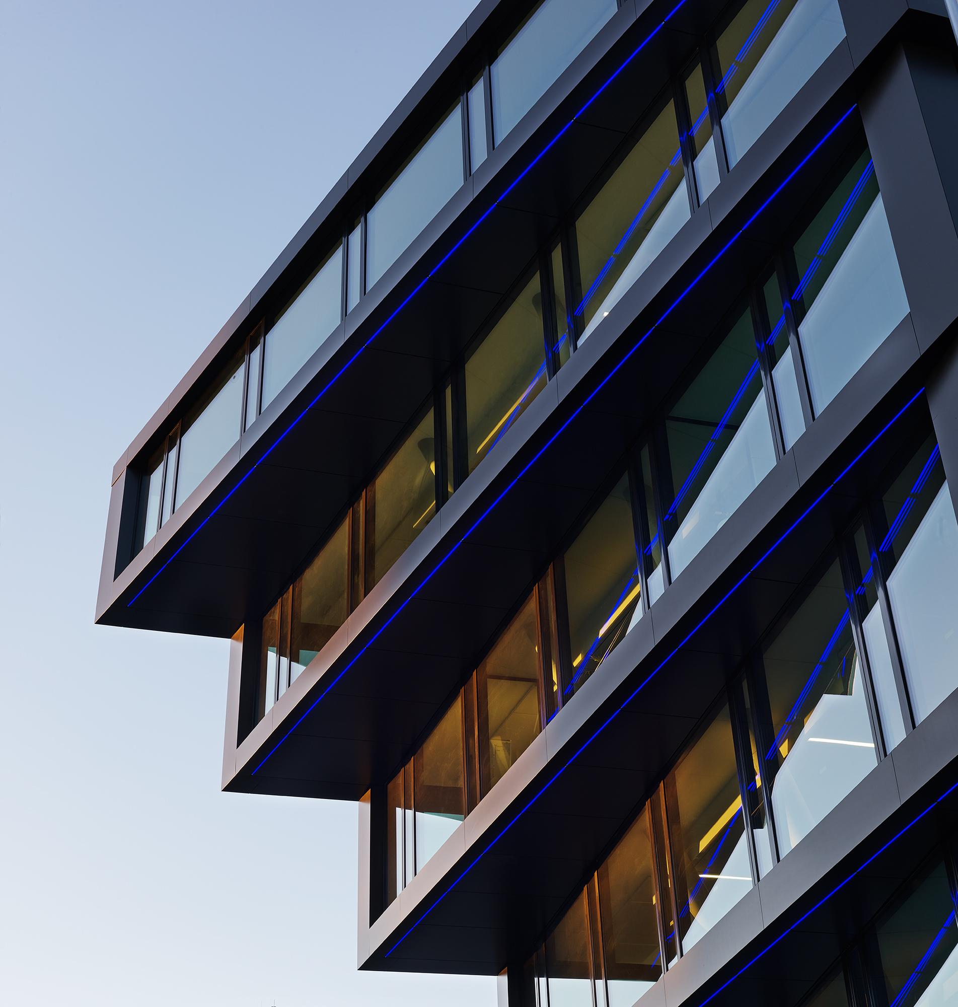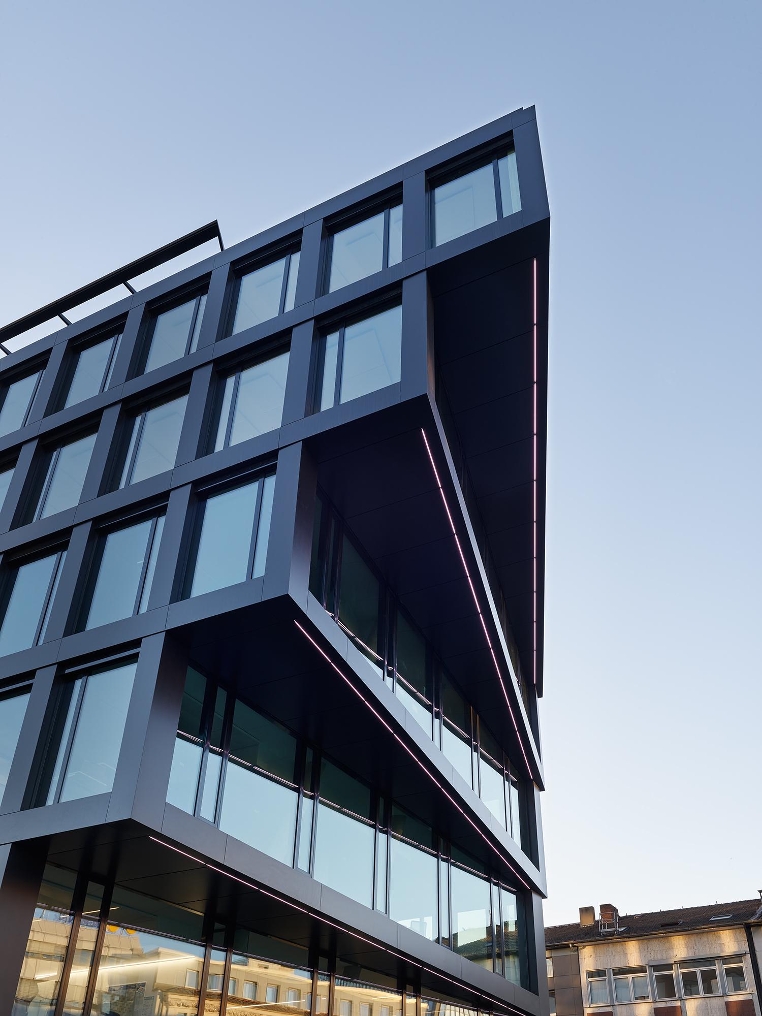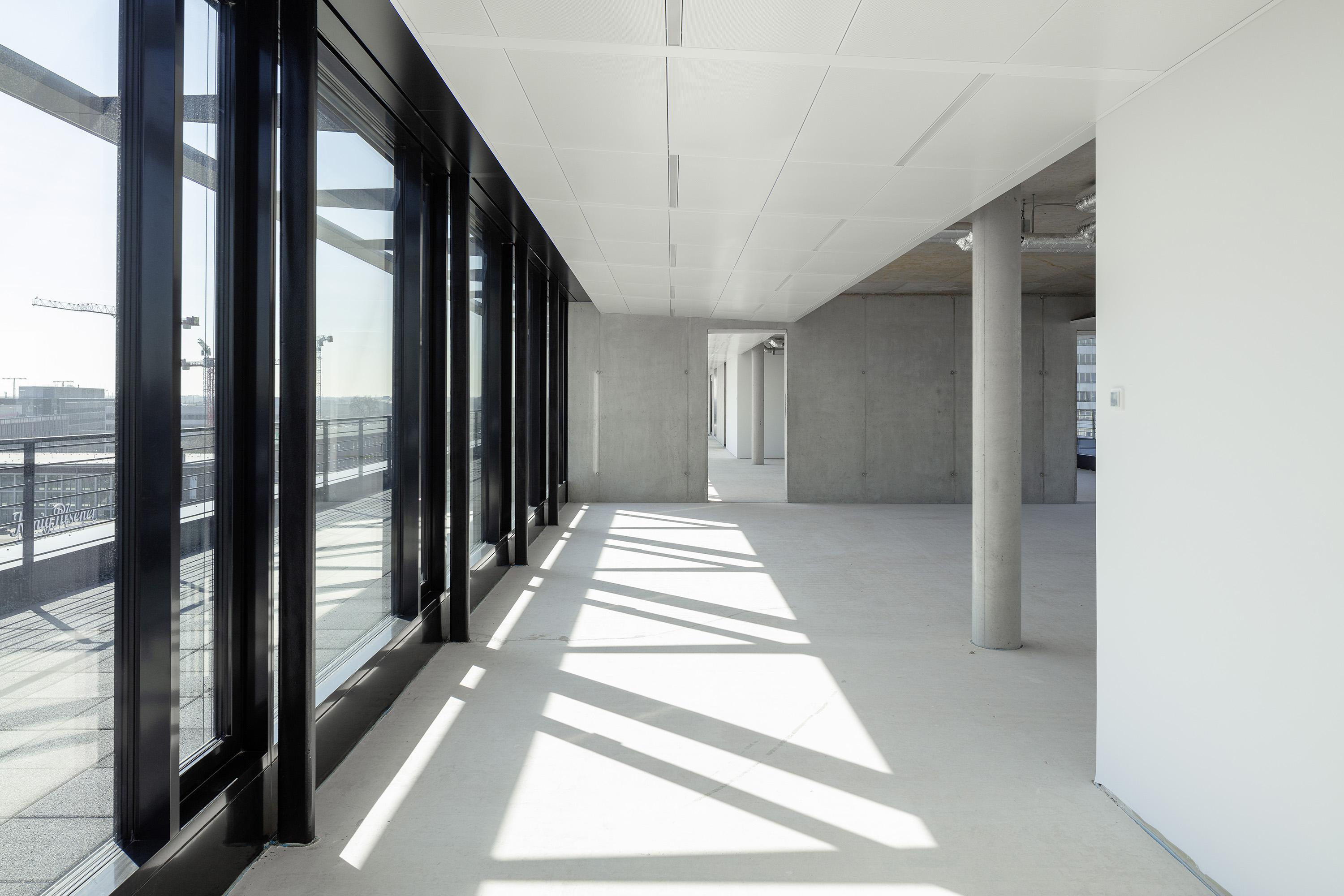 The entire façade is made of up to 90% recycled aluminium (Hydro CIRCAL from Wicona) and in this respect is to be understood as a pioneering flagship project on the German market. Triple-insulated solar control glass was installed for reasons dealing with thermal and noise insulation, and naturally as a sunscreen. State-of-the-art ceiling systems with integrated lighting provide the structure with heating, air conditioning, fresh air and improved acoustics at a heat recovery rate of over 80%. Envisaged for the underground car park are 50 bicycle stands along with 22 charging stations for electric cars, including an option to expand them. The roof area reserved for engineering is being greened on an extensive scale, the rooftop terrace on the 6th floor receives large areas displaying intensive landscaping in order to counter the urban ‘island heat effect’ with more greenery. The outer façade lighting (white lines of light) accentuates the fanning at the building’s short ends and changes colour to specifically match the city’s events. (e.g. red for the Chistmas market, blue & white for an MSV football match, etc.) The design of the publicly accessible interiors such as the entrance lobbies, lift hallways and stairwells is aligned to the ‘rough and tough’ credo appropriate to the Ruhr region, albeit without refraining from elegance while using pure, straightforward materials such as concrete, steel, glass, stone, wood and paint.