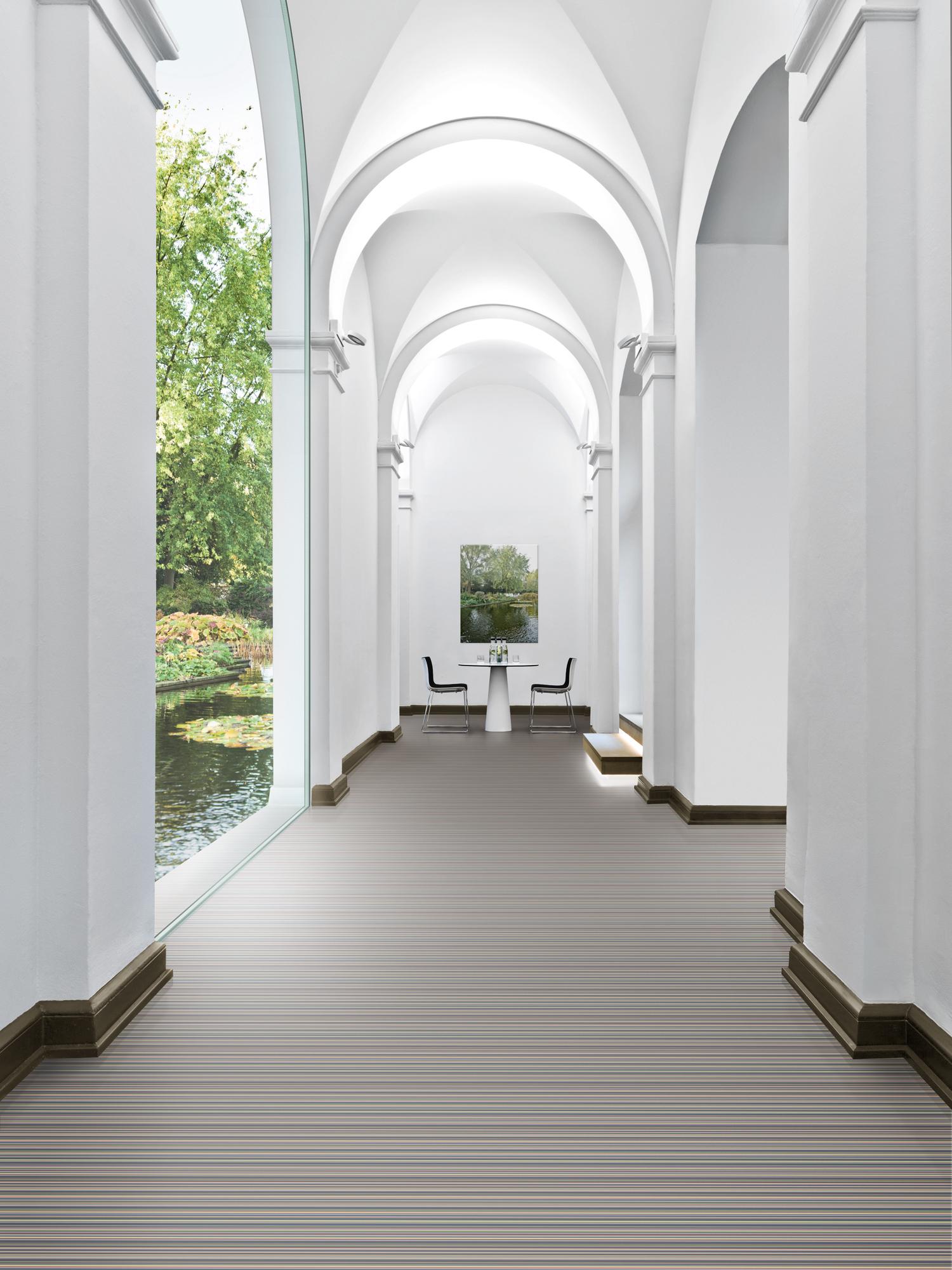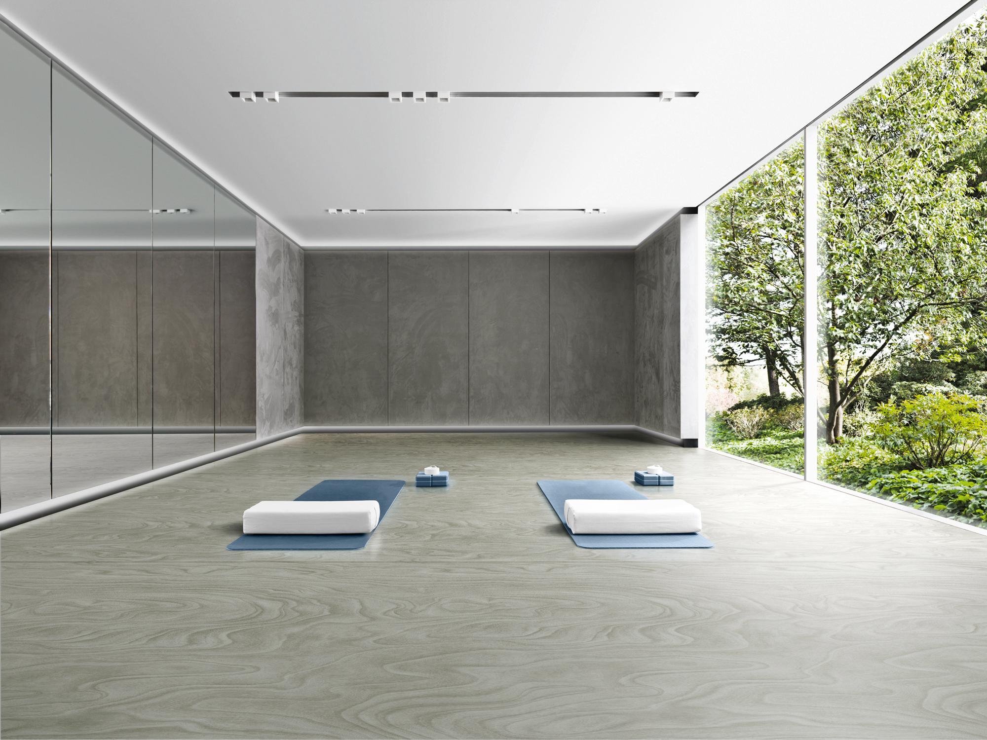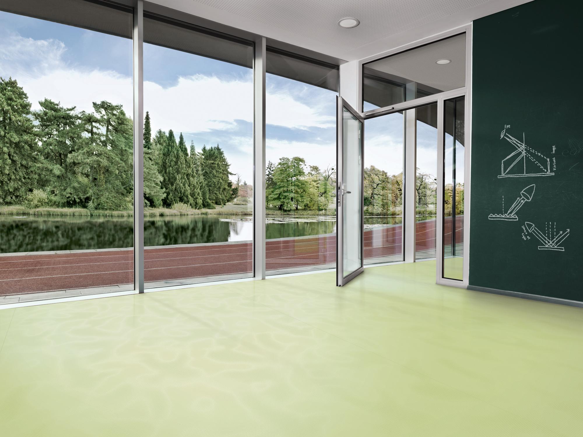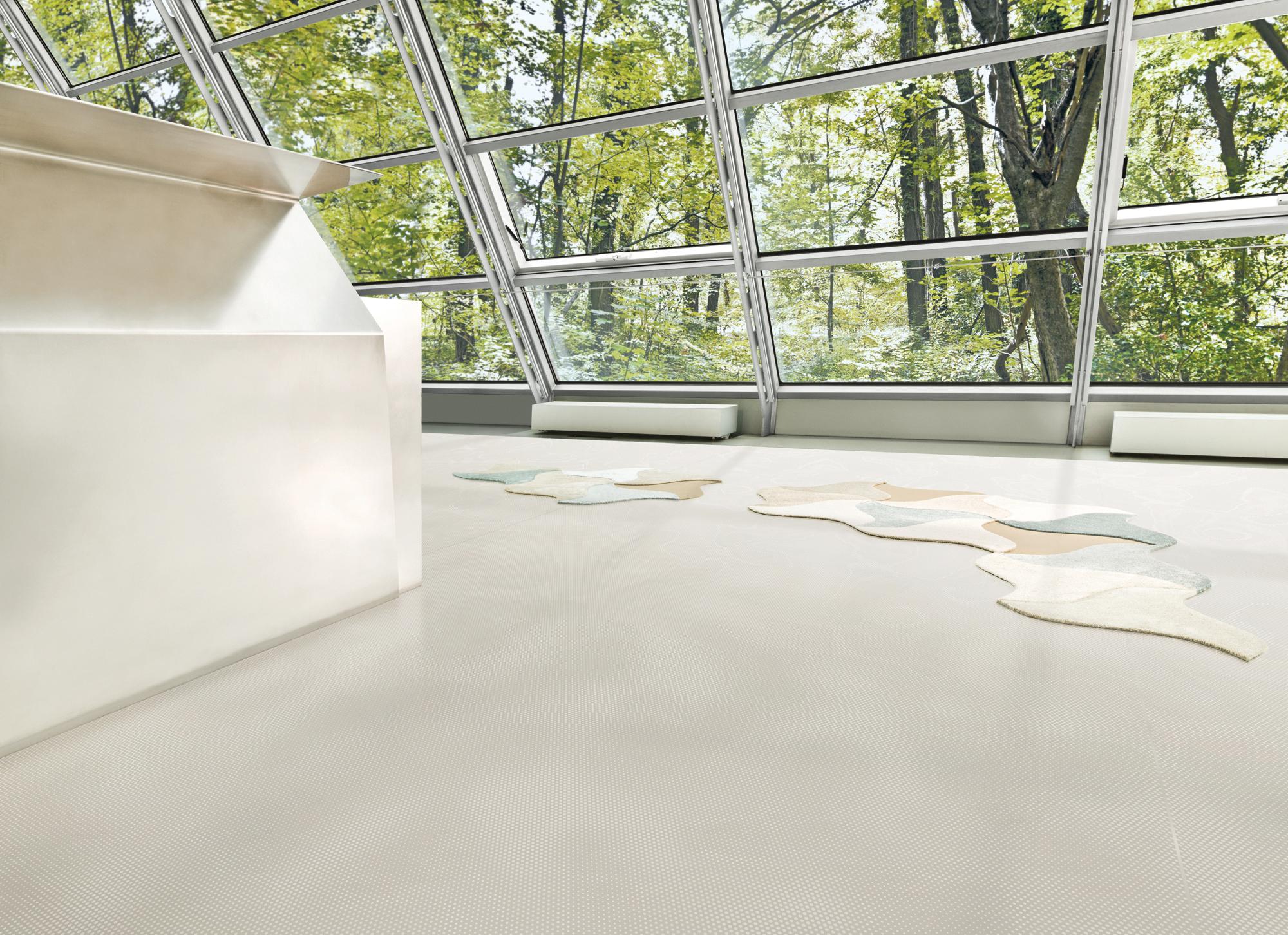 Elastic floor coveringA new, ecological generation of elastic floor coverings has come into being: “RE/COVER green”, a newly developed flooring made from natural raw materials – without PVCs, chlorine, plasticisers and solvents. Rapeseed and castor oils replace the petrochemical primary products. In doing so, the public’s desire for ‘ecologically correct’ materials is fulfilled to the same extent as the targeted goal for greater leeway in design. With a preliminary 30 variations for the time being, the wide-ranging product lines “Uni” and “Print” focus on pursuing the idea of artistically creative decor. Not on whether the wood or other substances seen in a given decor are truly authentic, the impression conveyed at first. As a result, the major attraction lies in the sense of aesthetics and an ecology of materials that no longer takes authenticity for granted; these factors are used instead to play with images of seamless concrete surfaces and areas of water shimmering in light. With this kind of instrument, every user can make their personal taste a reality without having to have environmental scruples, and without paying immense costs. The collection is co-ordinated in alignment with the ecological programme of carpet tiles entitled “SCALE” and “SCALE Living” by Vorwerk, the manufacturer.