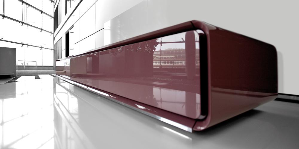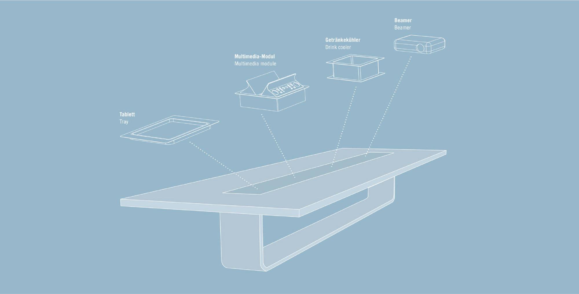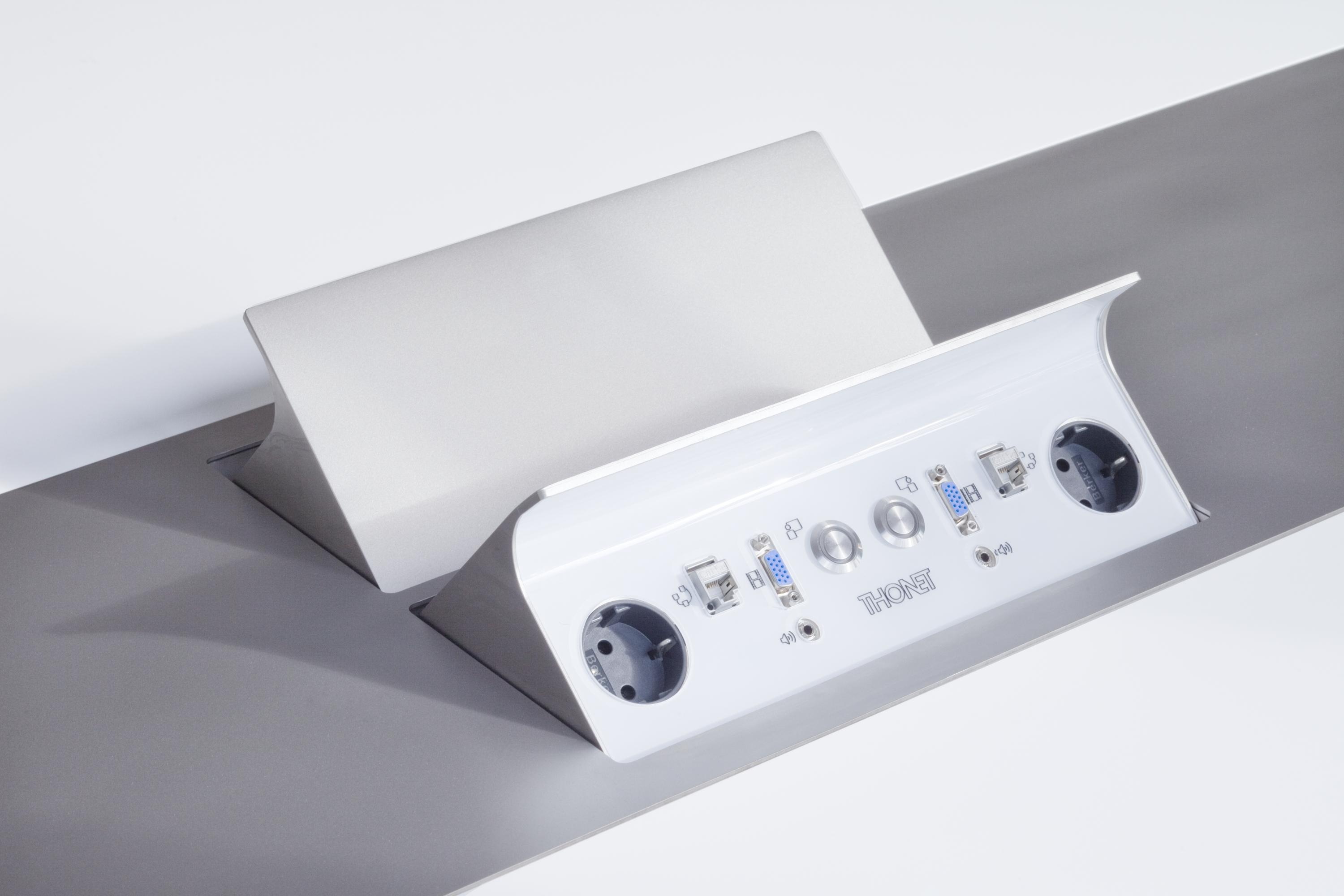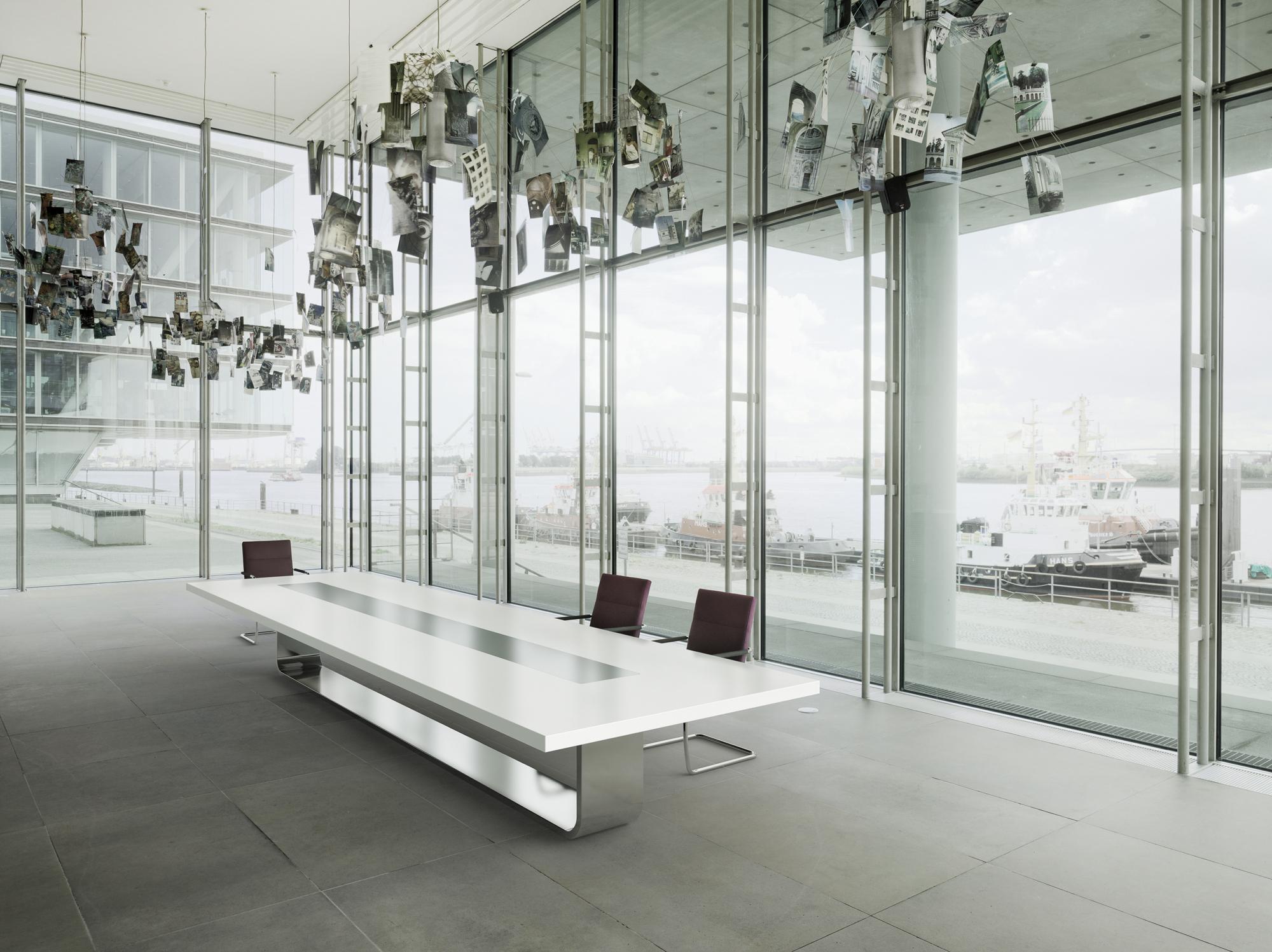 Conference tableA central bracket made of stainless steel gives the S 8000 conference-table system created for Thonet its sculpture-like elegance and visual sense of lightness. The bracket extends as a belt strip along the tabletop surface. Modules bearing different functions can be fitted in there: multimedia connections, beamers, beverage coolers or storage boxes. These supplements are housed in an easily accessible and unobtrusive manner, enabling the S 8000 to easily adapt to current trends in conference technology. Cables are routed invisibly within the load-bearing structure. A selection of surfaces made of mineral composites, wood or lacquer are available. In addition to five standard sizes, individually customised formats are possible, too.