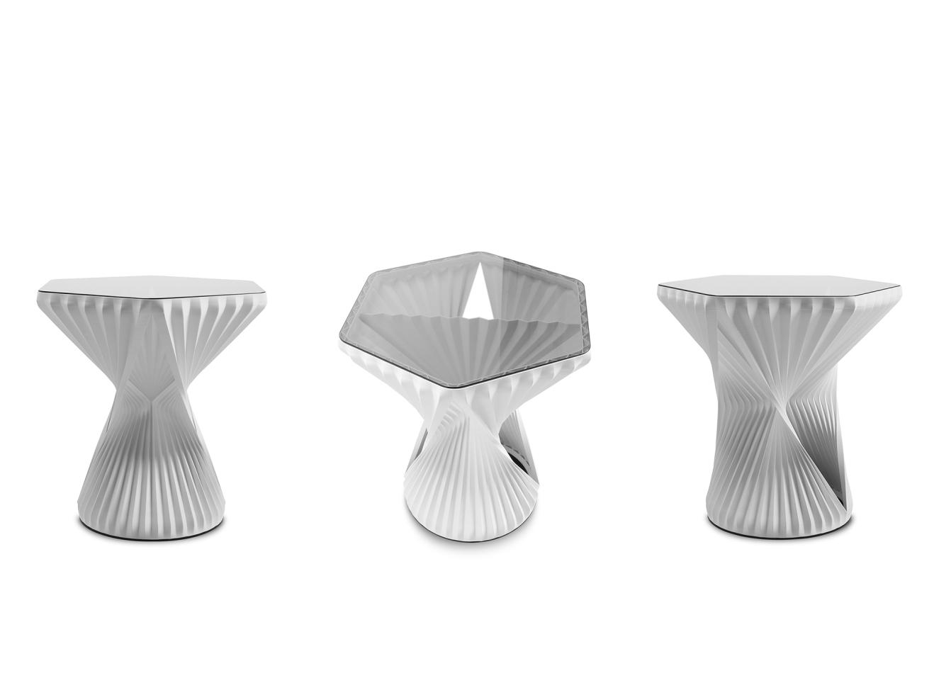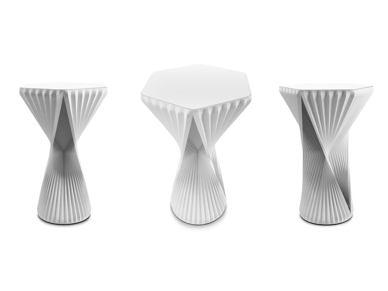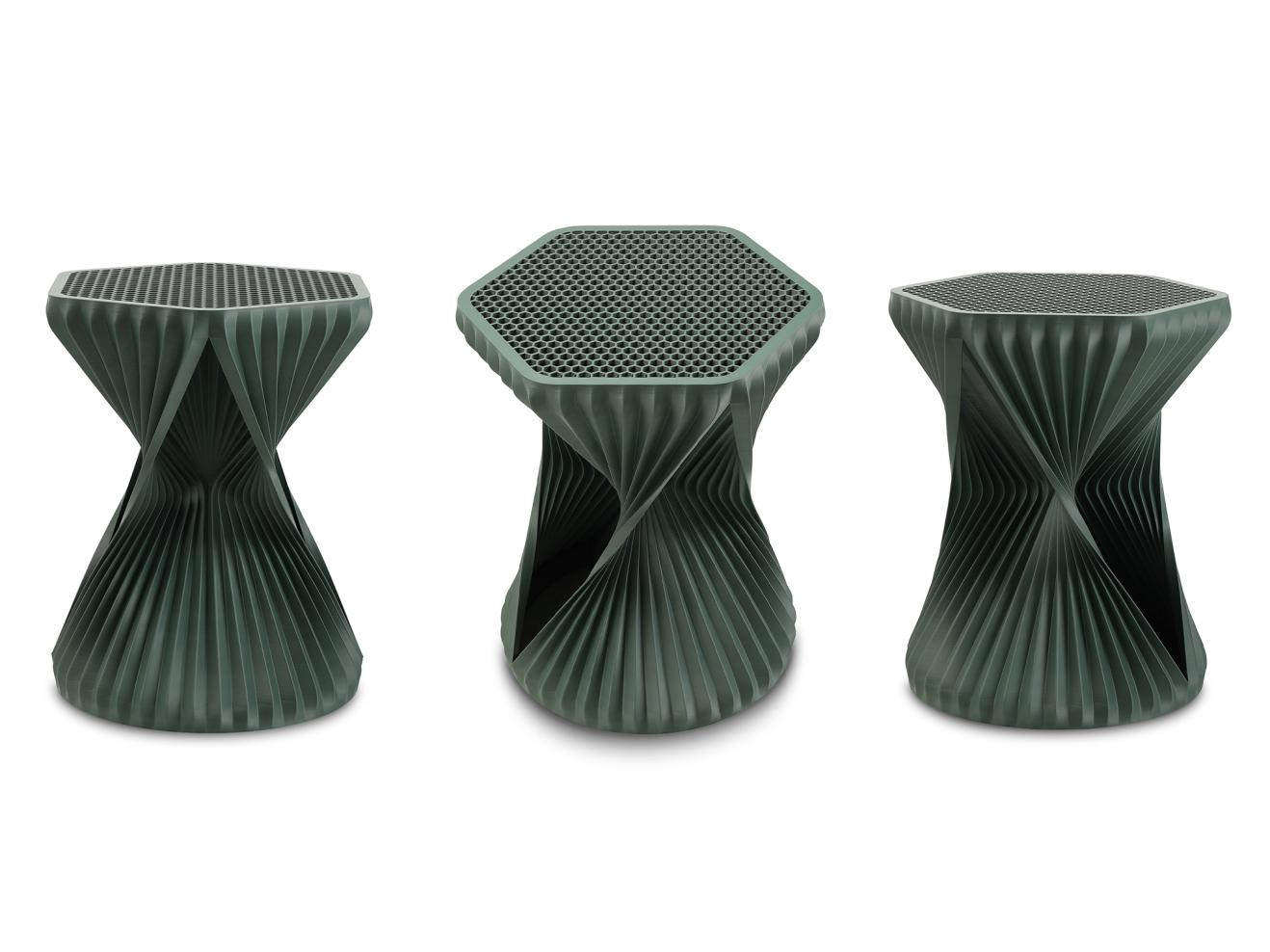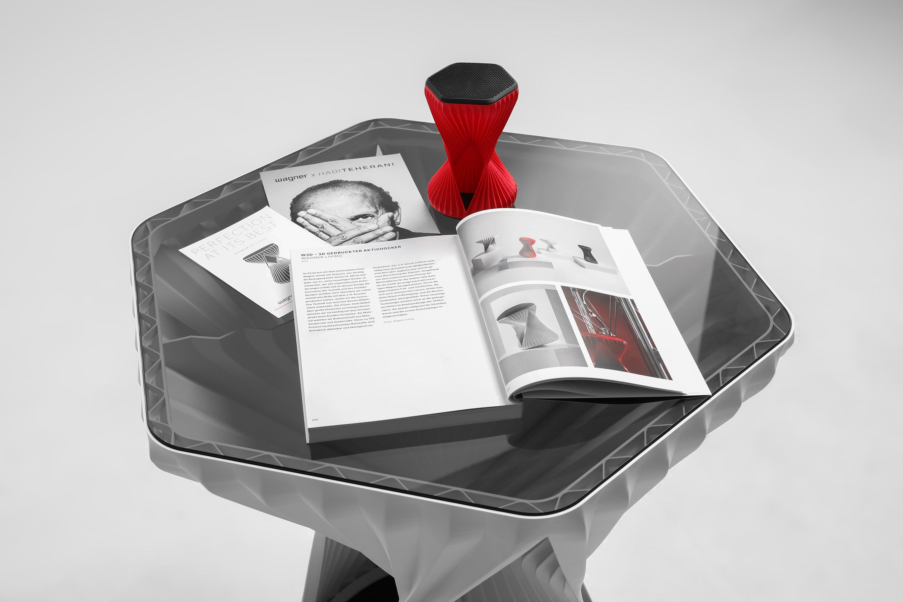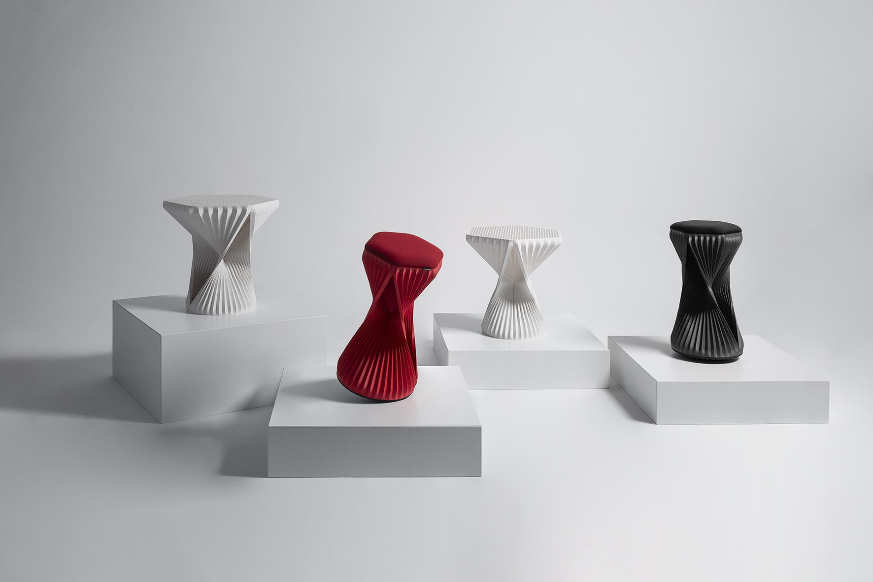 3D-printed tableProvides a perfect sitting experience – the three dimensionally movable W3D active stool by Hadi Teherani is worth more than just a glance. What makes it special is not only its unusual shape, but also the fact that it is produced using a 3D printing process with a bio-filament material made from renewable raw materials.