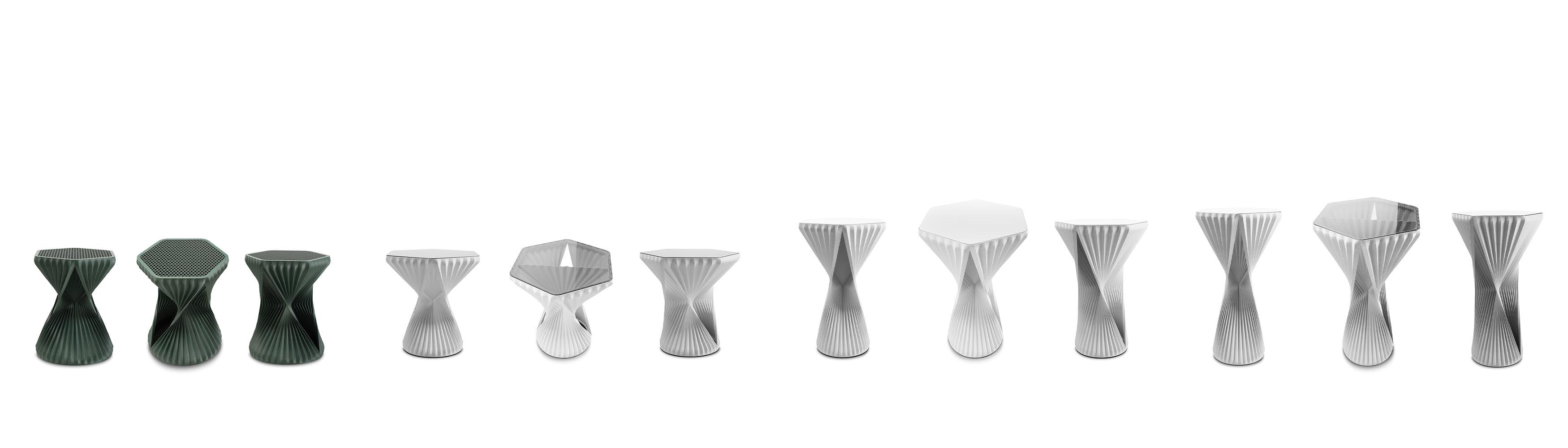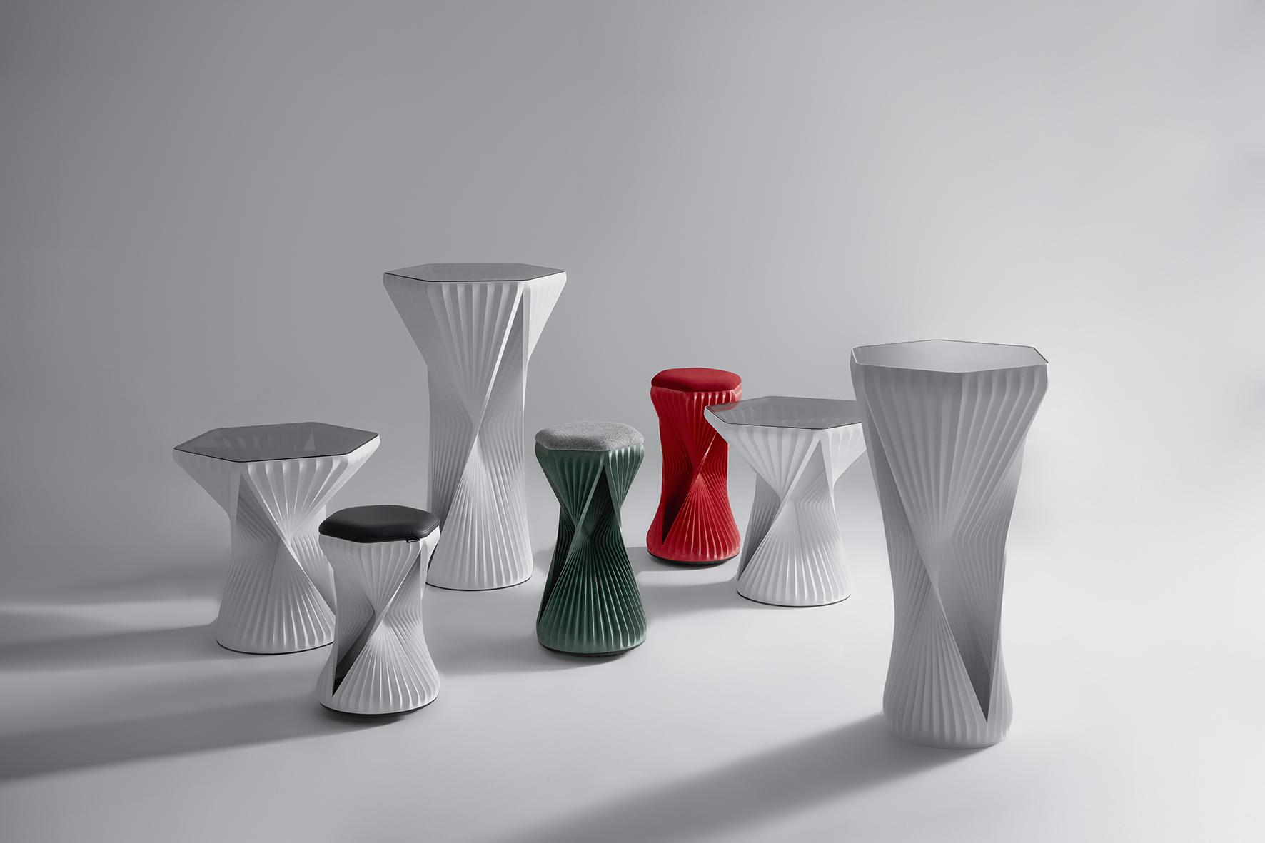 To match the stool, the innovative W3D table has now been launched, and with its four different table heights, it is the ideal product addition for the office, reception area or catering. The W3D collection has a parametric structure and takes the form of an artistic fold that stretches inwards and outwards like a textile.