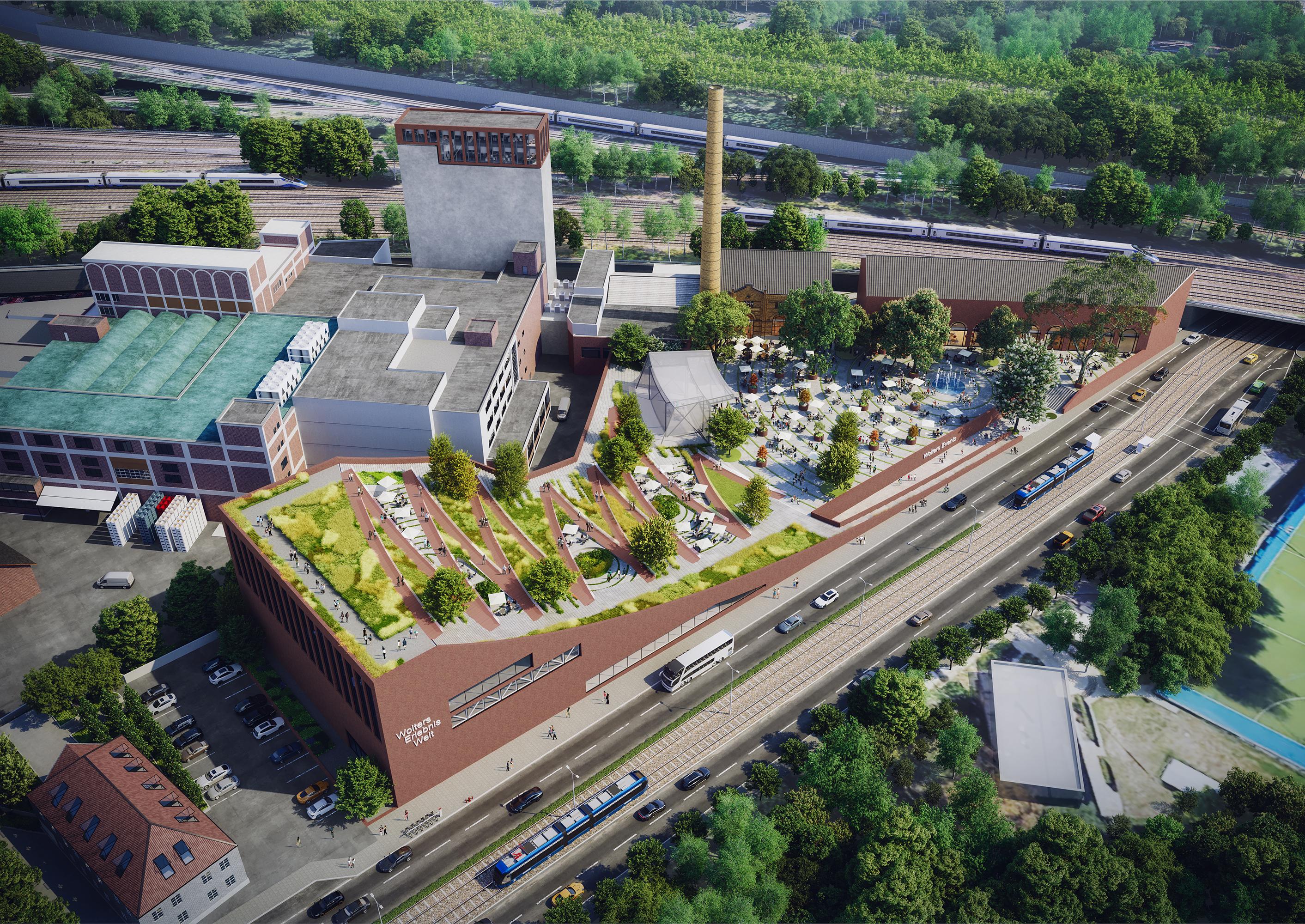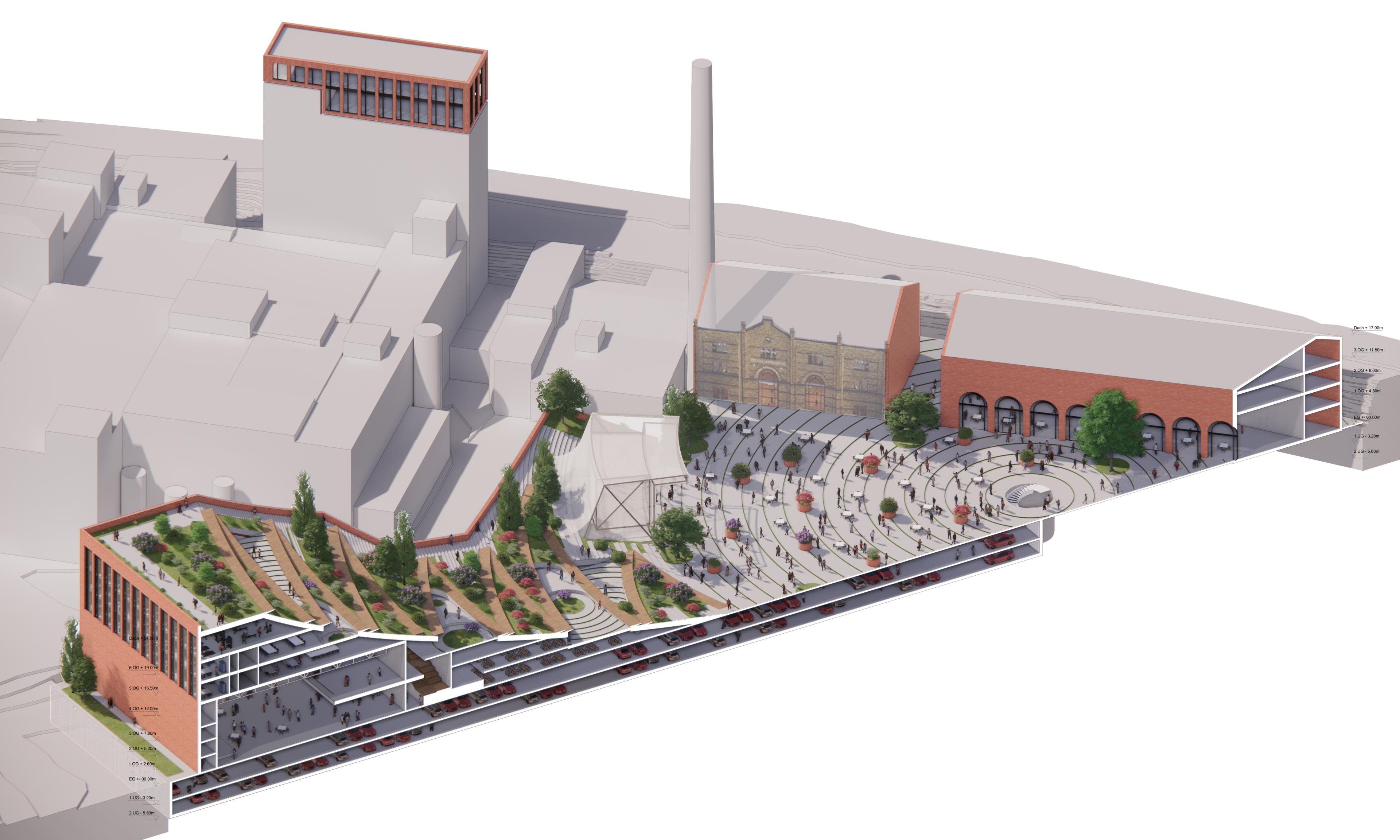 Mix of usesBraunschweig, GermanyTo expand the openly accessible areas at this large brewery’s “Erlebniswelt”, its world to experience, the event hall, offices and conference spaces are being aggregated within a slope-like building shell that slants southwards towards the old Hofbrauhaus brewery. The top floor houses the fitness club with bar. The structure’s intensively planted slope displaying five large terraces, the so-called hanging beer gardens, can be reached via inner serpentine switchbacks or by means of stairs at the side of the building. The internal uses are scaled up and augmented in a variety of ways as a result of the directly adjoining free spaces. A listed landmark, the Hofbrauhaus itself will be supplemented by a clearly delineated structural body containing a microbrewery. What emerges is an effective shielding from the railway along with a plaza for events with up to 5,000 visitors between the hanging beer gardens and the old brewery building. The highly versatile scenarios for operation range from multiple events held simultaneously up to a large-scale event, e.g. a jazz festival throughout the new plant complex.