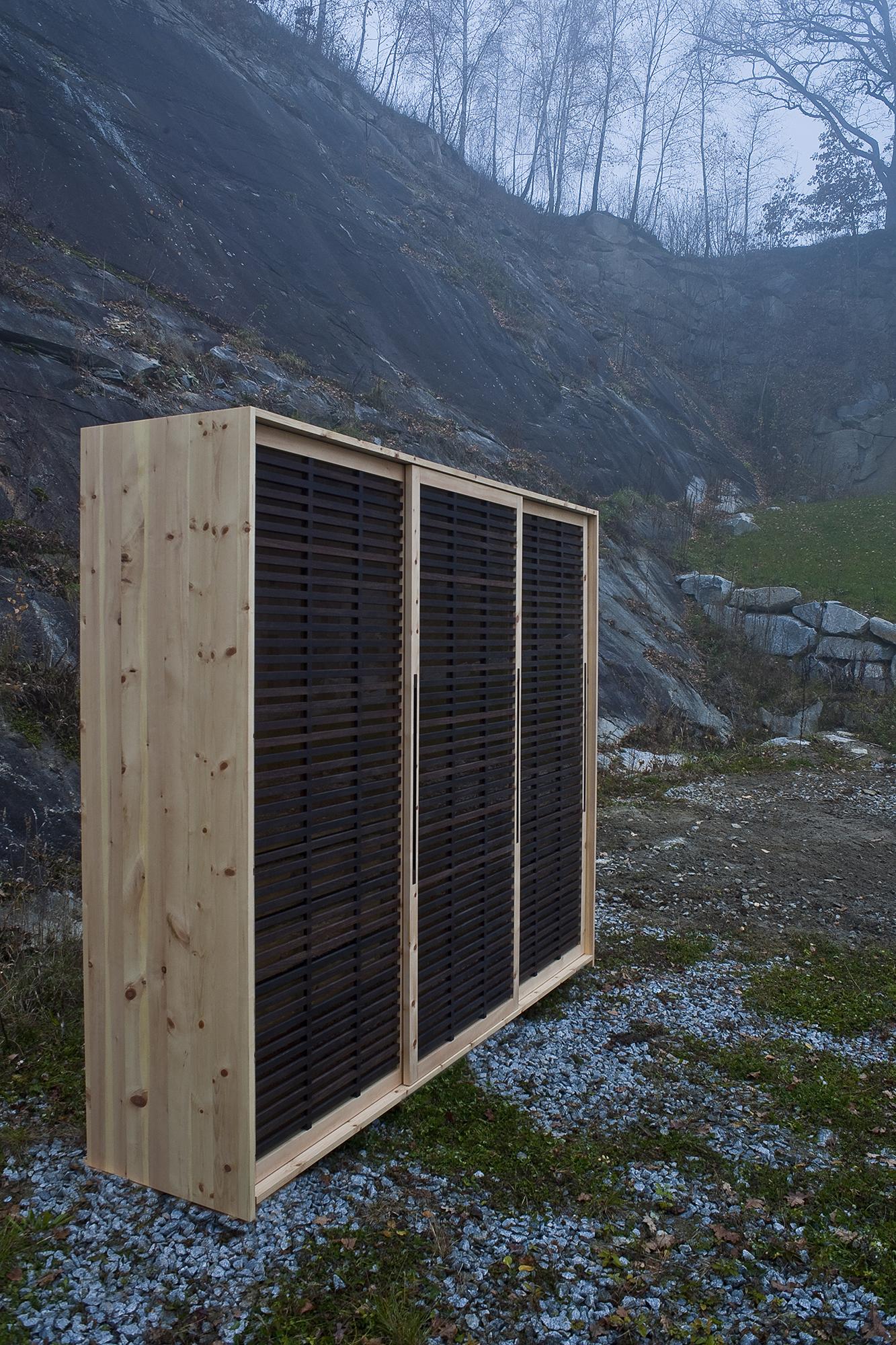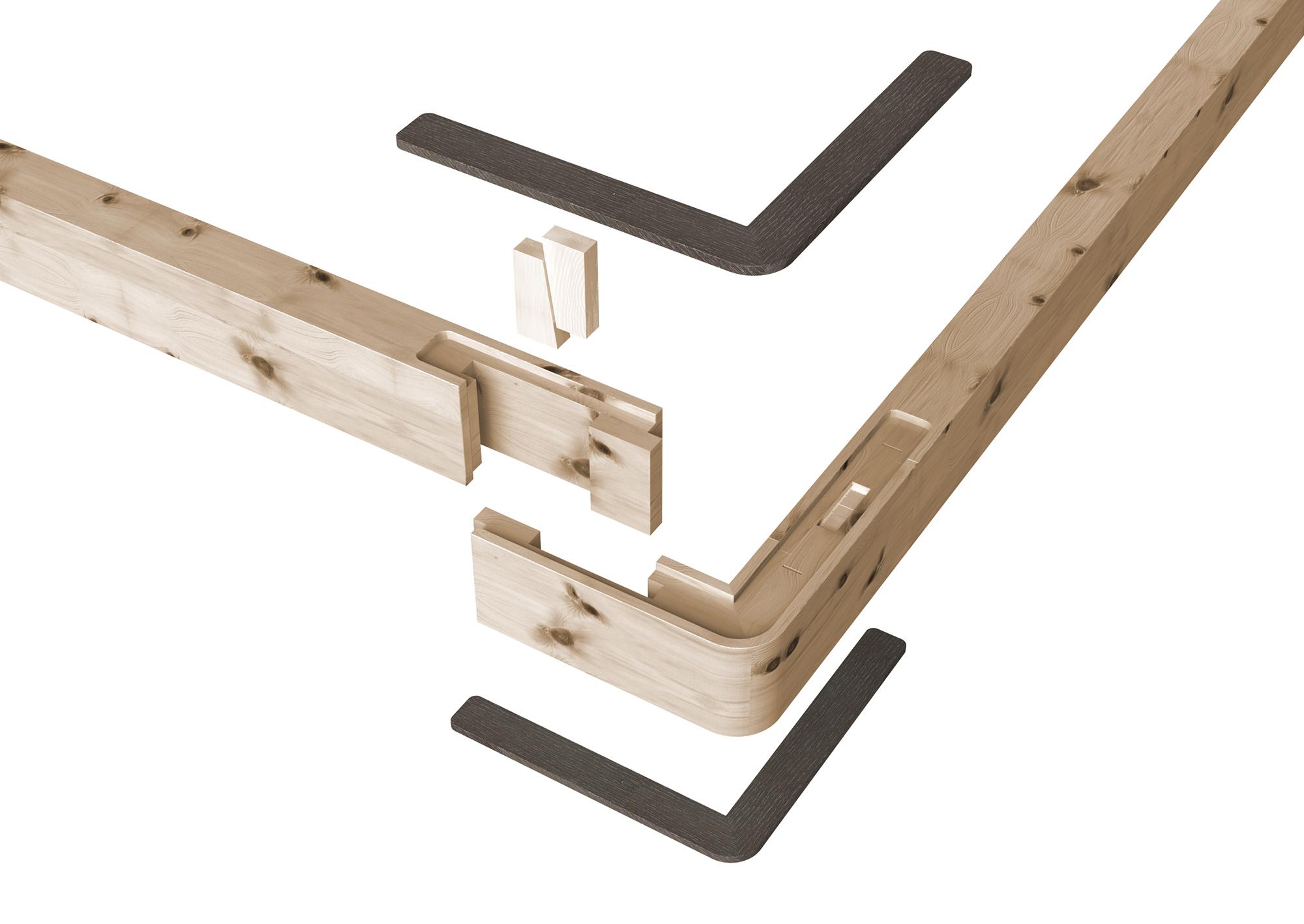 »In order toconsistently implement the unusual effect of the solid Swiss stone pine wood and the best manufacturing quality,all constructive details are carried out as plugin connections and made entirely of timber. In its design the Swiss stone pine contratsts with the darker and more homogenous precious wood wenge. «