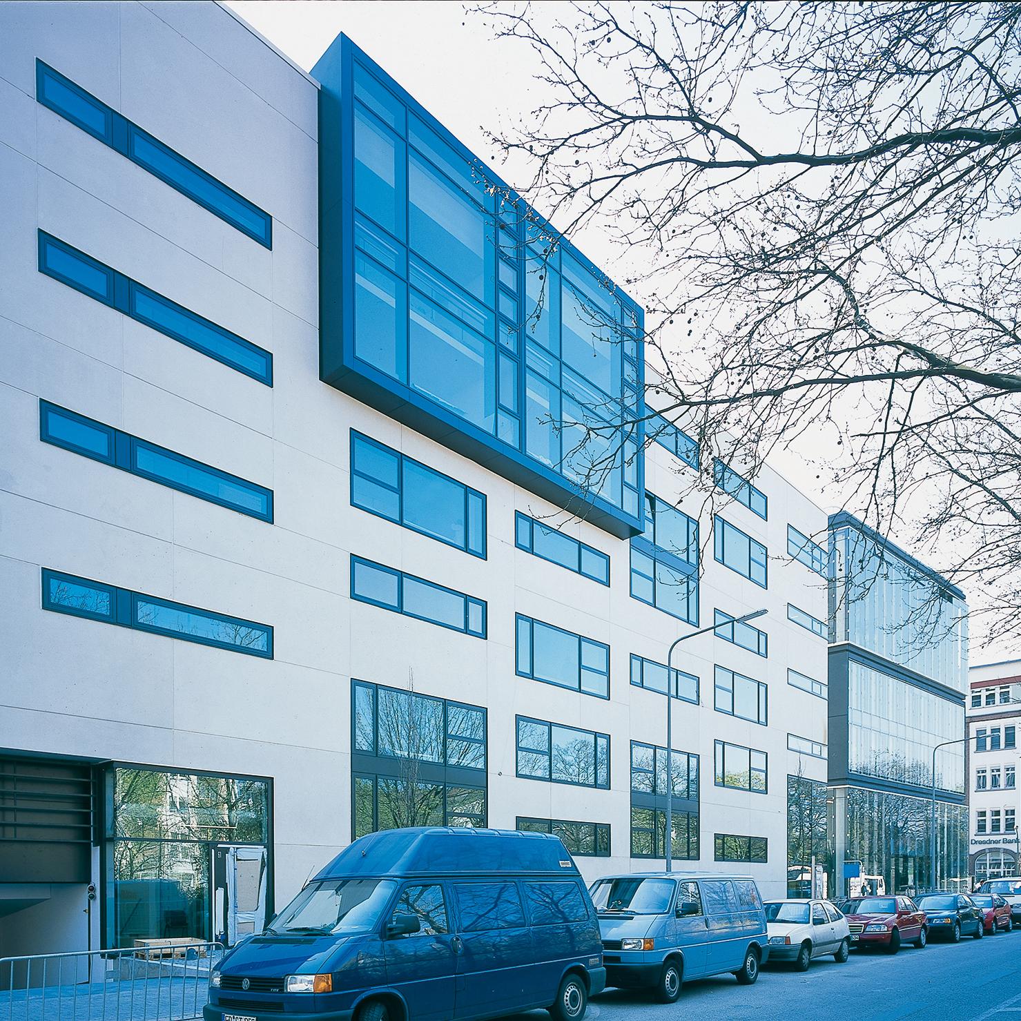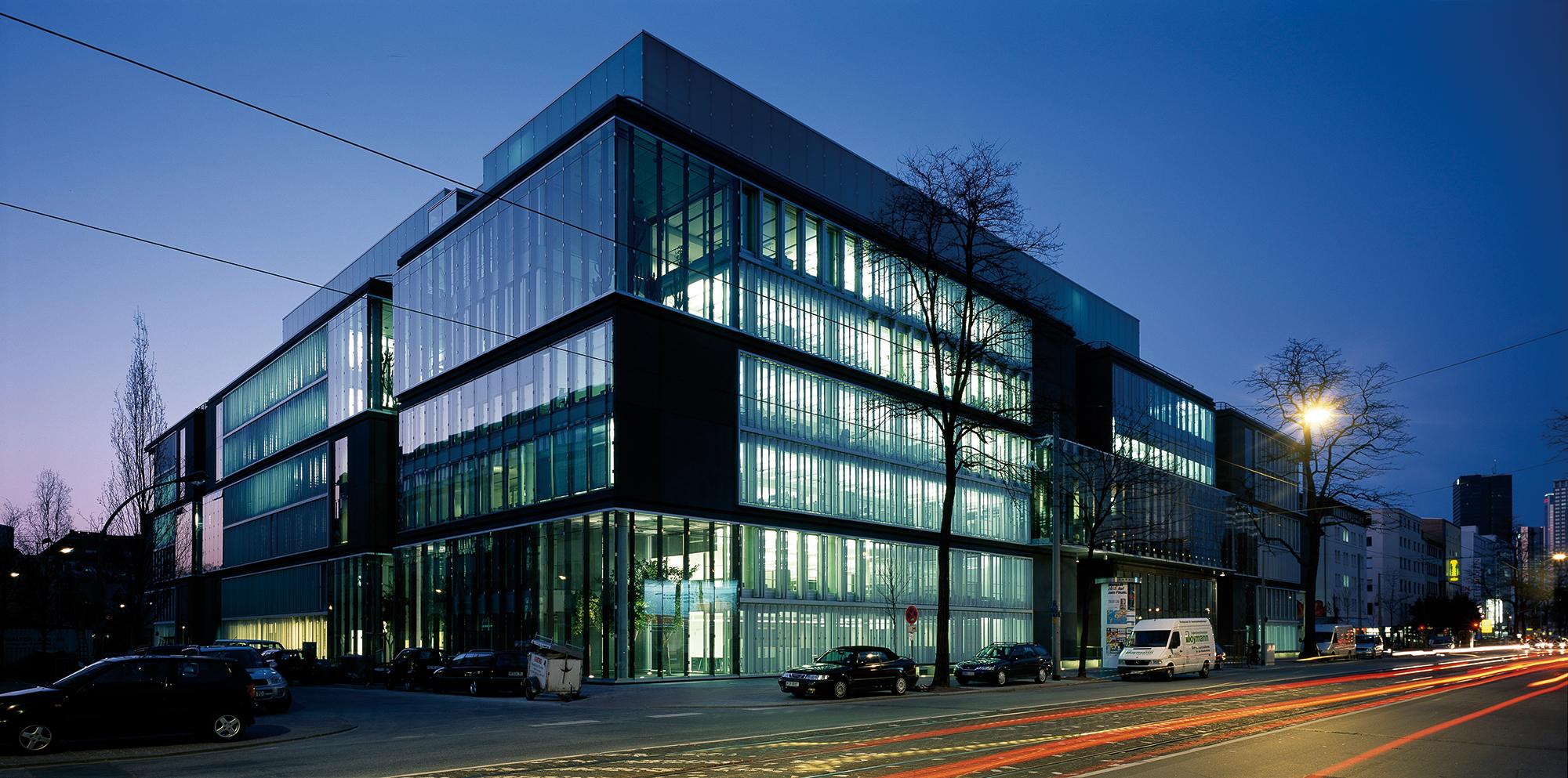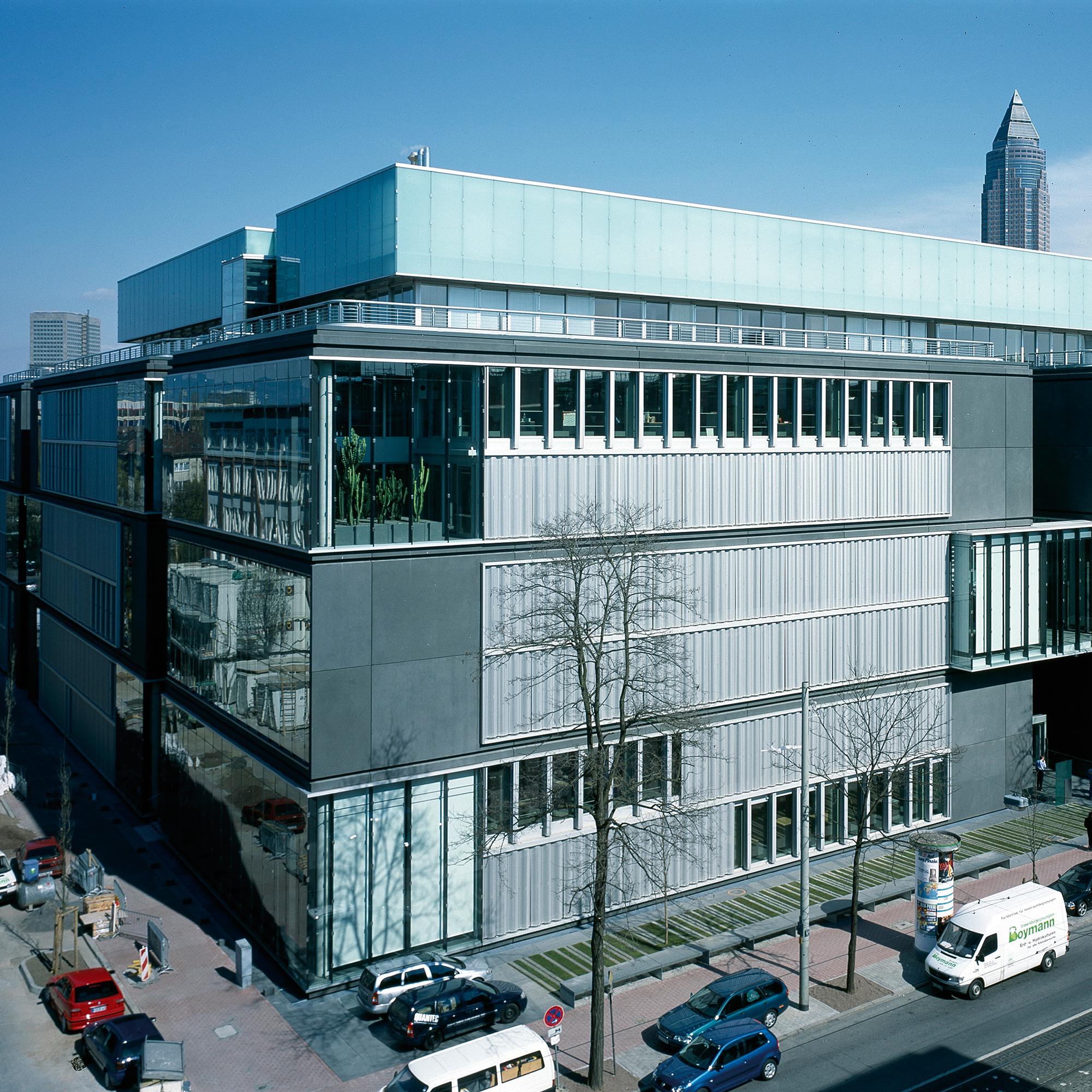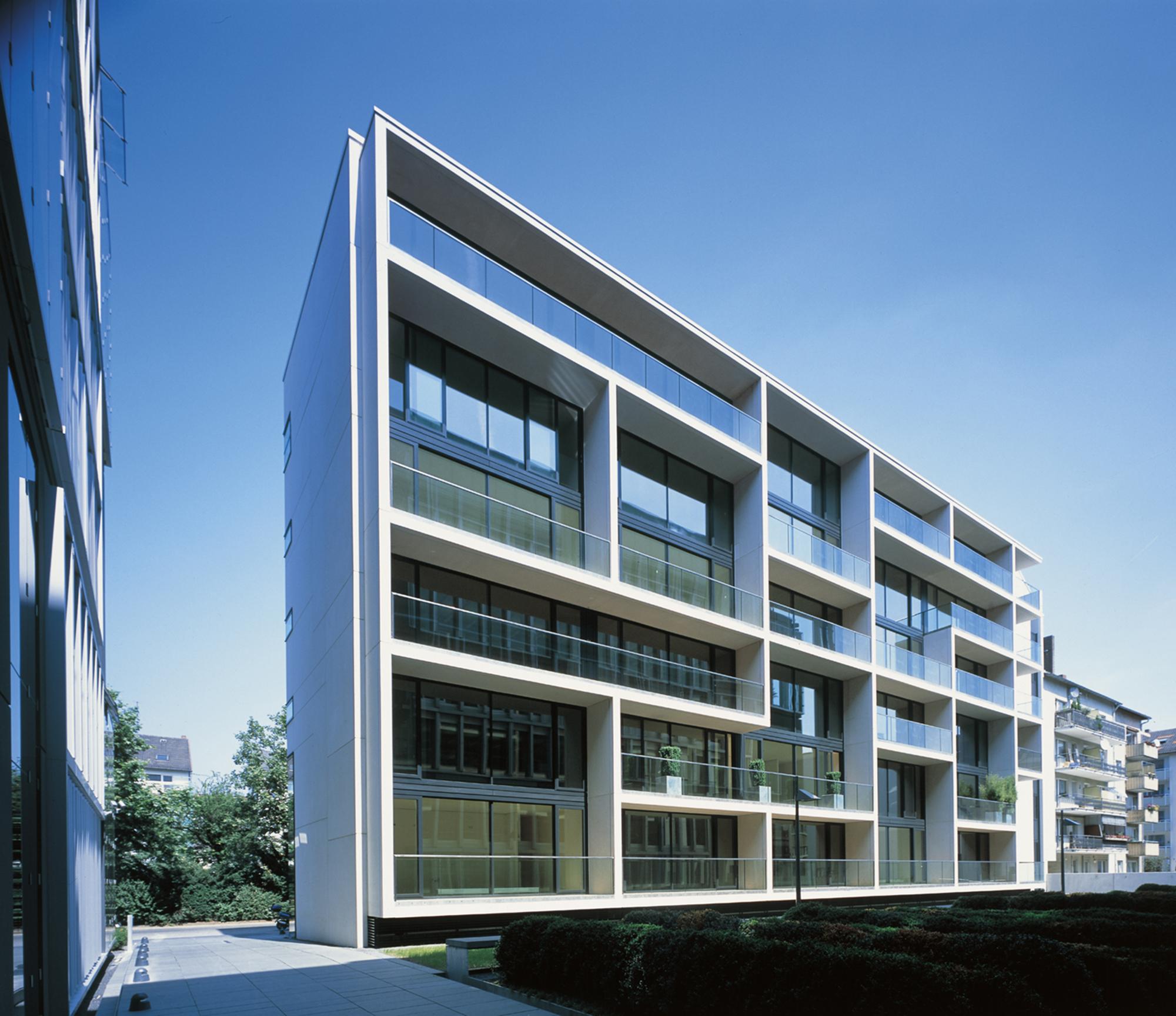 Office and residential buildingFrankfurt am Main, GermanyThe Carré in Frankfurt’s Mainzer Landstrasse, lies close to the Finance district, and the Conference Centre, in an area that is characterised by a mixture of indistrial, commercial and residential use. The largest part of the 8300 square metre site is filled with an office complex, comprising six independent units. Four of these six-storey units are positioned centrally, in windmill fashion around a glazed atrium. On the gable of the units there are alternatively, two-storey enclosing, framing elements, or green spaces. Thus, alternatively offset office tracts meander with generous green areas. The six-storey offices allow for flexible use and sub-division: combi-zones, twin-corridor solutions, and open-plan office spaces, are all possible. In Frankenallee, a six-storey apartment building is a pleasant transition between the offices and the older residential buildings. The maisonettes are L-shaped, and so, intersect in section. On the north side, a public green space is connected to the building, thereby creating a pleasant, natural atmosphere for the entire development.