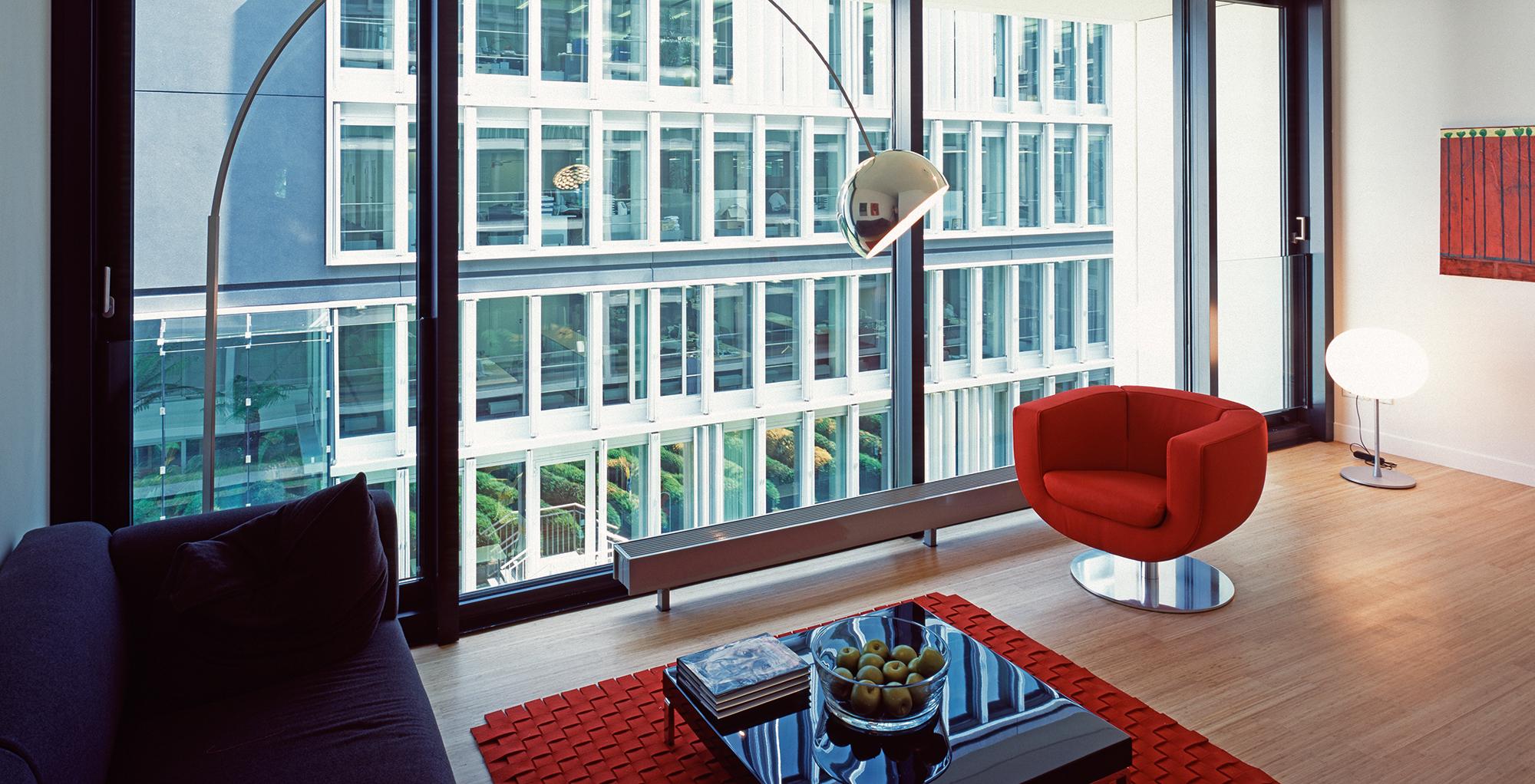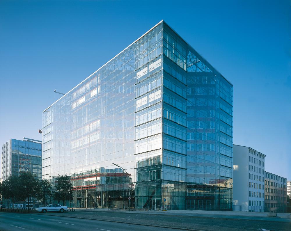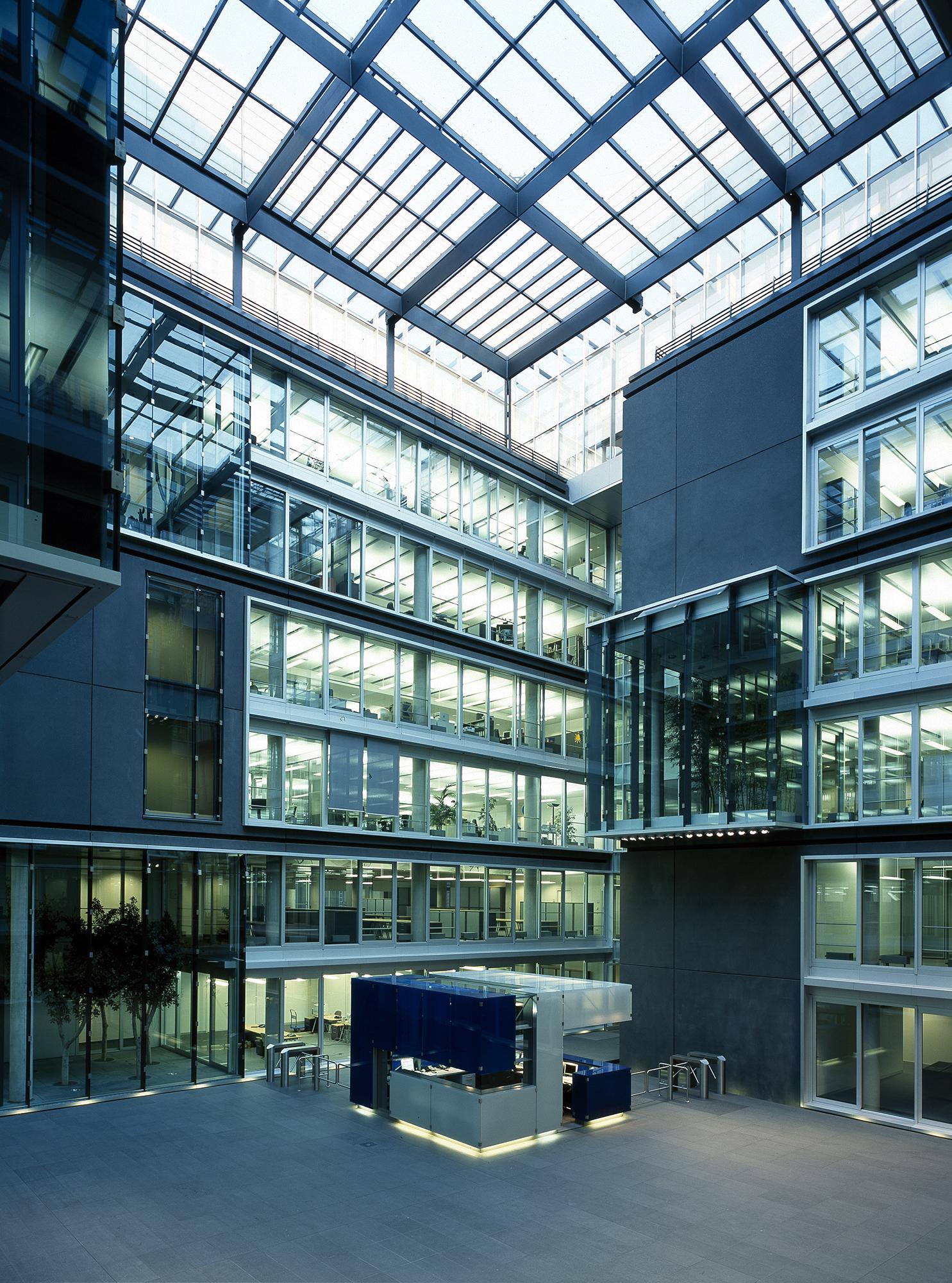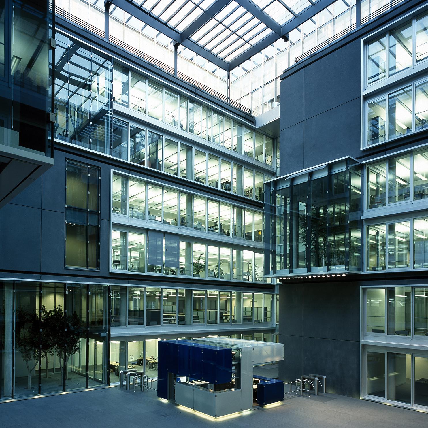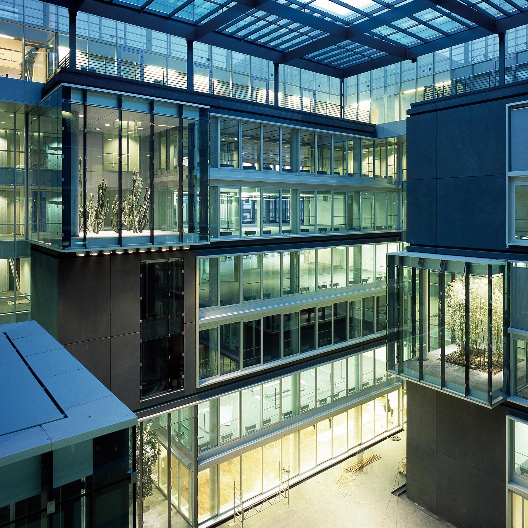 Office and residential buildingFrankfurt am Main, GermanyThe Carré in Frankfurt’s Mainzer Landstrasse, lies close to the Finance district, and the Conference Centre, in an area that is characterised by a mixture of indistrial, commercial and residential use. The largest part of the 8300 square metre site is filled with an office complex, comprising six independent units. Four of these six-storey units are positioned centrally, in windmill fashion around a glazed atrium. On the gable of the units there are alternatively, two-storey enclosing, framing elements, or green spaces. Thus, alternatively offset office tracts meander with generous green areas. The six-storey offices allow for flexible use and sub-division: combi-zones, twin-corridor solutions, and open-plan office spaces, are all possible. In Frankenallee, a six-storey apartment building is a pleasant transition between the offices and the older residential buildings. The maisonettes are L-shaped, and so, intersect in section. On the north side, a public green space is connected to the building, thereby creating a pleasant, natural atmosphere for the entire development.
