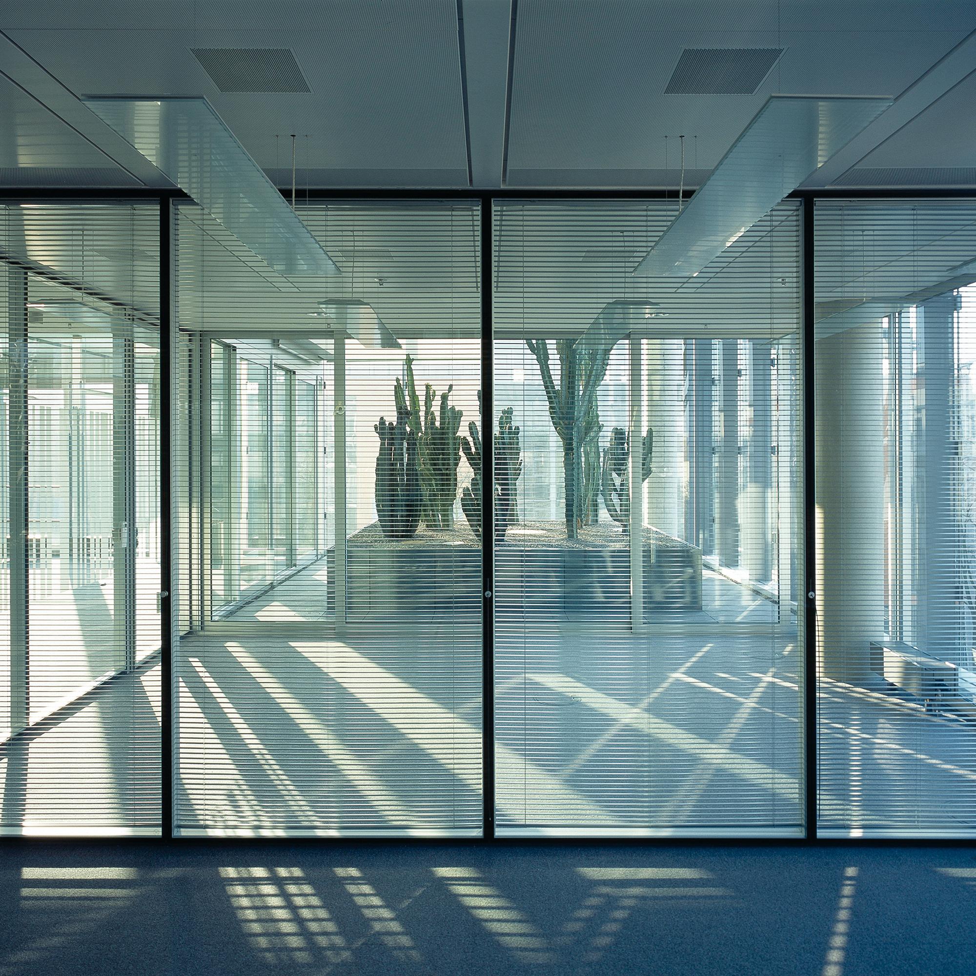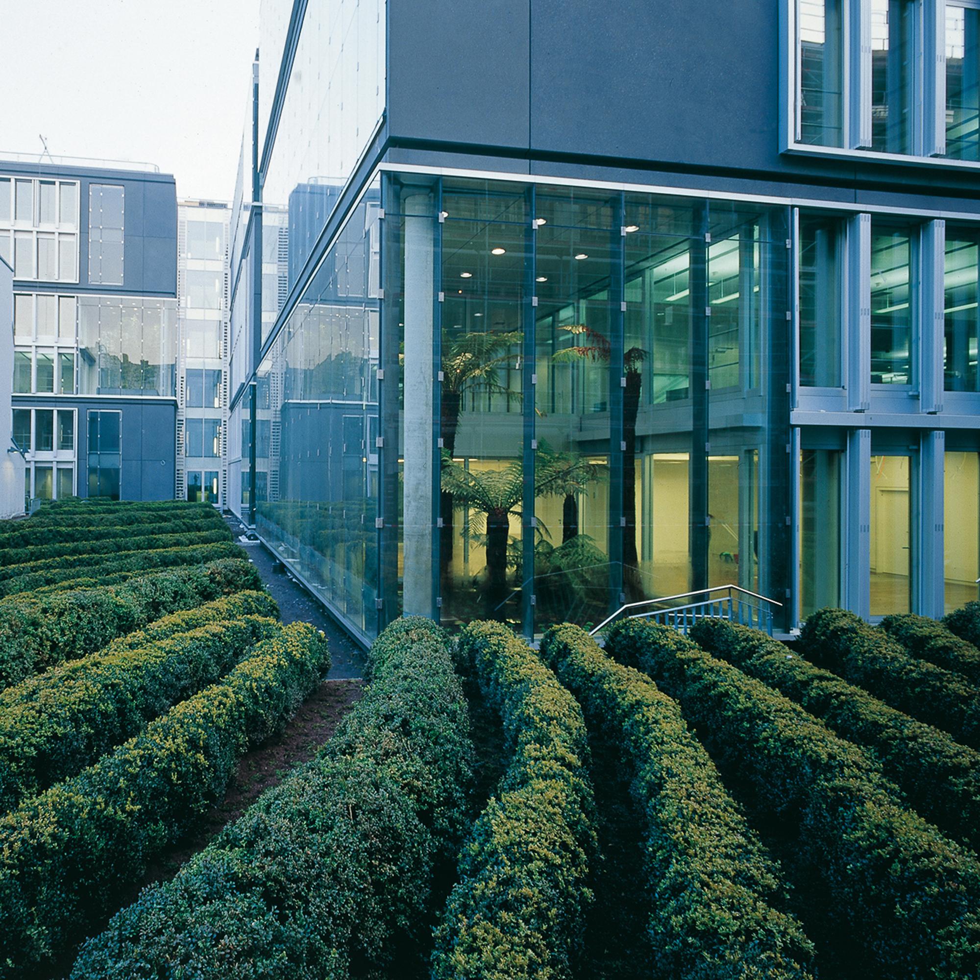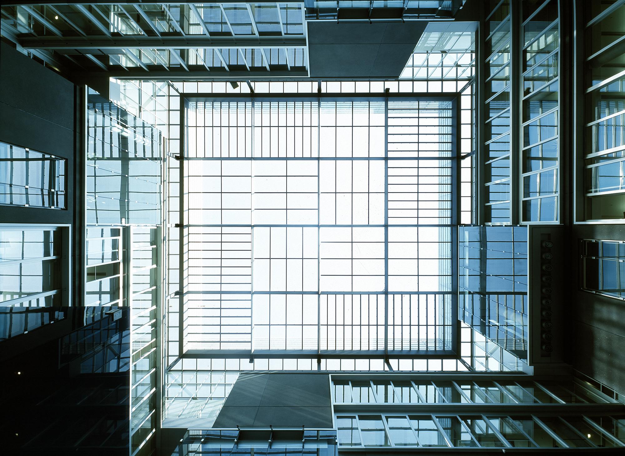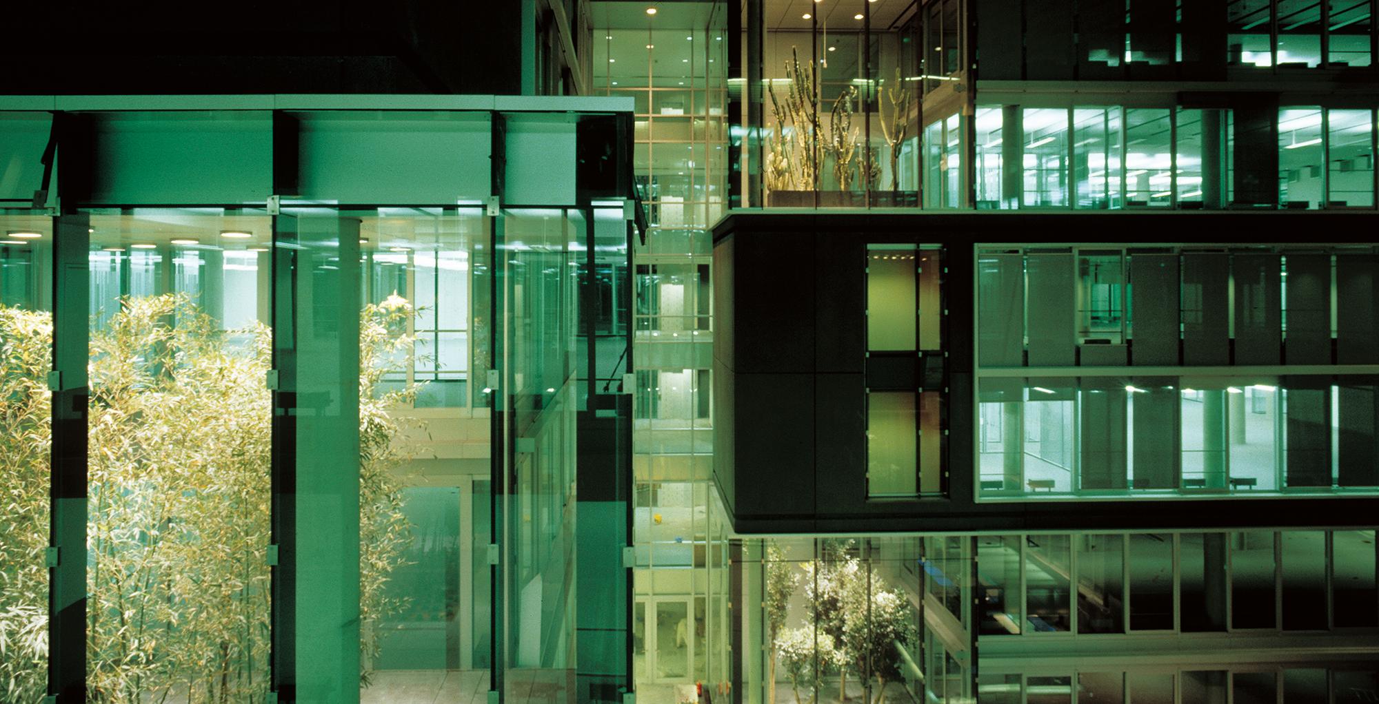 Office and residential buildingFrankfurt am Main, GermanyThe Carré in Frankfurt’s Mainzer Landstrasse, lies close to the Finance district, and the Conference Centre, in an area that is characterised by a mixture of indistrial, commercial and residential use. The largest part of the 8300 square metre site is filled with an office complex, comprising six independent units. Four of these six-storey units are positioned centrally, in windmill fashion around a glazed atrium. On the gable of the units there are alternatively, two-storey enclosing, framing elements, or green spaces. Thus, alternatively offset office tracts meander with generous green areas. The six-storey offices allow for flexible use and sub-division: combi-zones, twin-corridor solutions, and open-plan office spaces, are all possible. In Frankenallee, a six-storey apartment building is a pleasant transition between the offices and the older residential buildings. The maisonettes are L-shaped, and so, intersect in section. On the north side, a public green space is connected to the building, thereby creating a pleasant, natural atmosphere for the entire development.