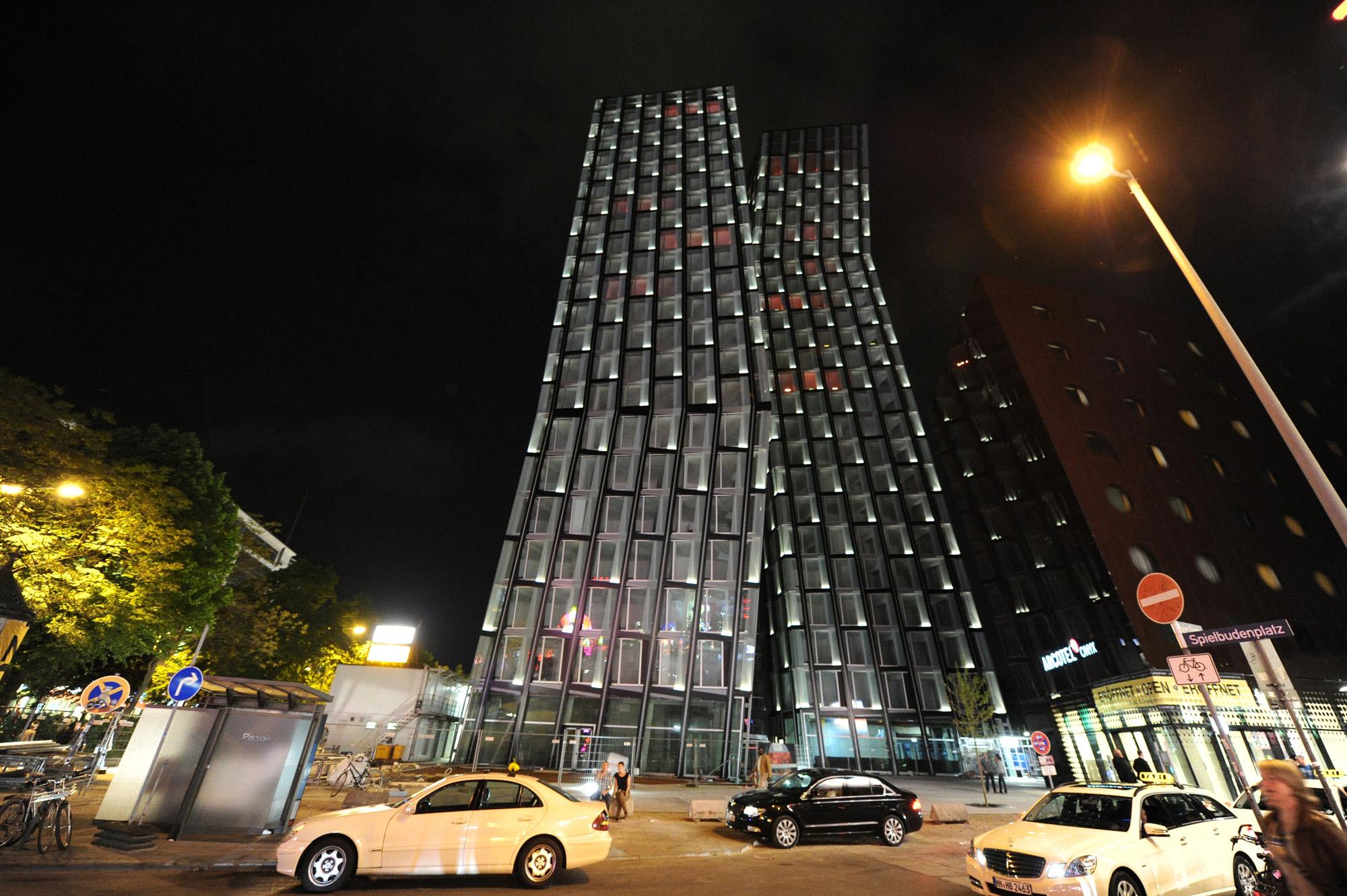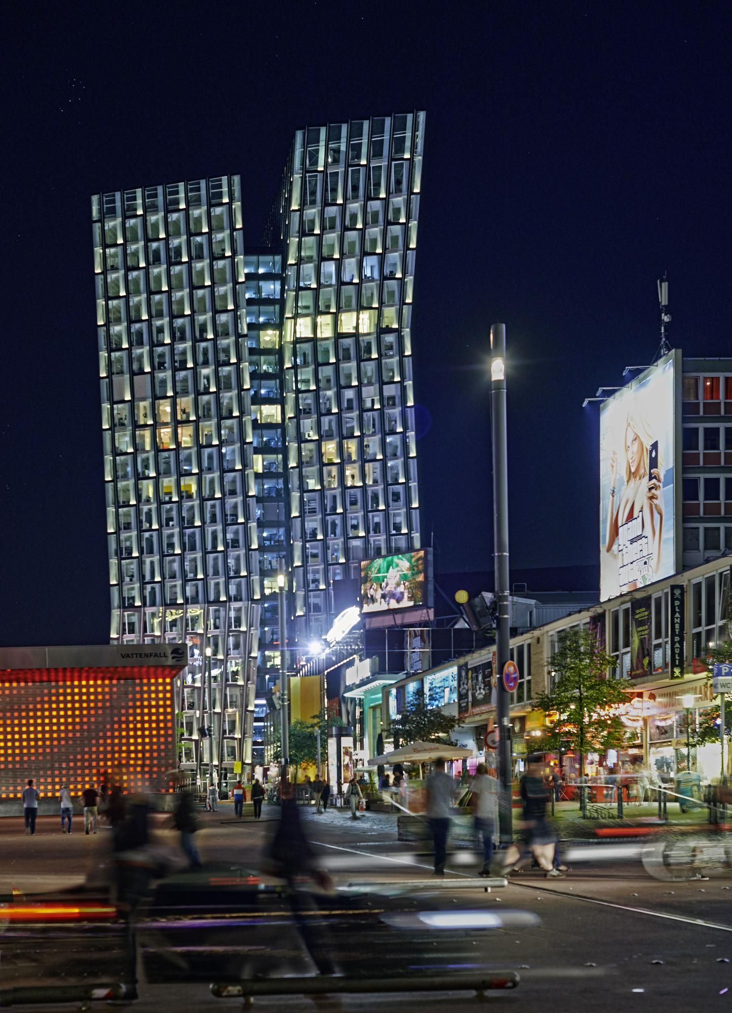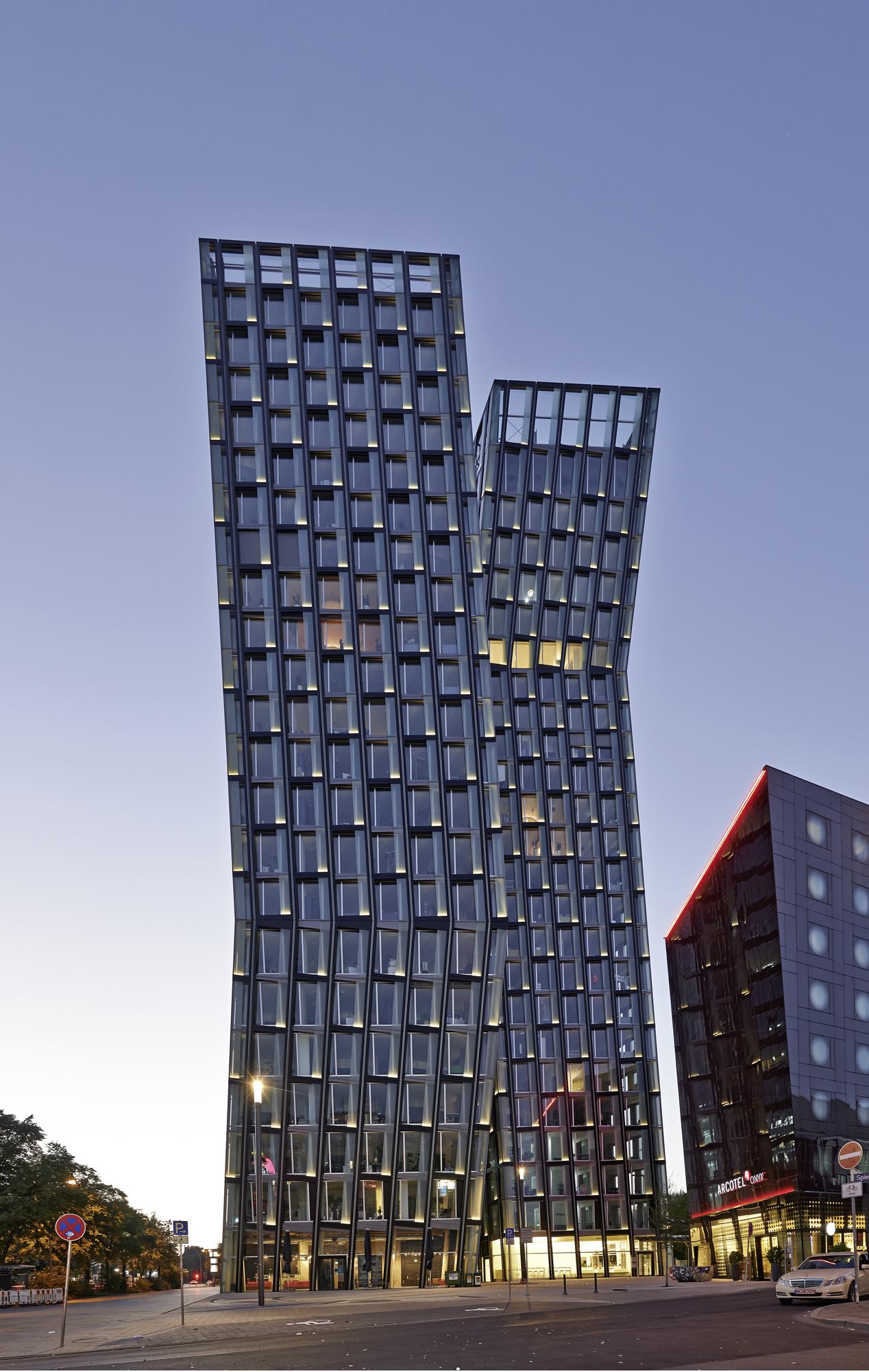 Office, hotel, restaurant and clubHamburg, GermanyThe “Tanzende Türme”, or ‘dancing towers’, rise on the interface that joins Hamburg’s inner city with Sankt Pauli, a borough formerly outside the city that historically evolved to become a part of town. As the portal to the present districts of St. Pauli, Altona and parts of the port, the towers mark the gateway to Hamburg’s world-famous Reeperbahn, a boulevard for amusements of all kinds. The guiding idea for the design is the formation of an expressive building structure that does justice to the site’s heterogeneous context and its transregional significance. It sets the concluding accent on the extensive changes in building structures occurring in recent years within this quarter. In terms of shape, the configuration of this pair of high-rises takes its ‘posture’ from the vitality associated with their location. Appearing to dance, they are the physical expression of the joy associated with movement and unfold their power as an identity-endowing ‘diamond solitaire’ in urban planning and development.