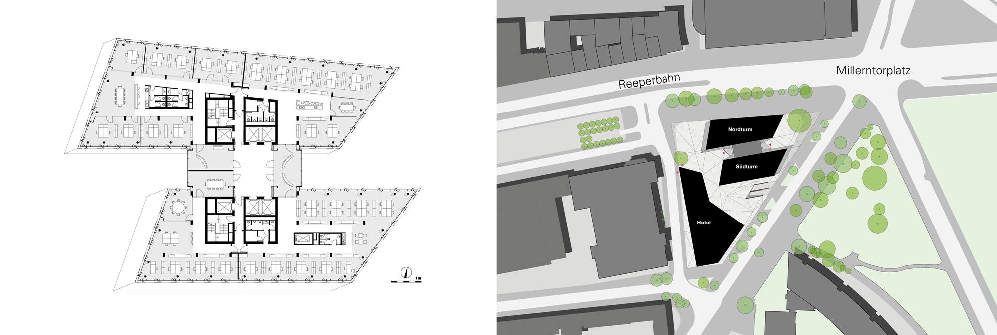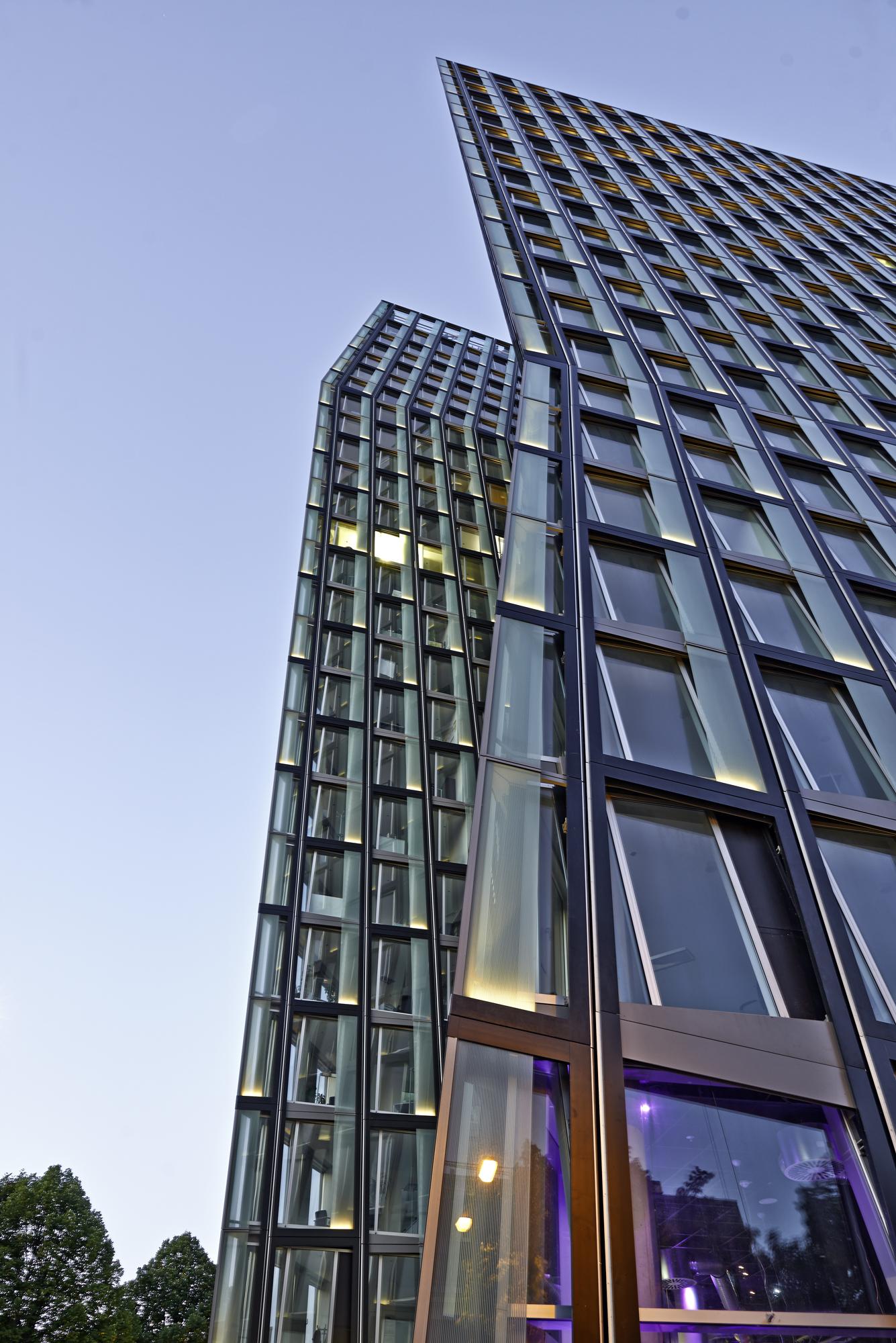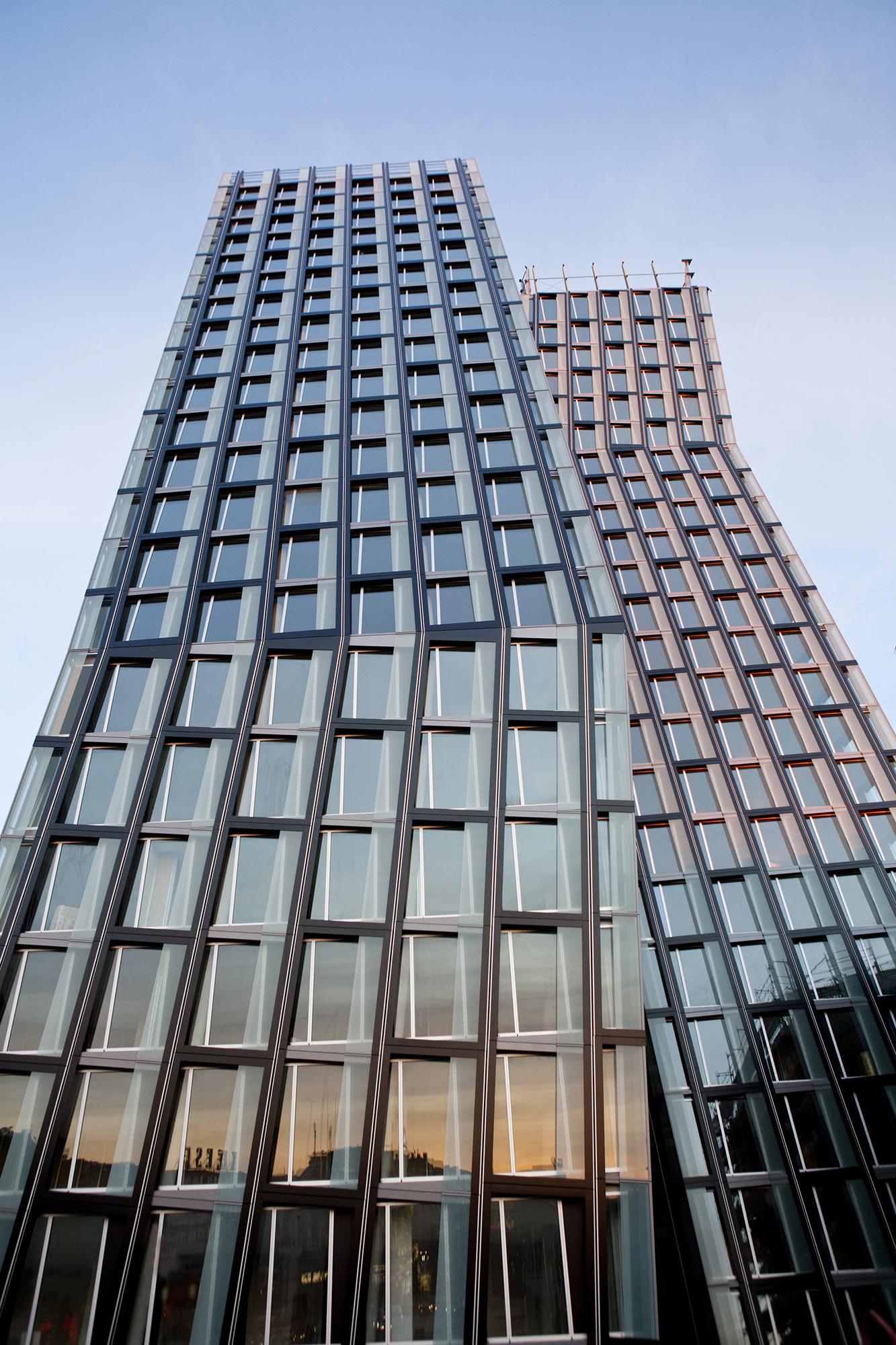 Office, hotel, restaurant and clubHamburg, GermanyThe “Tanzende Türme”, or ‘dancing towers’, rise on the interface that joins Hamburg’s inner city with Sankt Pauli, a borough formerly outside the city that historically evolved to become a part of town. As the portal to the present districts of St. Pauli, Altona and parts of the port, the towers mark the gateway to Hamburg’s world-famous Reeperbahn, a boulevard for amusements of all kinds. The guiding idea for the design is the formation of an expressive building structure that does justice to the site’s heterogeneous context and its transregional significance. It sets the concluding accent on the extensive changes in building structures occurring in recent years within this quarter. In terms of shape, the configuration of this pair of high-rises takes its ‘posture’ from the vitality associated with their location. Appearing to dance, they are the physical expression of the joy associated with movement and unfold their power as an identity-endowing ‘diamond solitaire’ in urban planning and development.