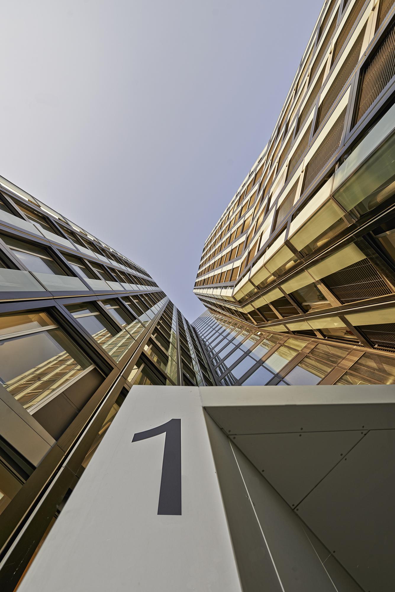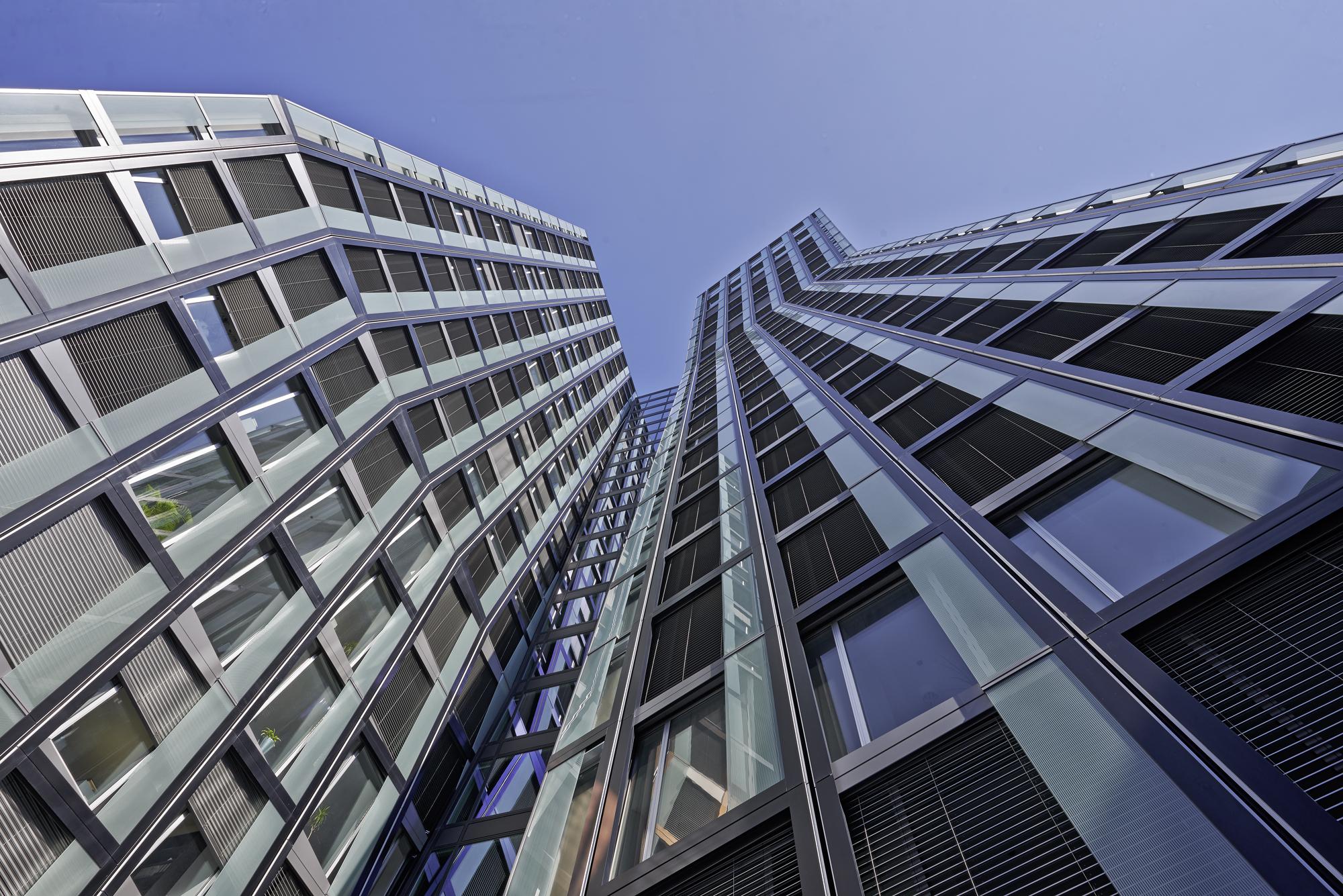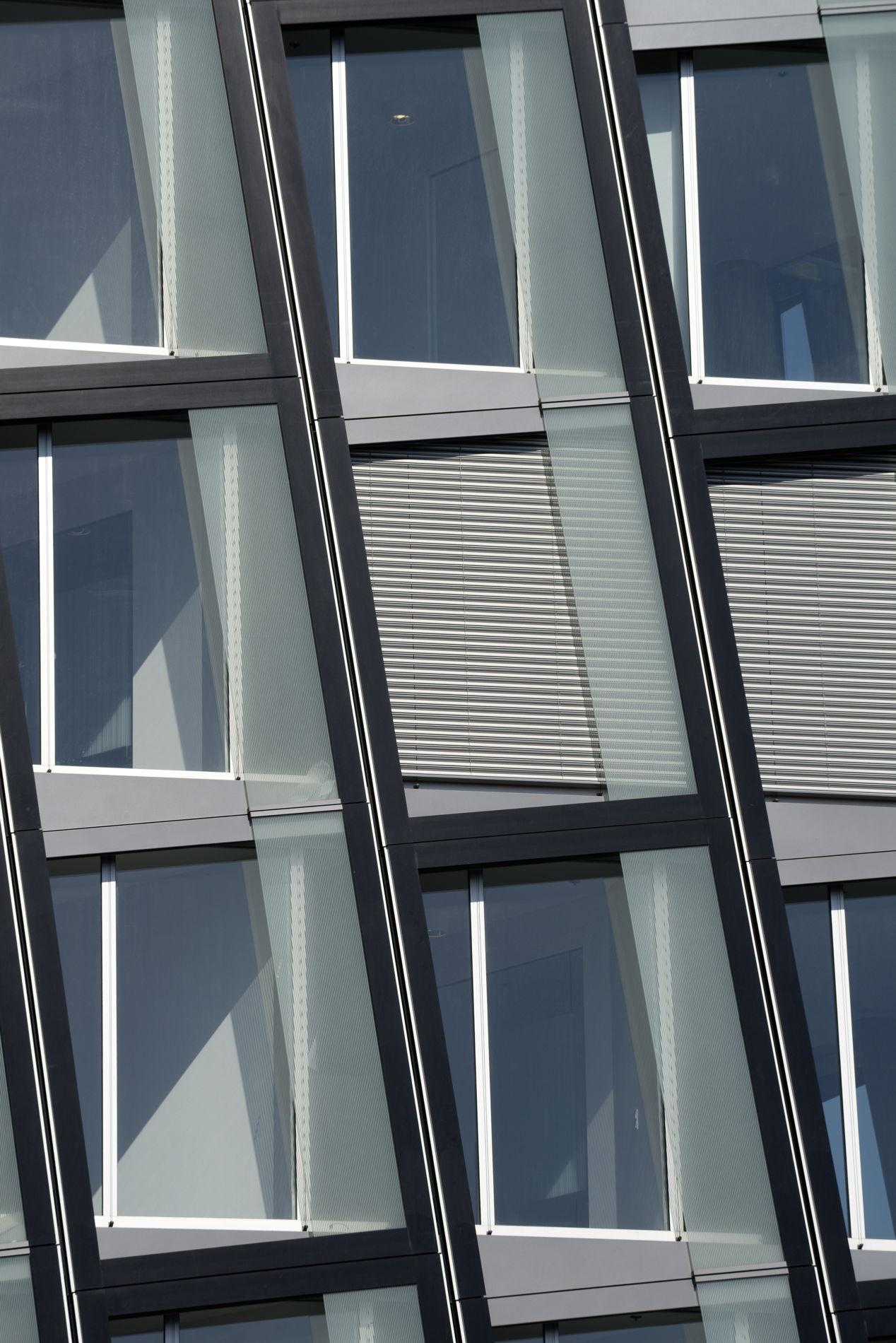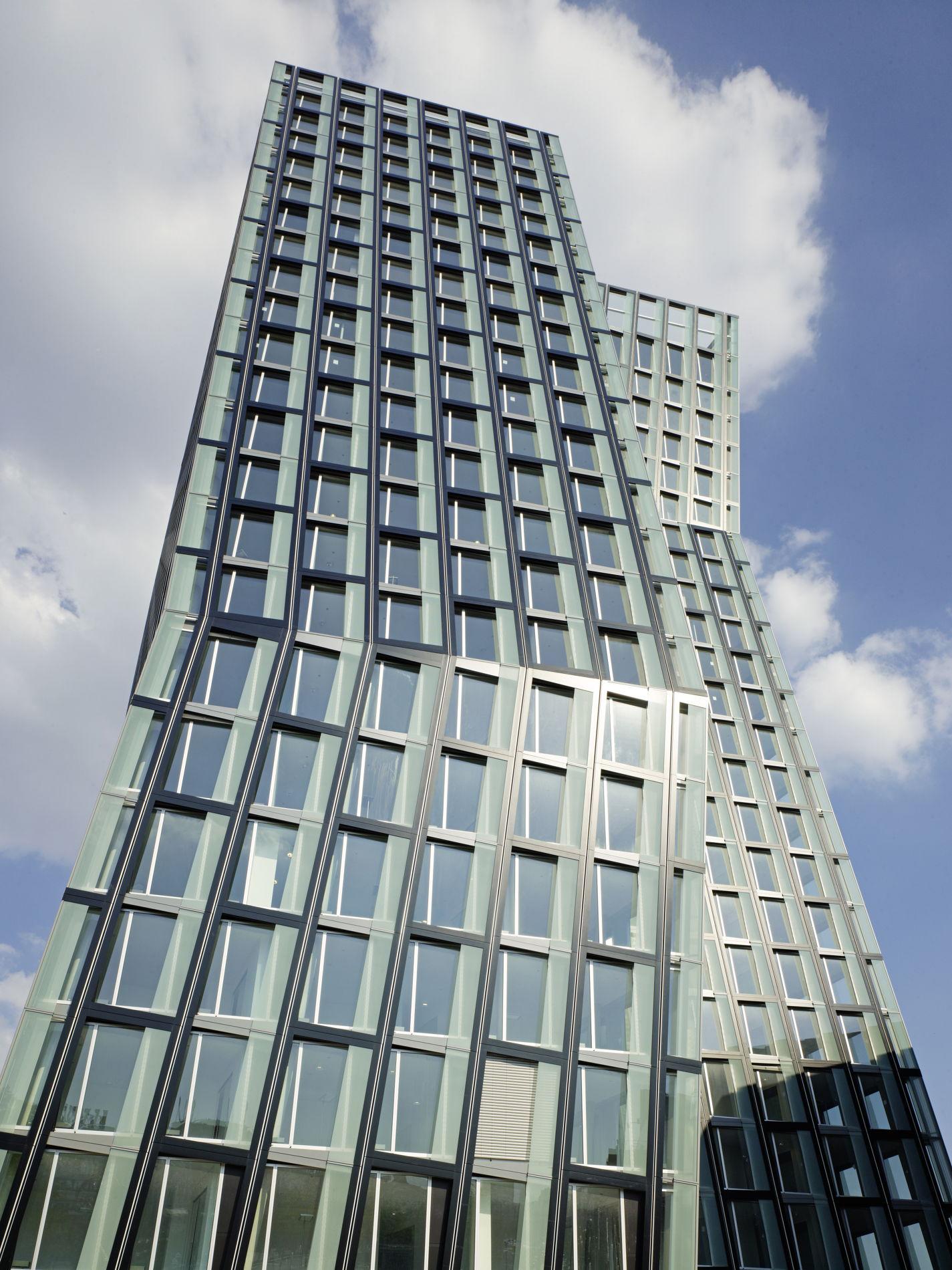 The dancing couple slants up to three metres away from the vertical axis. Though the floor plans shift thereby, they still remain congruent. The towers’ Gartner façades gloss over the slants on a single-walled basis with the help of a two-storey sheet-metal frame which produces a double-walling solely in the superstructure and provides for window-cleaners’ safety. The façades, window technology and exterior sunscreening have to surmount 16 different slanting situations on their way to the top of the building. The ventilation element is equipped with a hurricane-proof deflection pane.