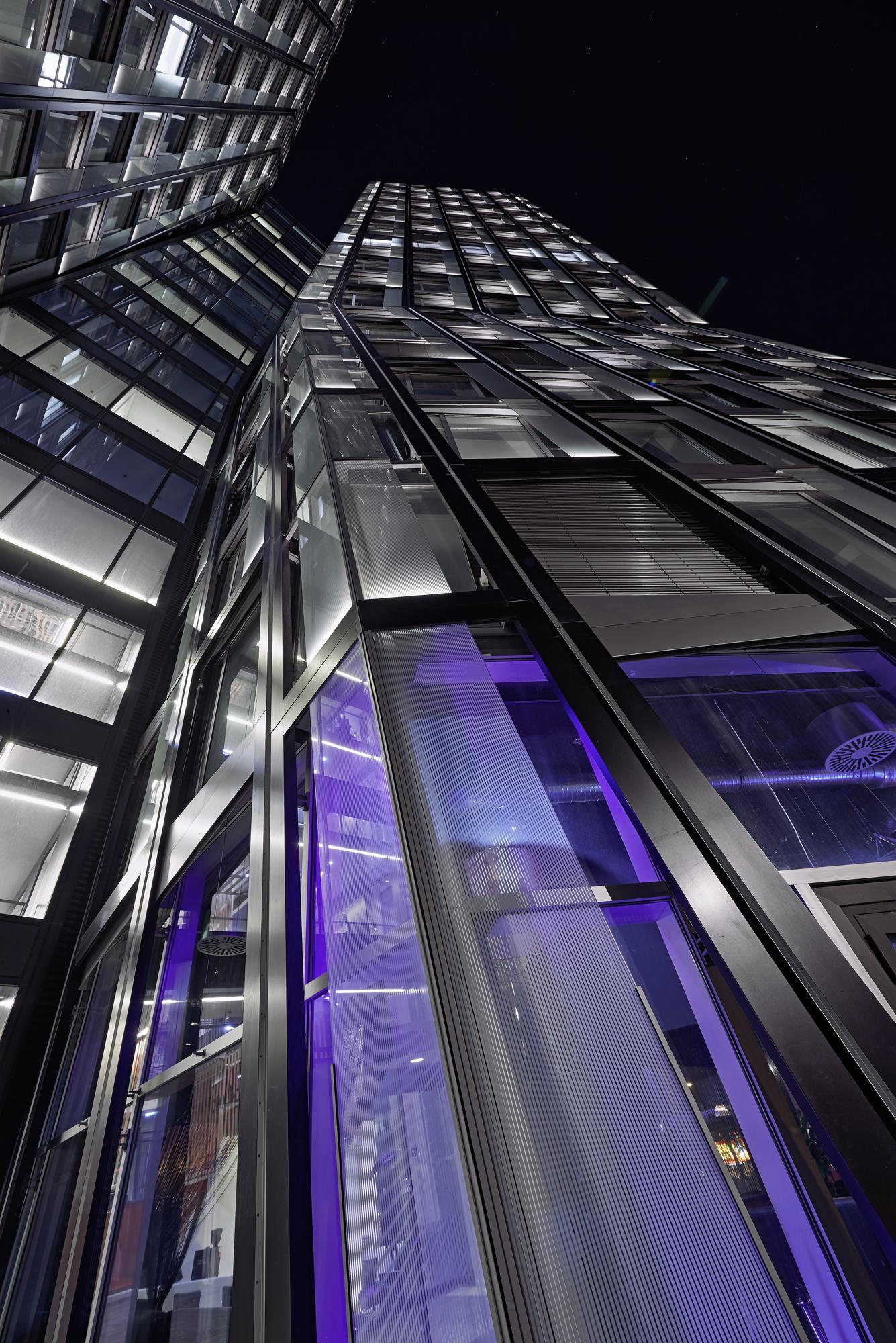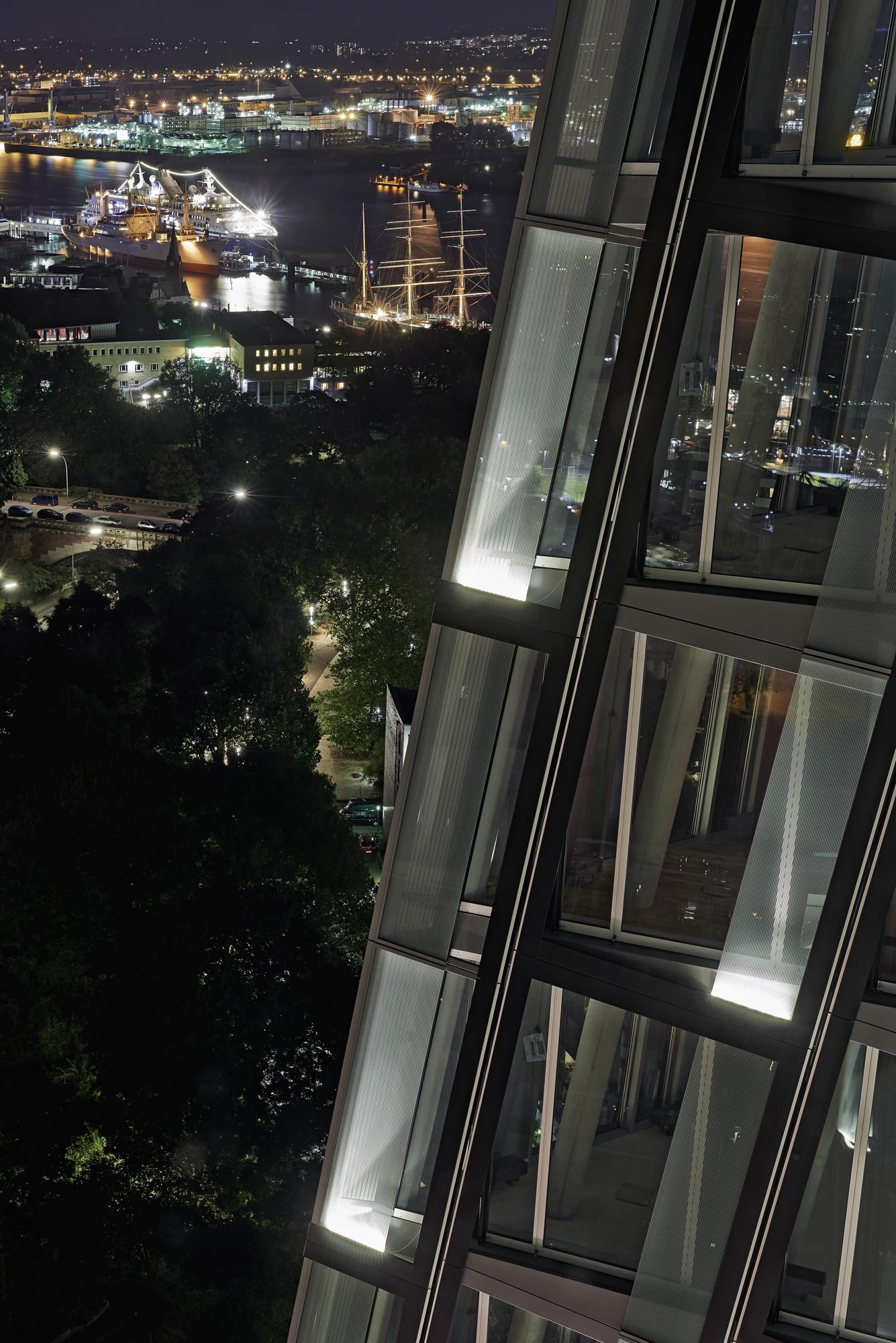 When darkness falls the towers are enlivened by LED strip lights on the lower edge of the deflection panes. Apart from office operations at the STRABAG Group and at several other tenants, for instance the German subsidiary of Diageo, the world’s leading alcohol-beverage enterprise, the attractions lie in the restaurants housed in the ground-floor zone and the upmarket restaurant with “Sky Bar” and a fantastic view on the 23rd floor. However, the rendezvous that lures above all else is the Mojo Club. Following a long pause yet still quite near its previous site, most of the locale’s present home is now situated belowground. In the evenings the club is accessible via stairway entrances concealed in the building’s base that open out onto the forecourt. For visitors, a two-storey, 1,600 m² paradise of dancing and music awaits them. Due to reasons dealing with acoustics, the 9-metre-high subterranean vaulted ceiling has been freely suspended into the area housing the underground car park. As a result, the ‘dancing’ here is not just limited to the view of the façades that changes with every inquisitive step taken by passers-by, a view that can confound even more due to the unusual reflections caused by the sun and clouds. Hamburg’s Reeperbahn has received a signet that sparkles for miles around.