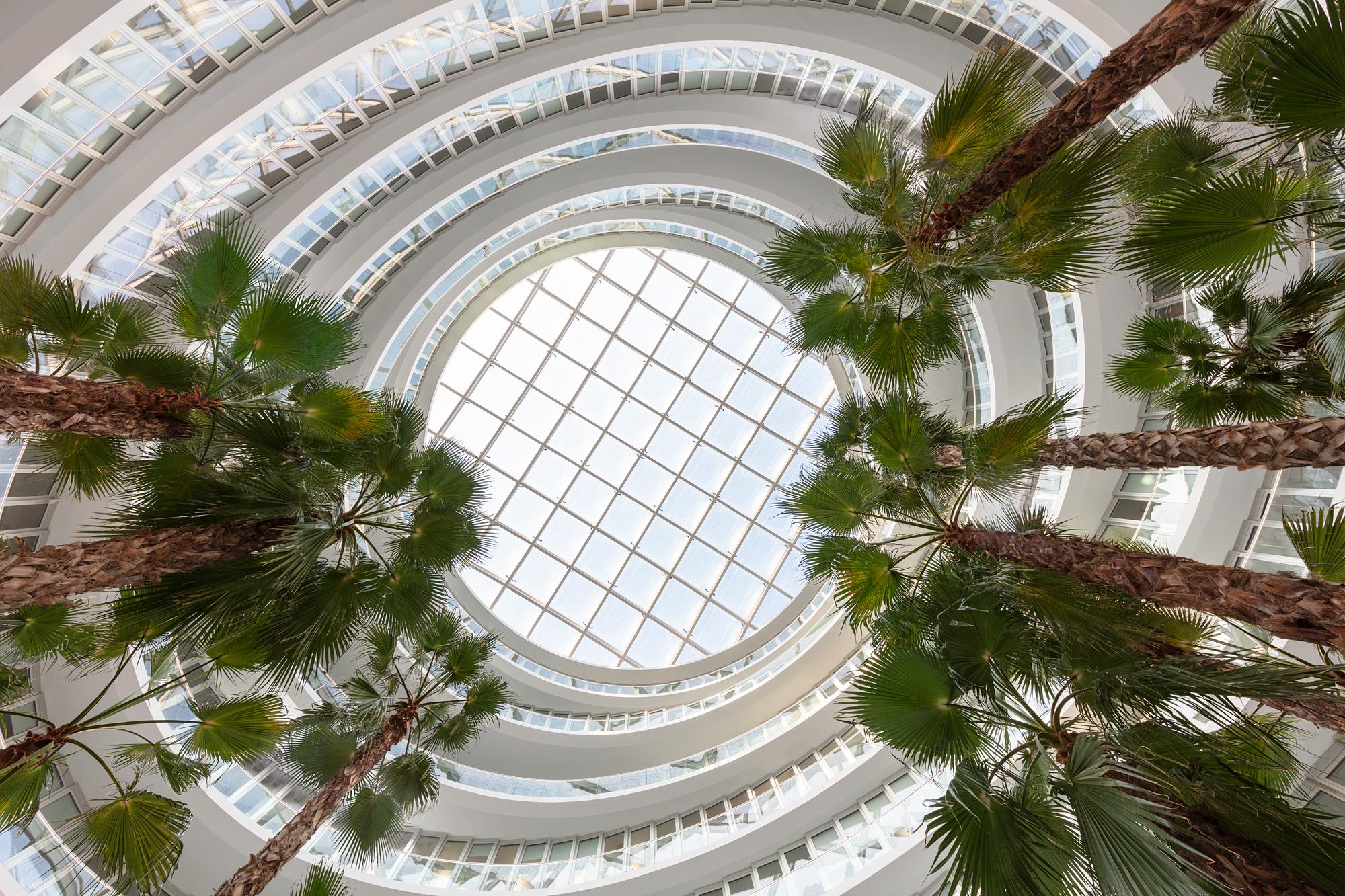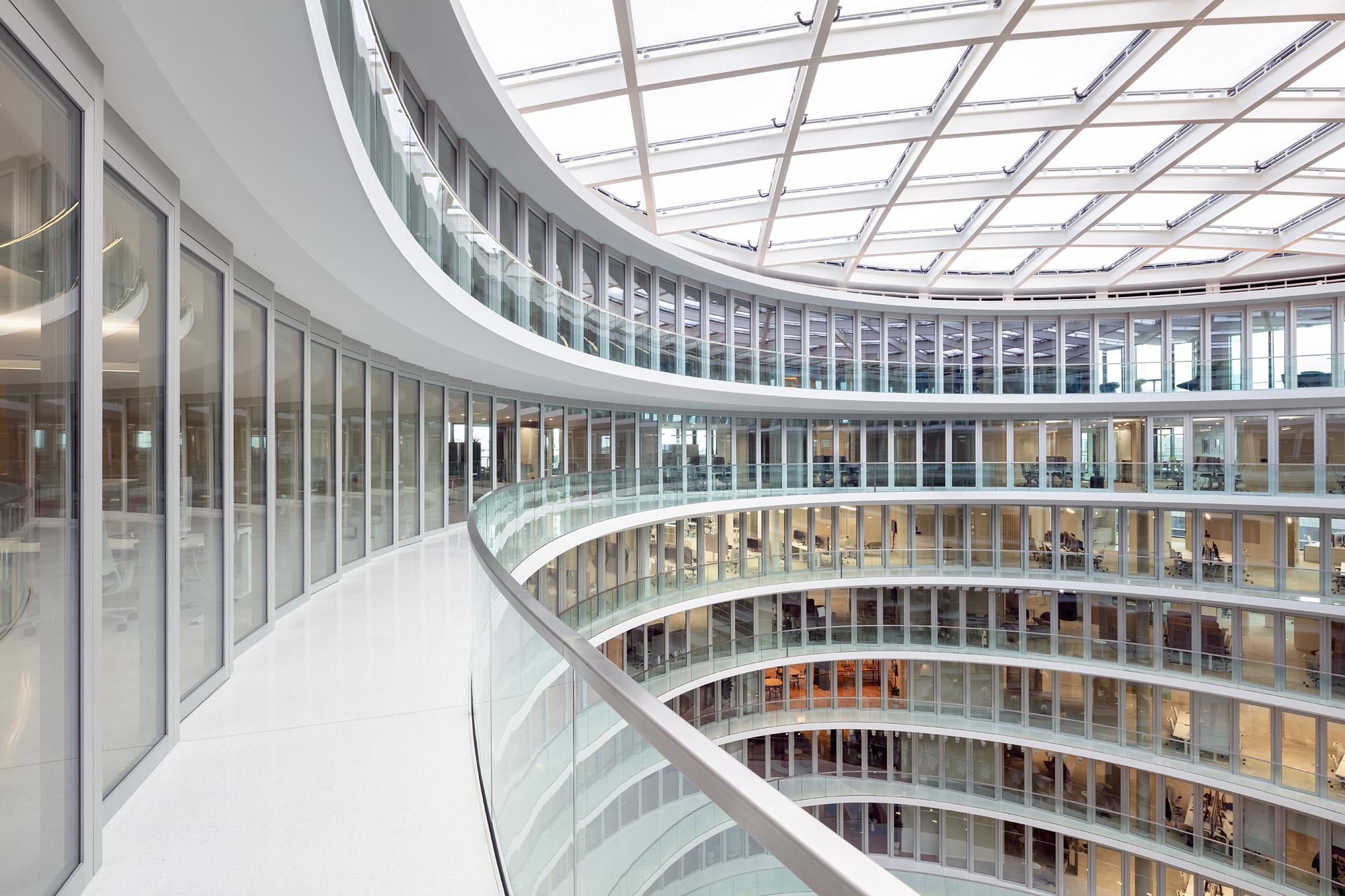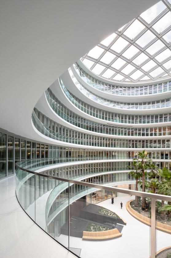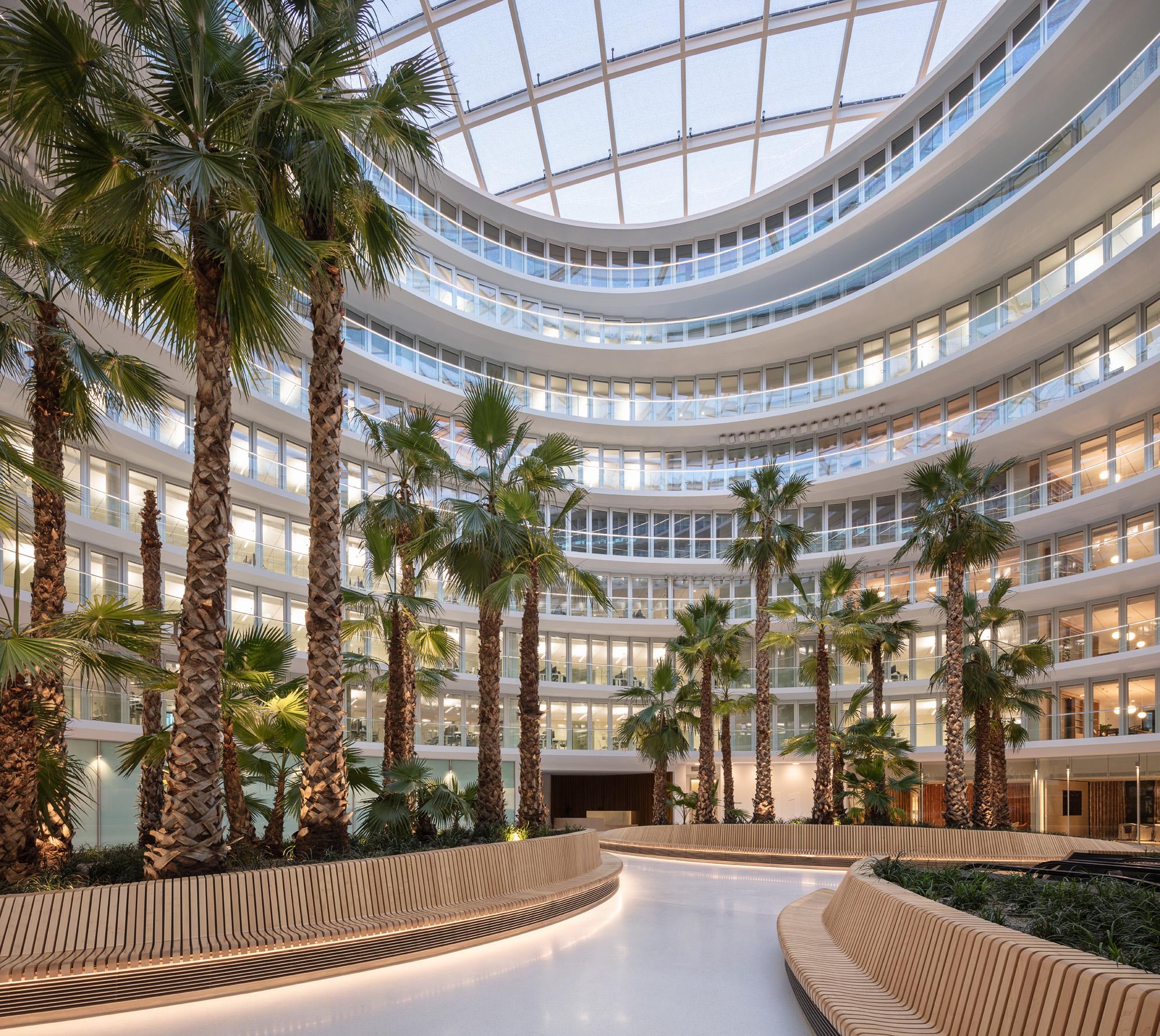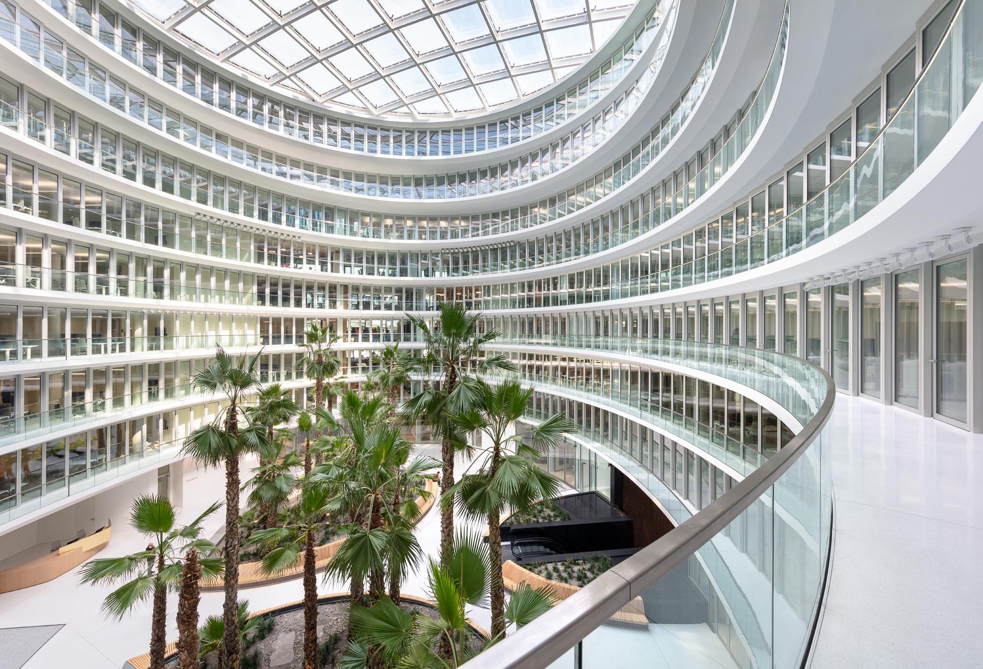 Indoors, a publicly accessible atrium suffused with light bearing an ellipsoid floor plan is coming about. Visually overlapping interior terraces that rise over roughly 35 metres enable a fascinating atmosphere to emerge along with multifaceted options for use. Orbiting pools of water and a palm grove define the heart of the building complex and form a deliberate contrast to the urban surroundings. This space became possible as a result of three-dimensional building models created early on during the drafting process along with planning parametrically supported by algorithms. An integral planning approach, which all specialised disciplines worked closely together towards achieving, ensured that all technical and economic issues were taken into account and, despite the complexity thereof, an efficient construction workflow remained possible.
