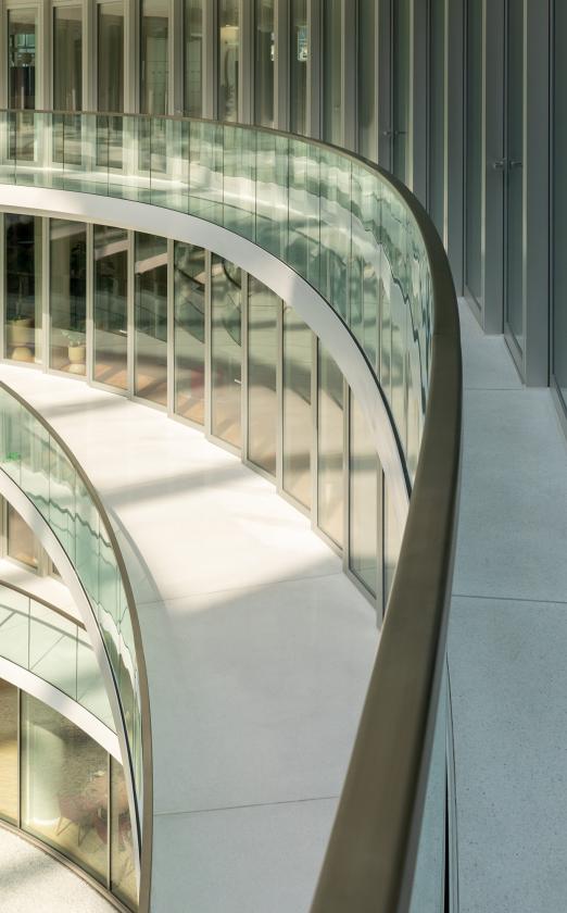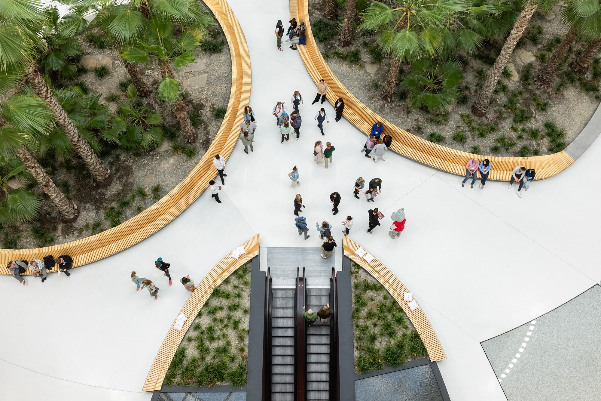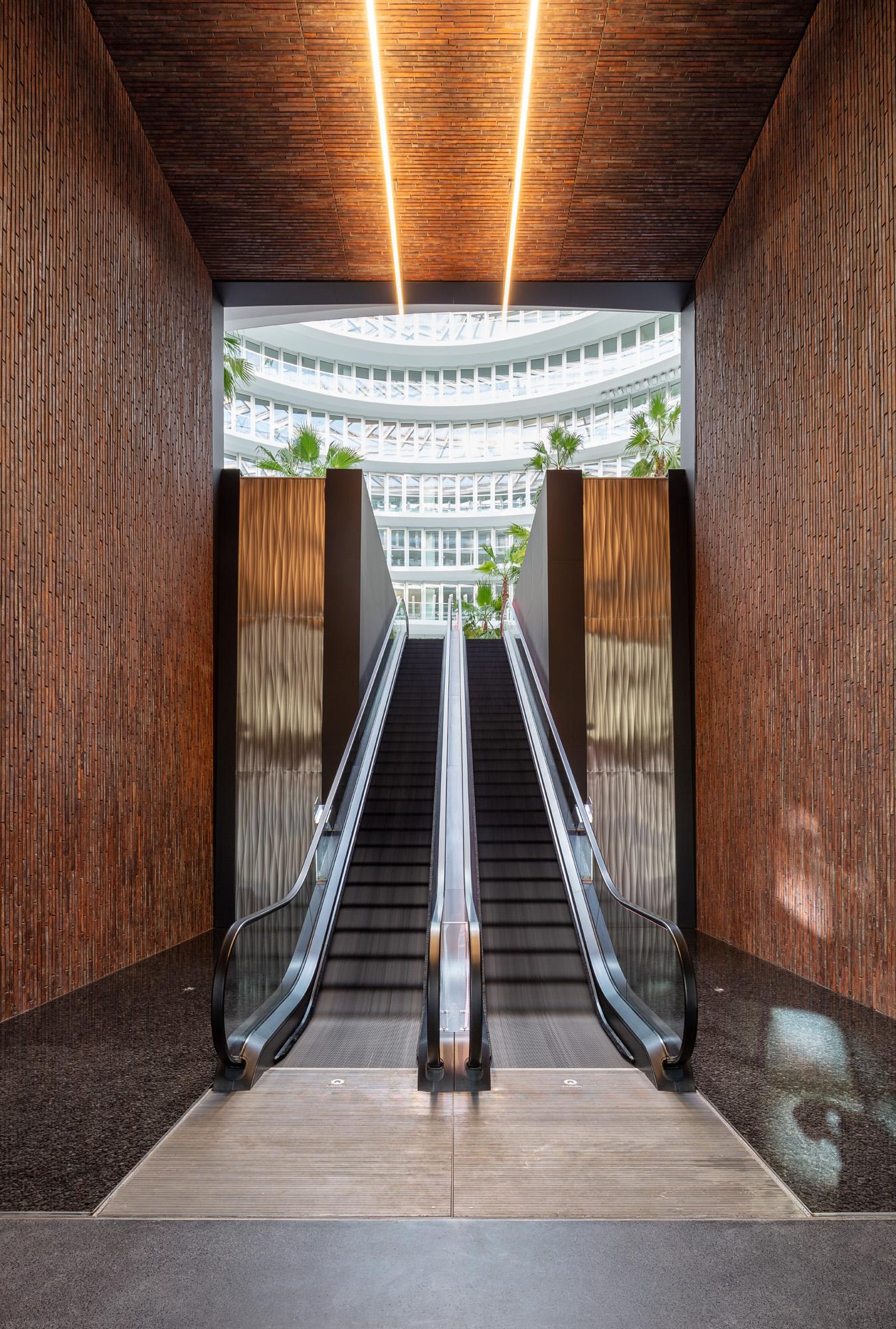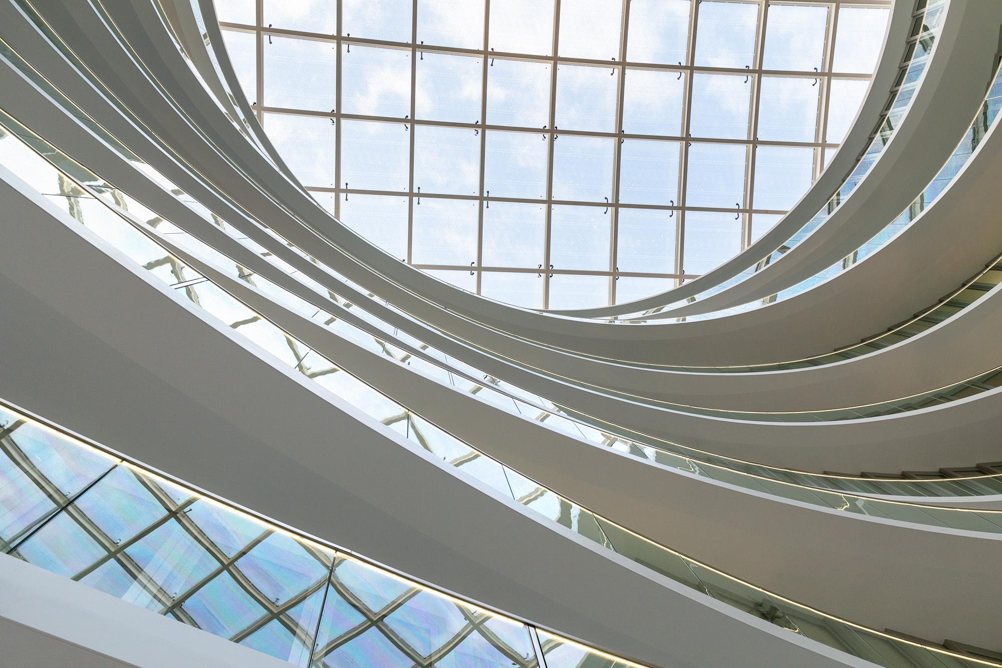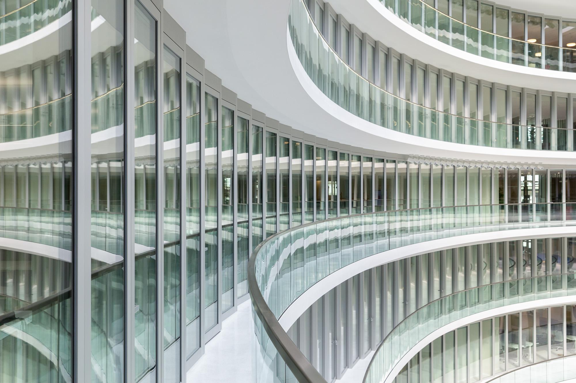 Indoors, a publicly accessible atrium suffused with light bearing an ellipsoid floor plan is coming about. Visually overlapping interior terraces that rise over roughly 35 metres enable a fascinating atmosphere to emerge along with multifaceted options for use. Orbiting pools of water and a palm grove define the heart of the building complex and form a deliberate contrast to the urban surroundings. This space became possible as a result of three-dimensional building models created early on during the drafting process along with planning parametrically supported by algorithms. An integral planning approach, which all specialised disciplines worked closely together towards achieving, ensured that all technical and economic issues were taken into account and, despite the complexity thereof, an efficient construction workflow remained possible.