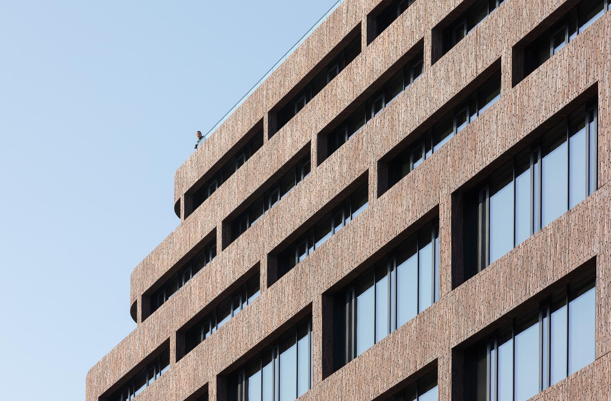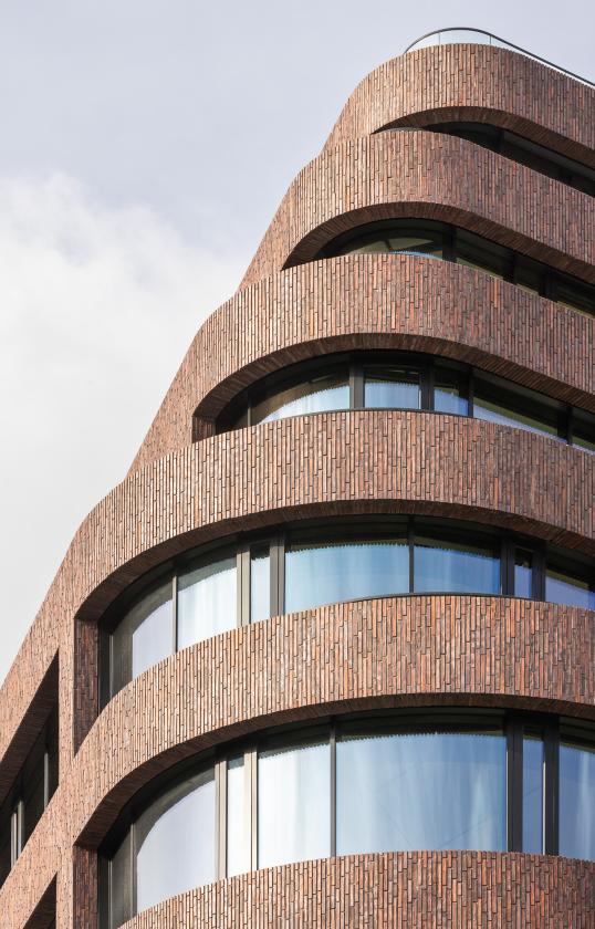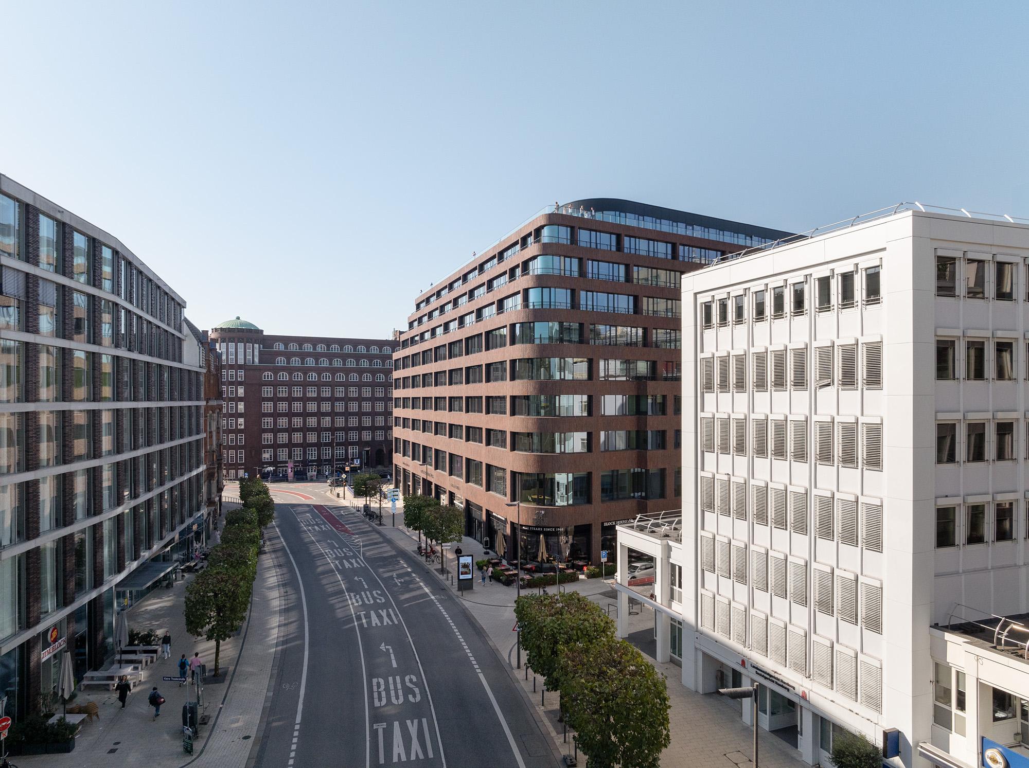 In keeping with the tradition of Hamburg’s venerable “Kontorhäuser” – a combination of mercantile counting houses and warehouses in one – a modern building is being built that meets the challenges of our day and age, all the way up to sustainability, while simultaneously maintaining the site’s urban spatial spirit. Red brickwork, the material that acts as key visual stylising element, dominates the exterior façade, enhanced by flat, long stone formats placed vertically in freely styled groupings. The consequence is a focus on the fundamental materials stone and glass. Heading upwards, the continuously increasing proportions of glass impart a finely balanced elegance to the structure.