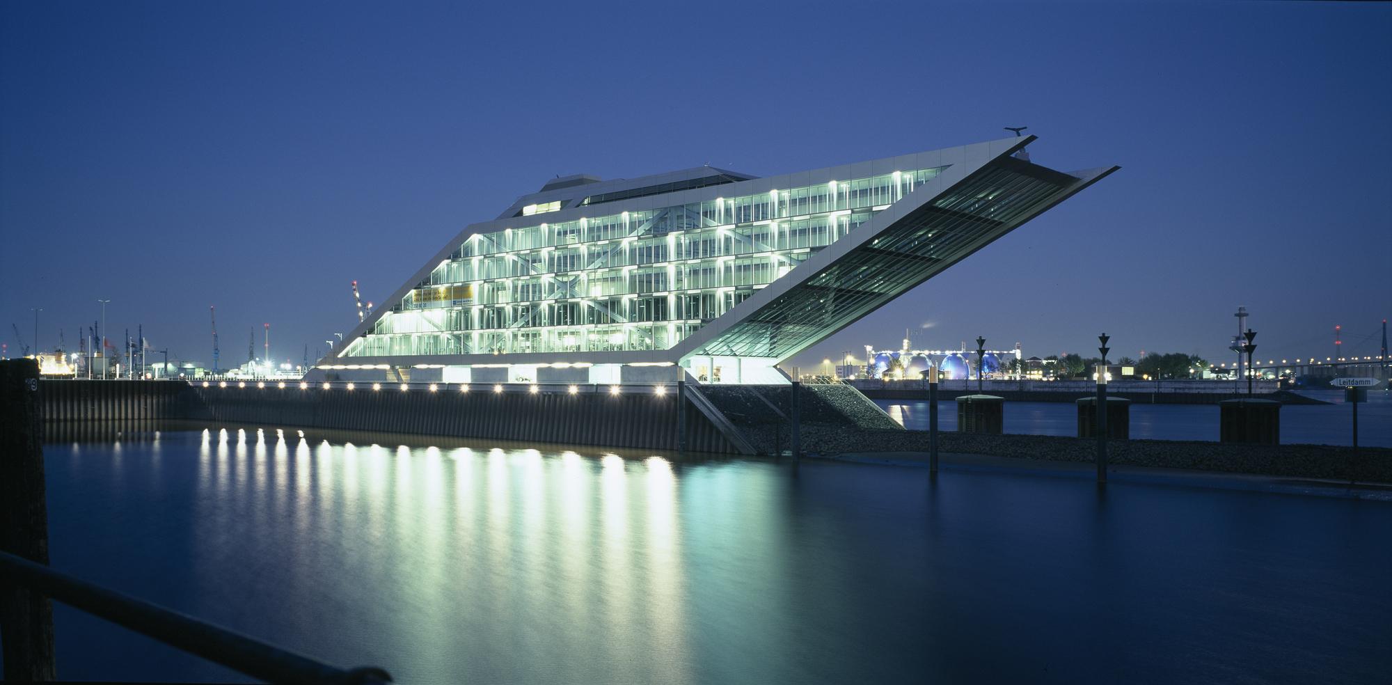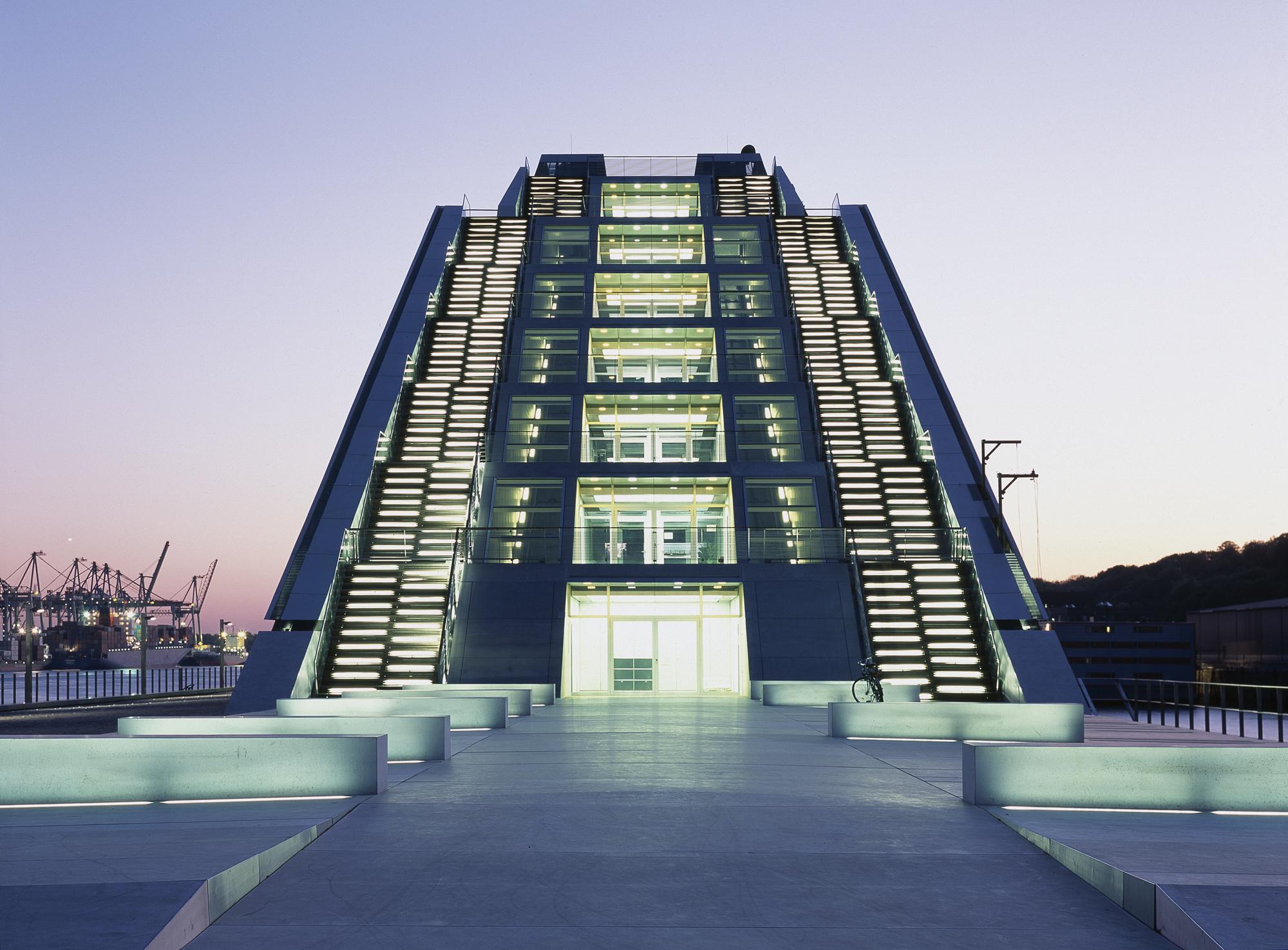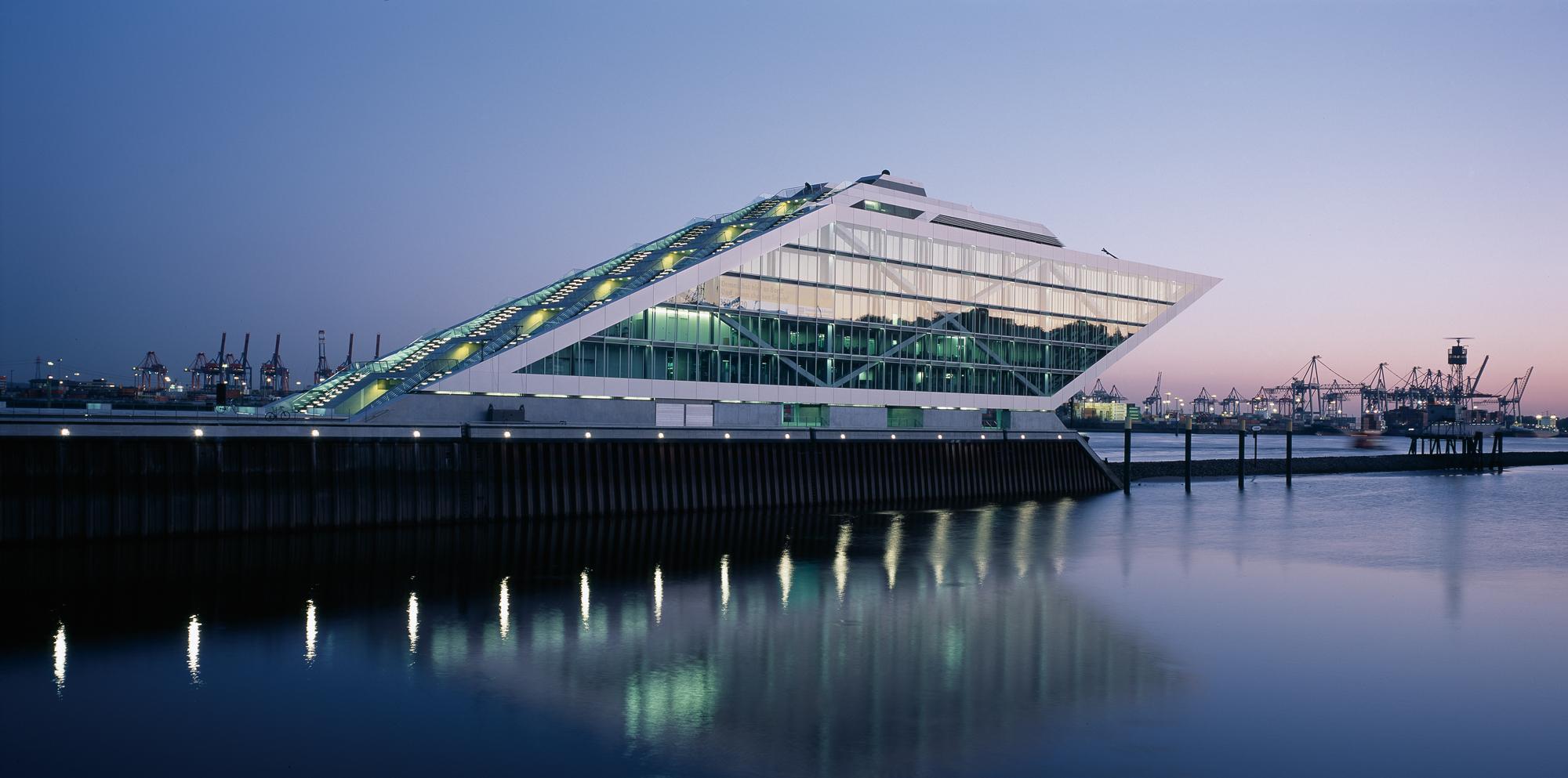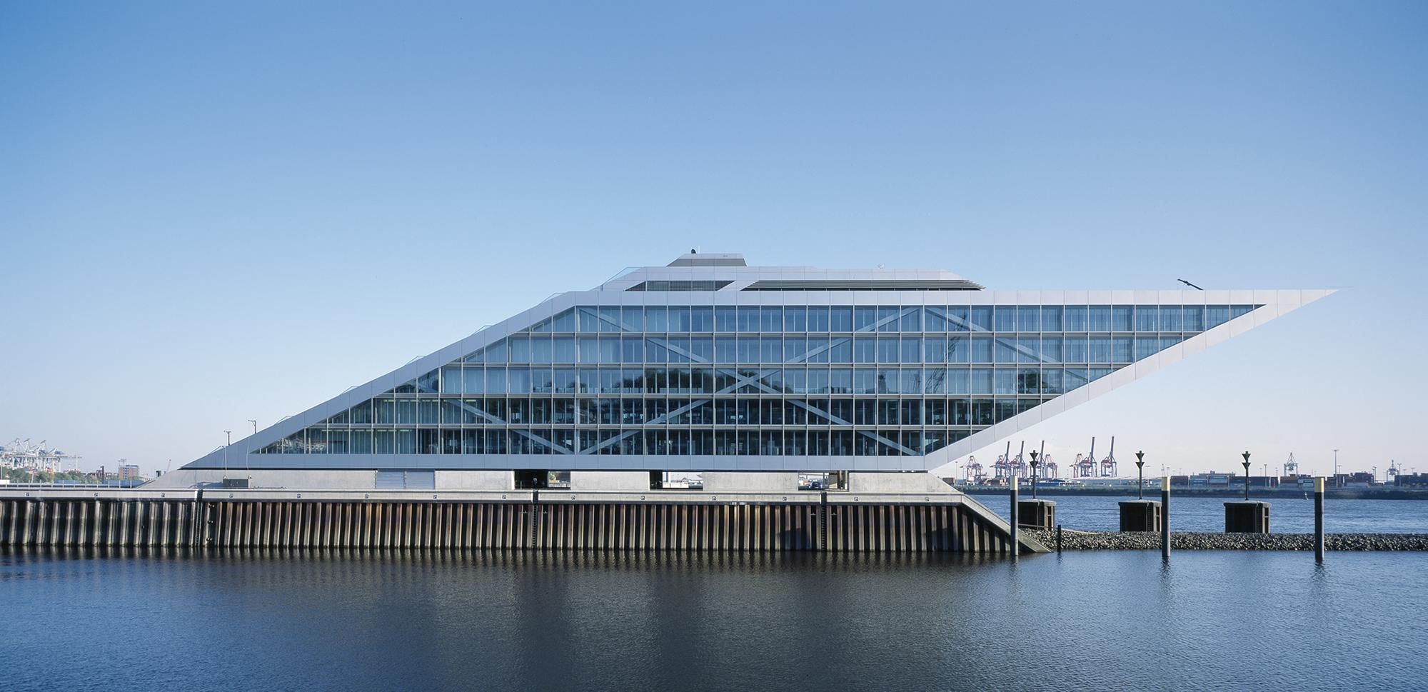 Office buildingHamburg, GermanyLike a gateway to the city of Hamburg, the Dockland office building stands at one end of Edgar-Engelhard-Kai, a street quay between the Norderelbe, the northern arm of the Elbe River, and the Fischereihafen, the harbour for the fishing trade. The ‘bow’ of this ship-like structure juts out freely over 40 metres to form a dynamic supplement to the ‘stern’ constituted by the neighbouring ferry terminal. The building offers roughly 9000 square metres of office space borne by a steel-frame superstructure. The width of the complex makes it possible to position communication zones such as kitchenettes or conference rooms ‘midships’, though the same applies for archives or spaces for printers. The large open areas containing freely appointed furnishings create a spacious work atmosphere. The glassed-in façade enables employees to enjoy the wonderful view of the port panorama from their offices. Those whose work leaves them no time for pleasurable gazing during the day can make up for it in the evening on the rooftop terrace. Even visitors who aren’t part of the office ‘crew’ can get to the terrace via a public outdoor staircase located at the ‘stern’ of the building.