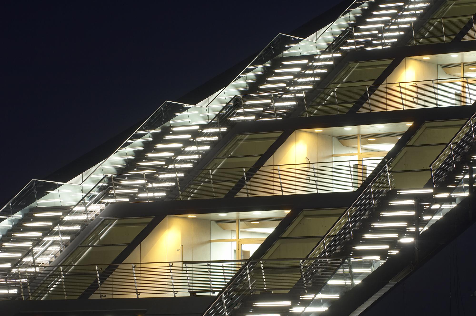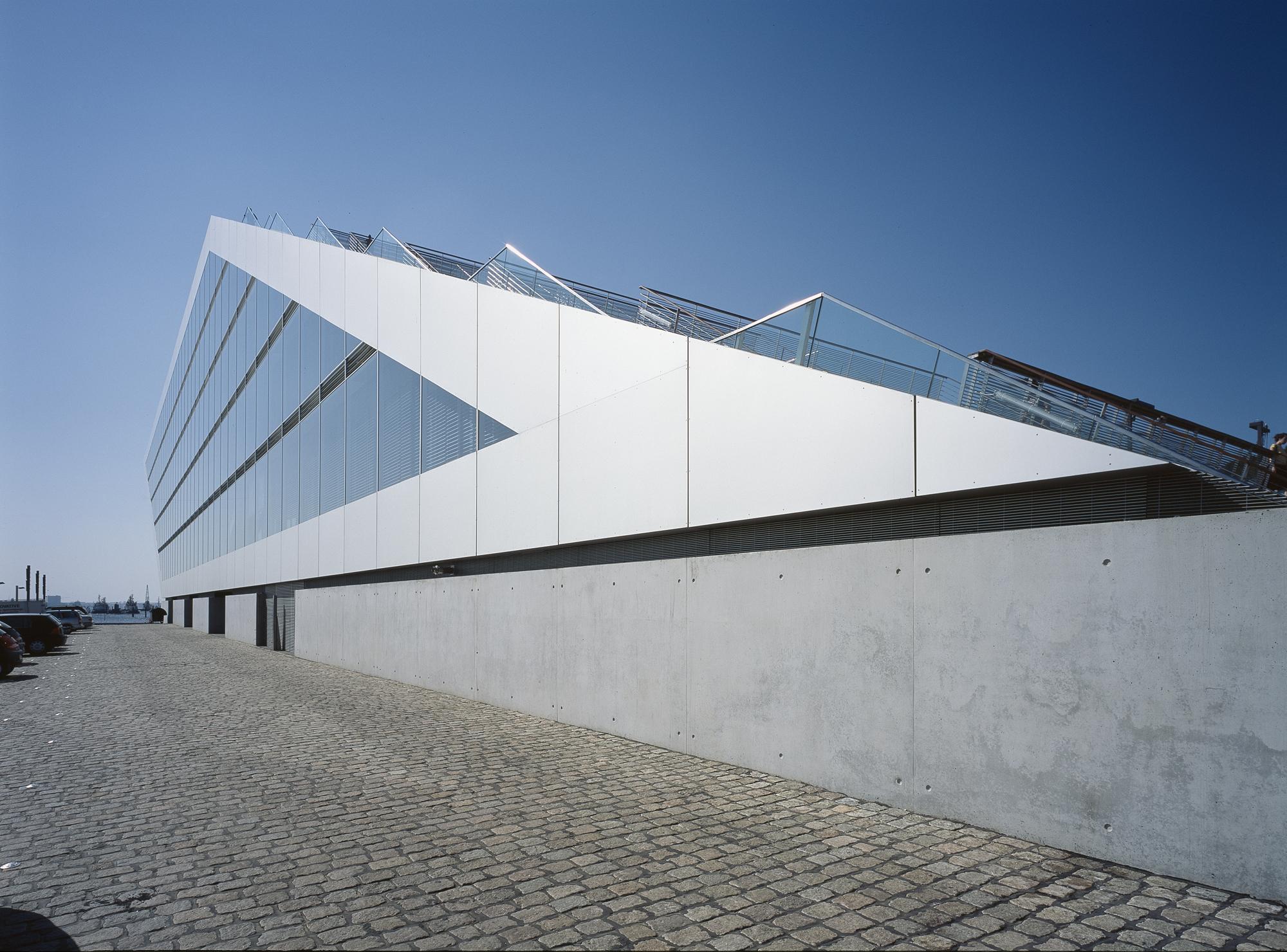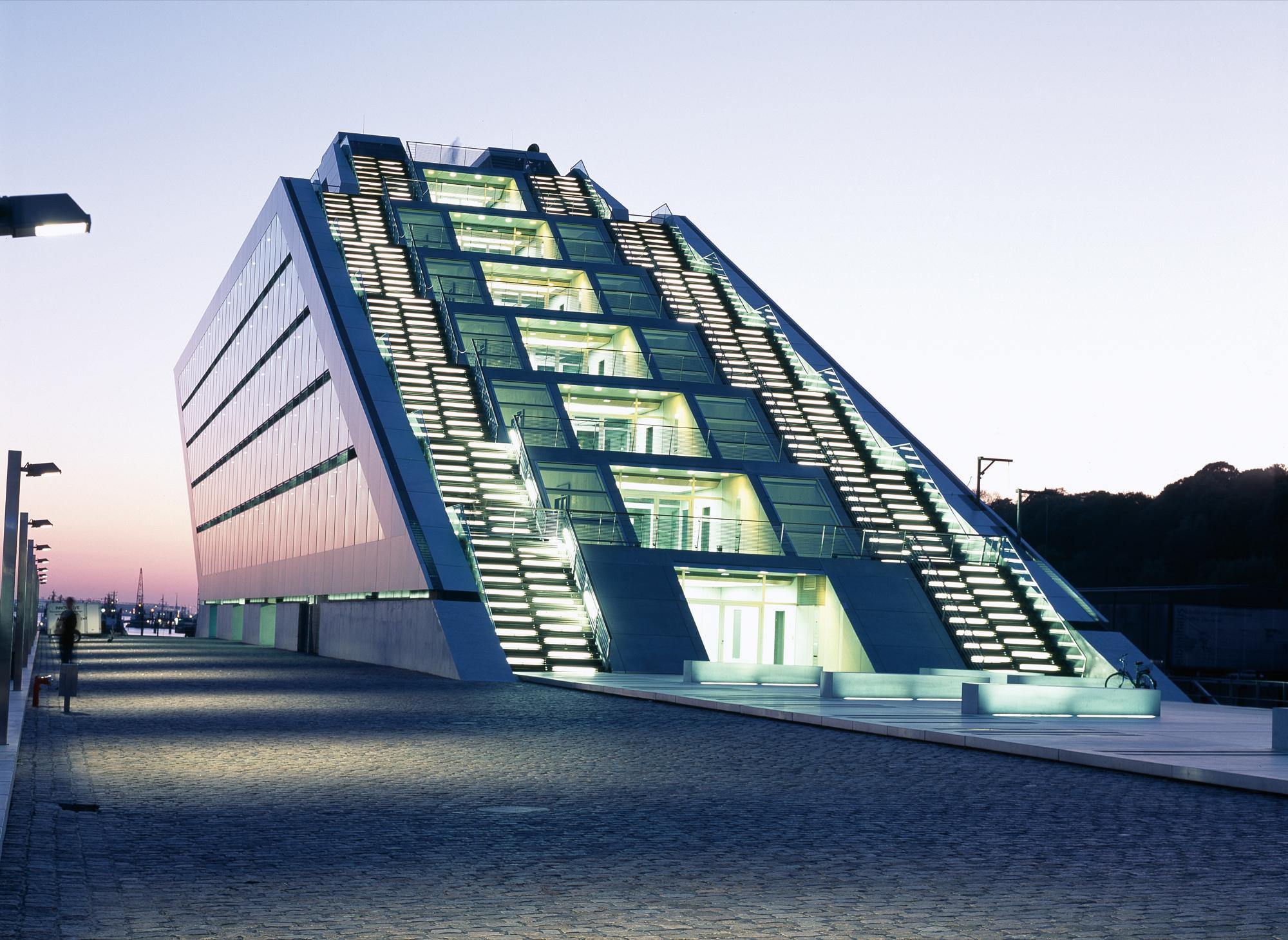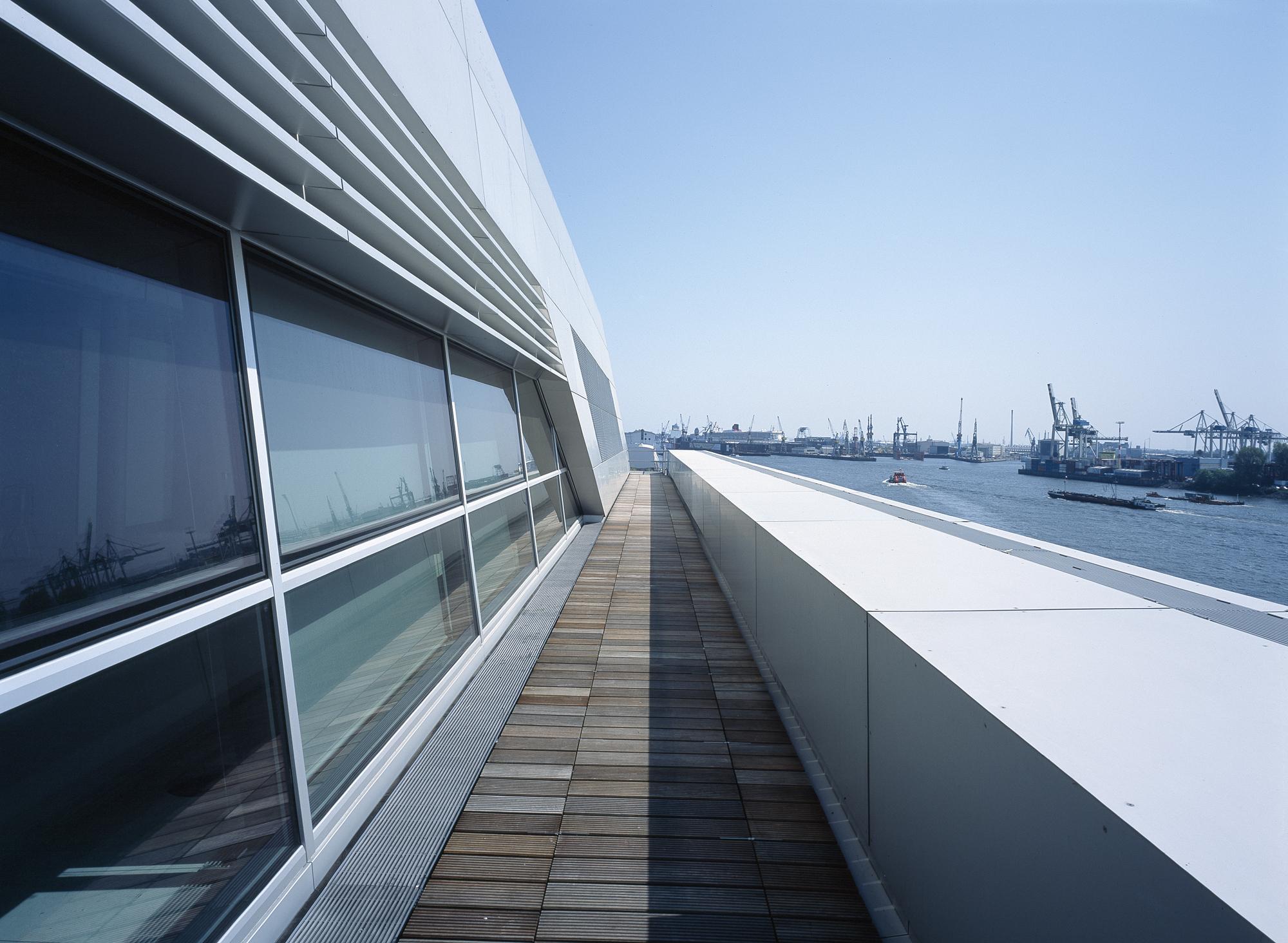 Office buildingHamburg, GermanyLike a gateway to the city of Hamburg, the Dockland office building stands at one end of Edgar-Engelhard-Kai, a street quay between the Norderelbe, the northern arm of the Elbe River, and the Fischereihafen, the harbour for the fishing trade. The ‘bow’ of this ship-like structure juts out freely over 40 metres to form a dynamic supplement to the ‘stern’ constituted by the neighbouring ferry terminal. The building offers roughly 9000 square metres of office space borne by a steel-frame superstructure. The width of the complex makes it possible to position communication zones such as kitchenettes or conference rooms ‘midships’, though the same applies for archives or spaces for printers. The large open areas containing freely appointed furnishings create a spacious work atmosphere. The glassed-in façade enables employees to enjoy the wonderful view of the port panorama from their offices. Those whose work leaves them no time for pleasurable gazing during the day can make up for it in the evening on the rooftop terrace. Even visitors who aren’t part of the office ‘crew’ can get to the terrace via a public outdoor staircase located at the ‘stern’ of the building.