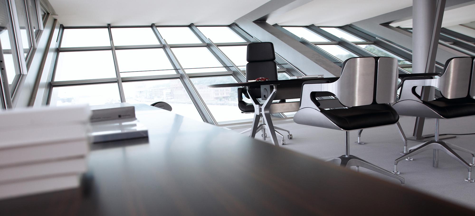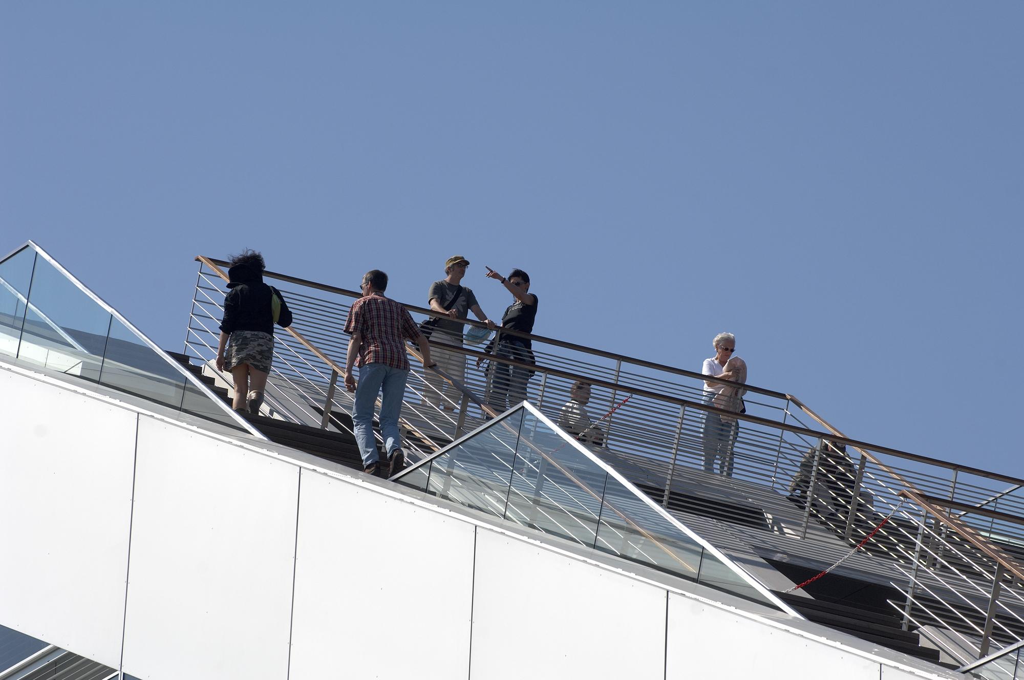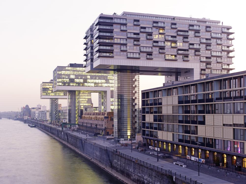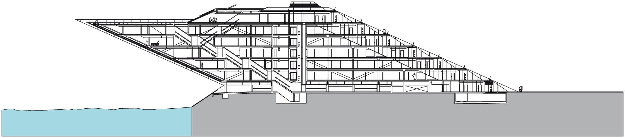 Office buildingHamburg, GermanyLike a gateway to the city of Hamburg, the Dockland office building stands at one end of Edgar-Engelhard-Kai, a street quay between the Norderelbe, the northern arm of the Elbe River, and the Fischereihafen, the harbour for the fishing trade. The ‘bow’ of this ship-like structure juts out freely over 40 metres to form a dynamic supplement to the ‘stern’ constituted by the neighbouring ferry terminal. The building offers roughly 9000 square metres of office space borne by a steel-frame superstructure. The width of the complex makes it possible to position communication zones such as kitchenettes or conference rooms ‘midships’, though the same applies for archives or spaces for printers. The large open areas containing freely appointed furnishings create a spacious work atmosphere. The glassed-in façade enables employees to enjoy the wonderful view of the port panorama from their offices. Those whose work leaves them no time for pleasurable gazing during the day can make up for it in the evening on the rooftop terrace. Even visitors who aren’t part of the office ‘crew’ can get to the terrace via a public outdoor staircase located at the ‘stern’ of the building.