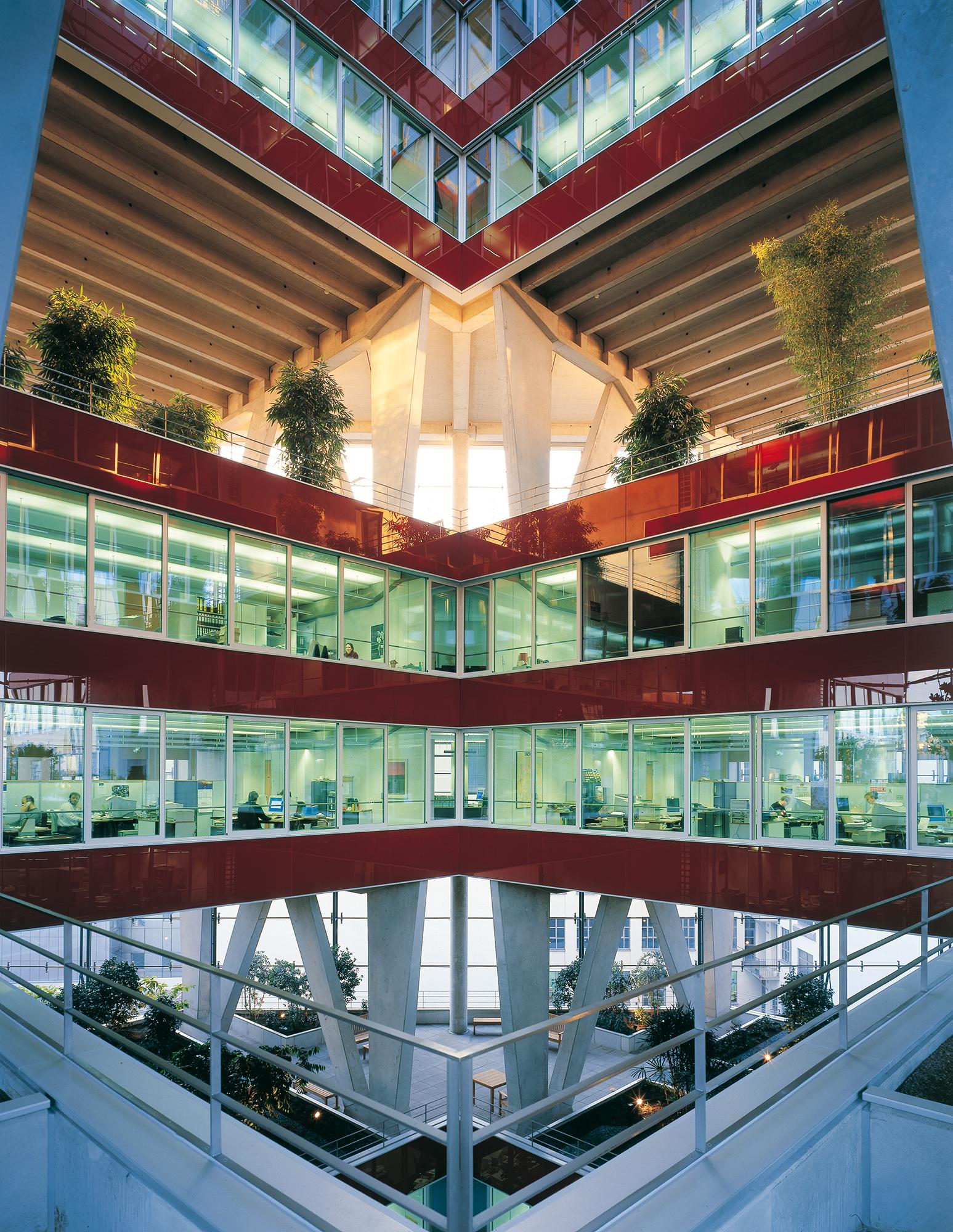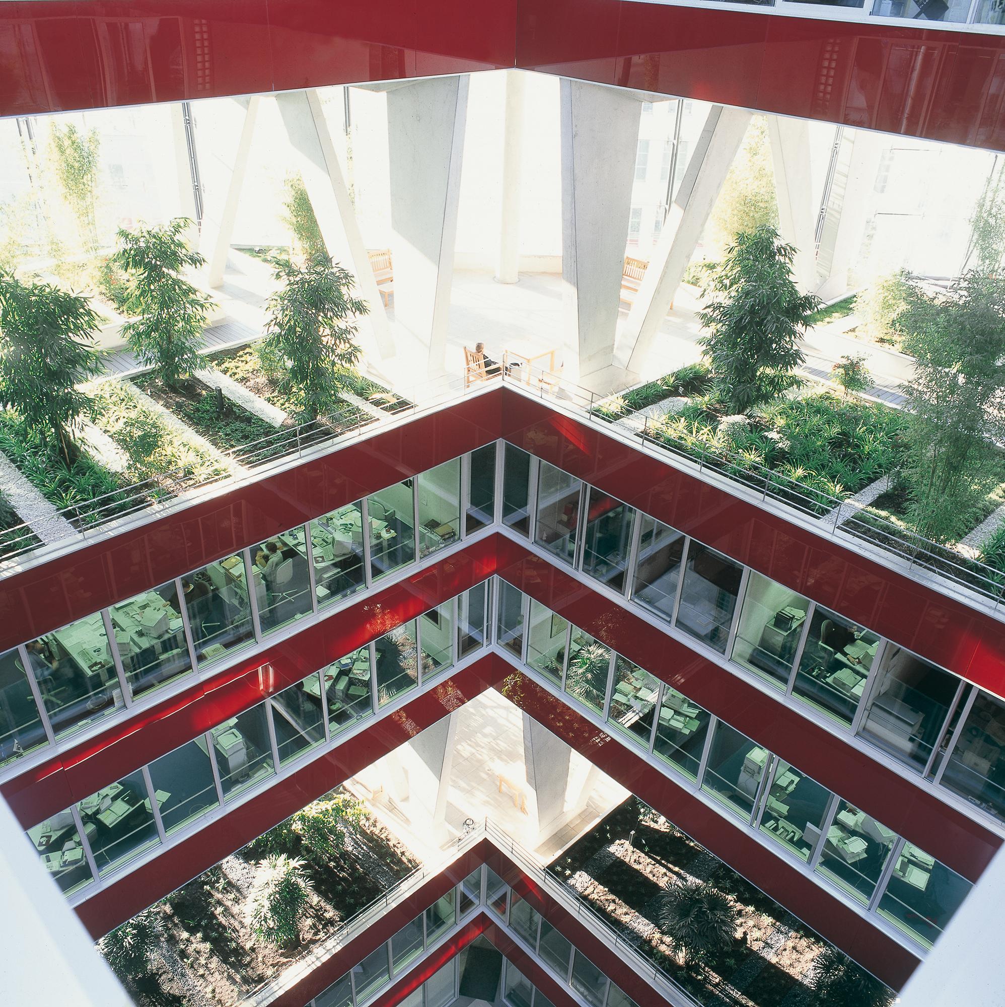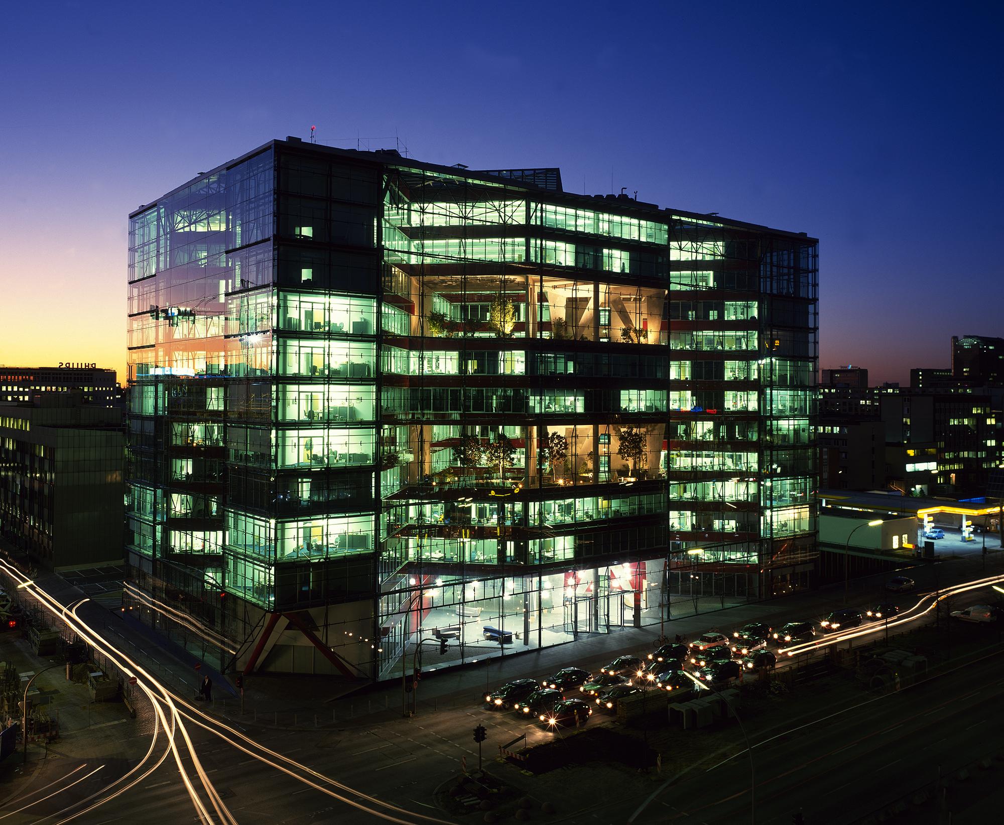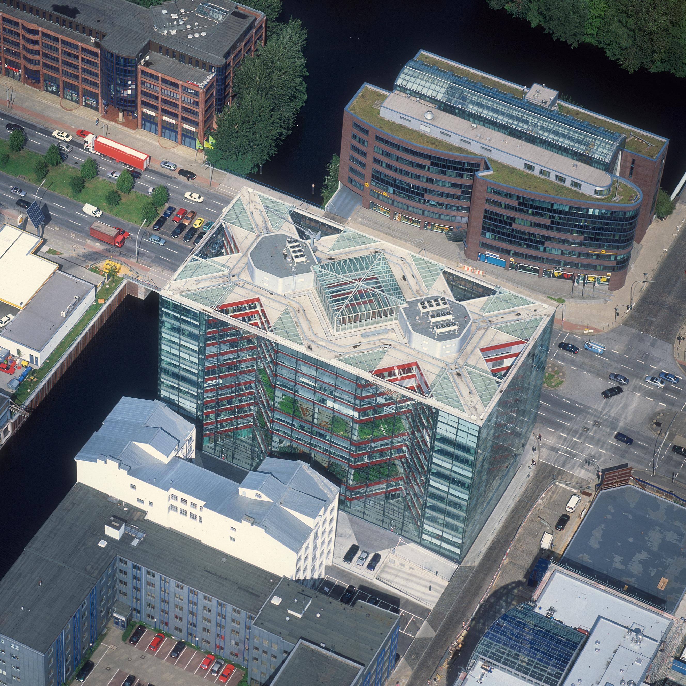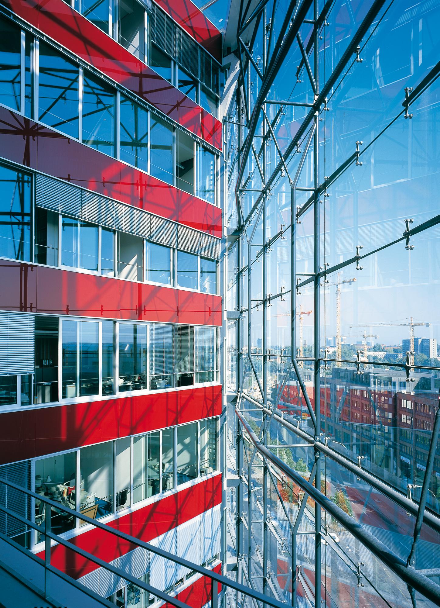 Office buildingHamburg, GermanyLaid upon one another, the two halves of the office building in Hamburg’s Heidenkampsweg form a Double-X. The unusual building form is not merely attractive, it also enables a particularly economical use of the building. The concept, for which the building won the first prize in an architectural competition, is based upon an inner, twelve-storey building, with a Double-X shaped floor plan, enclosed within a glass envelope. Six twelve-storey, triangular wintergardens, appear to visually extend the streetscape. Every office is located directly adjacent to one of these wintergardens. Both halves of the building are connected by four additional Mediterranean gardens, almost seven metre high, which have individual themes, planted with magnolias, bamboo, azaleas, and lemon trees. Each of the X’s has a service core, with stair towers, lifts, toilets and ancilliary functions, at it’s crossing point. From here, the individual offices can be accessed, 72 office units each 220 square metres large. Due to their glass skin, the offices do not require air conditioning. The buffer zones between both of the facades reduce the effect of external conditions such as rain, wind, noise and internal emissions, as well as enabling external sunscreens throughout the 48 metre high building. Through these measures, the heating costs are reduced by around 50%.