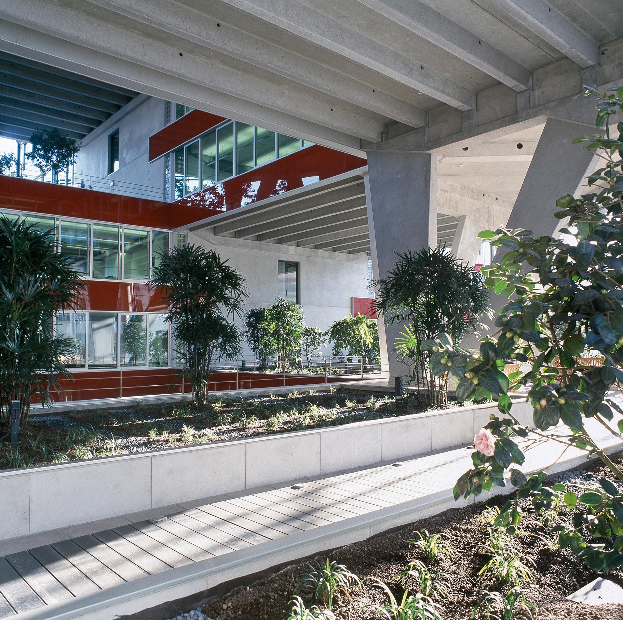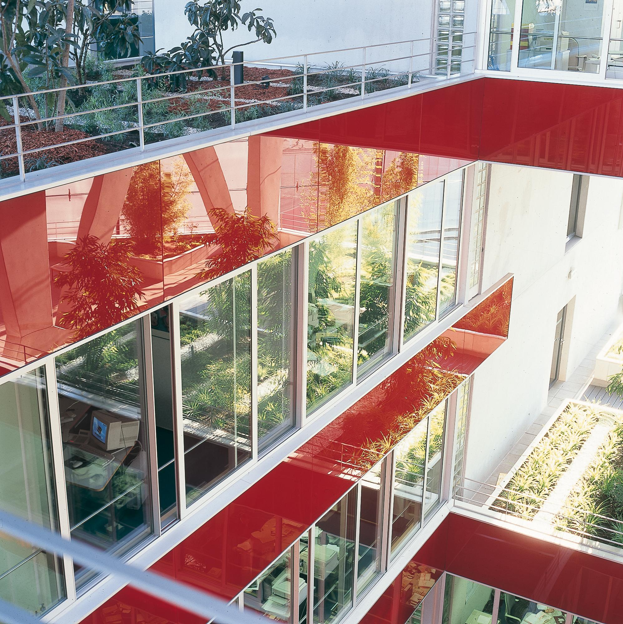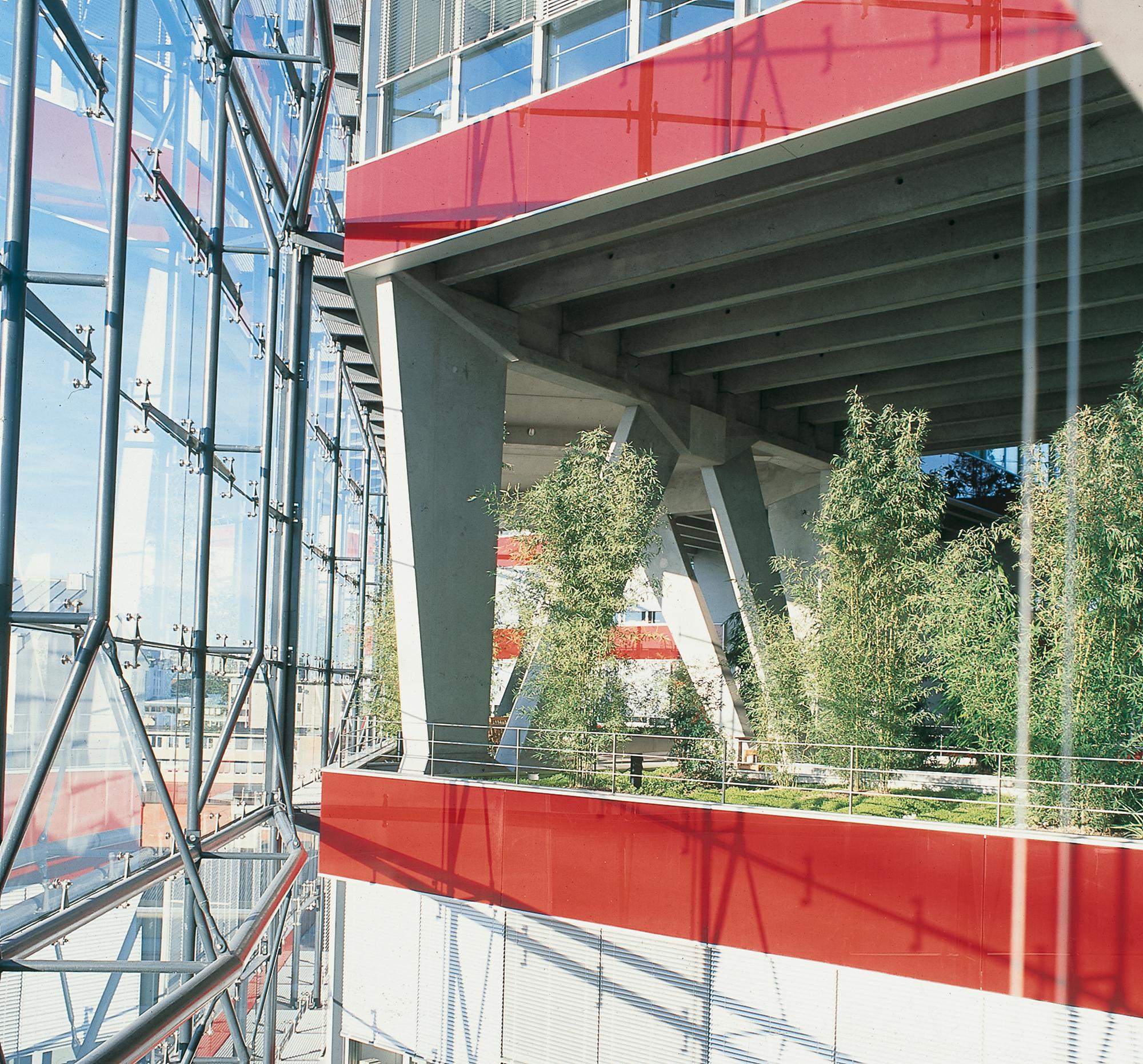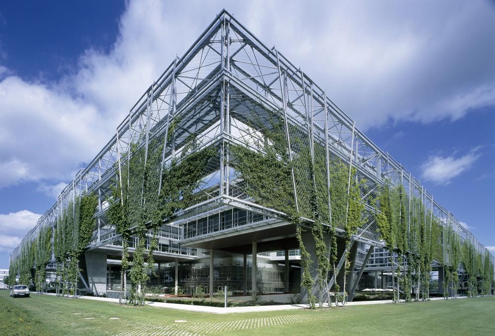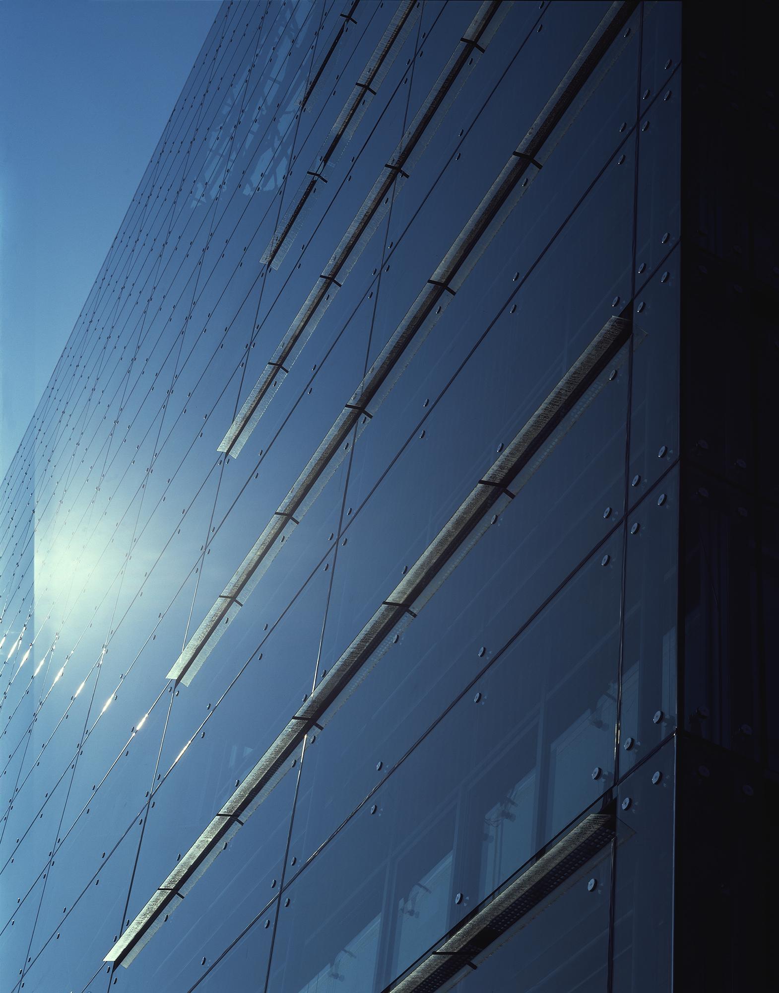 Office buildingHamburg, GermanyLaid upon one another, the two halves of the office building in Hamburg’s Heidenkampsweg form a Double-X. The unusual building form is not merely attractive, it also enables a particularly economical use of the building. The concept, for which the building won the first prize in an architectural competition, is based upon an inner, twelve-storey building, with a Double-X shaped floor plan, enclosed within a glass envelope. Six twelve-storey, triangular wintergardens, appear to visually extend the streetscape. Every office is located directly adjacent to one of these wintergardens. Both halves of the building are connected by four additional Mediterranean gardens, almost seven metre high, which have individual themes, planted with magnolias, bamboo, azaleas, and lemon trees. Each of the X’s has a service core, with stair towers, lifts, toilets and ancilliary functions, at it’s crossing point. From here, the individual offices can be accessed, 72 office units each 220 square metres large. Due to their glass skin, the offices do not require air conditioning. The buffer zones between both of the facades reduce the effect of external conditions such as rain, wind, noise and internal emissions, as well as enabling external sunscreens throughout the 48 metre high building. Through these measures, the heating costs are reduced by around 50%.