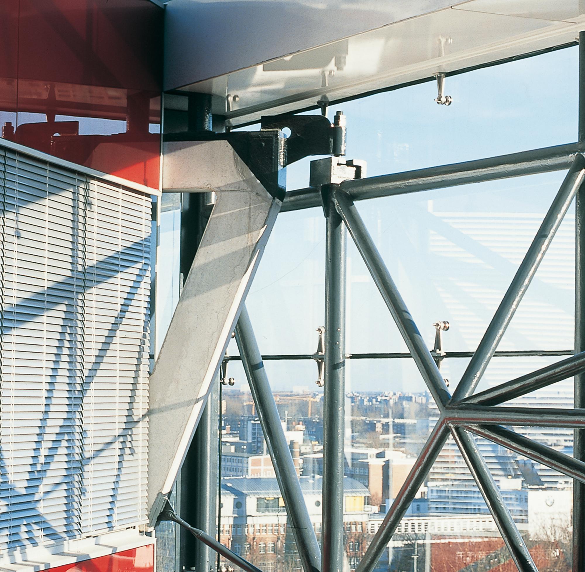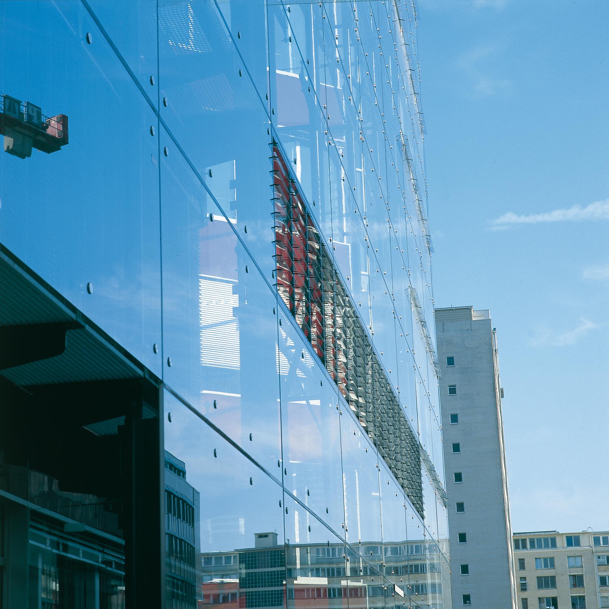 »They demand a rent of less than 12 euro per square meter of office space. With only two cores and a very effective building depth of 13.50 meters that left enough money to build a really high point-fixed hanging facade. «Hadi Teherani