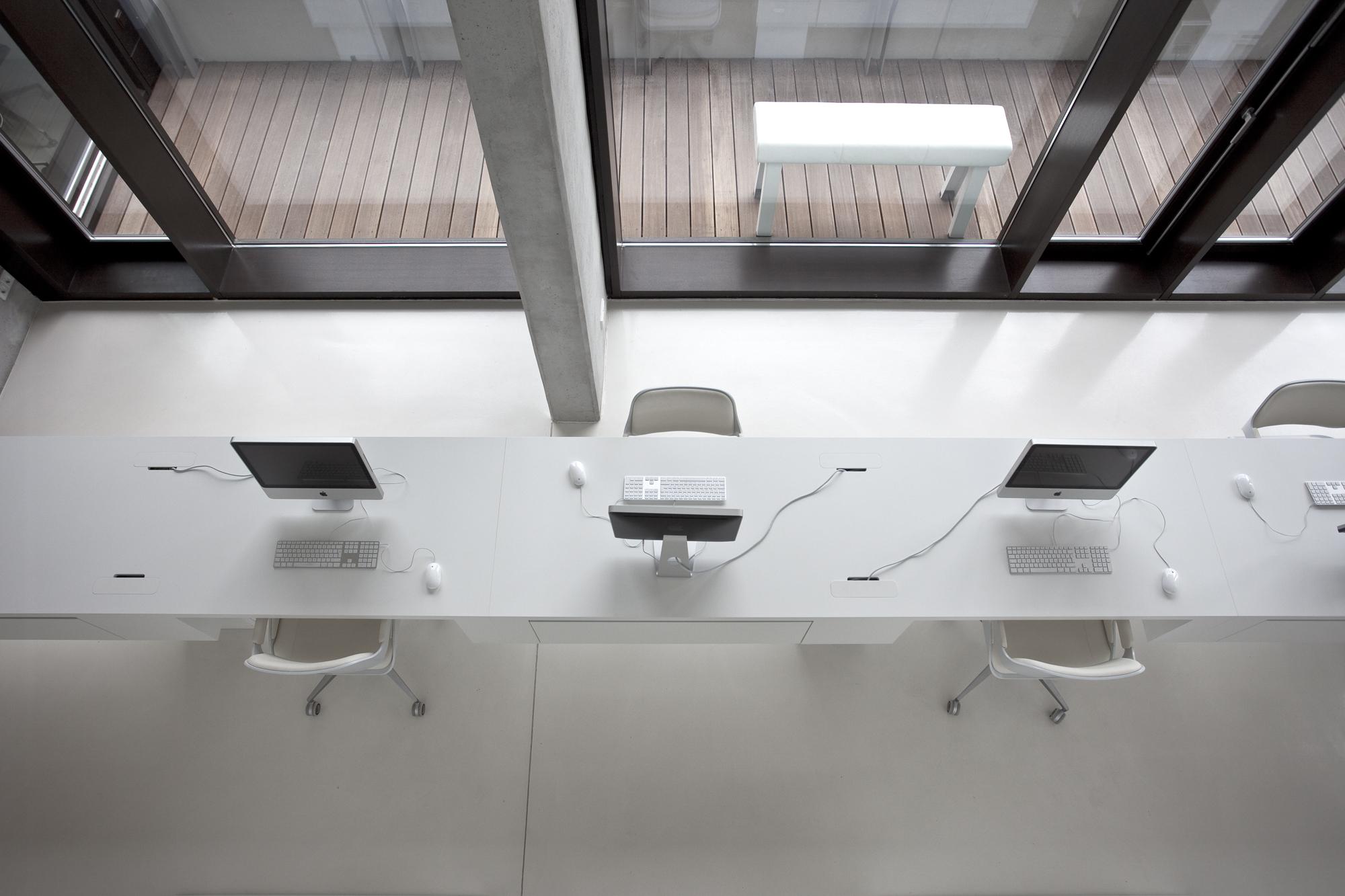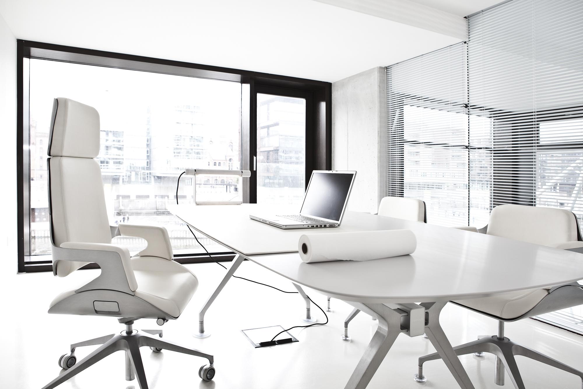New dimensions for work originated in the studio at the Hadi Teherani AG corporation located in Hamburg’s HafenCity urban development complex: rooms and furniture, levels and areas fluently merge into one another and act multifunctionally. Appointed completely in white, the design atelier has an equally inspiring effect as a site for ideas and encounters. A long table becomes the platform for communicative exchange. During the daytime it serves as an open workplace, for evening events it is transformed into a raised bar. In this particular building designed by Hadi Teherani, the adjoining showroom opens the studio spaces in an outward direction. Architecture and interior coalesce as one.