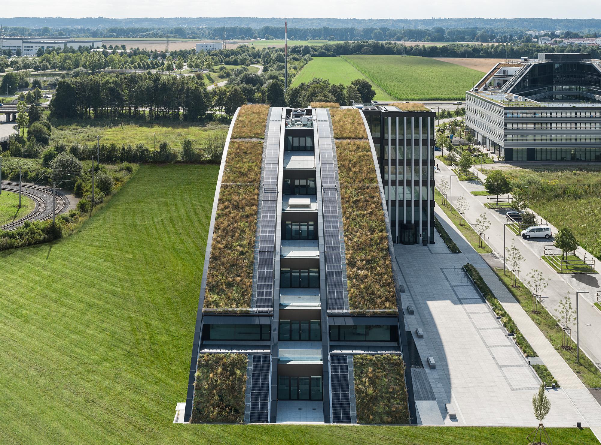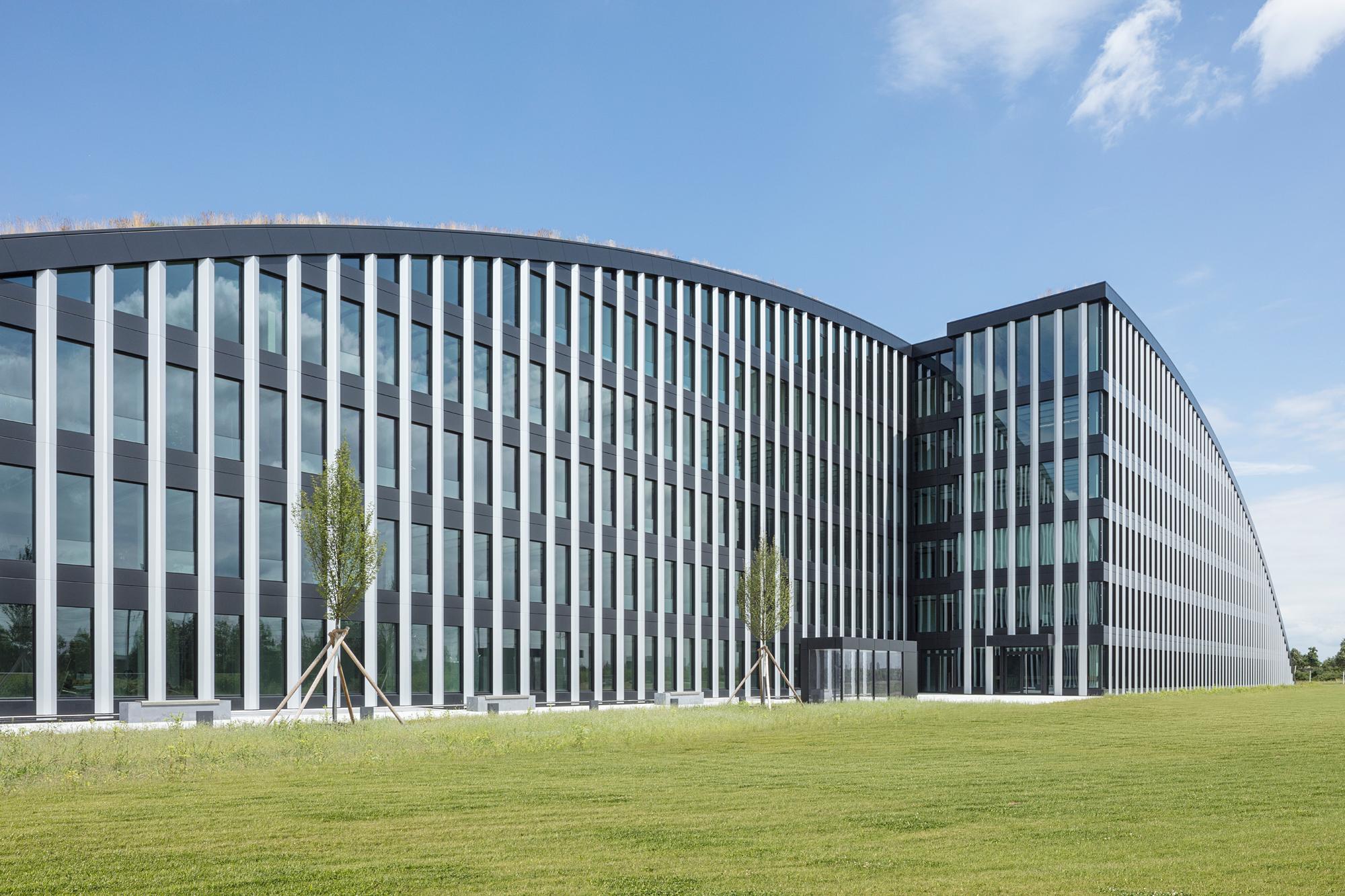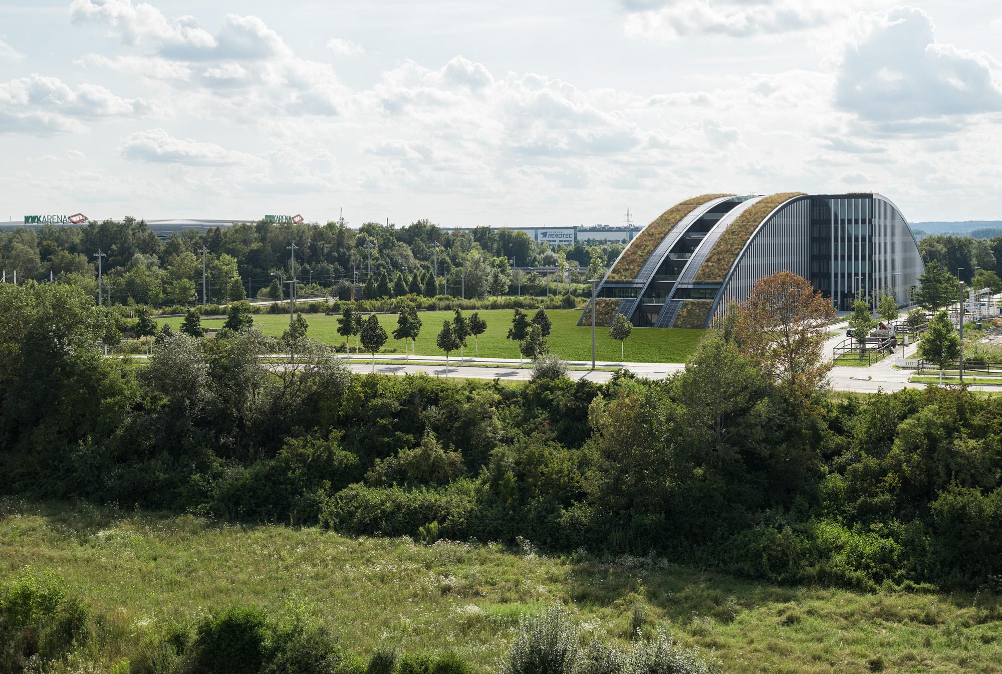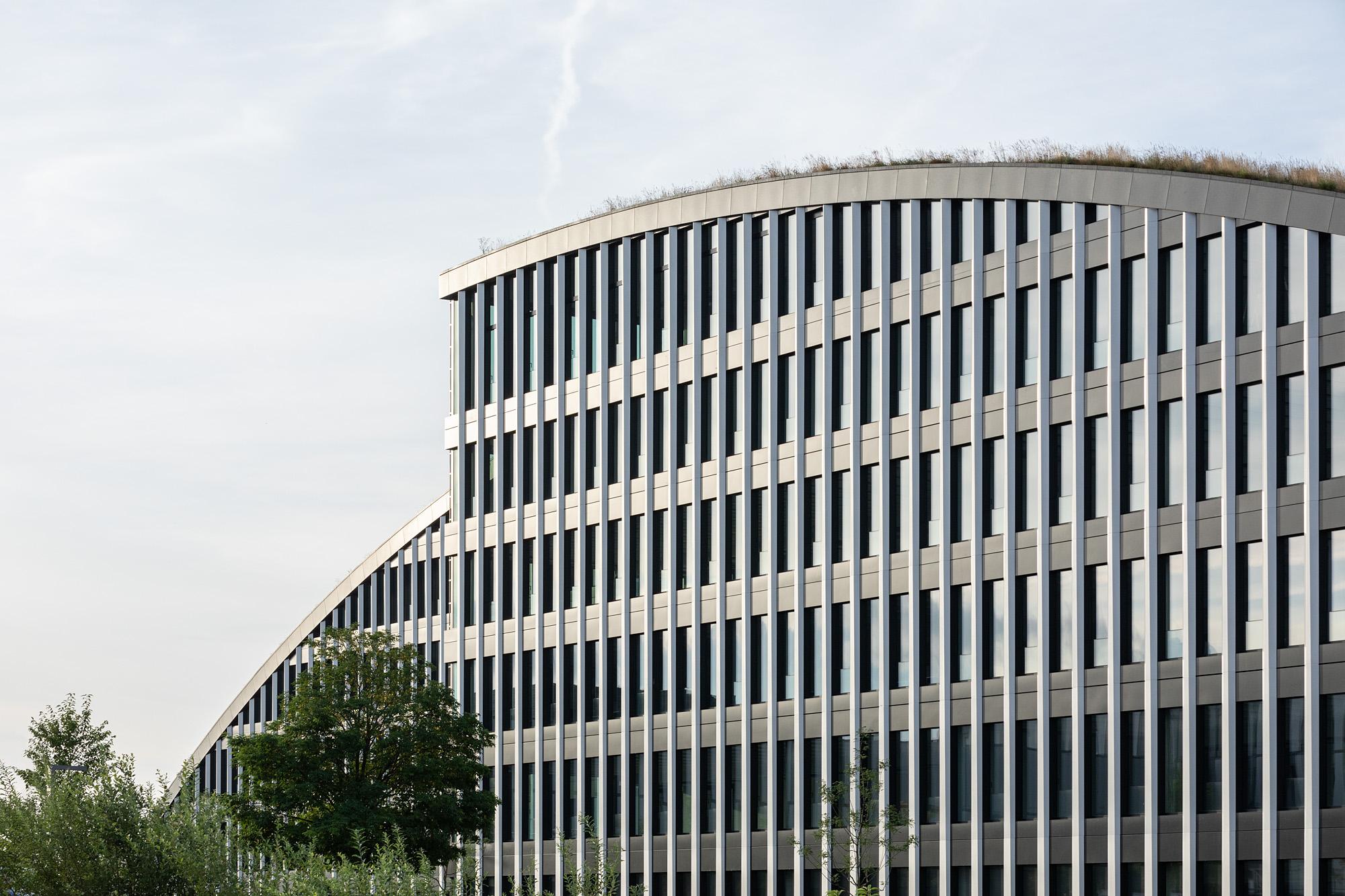 Office buildingAugsburg, GermanyThe building’s elegantly curved arch nearly takes on the shape of a sunrise. The green landscaped roof sees to it that the “Innovationsbogen”, the Innovation Arch, merges with its surroundings to form one entity. The striking silhouette is going to turn this office complex into a new landmark on the grounds of the Augsburg “Innovationspark”. This innovation park facility is readily regarded as a project success for Augsburg: An internationally acknowledged competence centre for the production-oriented development of innovative technologies is arising on an area of over 170 acres there. Extraordinary architecture meets trailblazing energy efficiency and maximum flexibility. When it comes to the deployment of environmentally sound technology and the use of modern materials, the Innovation Arch sets benchmarks in many sectors. Absolutely pioneering and a world premiere all in one is the façade made of 100 % recycled aluminium. Installation of the prefabricated elements will be completed in the summer. Due to this trendsetting technology alone, far more than 500 tonnes of CO2 are going to be saved. The structure aims to receive certification in compliance with the LEED environmental label (Leadership in Energy and Environmental Design) and be rated with its Core + Shell standard in Platinum.
