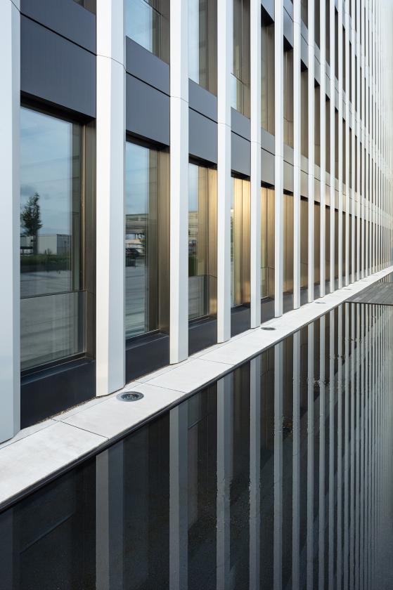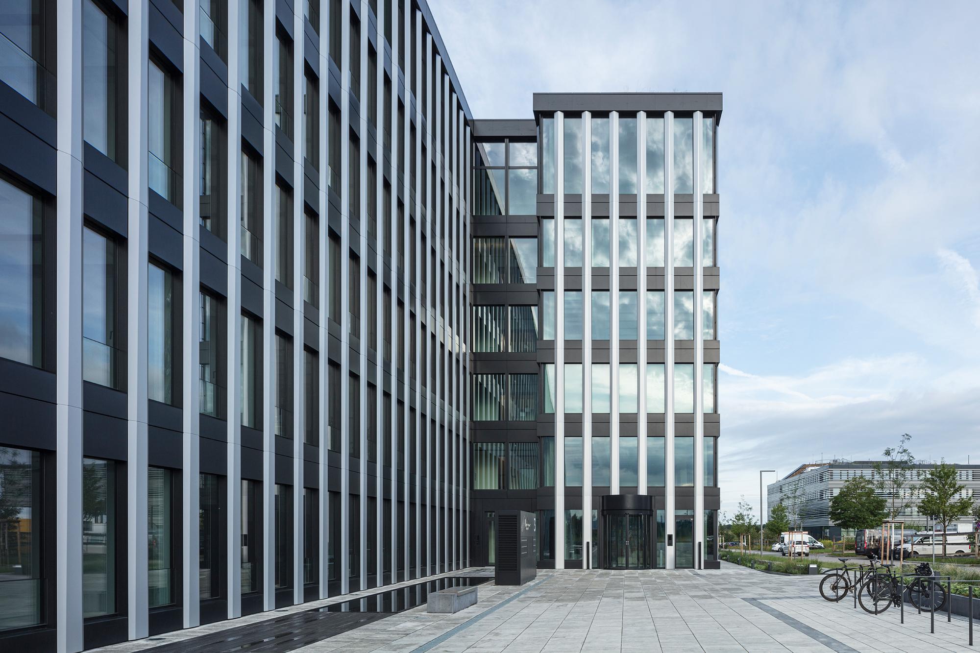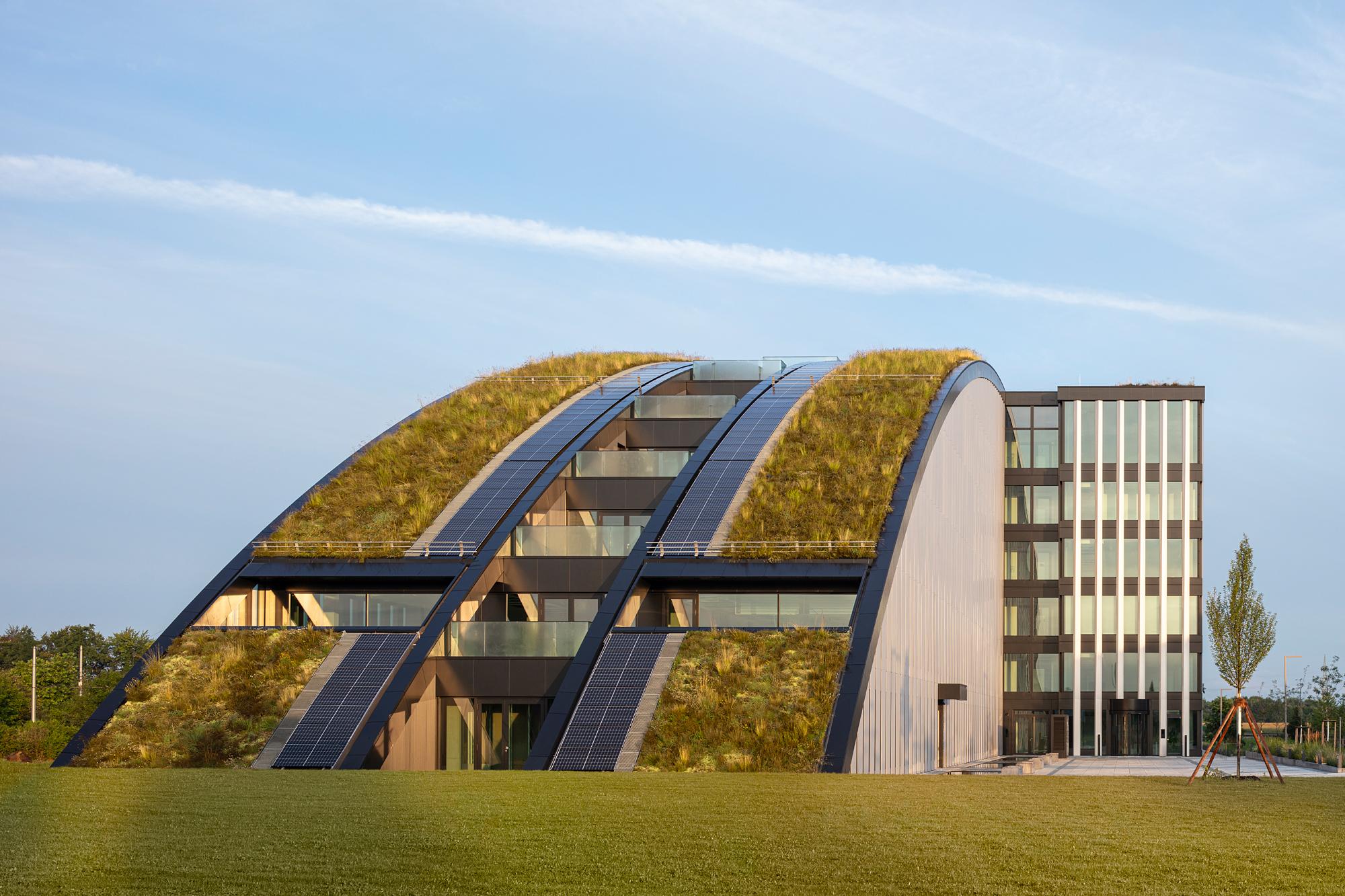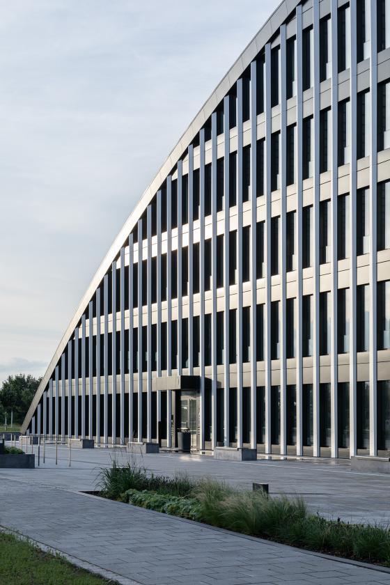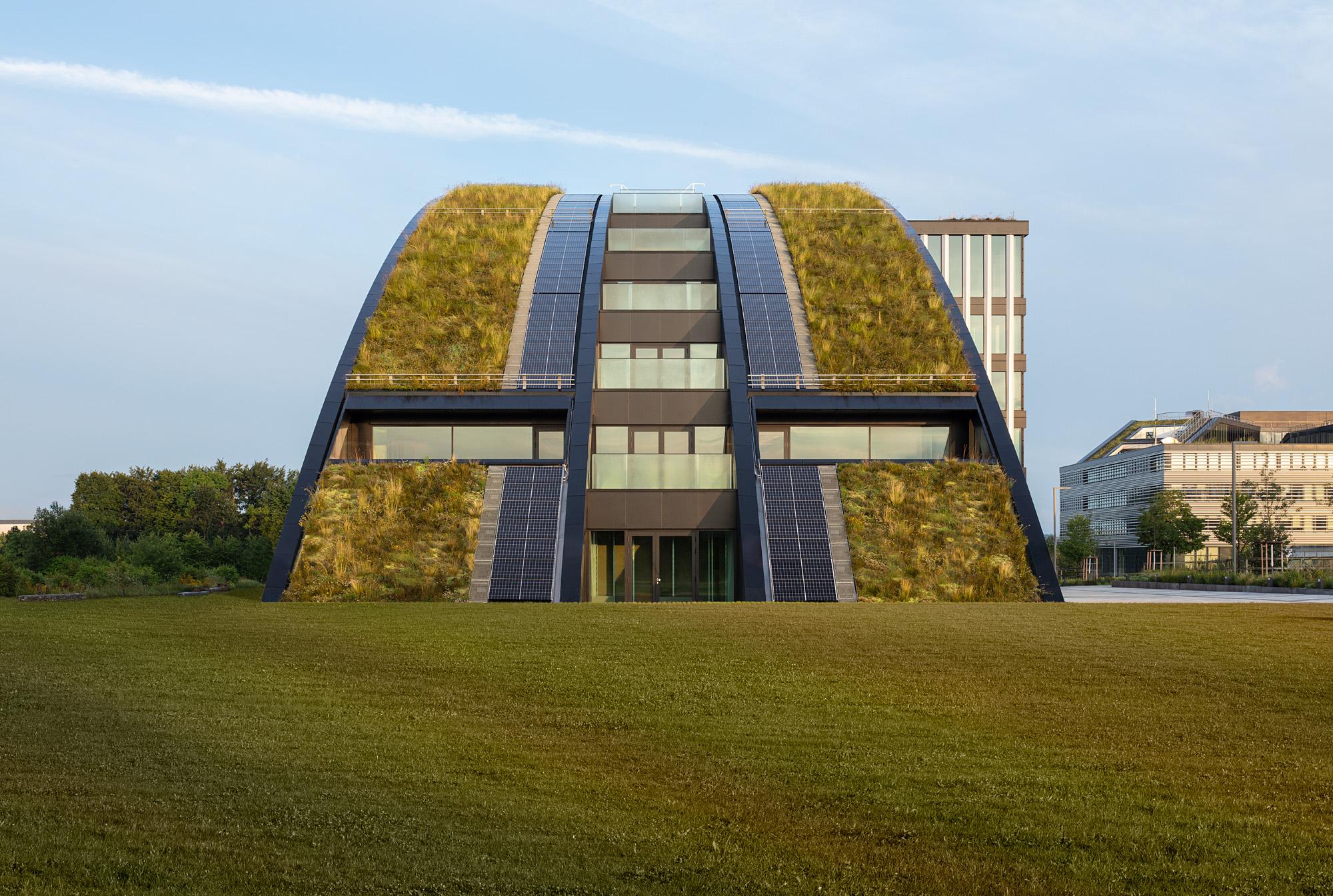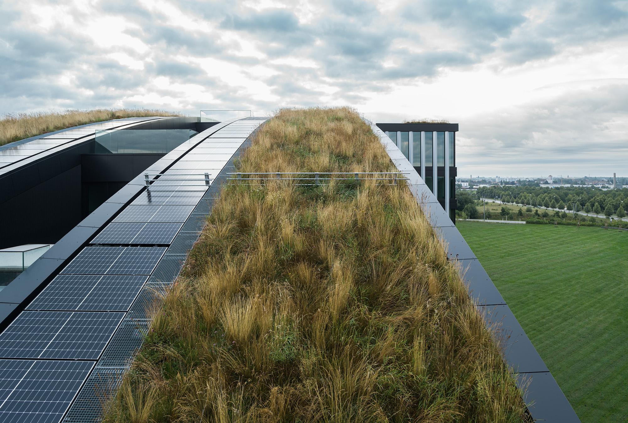 Office buildingAugsburg, GermanyThe building’s elegantly curved arch nearly takes on the shape of a sunrise. The green landscaped roof sees to it that the “Innovationsbogen”, the Innovation Arch, merges with its surroundings to form one entity. The striking silhouette is going to turn this office complex into a new landmark on the grounds of the Augsburg “Innovationspark”. This innovation park facility is readily regarded as a project success for Augsburg: An internationally acknowledged competence centre for the production-oriented development of innovative technologies is arising on an area of over 170 acres there. Extraordinary architecture meets trailblazing energy efficiency and maximum flexibility. When it comes to the deployment of environmentally sound technology and the use of modern materials, the Innovation Arch sets benchmarks in many sectors. Absolutely pioneering and a world premiere all in one is the façade made of 100 % recycled aluminium. Installation of the prefabricated elements will be completed in the summer. Due to this trendsetting technology alone, far more than 500 tonnes of CO2 are going to be saved. The structure aims to receive certification in compliance with the LEED environmental label (Leadership in Energy and Environmental Design) and be rated with its Core + Shell standard in Platinum.