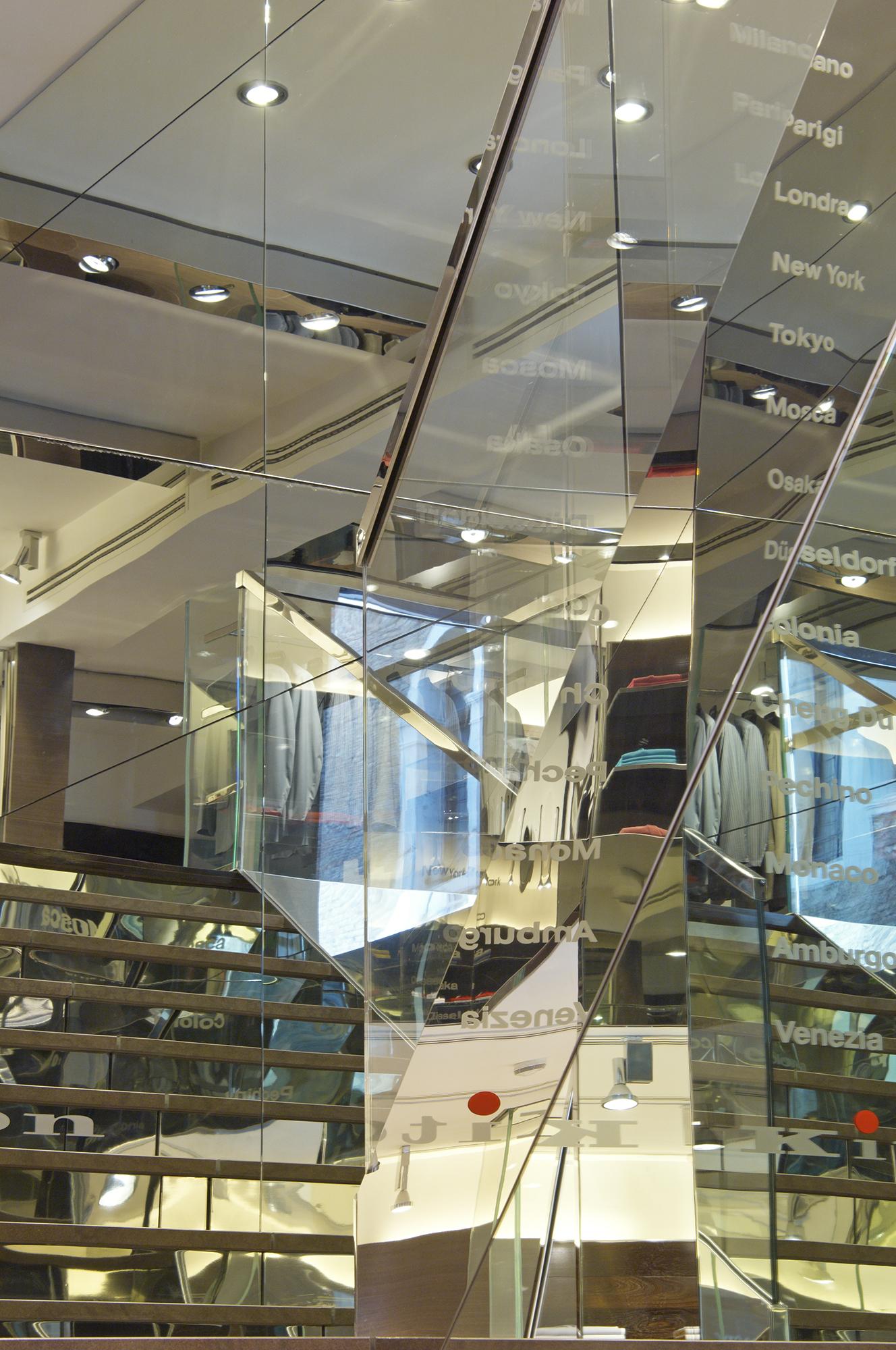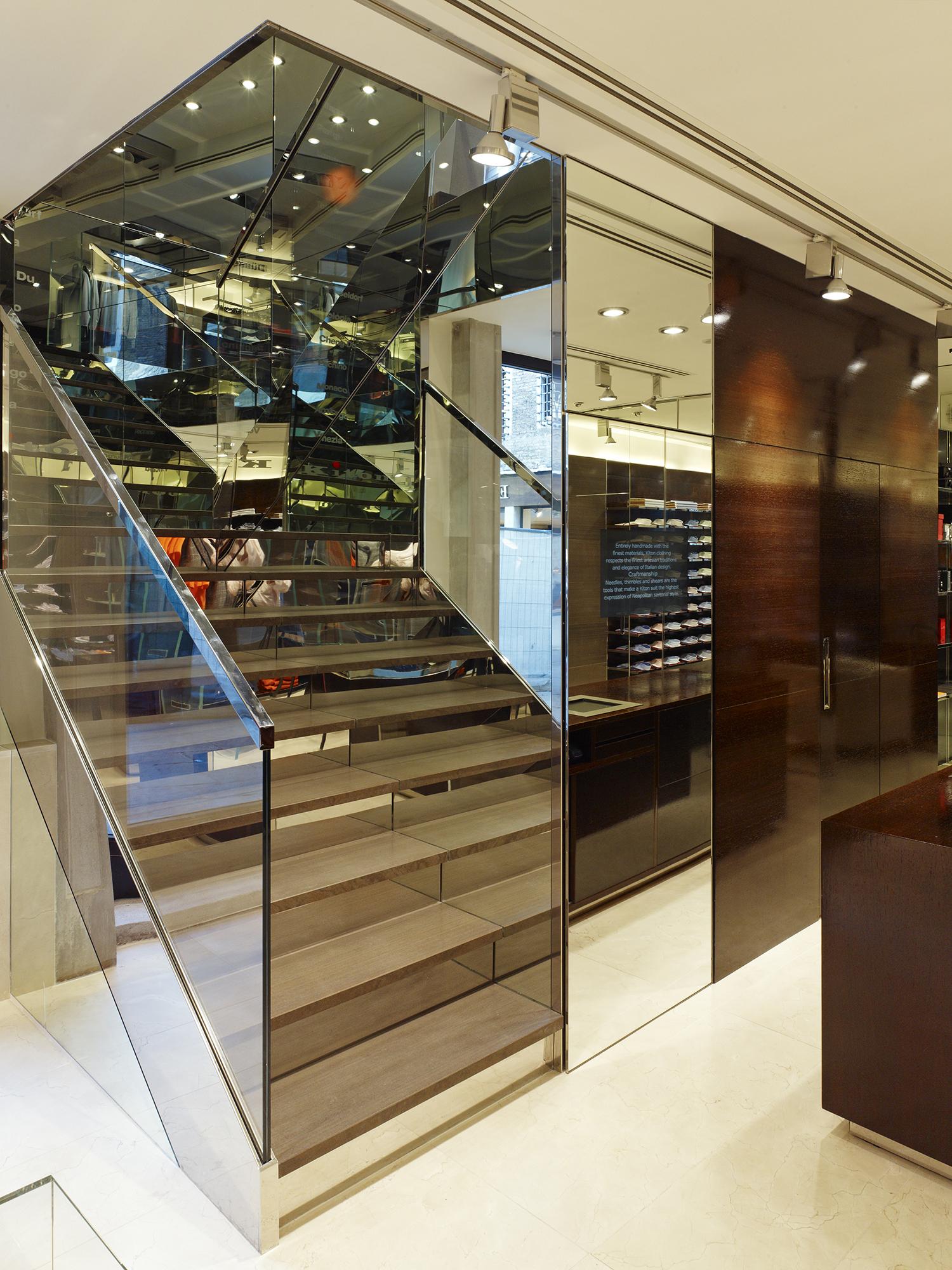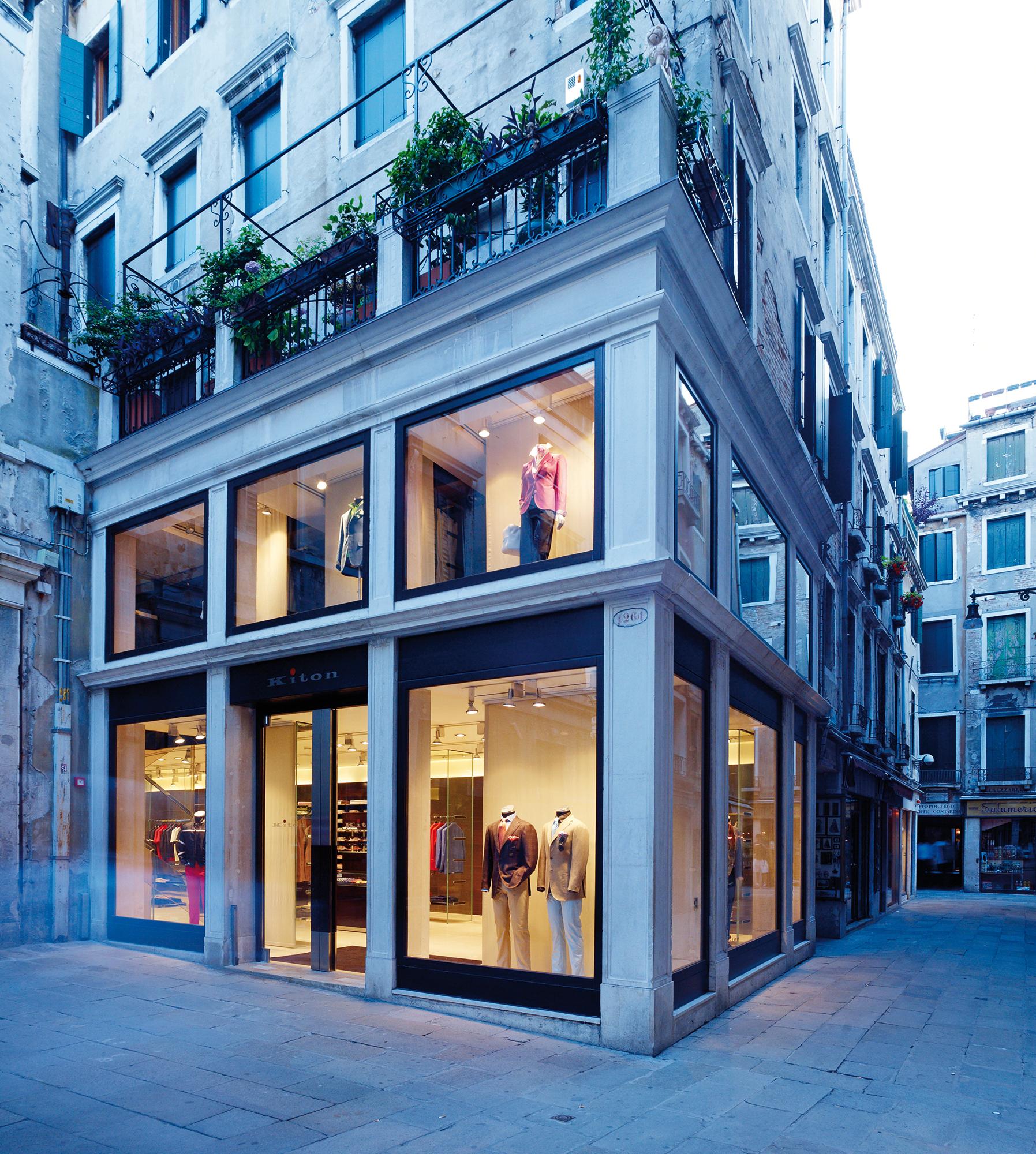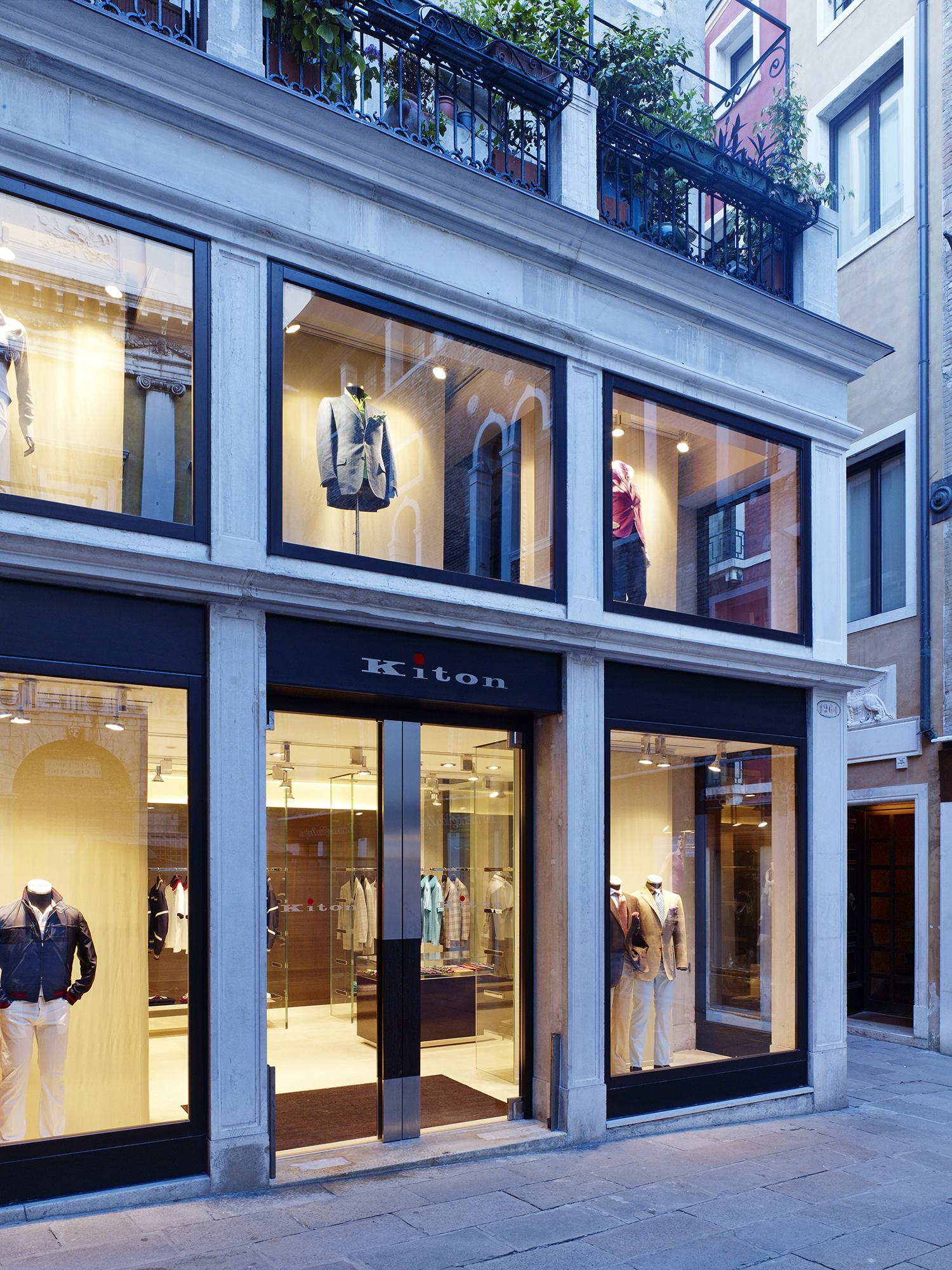 StoreVenice, ItalyKiton presents itself in the immediate vicinity of St. Mark’s Square on around 190 m² of space ranging across two floors. Polished stainless steel and glass along with dark woods alternating with natural stone are the recurring elements that skilfully and credibly communicate the discreet elegance exhibited by this Neapolitan tailor for made-to-measure menswear. Room-high, open showcase elements are turned into stylish stages via perfectly fitted metal bases or garment racks.