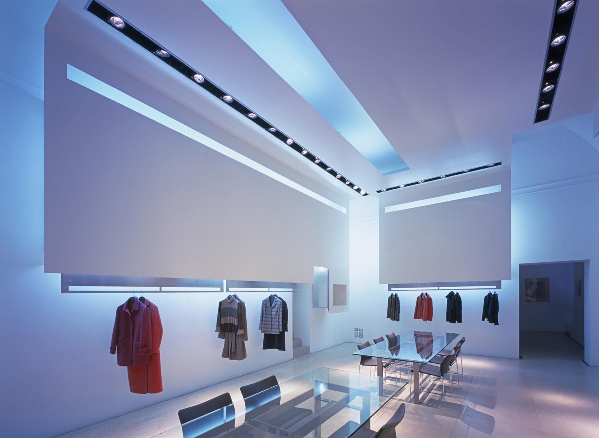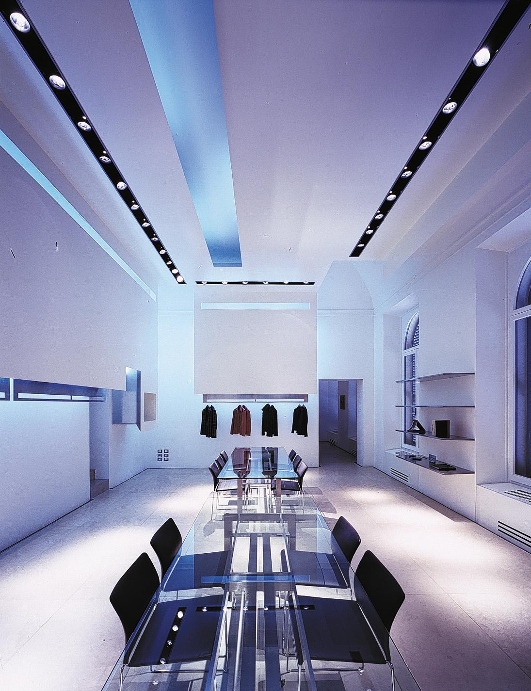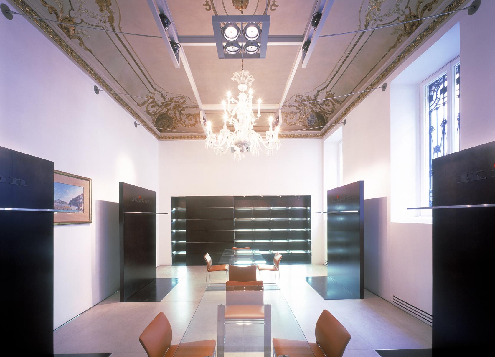 ShowroomMilan, ItalyThe fashion house Kiton, in the Via S.Andrea, in the centre of Milan, presents it’s collection within a listed building. The showrooms feature a continuous theme: sculptural walls, which either stand on the floor or are suspended from the ceiling. In the showroom for men’s clothing, the L-shaped collection rails, from which the exhibits hang, in front of dark, hardwood panels, are set into the floor. Standing free from the walls, they generate a second open space. This principal is reversed in the showroom for ladieswear: white, sculptural wall panels, lit from behind, are suspended from the walls and ceiling. The collections hang from brushed stainless steel panels, which create a second layer. A corridor connecting both of these rooms, features large, illuminated, slides, showing the traditional hand-production methods of the company.