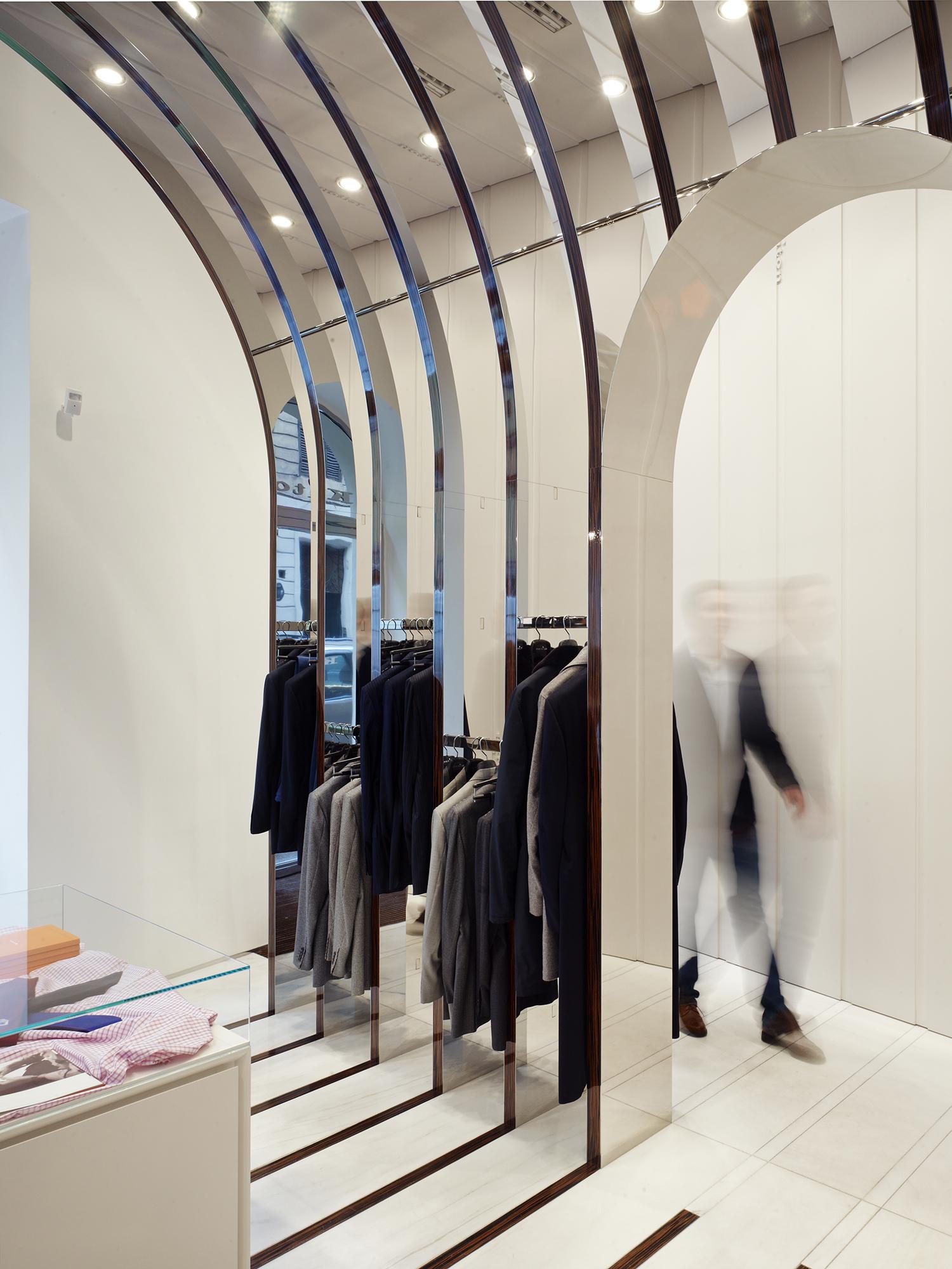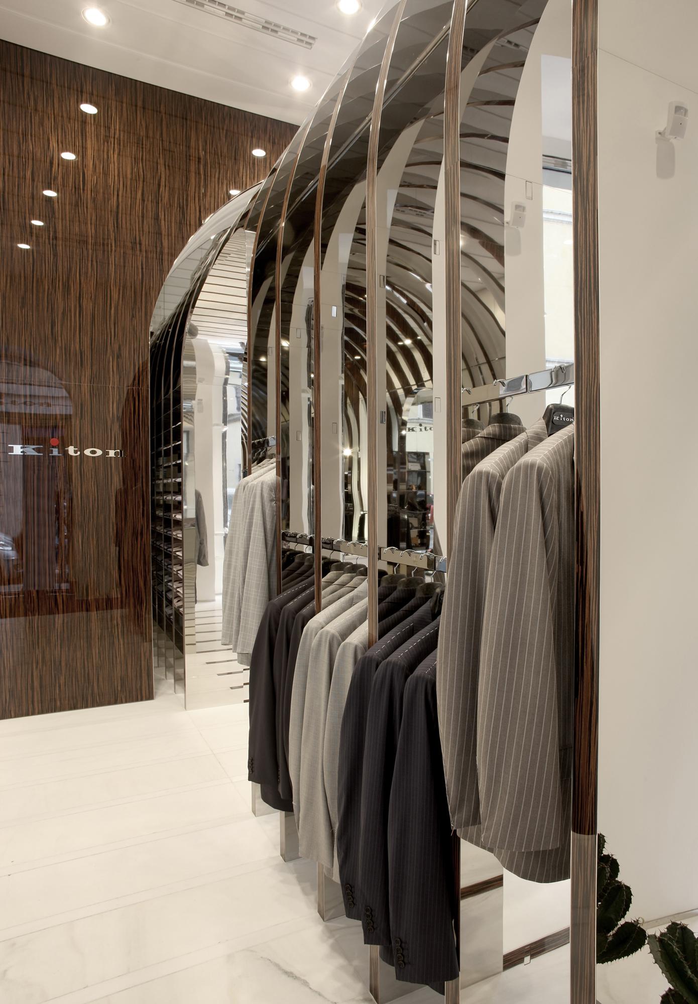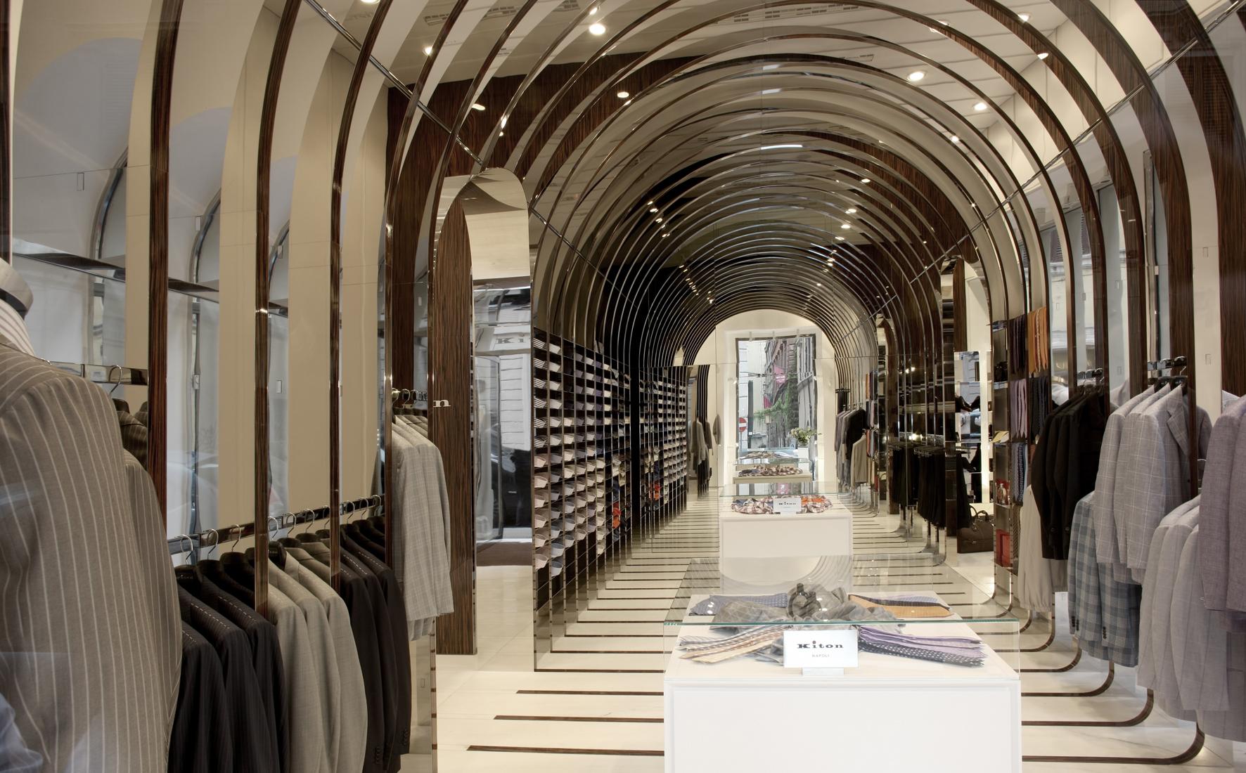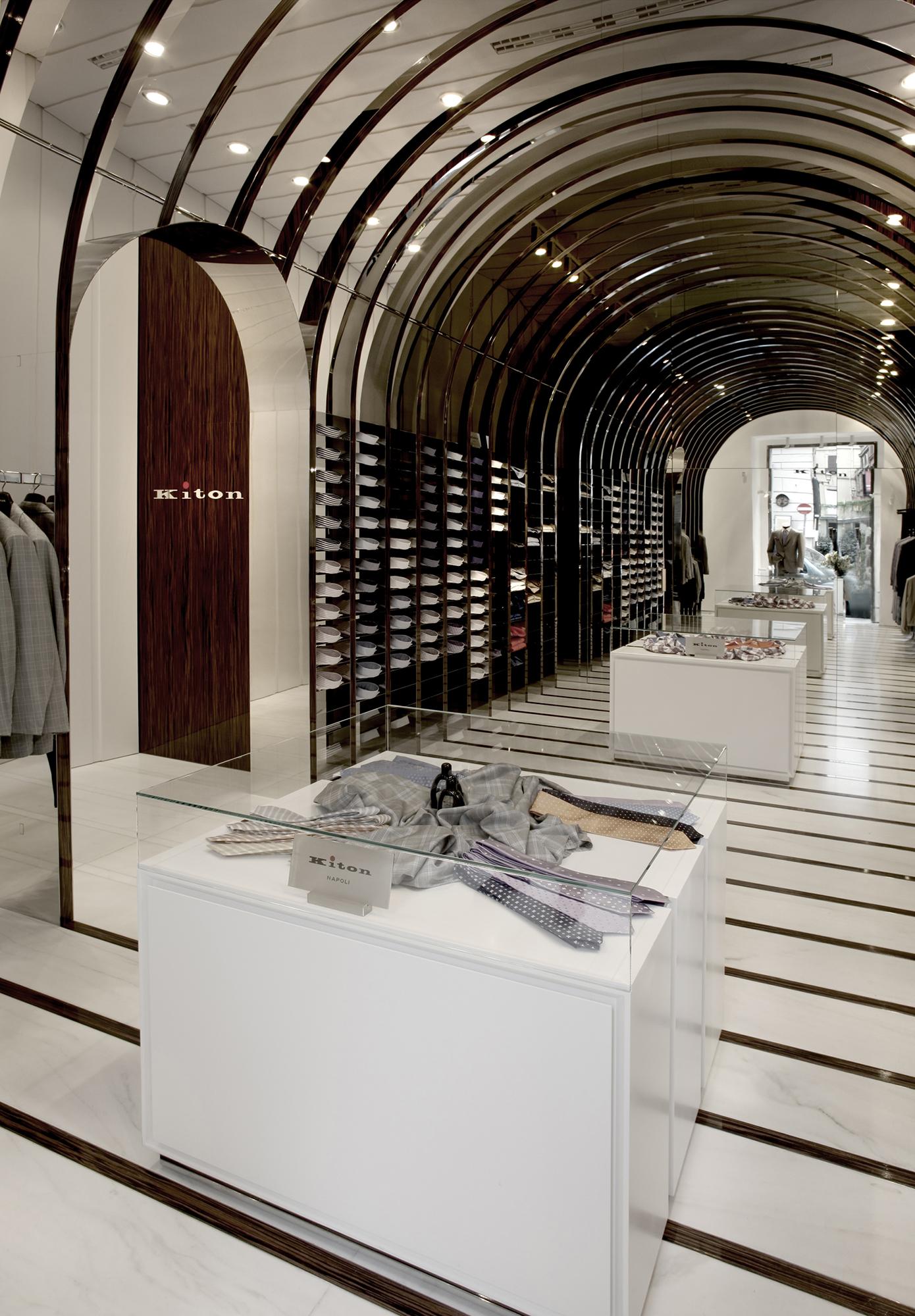 StoreRom, ItalyDespite a mere 60 m² of space, the Kiton store in Rome on the bustling Via del Babuino near the Spanish Steps offers a quite unique shopping and brand experience. The central arch-shaped passageway in the middle of the store was seized upon as principal element to create a relationship to the site by referring to the ancient typology, though an atmospherically structured space is intended, too. The delicately laced stainless-steel arches with flanking wooden look are set forth in different emphases as a stripe motif on all areas within the space, conveying the impression of meandering through a beautifully packaged gift. At the same time, the items on display are allocated very clearly. The stainless steel bases of the shelves and the garment racks follow up on the arch structure and emphasize it. In contrast, an intriguing entryway situation, the changing room, a small presentation of shoes and unusually accessible display areas behind the shop windows arise due to the dynamically tailored spandrels between the arches and frames. With the help of the mirrored terminating partition as ‘final chord’ in front of the adjoining rooms, the space is seemingly elongated into infinity.