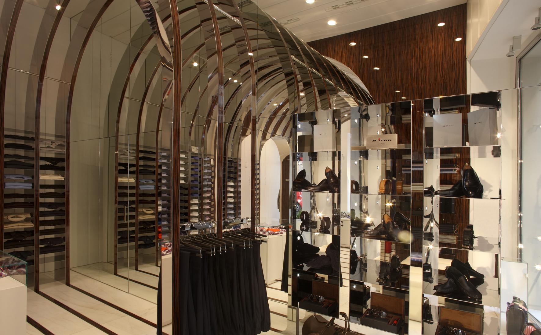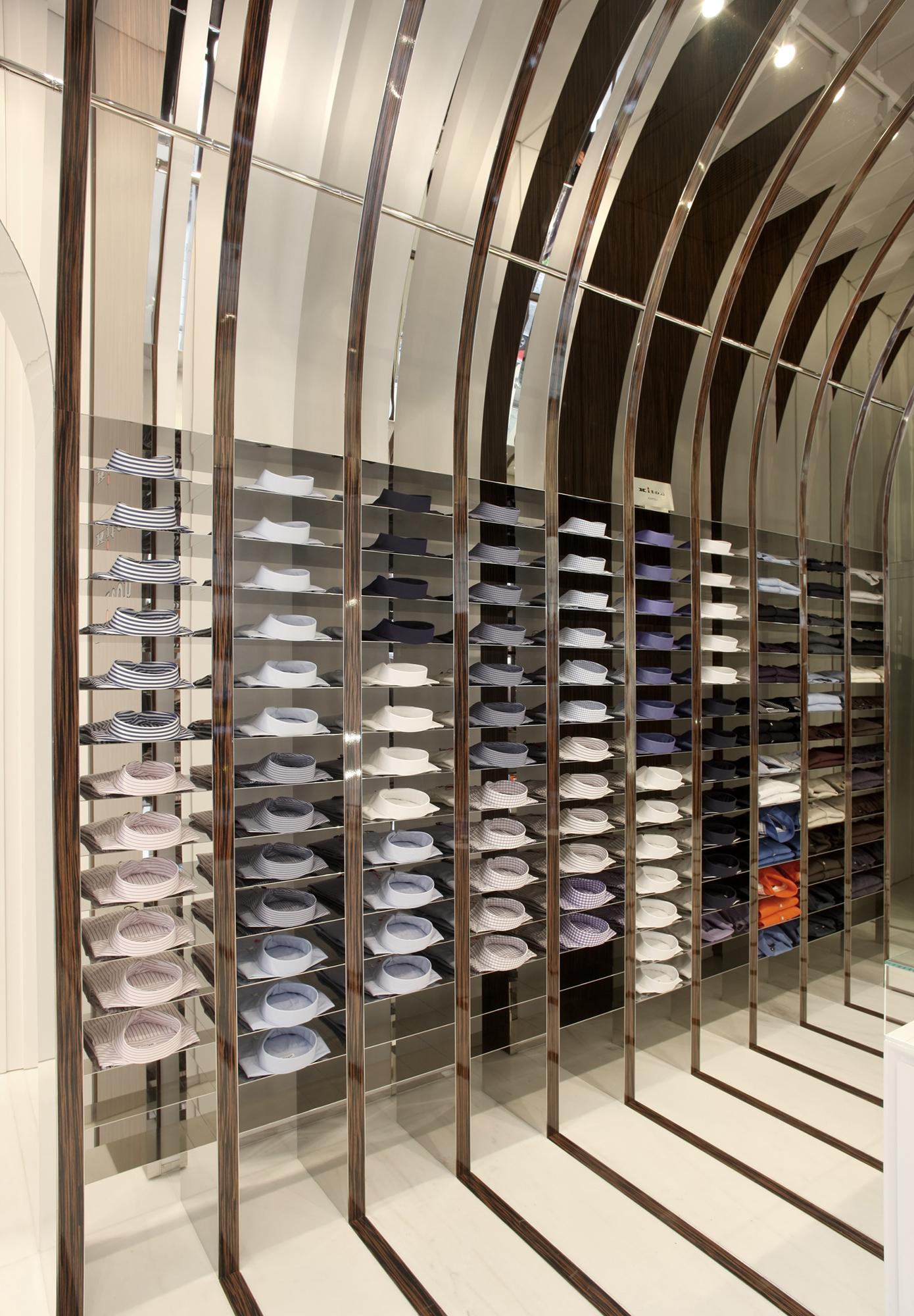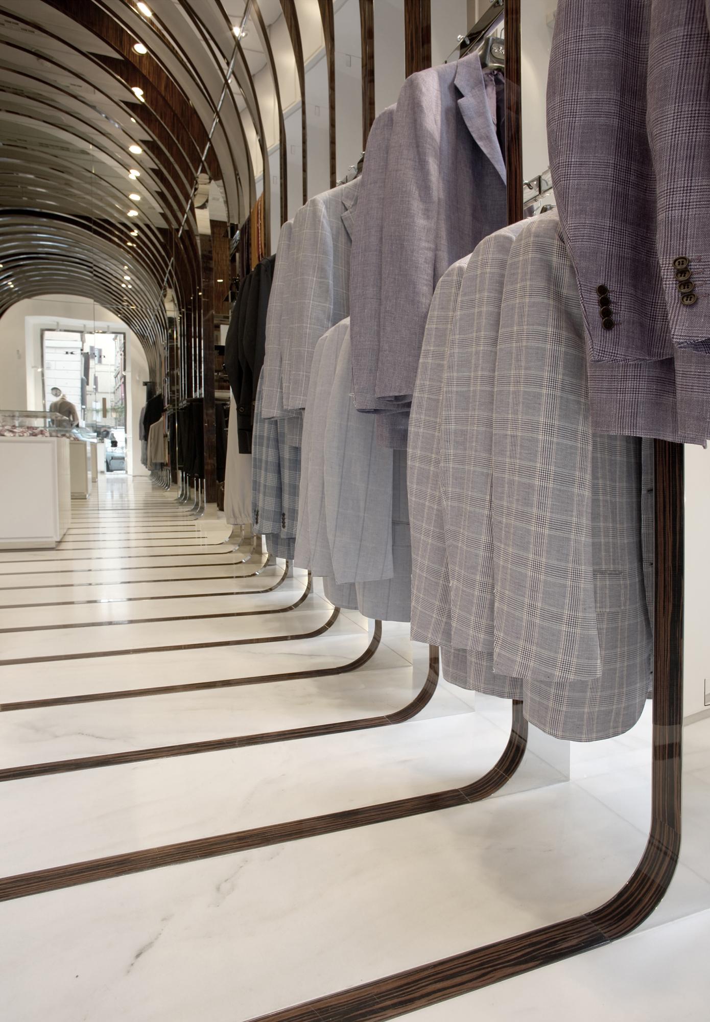 StoreRom, ItalyDespite a mere 60 m² of space, the Kiton store in Rome on the bustling Via del Babuino near the Spanish Steps offers a quite unique shopping and brand experience. The central arch-shaped passageway in the middle of the store was seized upon as principal element to create a relationship to the site by referring to the ancient typology, though an atmospherically structured space is intended, too. The delicately laced stainless-steel arches with flanking wooden look are set forth in different emphases as a stripe motif on all areas within the space, conveying the impression of meandering through a beautifully packaged gift. At the same time, the items on display are allocated very clearly. The stainless steel bases of the shelves and the garment racks follow up on the arch structure and emphasize it. In contrast, an intriguing entryway situation, the changing room, a small presentation of shoes and unusually accessible display areas behind the shop windows arise due to the dynamically tailored spandrels between the arches and frames. With the help of the mirrored terminating partition as ‘final chord’ in front of the adjoining rooms, the space is seemingly elongated into infinity.