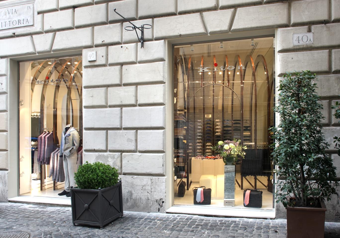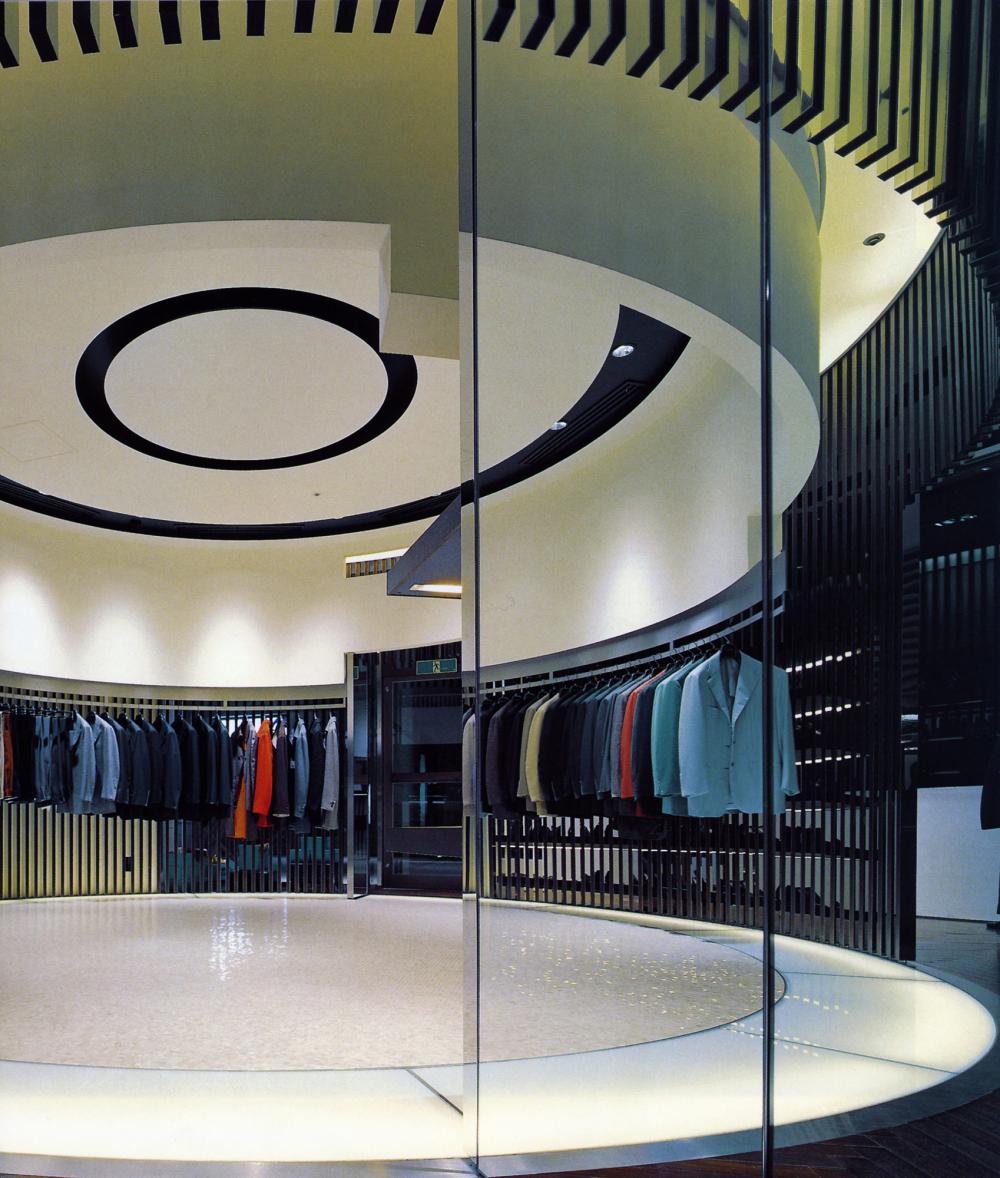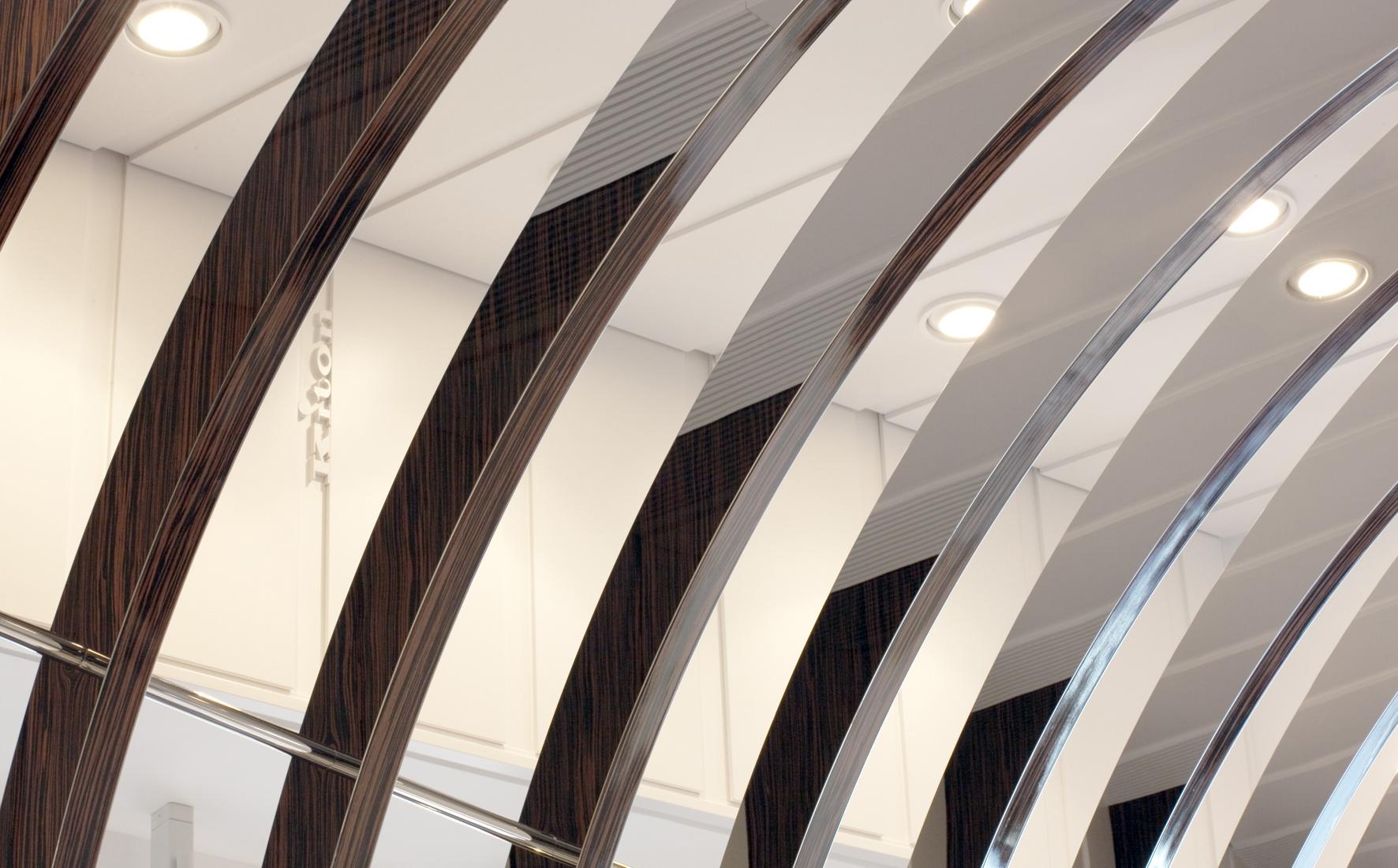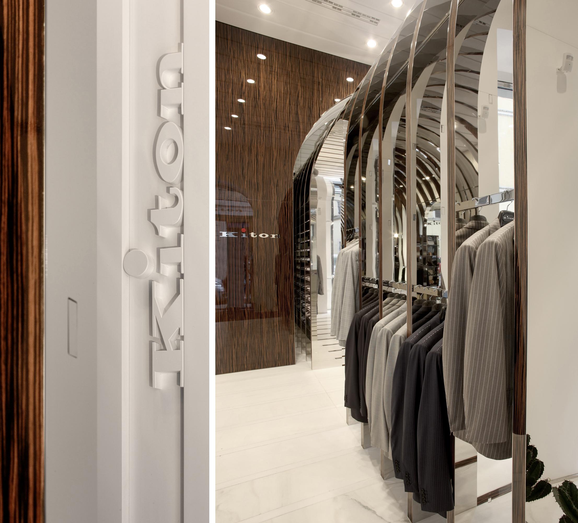 StoreRom, ItalyDespite a mere 60 m² of space, the Kiton store in Rome on the bustling Via del Babuino near the Spanish Steps offers a quite unique shopping and brand experience. The central arch-shaped passageway in the middle of the store was seized upon as principal element to create a relationship to the site by referring to the ancient typology, though an atmospherically structured space is intended, too. The delicately laced stainless-steel arches with flanking wooden look are set forth in different emphases as a stripe motif on all areas within the space, conveying the impression of meandering through a beautifully packaged gift. At the same time, the items on display are allocated very clearly. The stainless steel bases of the shelves and the garment racks follow up on the arch structure and emphasize it. In contrast, an intriguing entryway situation, the changing room, a small presentation of shoes and unusually accessible display areas behind the shop windows arise due to the dynamically tailored spandrels between the arches and frames. With the help of the mirrored terminating partition as ‘final chord’ in front of the adjoining rooms, the space is seemingly elongated into infinity.