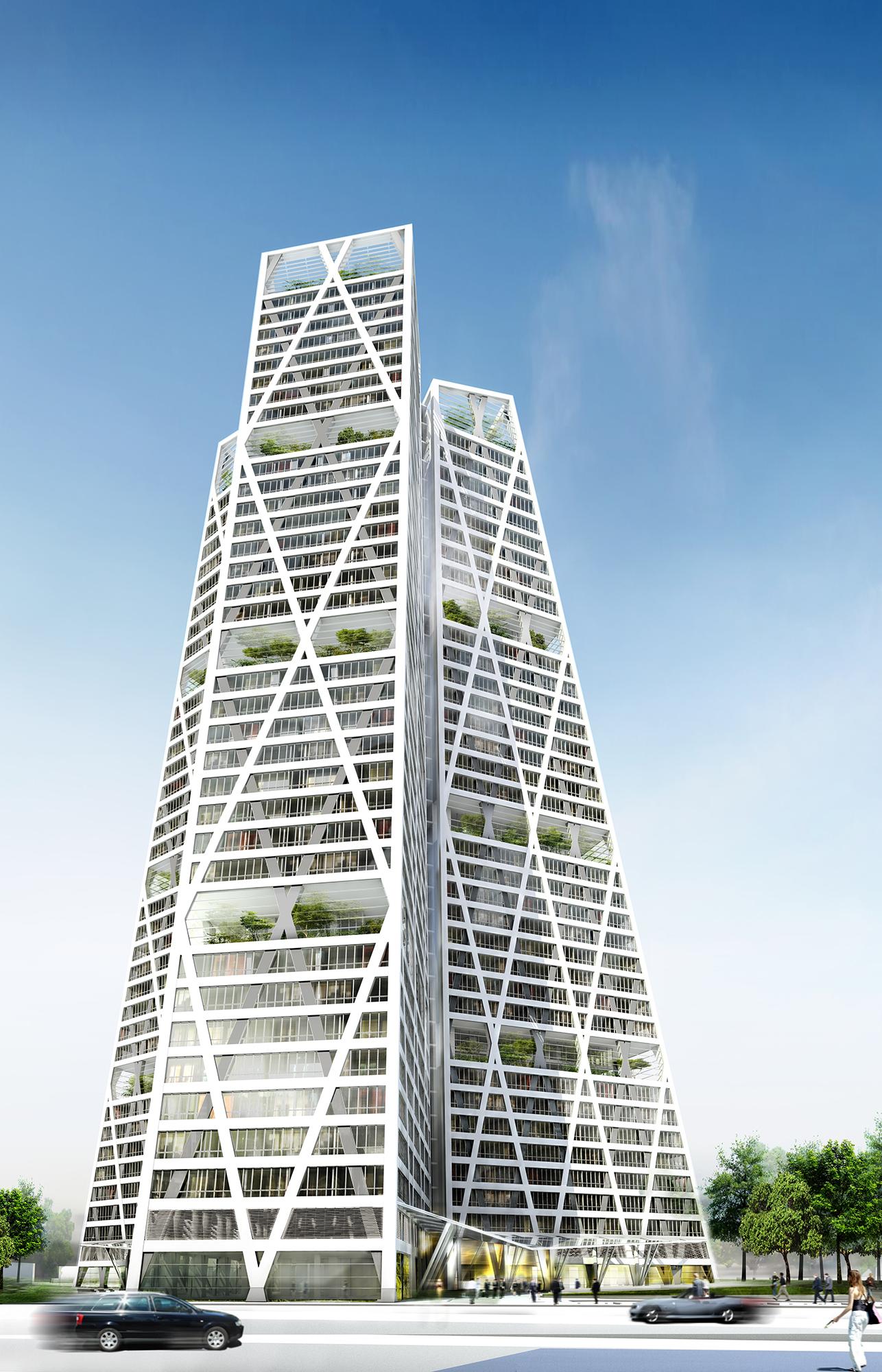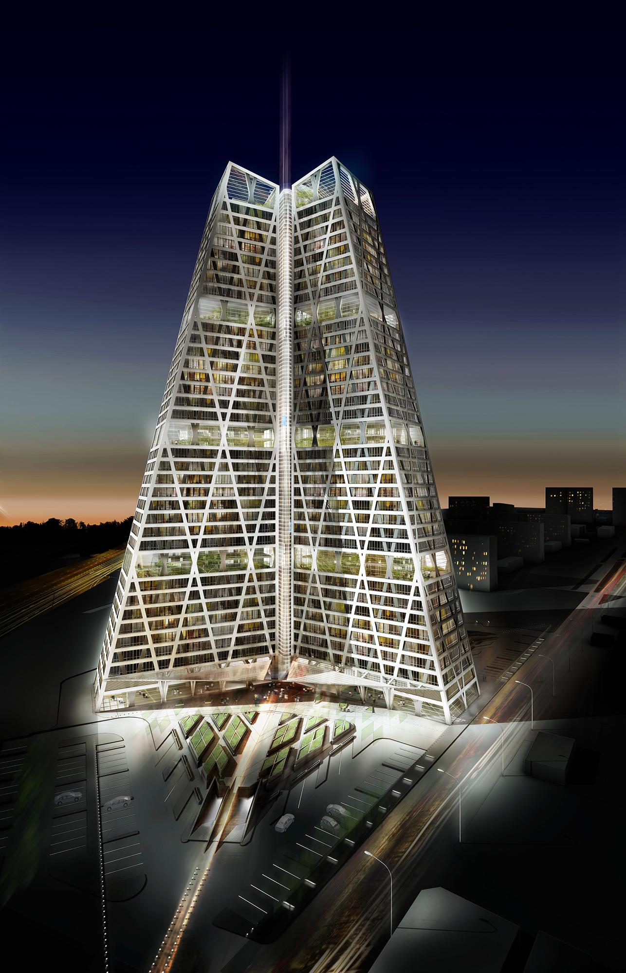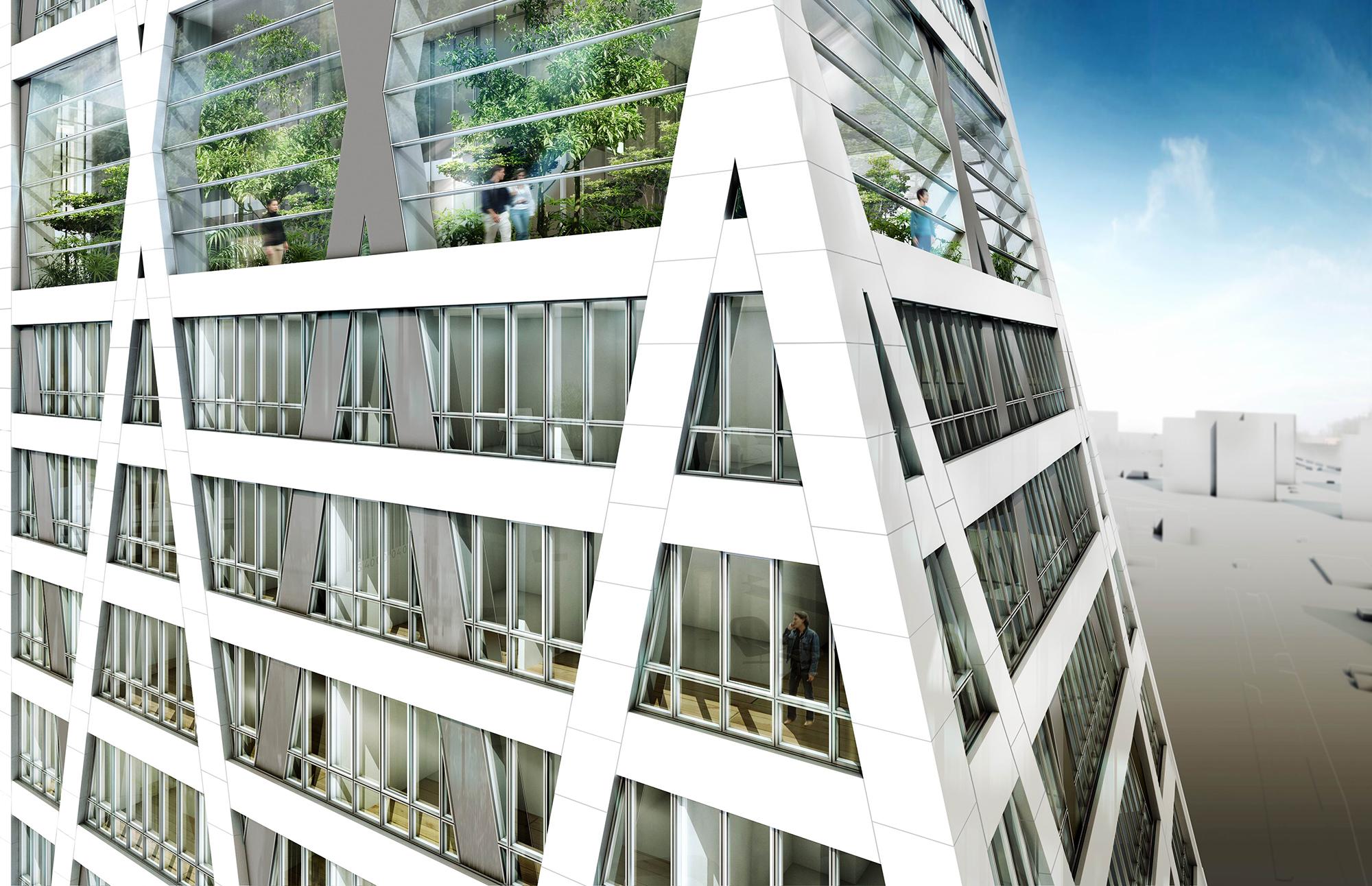 In order to underline the optical unity of the solitary structure the three building components will be connected by a rhombus-shaped facade grid that represents the support structure of the buildings on the facade.
