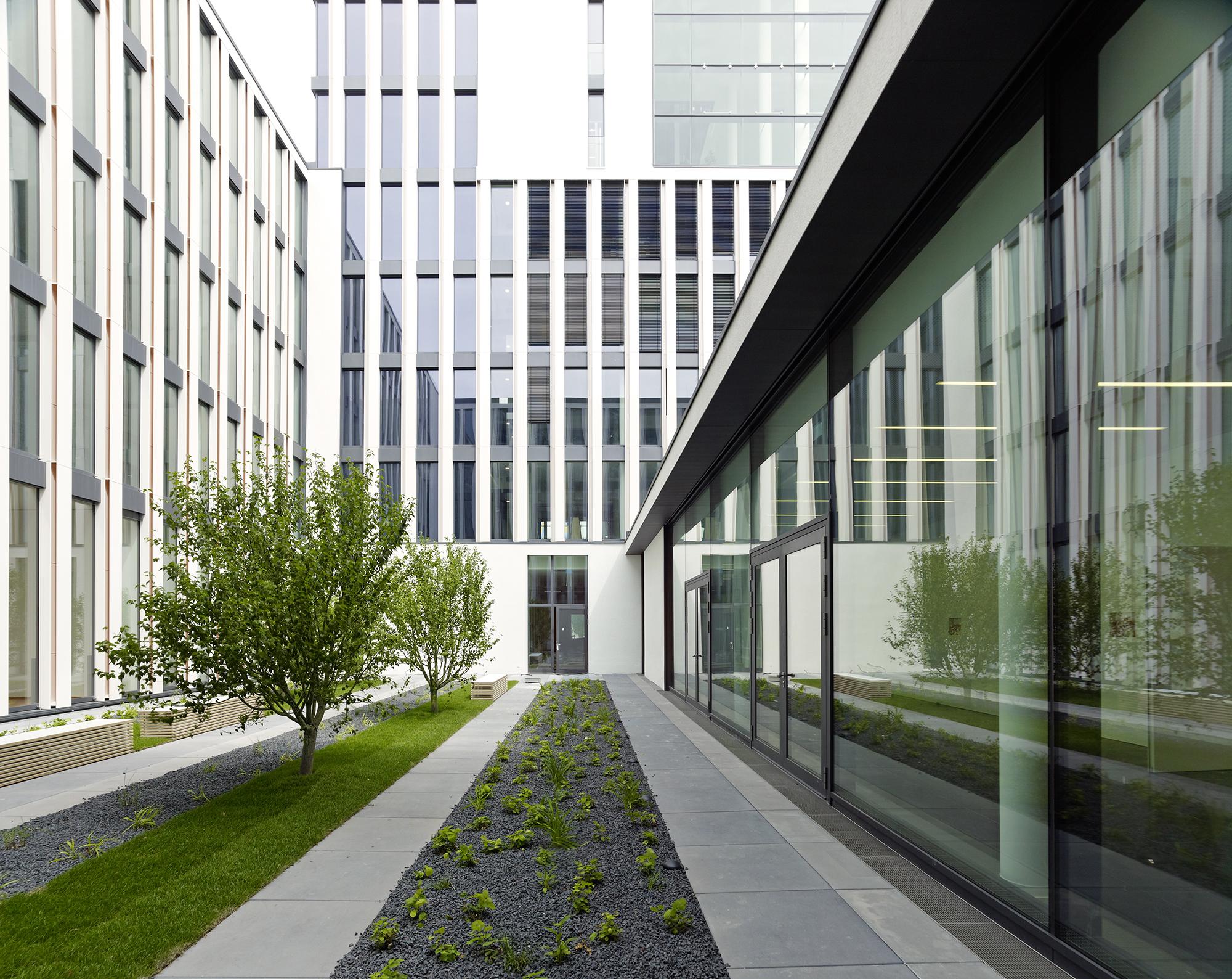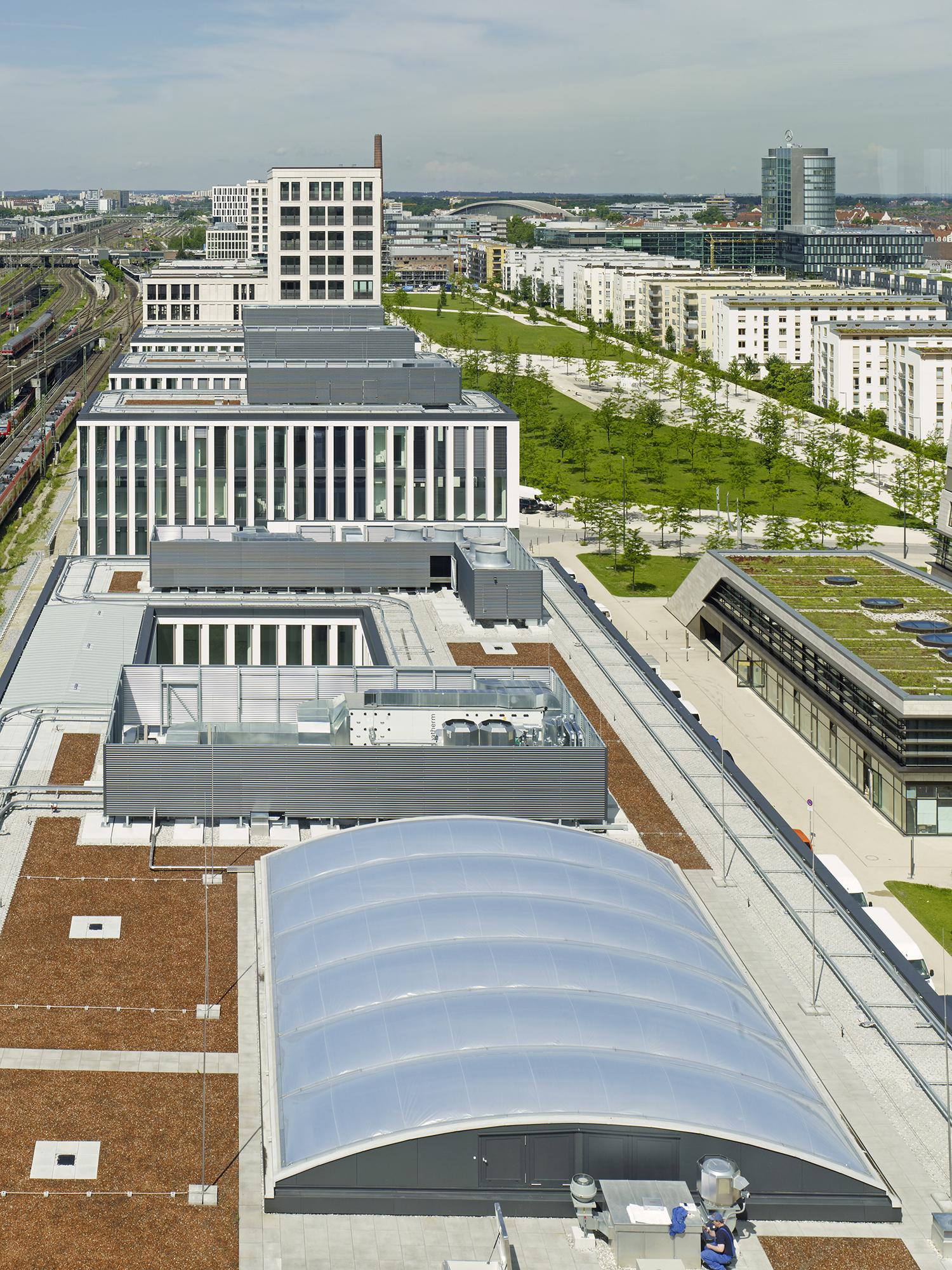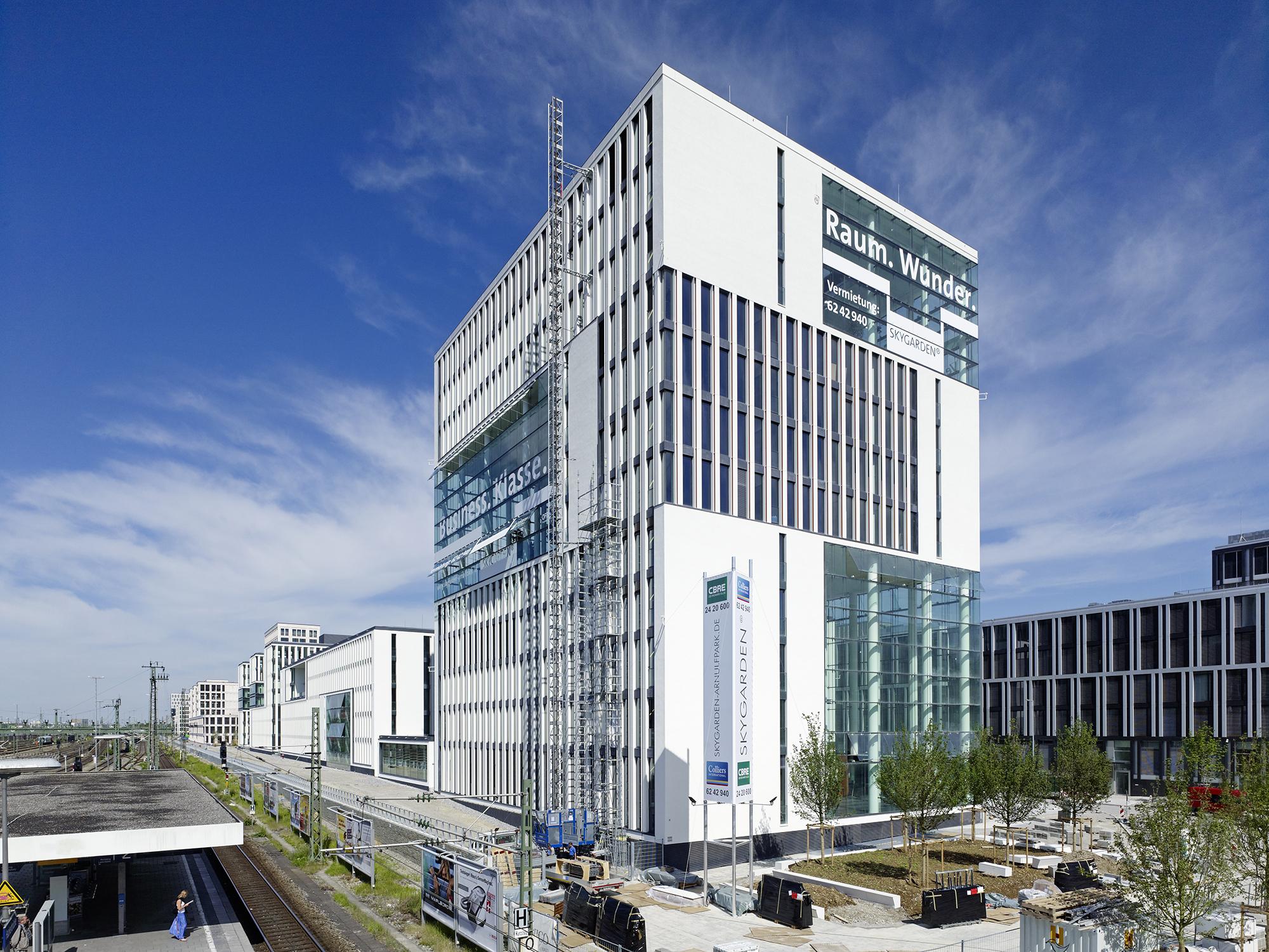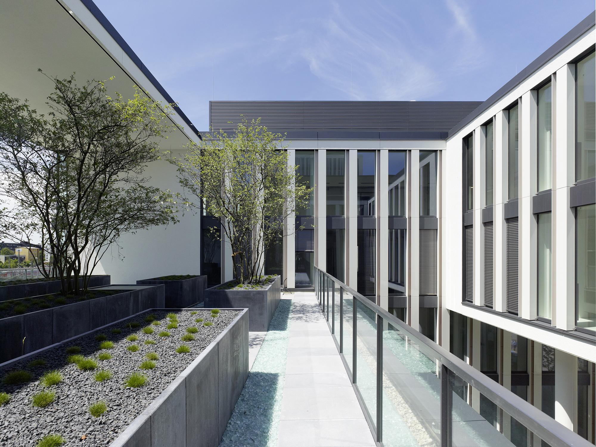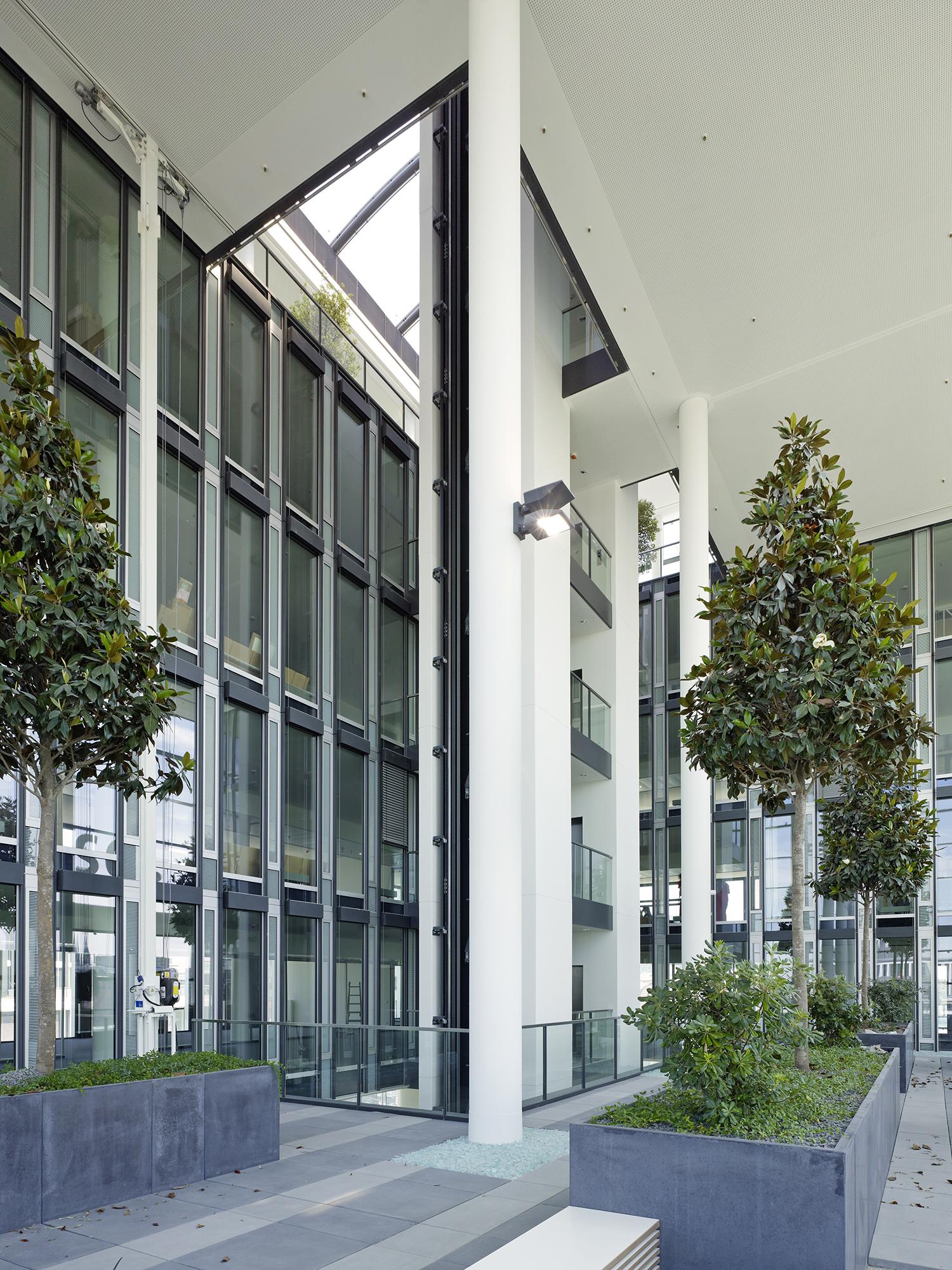 Office complexMunich, GermanyArnulfpark is one of Munich’s inner-city oases. The downtown district and main train station can be reached on foot, the Mittlerer Ring motorway and railway tracks lie in the immediate vicinity. The sustainability of the compact, urbane and green construction concept is equally documented in the four ‘elements’ characterised by Plato which have lent their names to the different quarters encompassing the park: fire, water, earth and air. The Skygarden, a central component of the quarter named Air, interlinks spacious courtyards with broadly spaced atriums and loggias, so that the office spaces are located not only within the greenery at ground level. Over 50 per cent of energy demand is covered via regenerative sources.