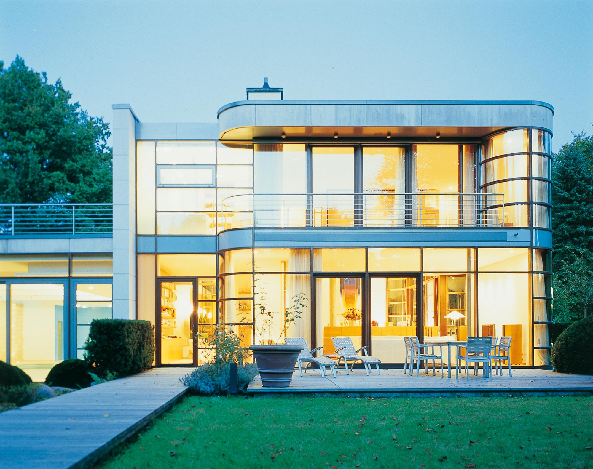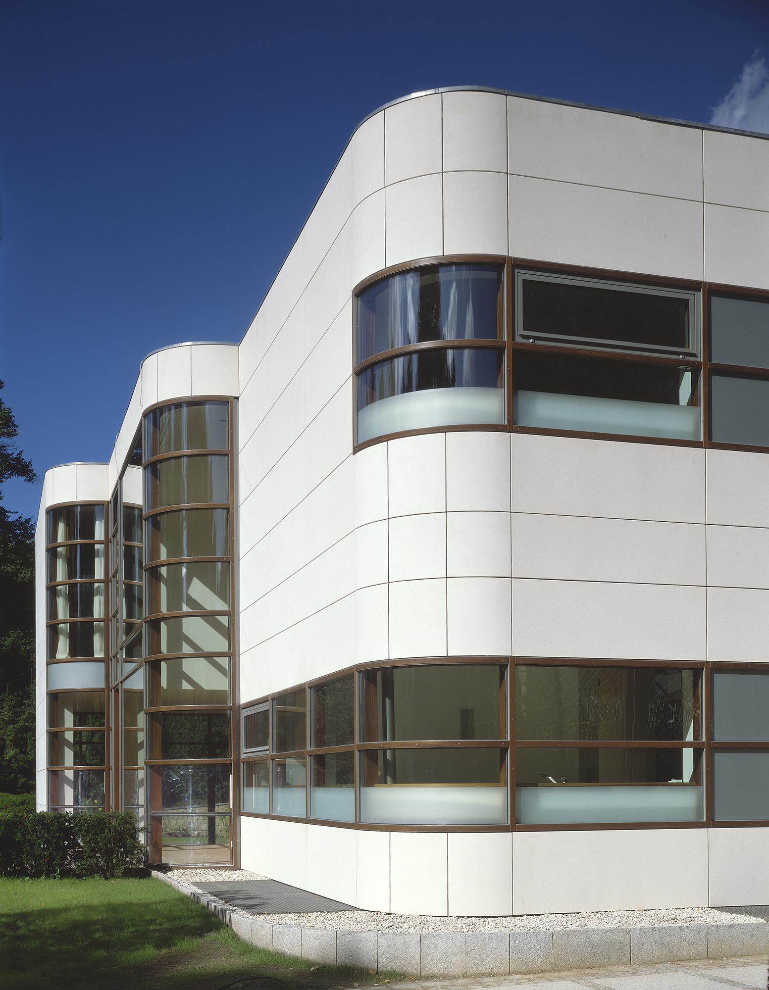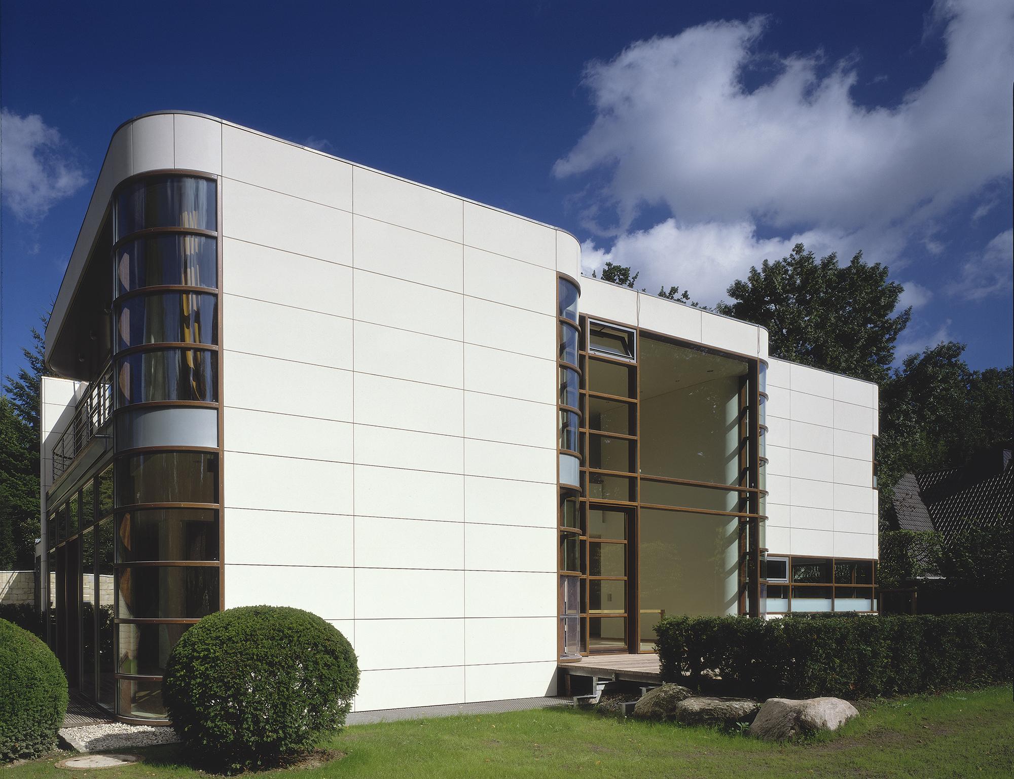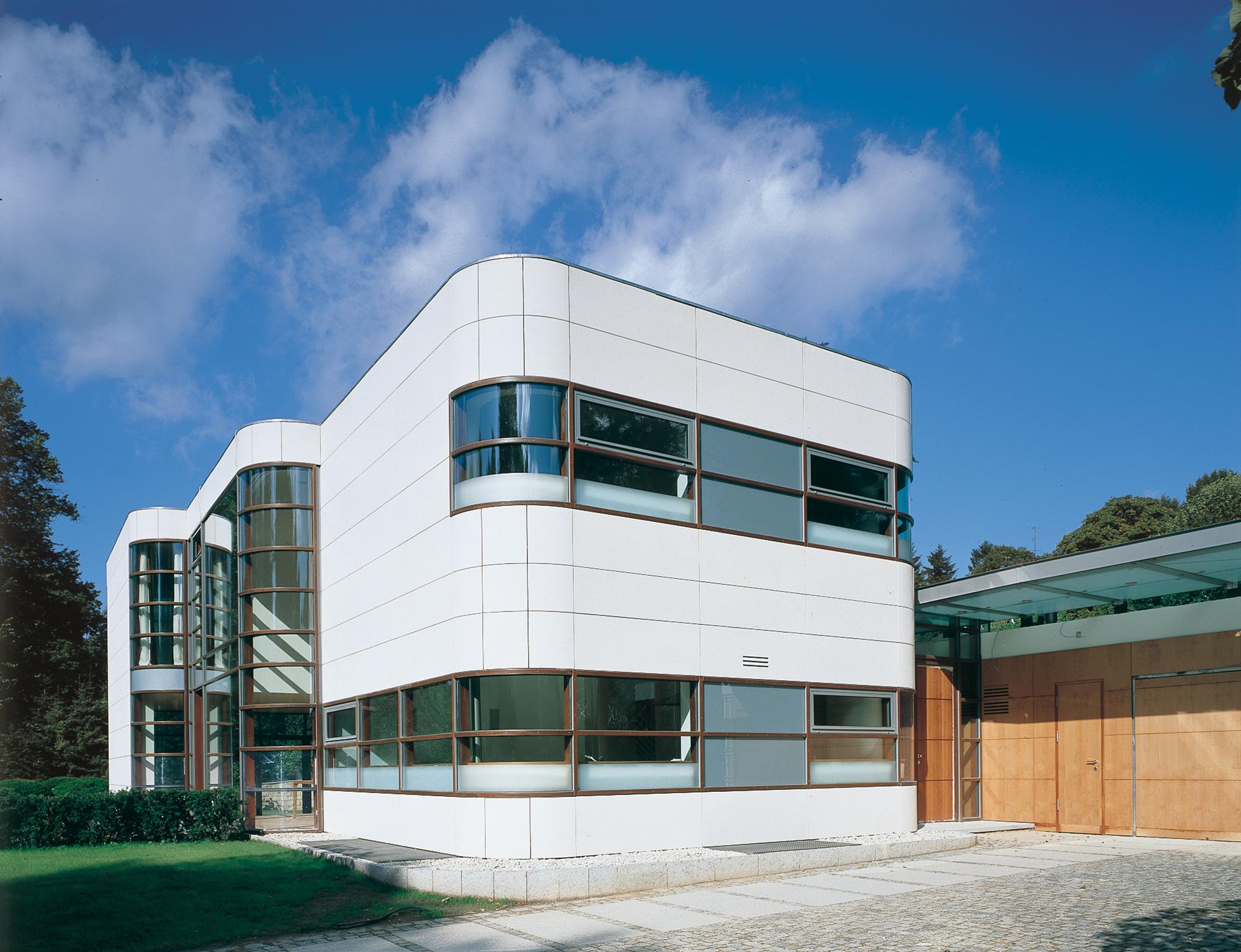 Residential buildingAhrensburg, GermanyThe villa is set in an oasis of green. The skilful combination of vertical and horizontal window elements generates a classic elegance indoors and outdoors. A controlled interplay between light and space is used to create a free-flowing transition. The building is built into the slope together with its single-storey component parts (garage and swimming pool) located to the rear. An outwardly curved wall of undressed stone forms the terminating point towards the slope, thus creating an outdoor area facing the swimming pool. These areas to the rear are spatially separated from the two-storey house form proper by a 2-metre-wide glazed ceiling aperture. It forms a juncture extending from the main entrance through the building and on to the exit leading to the garden. The free-standing fireplace on the ground floor creates a partition between the library and the living room, and between the bedroom and bath on the first upper floor, though without interrupting the spaciousness of the rooms. There is a difference in height between the living and dining areas. The two-storey dining area is open up to a bridging crosswalk on the first upper floor. The curved windows turn the view outside into a veritable panorama.