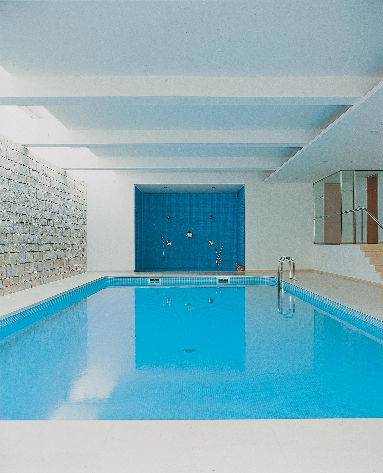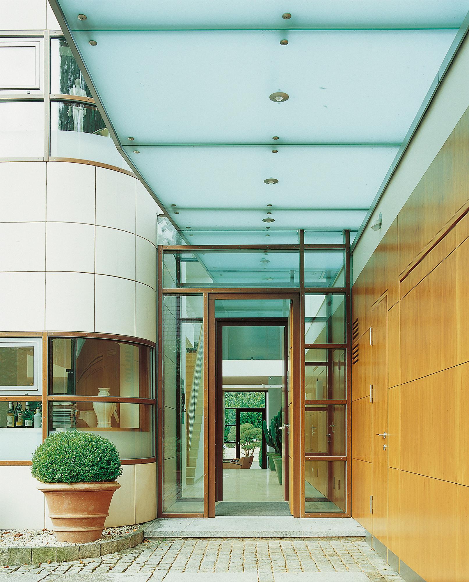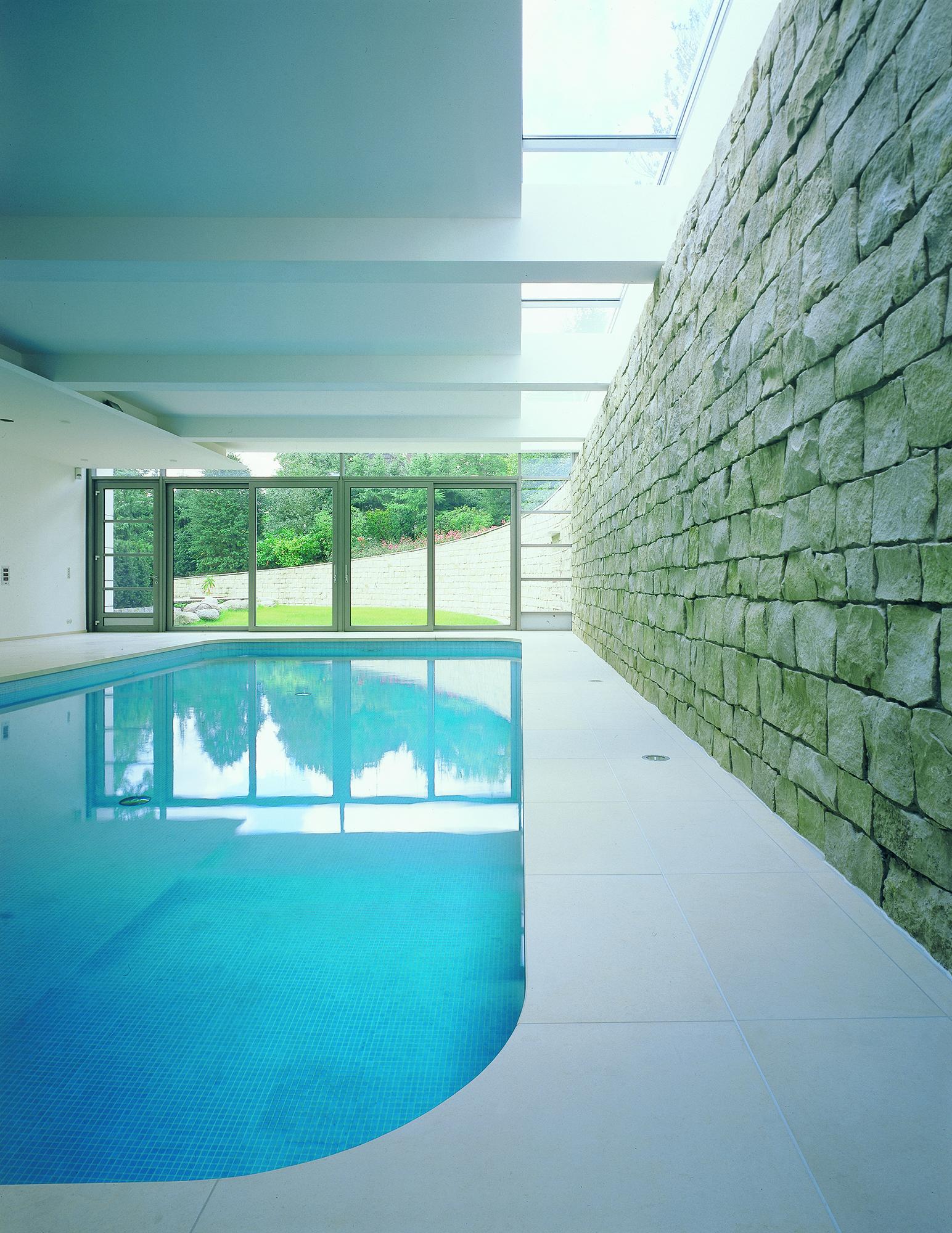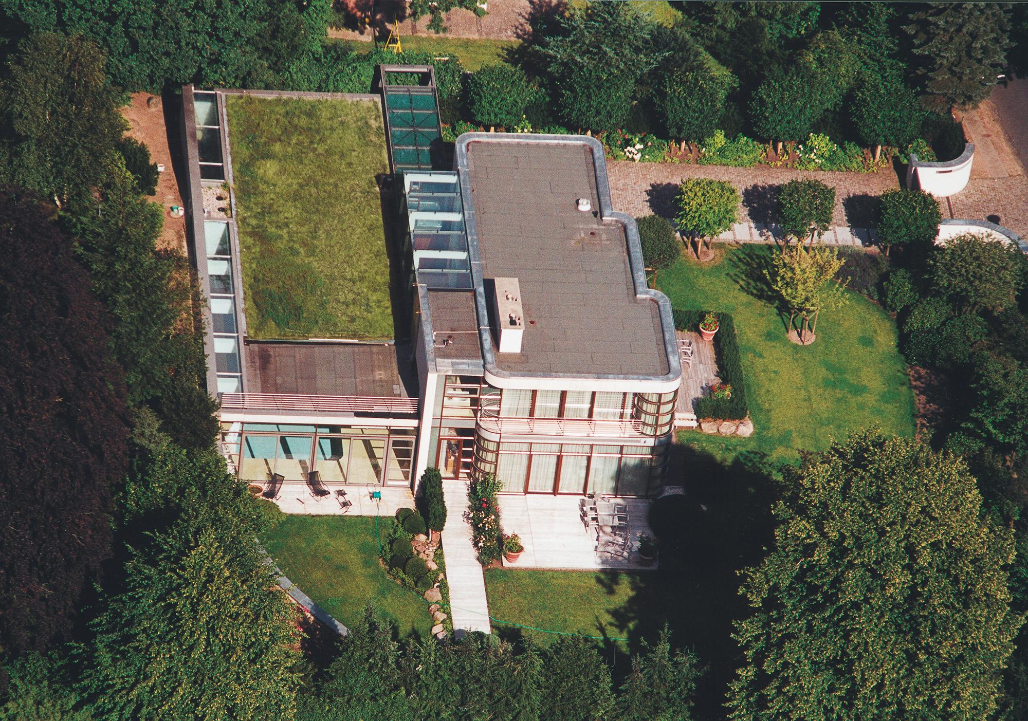 Residential buildingAhrensburg, GermanyThe villa is set in an oasis of green. The skilful combination of vertical and horizontal window elements generates a classic elegance indoors and outdoors. A controlled interplay between light and space is used to create a free-flowing transition. The building is built into the slope together with its single-storey component parts (garage and swimming pool) located to the rear. An outwardly curved wall of undressed stone forms the terminating point towards the slope, thus creating an outdoor area facing the swimming pool. These areas to the rear are spatially separated from the two-storey house form proper by a 2-metre-wide glazed ceiling aperture. It forms a juncture extending from the main entrance through the building and on to the exit leading to the garden. The free-standing fireplace on the ground floor creates a partition between the library and the living room, and between the bedroom and bath on the first upper floor, though without interrupting the spaciousness of the rooms. There is a difference in height between the living and dining areas. The two-storey dining area is open up to a bridging crosswalk on the first upper floor. The curved windows turn the view outside into a veritable panorama.
