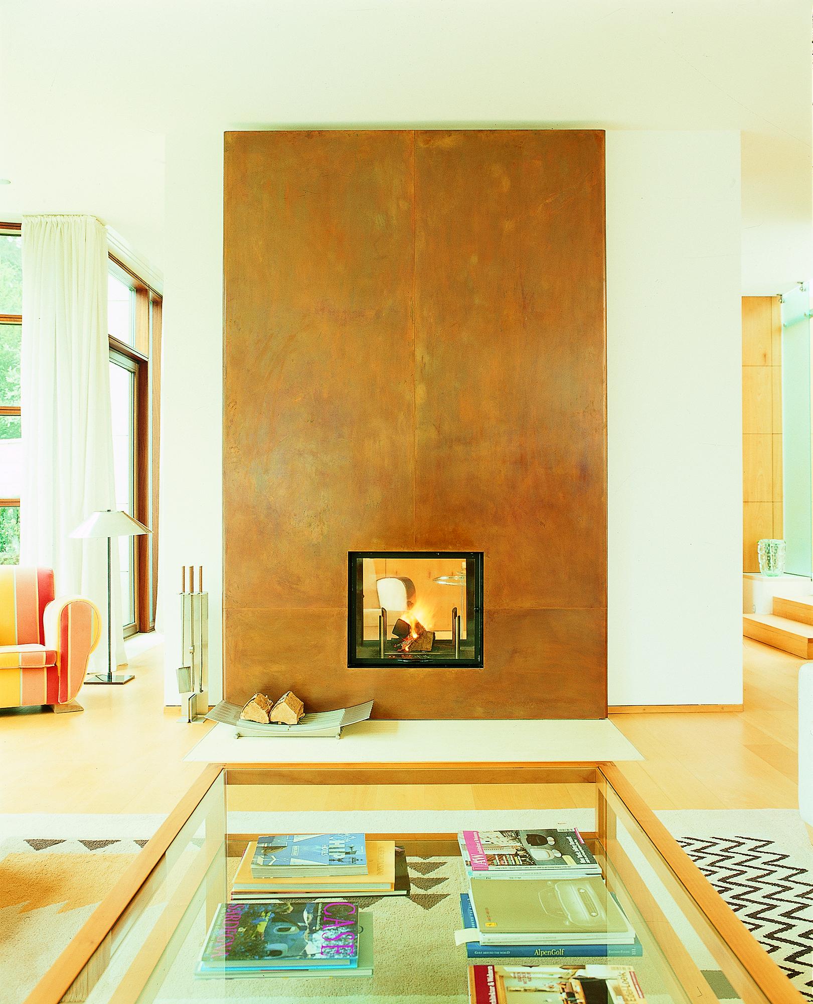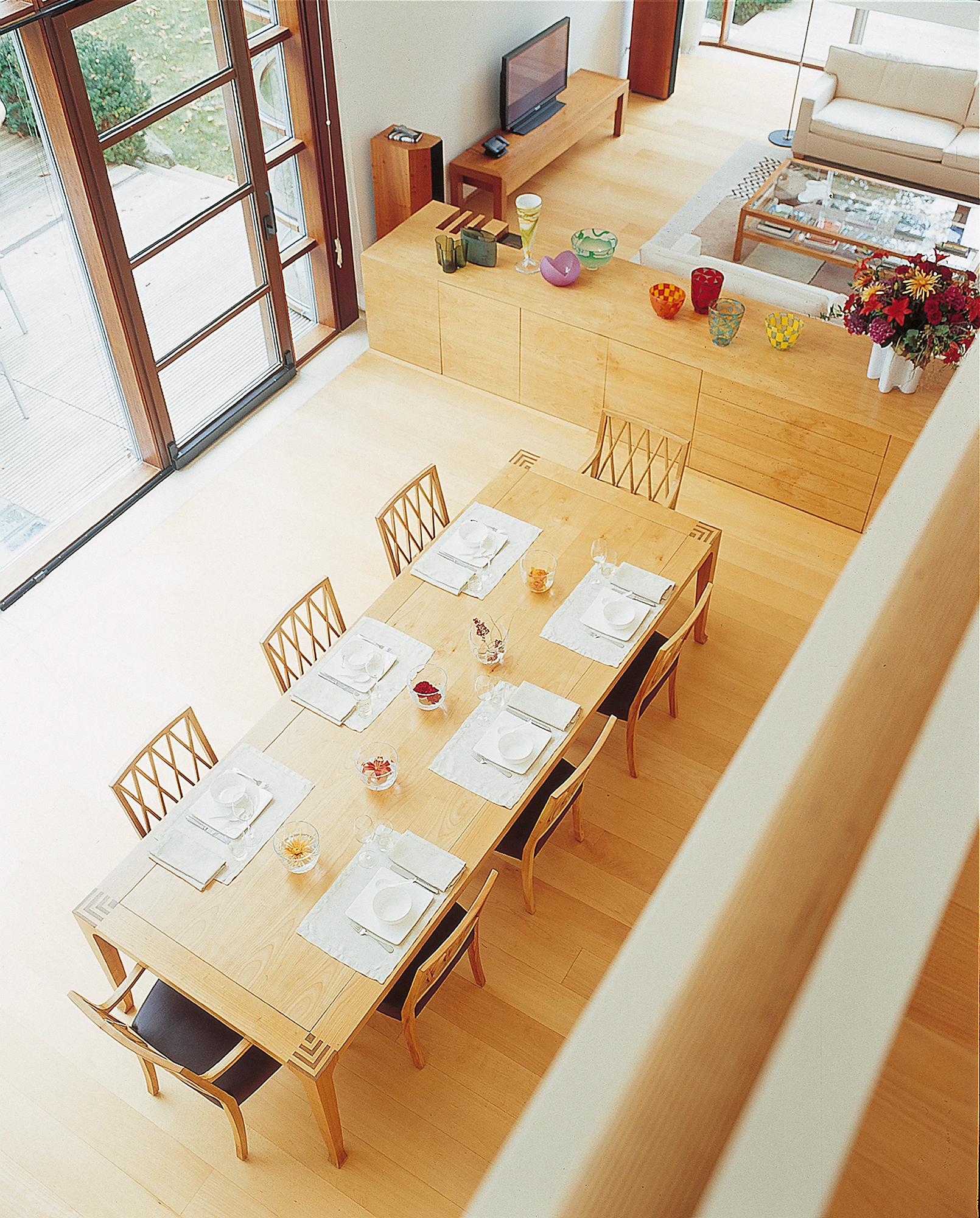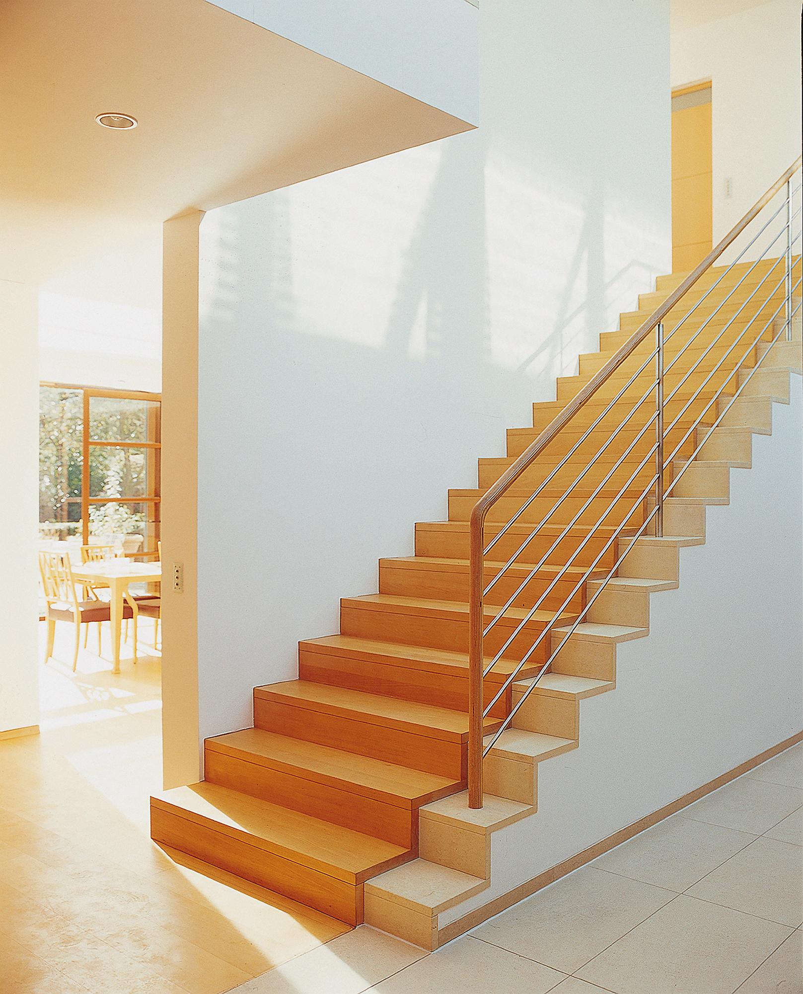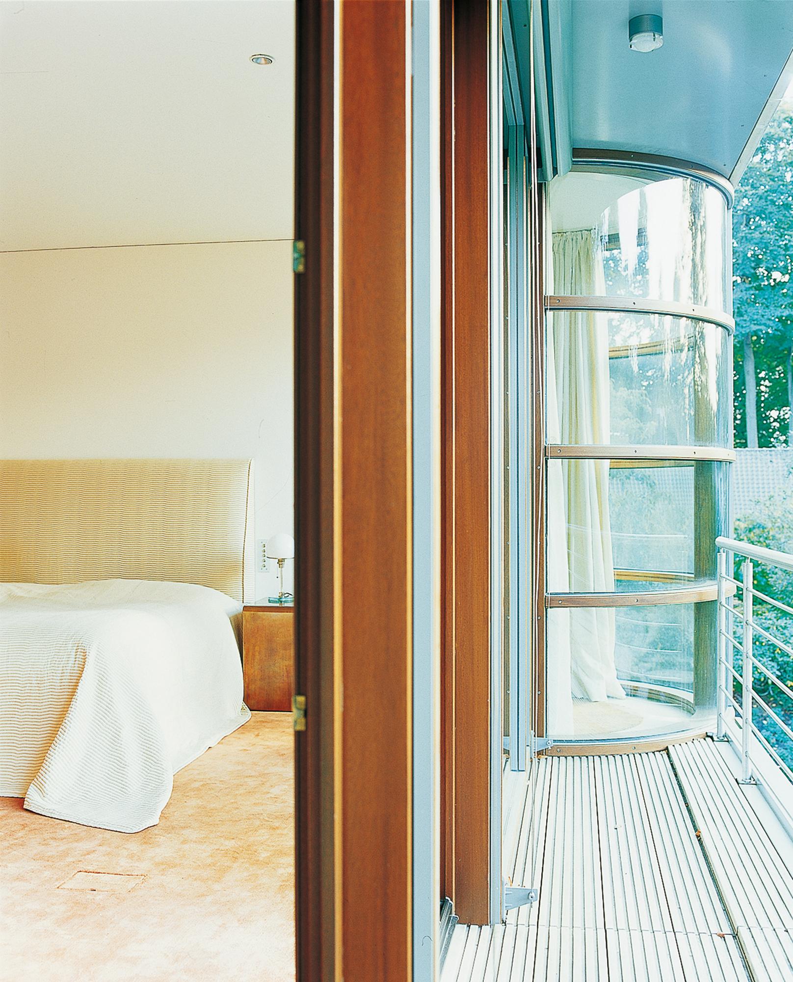 Residential buildingAhrensburg, GermanyThe villa is set in an oasis of green. The skilful combination of vertical and horizontal window elements generates a classic elegance indoors and outdoors. A controlled interplay between light and space is used to create a free-flowing transition. The building is built into the slope together with its single-storey component parts (garage and swimming pool) located to the rear. An outwardly curved wall of undressed stone forms the terminating point towards the slope, thus creating an outdoor area facing the swimming pool. These areas to the rear are spatially separated from the two-storey house form proper by a 2-metre-wide glazed ceiling aperture. It forms a juncture extending from the main entrance through the building and on to the exit leading to the garden. The free-standing fireplace on the ground floor creates a partition between the library and the living room, and between the bedroom and bath on the first upper floor, though without interrupting the spaciousness of the rooms. There is a difference in height between the living and dining areas. The two-storey dining area is open up to a bridging crosswalk on the first upper floor. The curved windows turn the view outside into a veritable panorama.