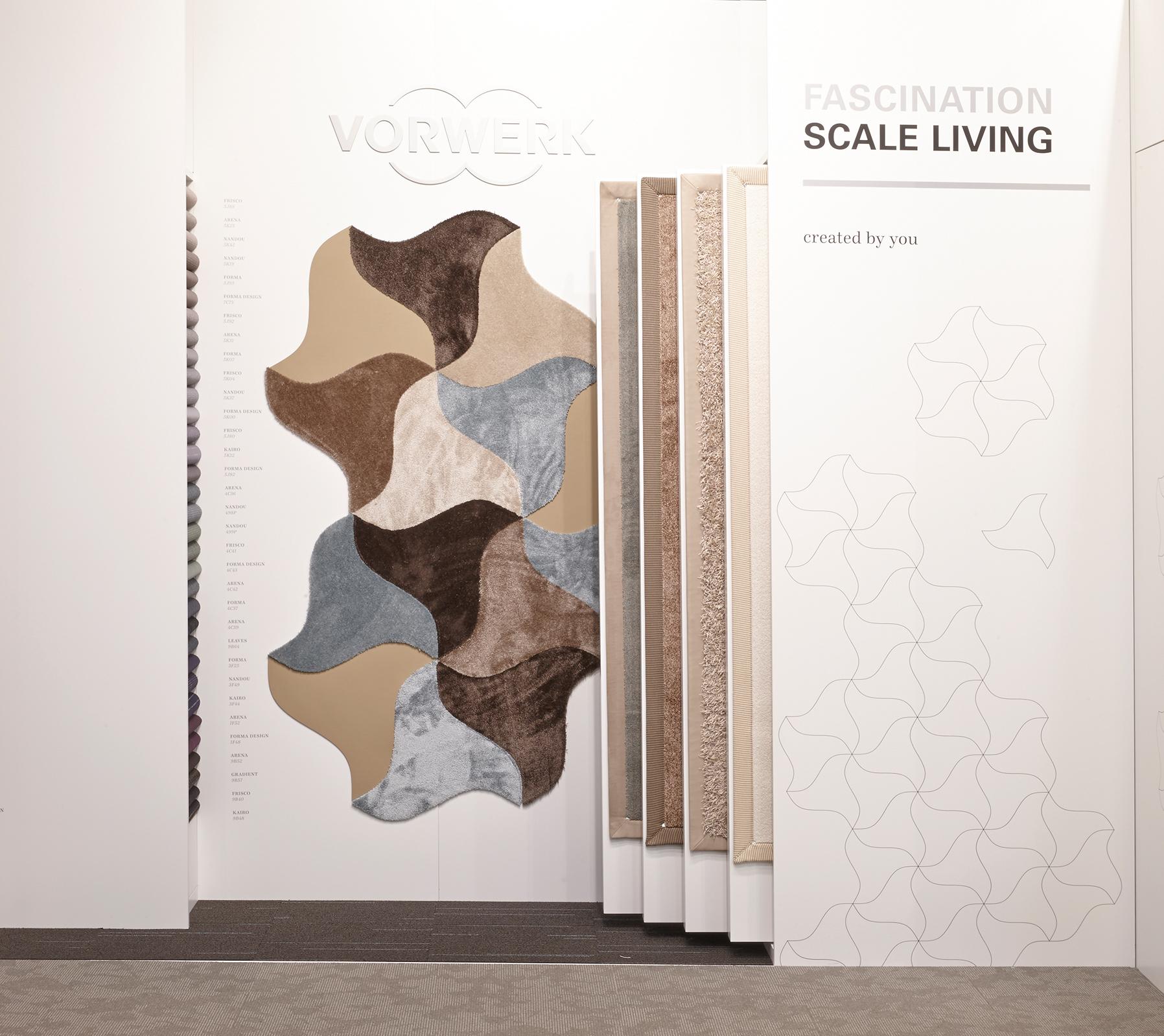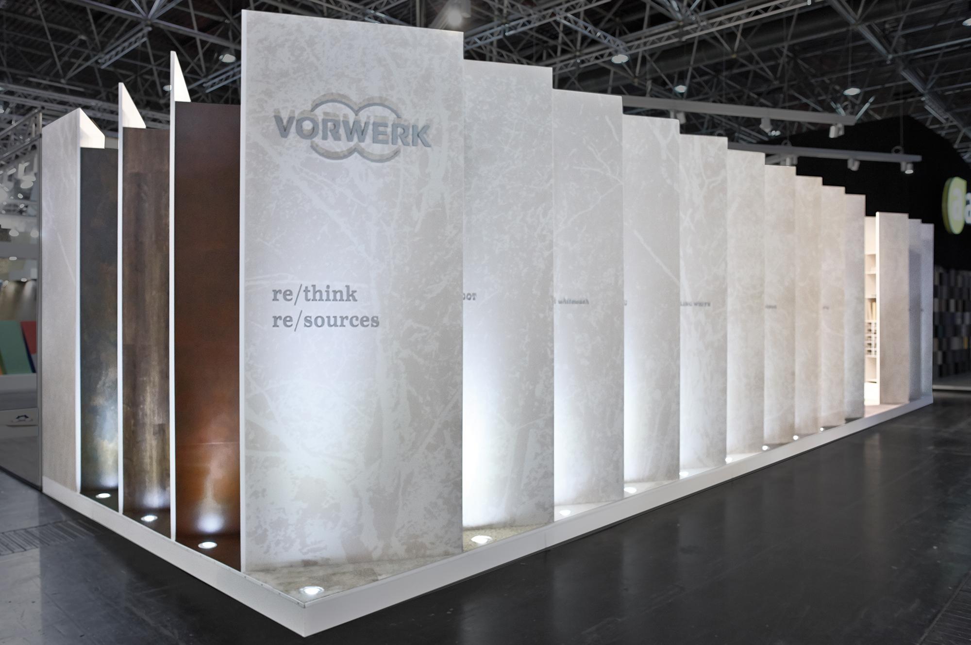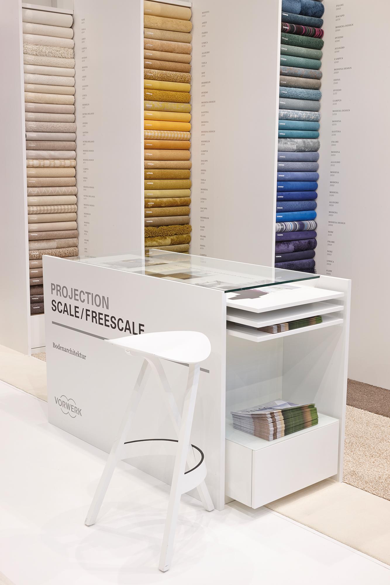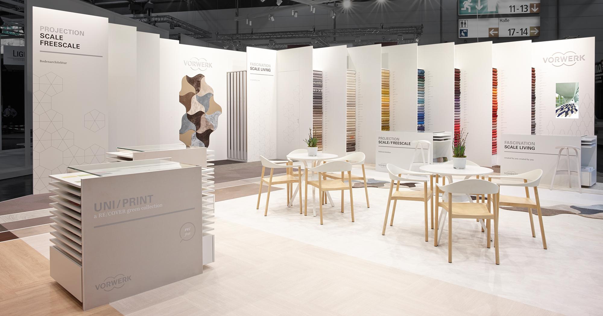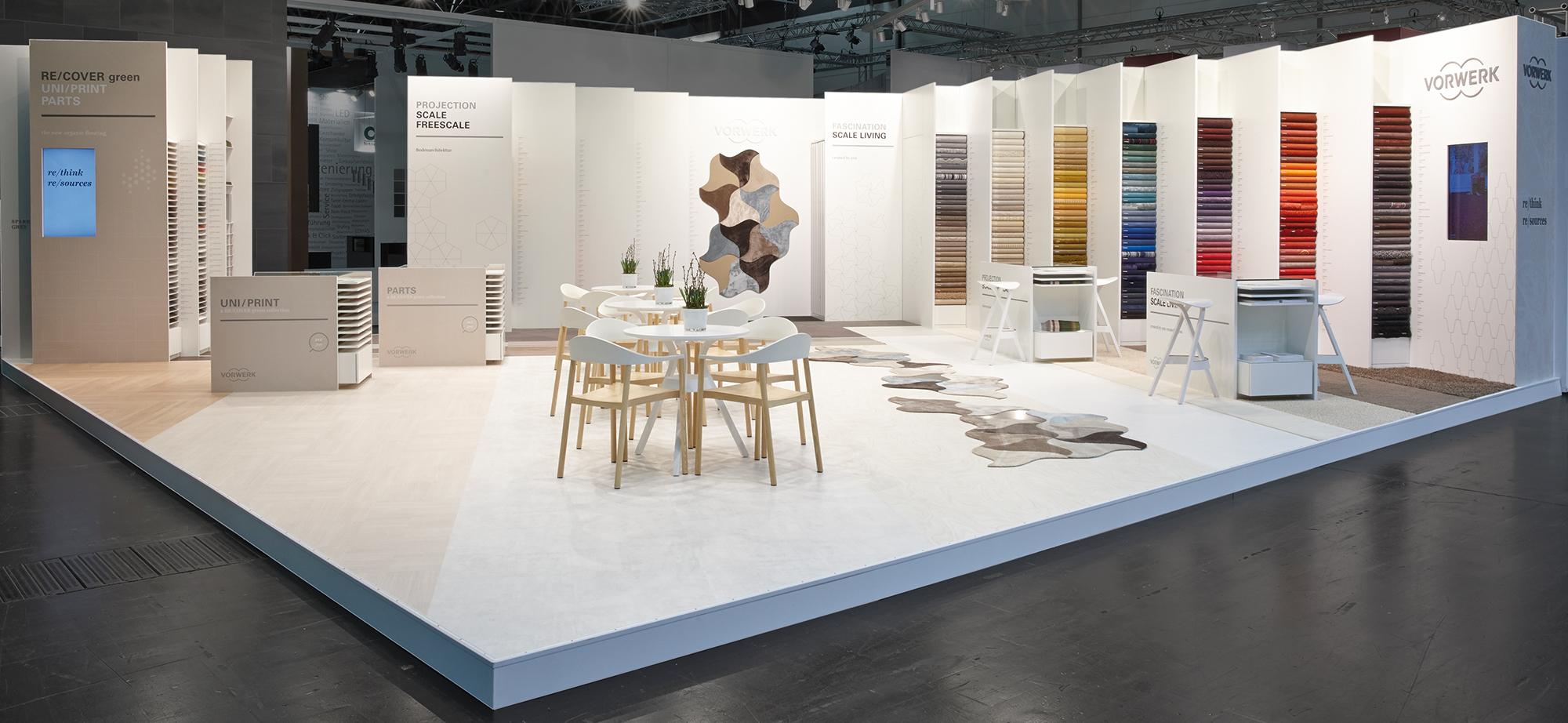 »The idea behind the booth concept is to visualise a new shop-in-shop system for Vorwerk flooring. The collections’ multifaceted nature ought to be depicted in an illustrative and clearly structured manner. ‘Layers’ integrated into the walls enable presentation of the broad product portfolio. The harmonious combinability and optimal augmentation of the different products is shown on the floor. We wanted to make it clear that Vorwerk provides solutions for any theme in the flooring sector. «Hadi Teherani