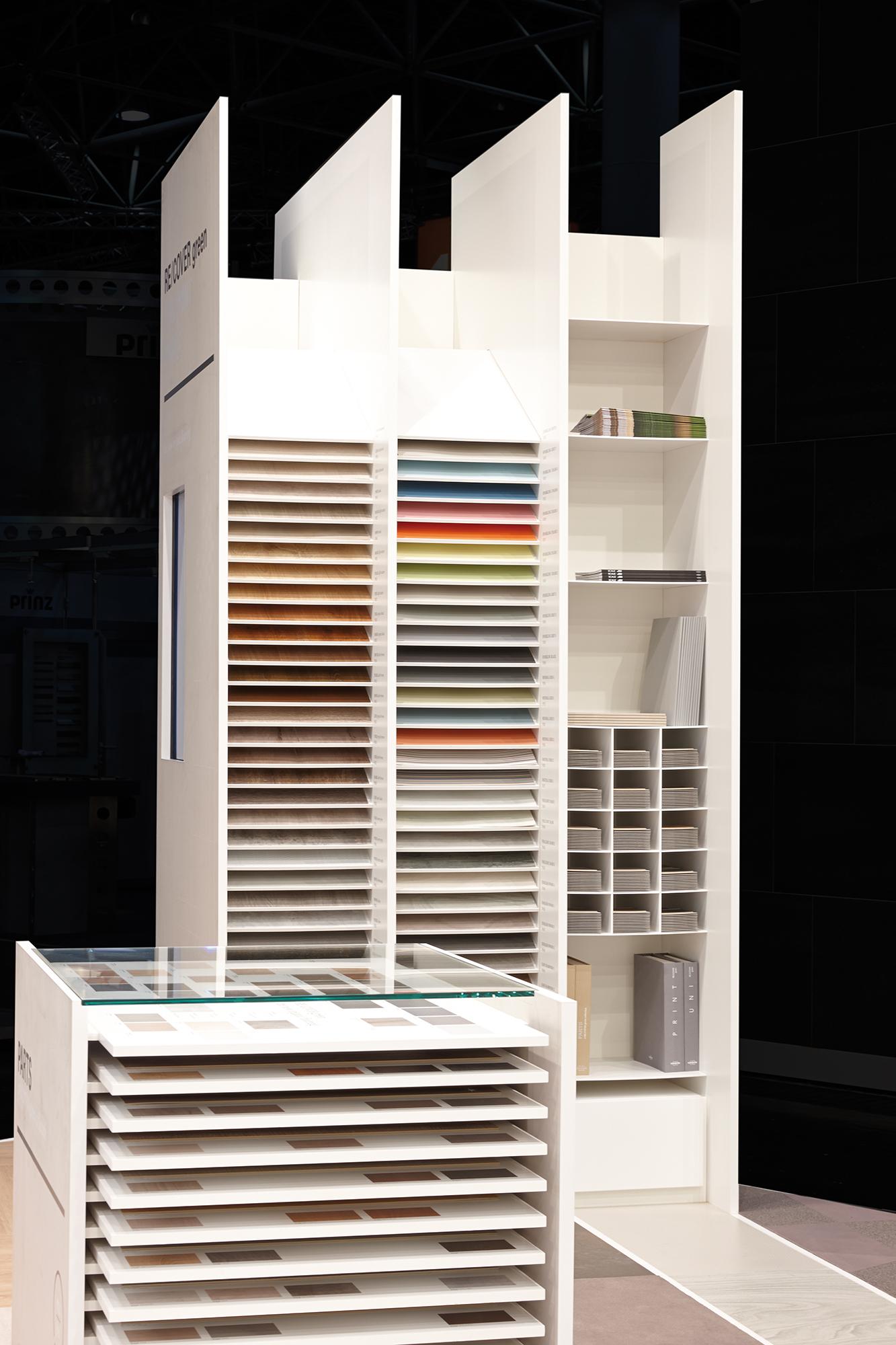 Exhibition stand at EuroshopDusseldorf, GermanyVorwerk flooring shows the RE/COVER green PARTS collection of elastic floor coverings for the first time in Germany at the EuroShop 2014 trade fair in Düsseldorf. From the 16th to the 20th of February the company displays its products within the framework of a meticulously designed shop-in-shop booth concept. The exhibit from this manufacturer of high-quality flooring distinguishes itself not only in the well-conceived way the collections are presented: at the same time the booth provides new ideas and impulses for shopfitting.