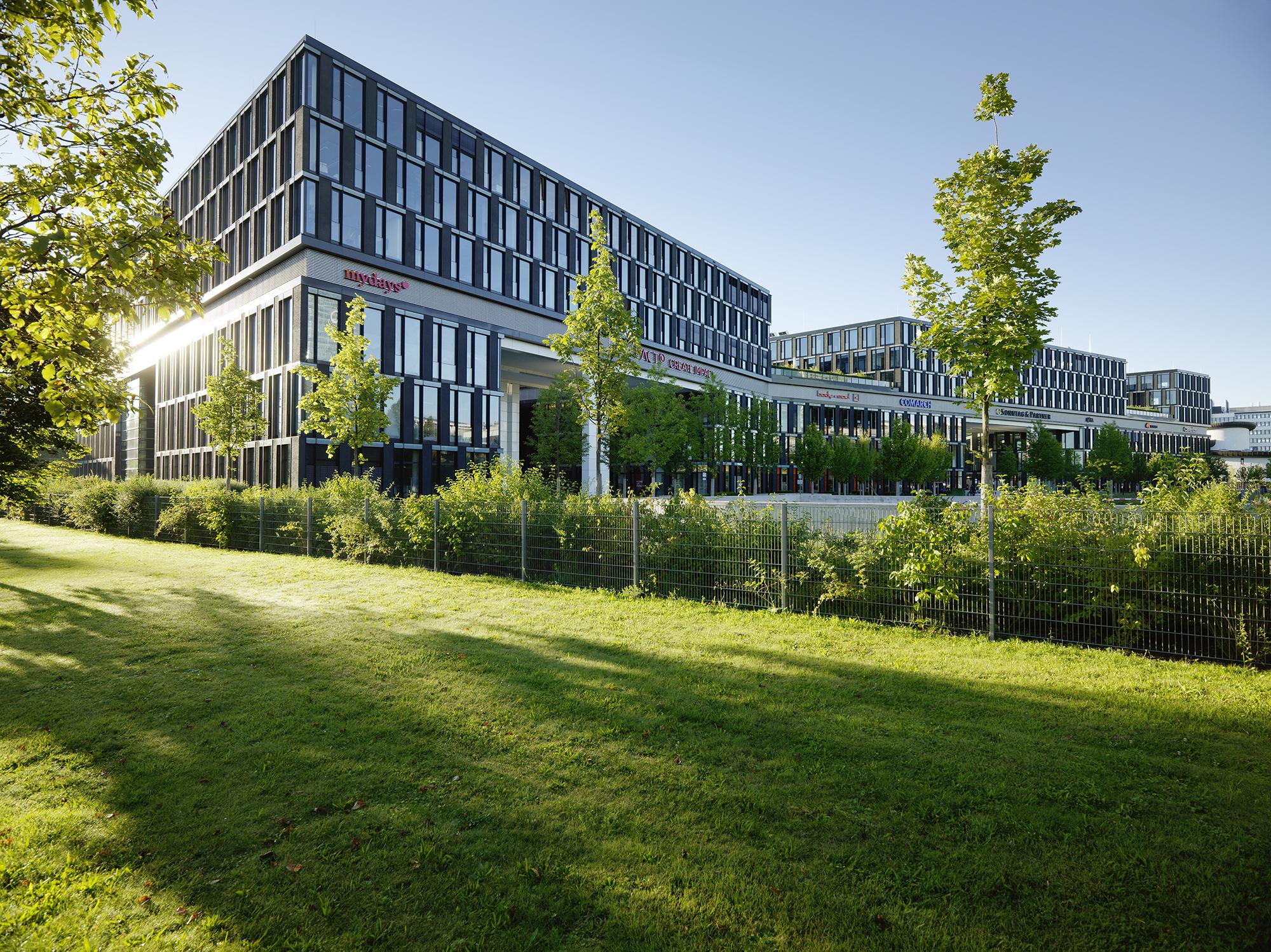 Die parkähnliche Vorplatzgestaltung im Zusammenspiel mit den begrünten Innenhöfen und den großen Dachterrassen im 3. und 5. OG schaffen attraktive Erholungs- und Verweilräume im Außenbereich.