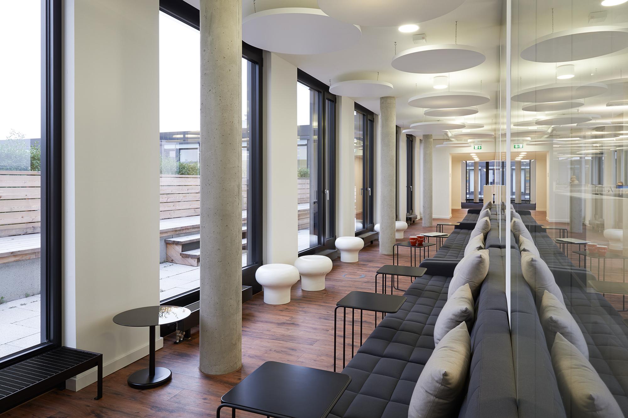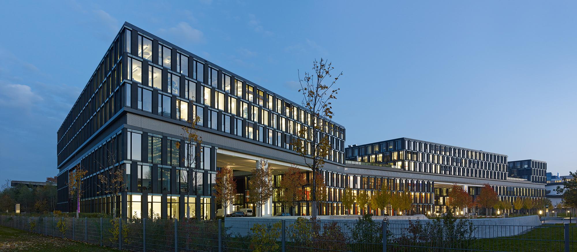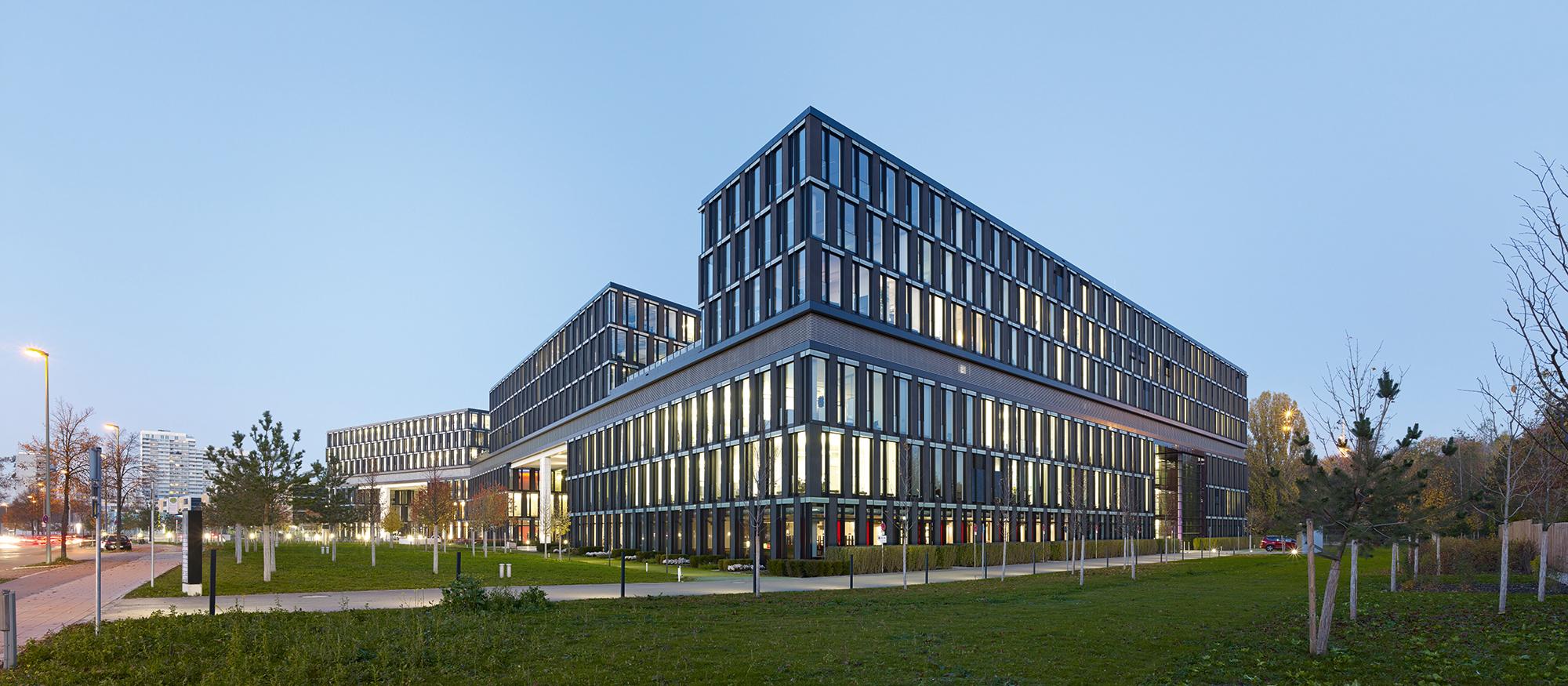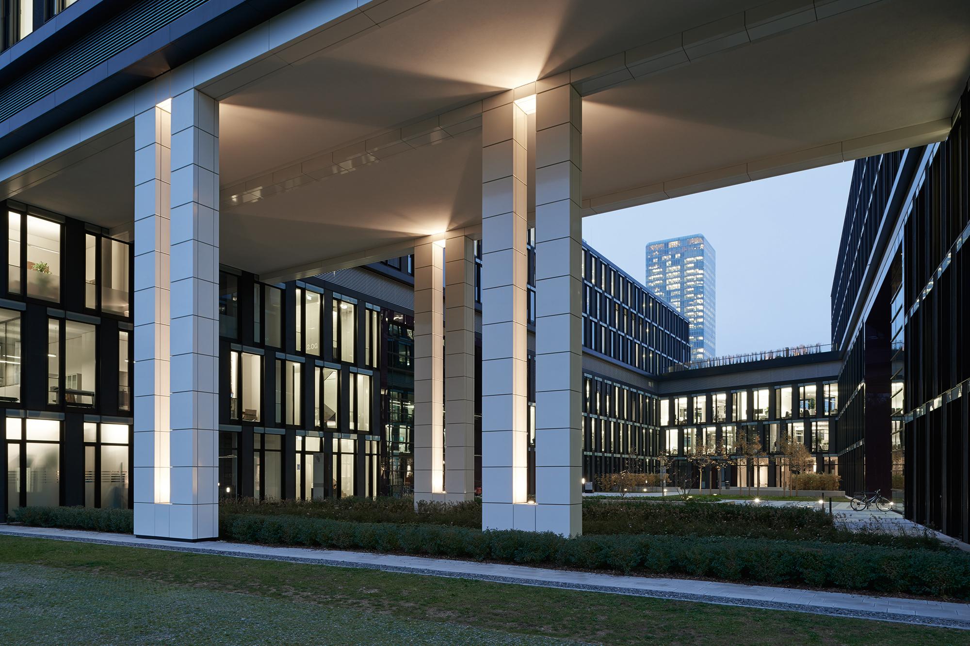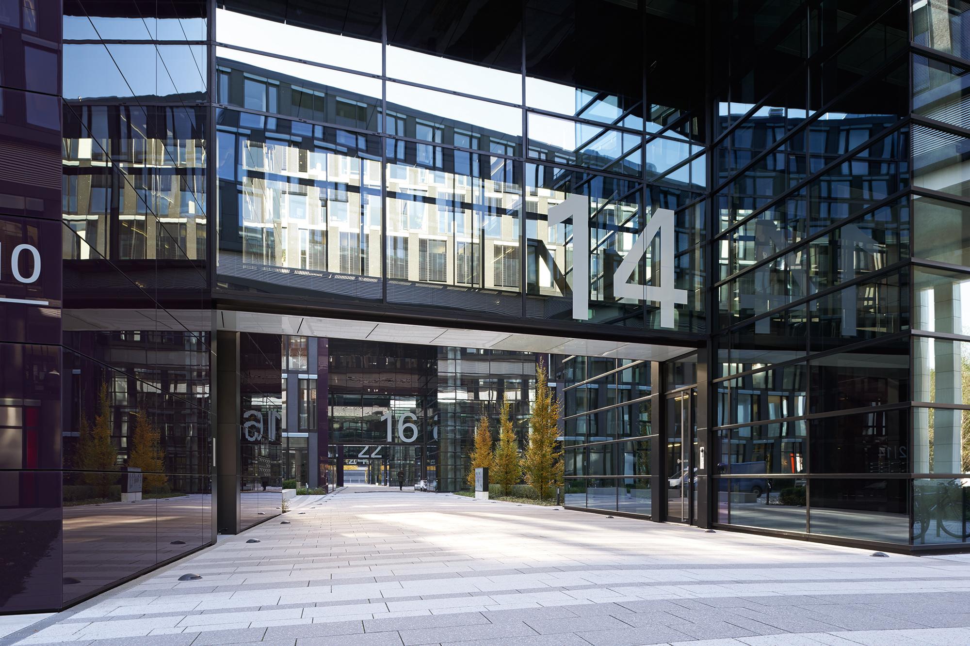 Der gesamte Komplex wird in Längsrichtung von einer 3-geschossigen Magistrale durchschnitten an der 5 großzügige, repräsentative Eingangslobbys mit Verbindungsbrücken und die konisch, geformten Innenhöfe angegliedert sind. Die so entstandenen trichterförmigen Gebäudeeinschnitte an der Riesstraße, schaffen zusammen mit der parkähnlichen Vorplatzgestaltung eine großzügige und einladende Eingangssituation für Nutzer und Besucher.