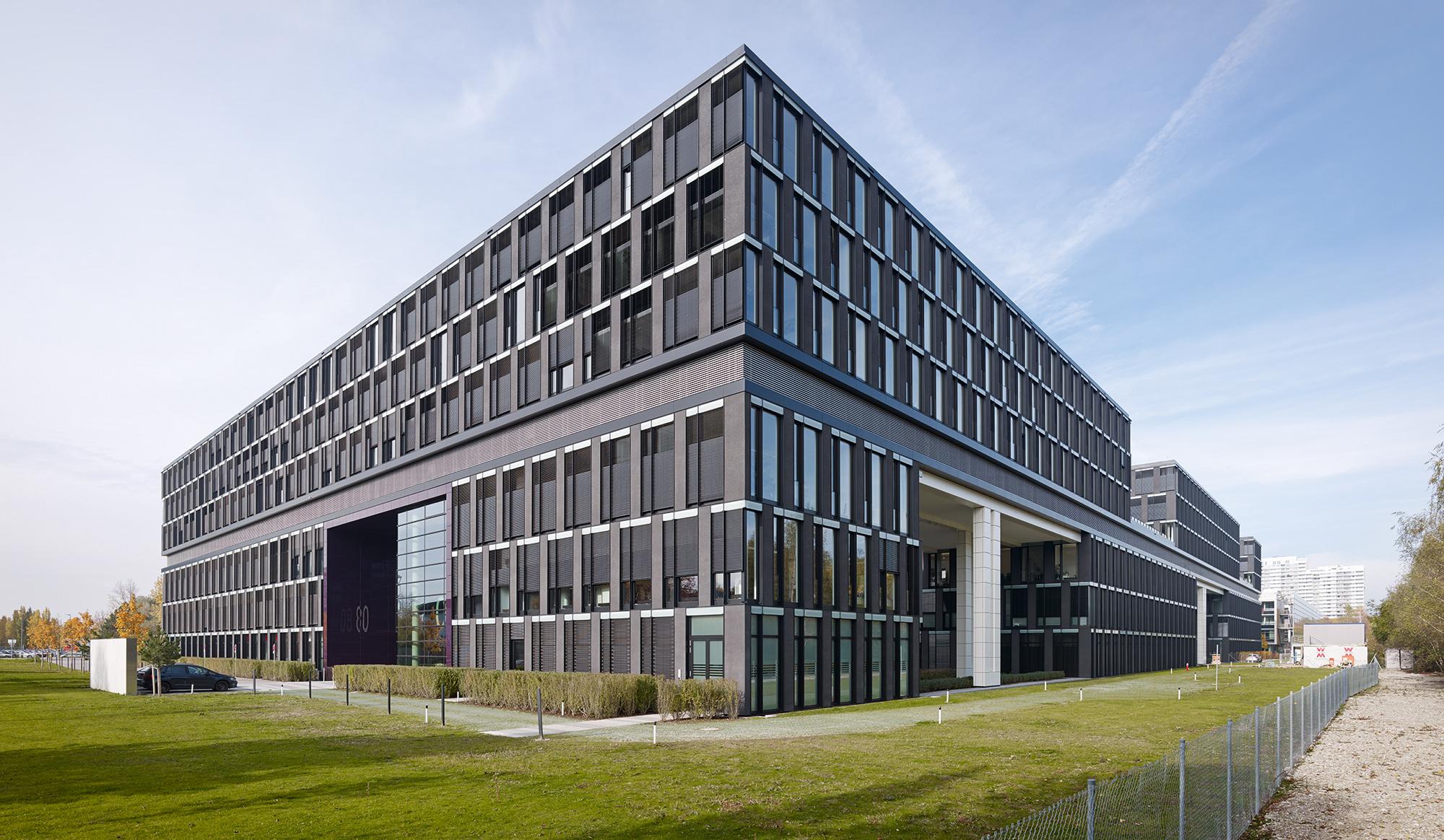 Auf einer Grundstücksfläche von ca. 25.000 m² wurde ein 6 geschossiger, mäandrierender Baukörper entwickelt, der 4 Höfe umspannt und durch die Spiegelung der oberen drei Geschosse, über einem Zwischengeschoss in der 3. Etage (Technik und Lager), einen heterogenen Baukörper mit 3-geschossigen Hofdurchgängen, Dachterrassen, Aus/Durchblicken sowie spannenden Raumsituationen erzeugt.