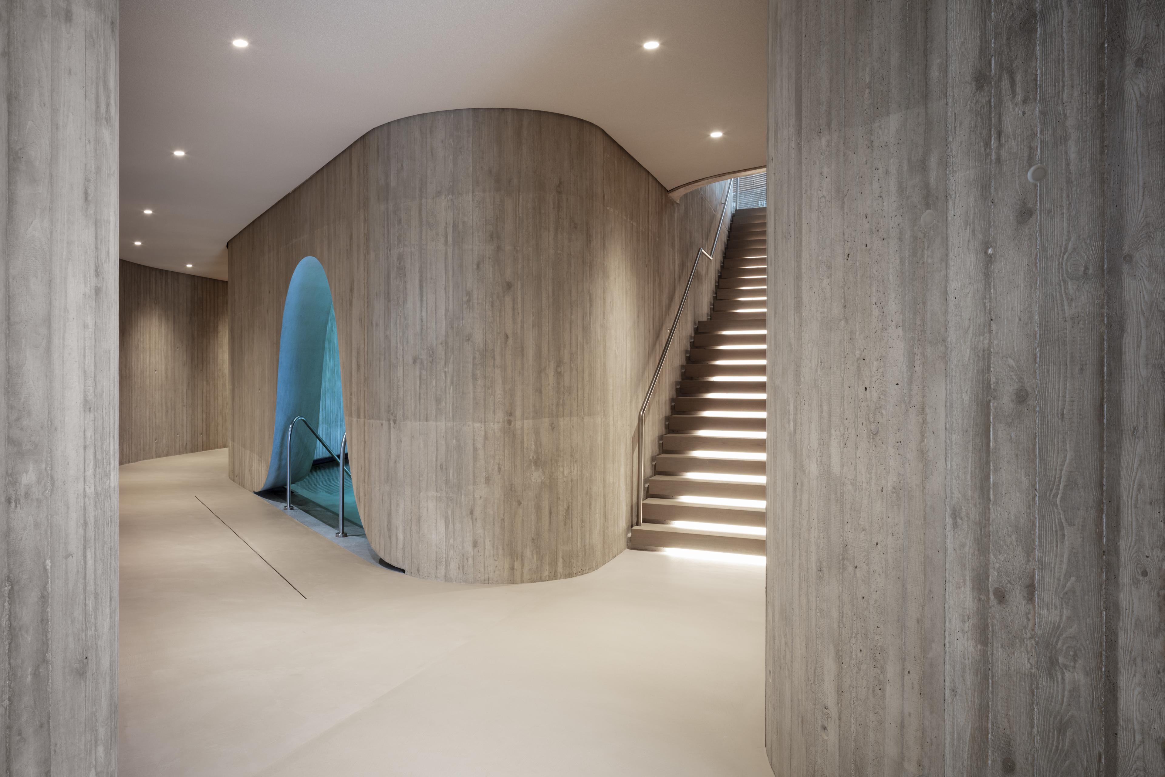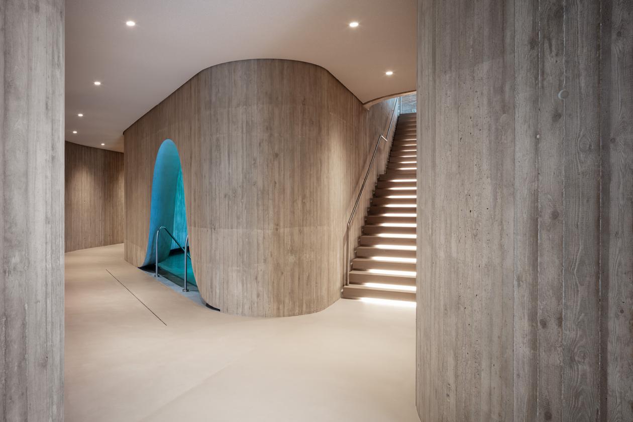 Im Erdgeschoss finden sich neben dem Foyer, den Umkleidebereichen und den Nebenräumen vielfältige Sauna-Attraktionen sowie der Ruheraum mit eigener, für Allergiker sicheren Luftzirkulation. Neben der “Blauen Grotte”, ein ganz aus Sichtbeton mit doppelt gekrümmten Eingängen gestaltetes Wassergewölbe, steht dem Gast als besonderes Highlight die hölzerne “Amphi-Sauna” zu Verfügung. Die insgesamt 21 Meter breite und 4 Meter hohe, doppelt gekrümmte Holzskulptur bietet eine Finnische- und eine Kräuter-Sauna und öffnet den Blick über eine weit gespannte Ganzglasfassade zum östlichen Tal.