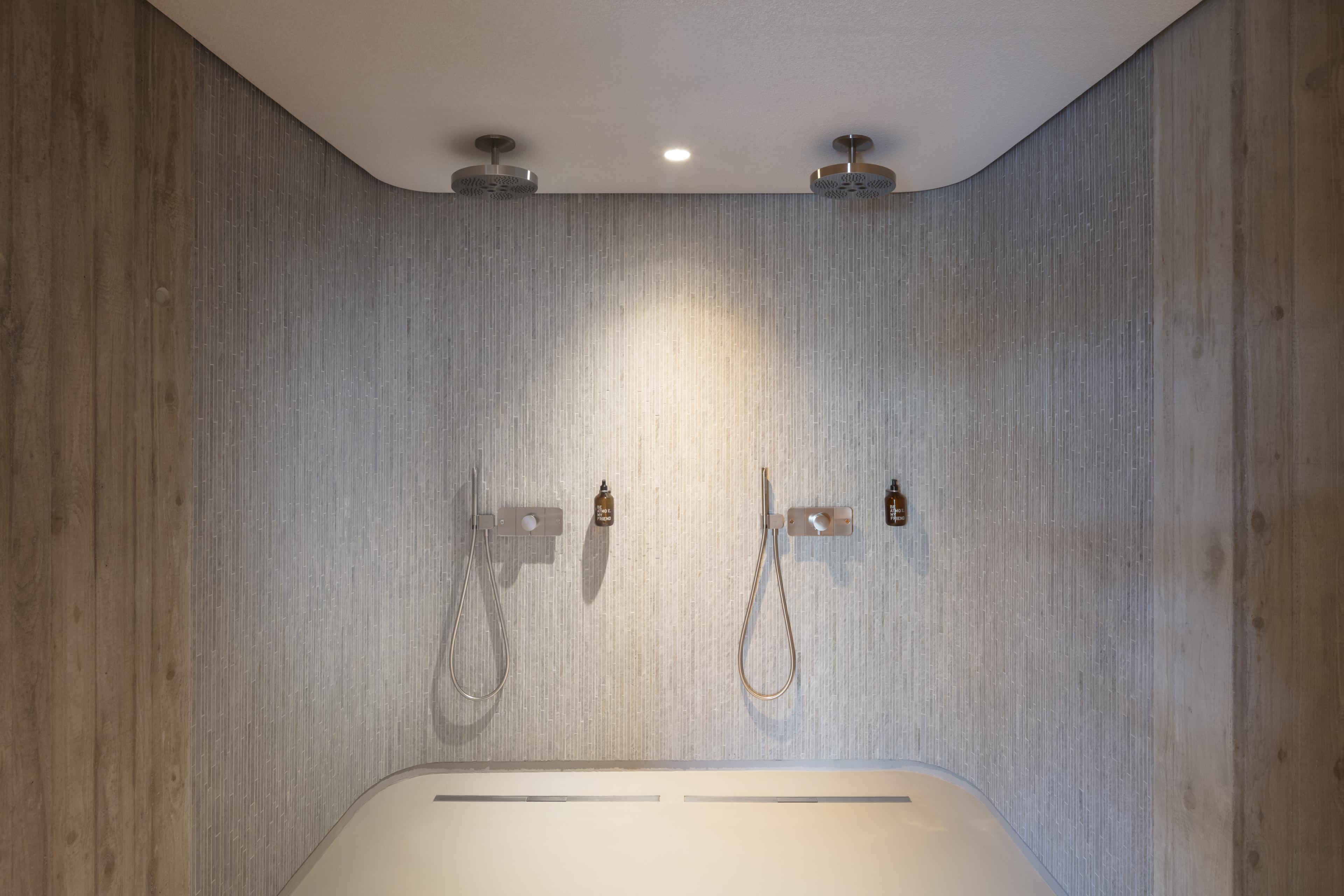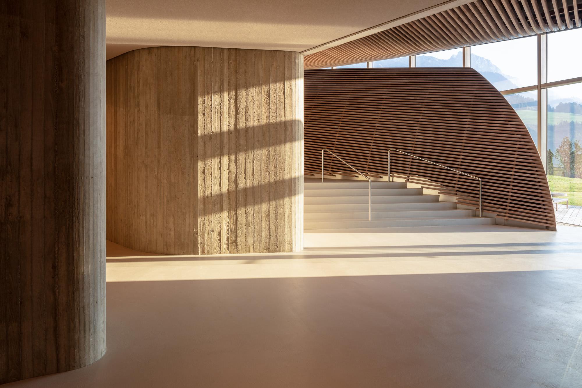Das neue Element SPA nutzt in seinen Abstufungen die bestehenden Geländeunterschiede von Ost nach West, die bis in das Hauptdach zu verfolgen sind. Die im Inneren vorherrschenden Materialien Holz und Stein schaffen keine Konkurrenz zur Aussicht, sondern intensivieren diese vielmehr.